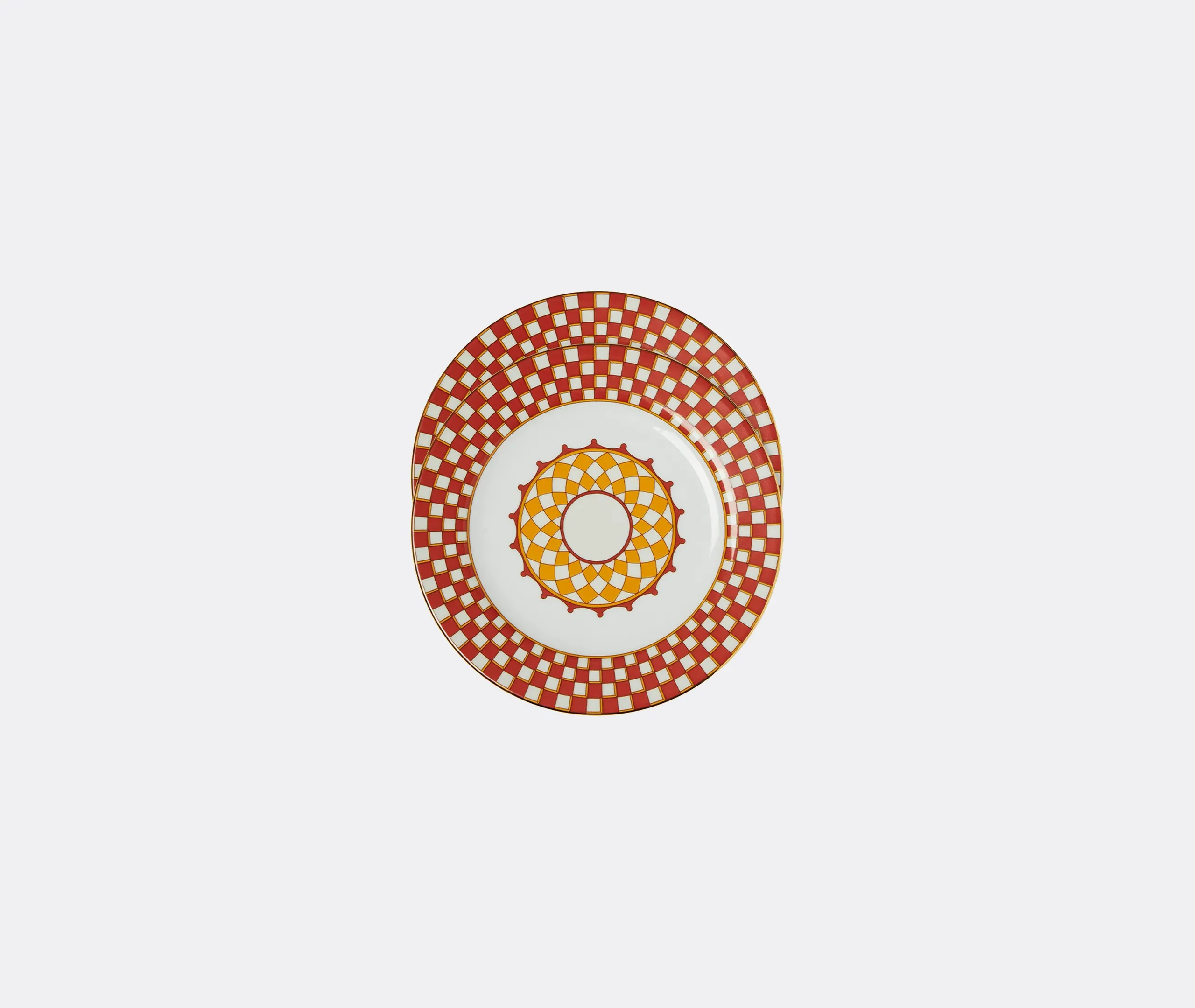 The Apollo side plate set offers fine porcelain construction with 18K gold trim, featuring solar-inspired motifs in burning red, saffron and gold tones. Its multicolor design with fiery concentric borders provides vibrant presentation for appetizers and sides, while the set of two ensures coordinated table settings. Crafted by artisans in Verona, the plates combine durability with decorative appeal for both formal and casual dining.