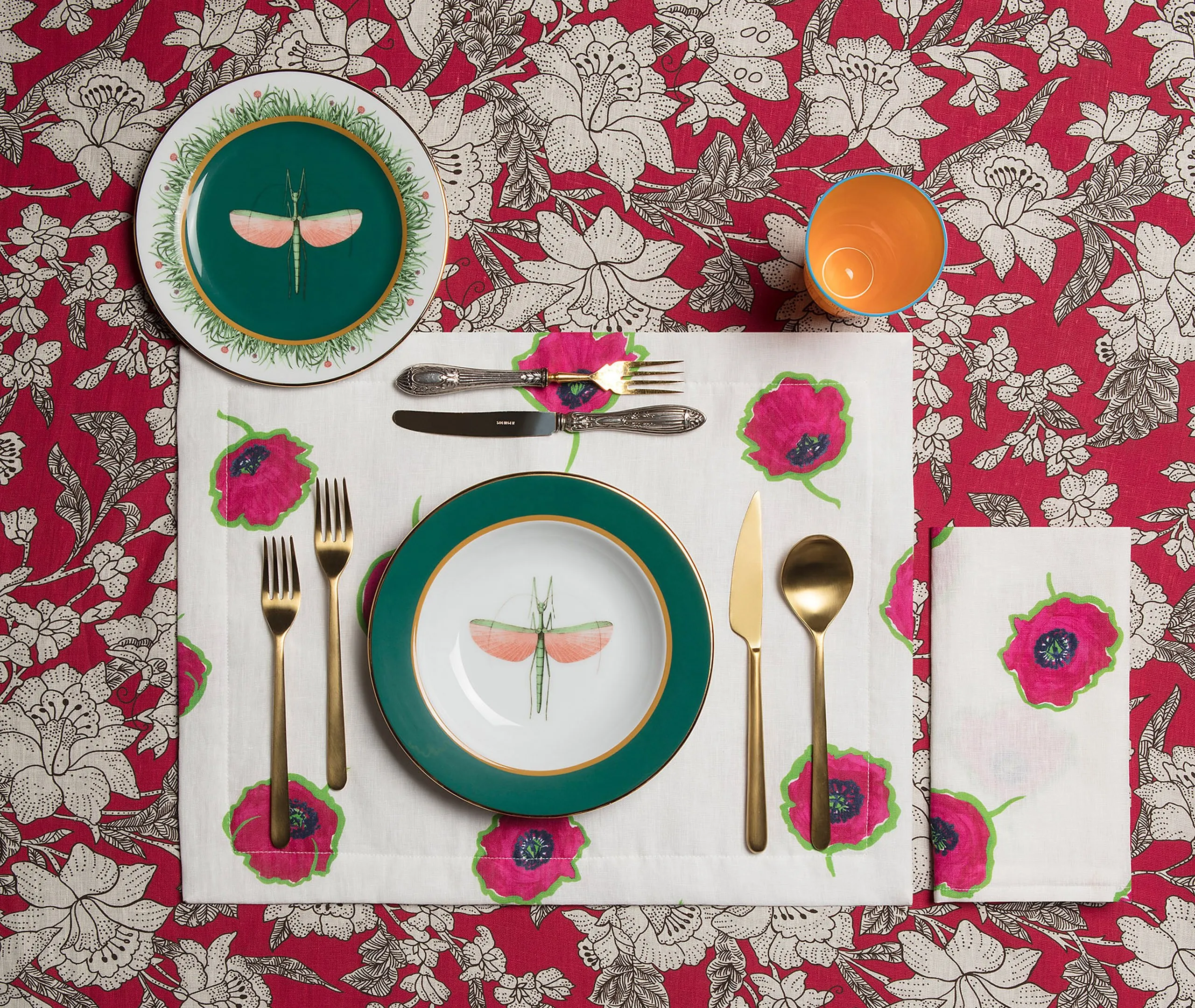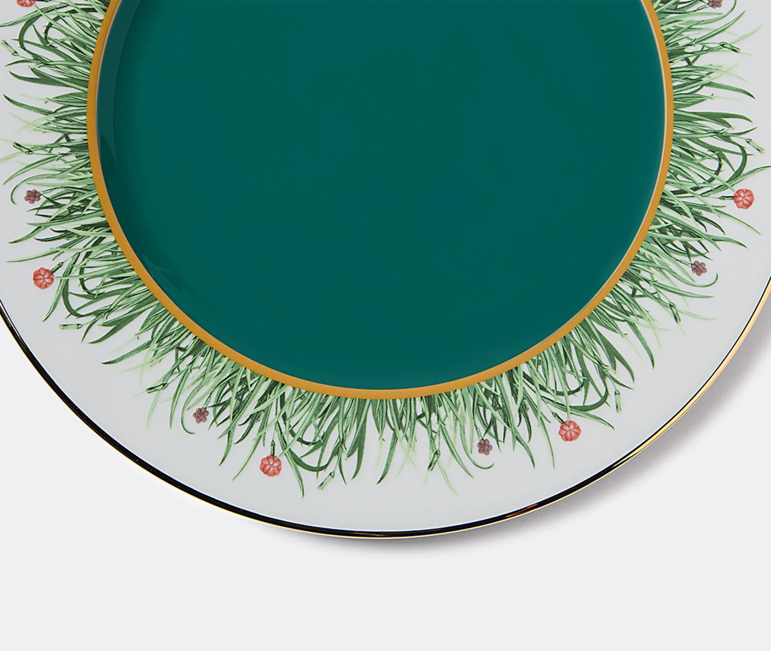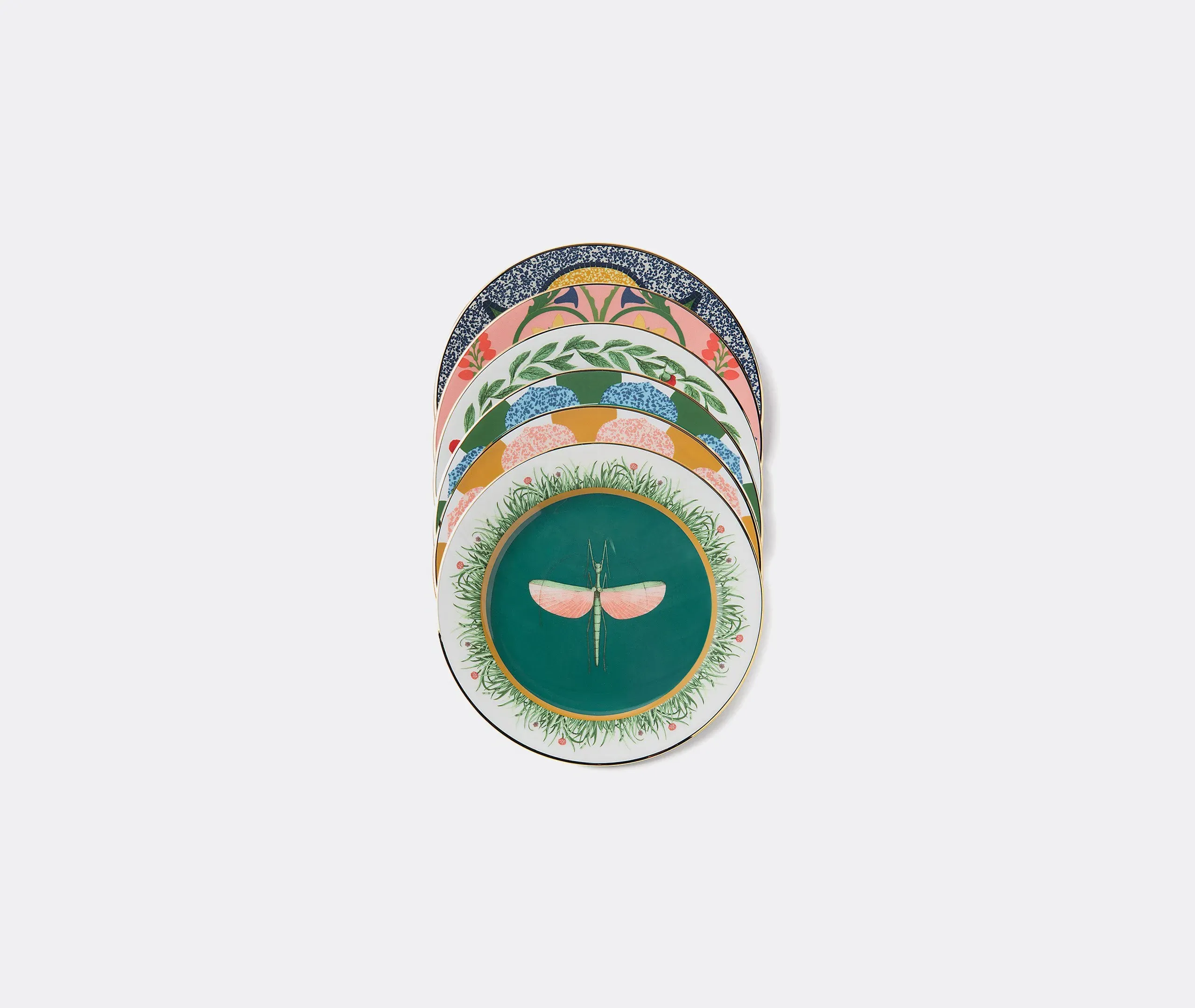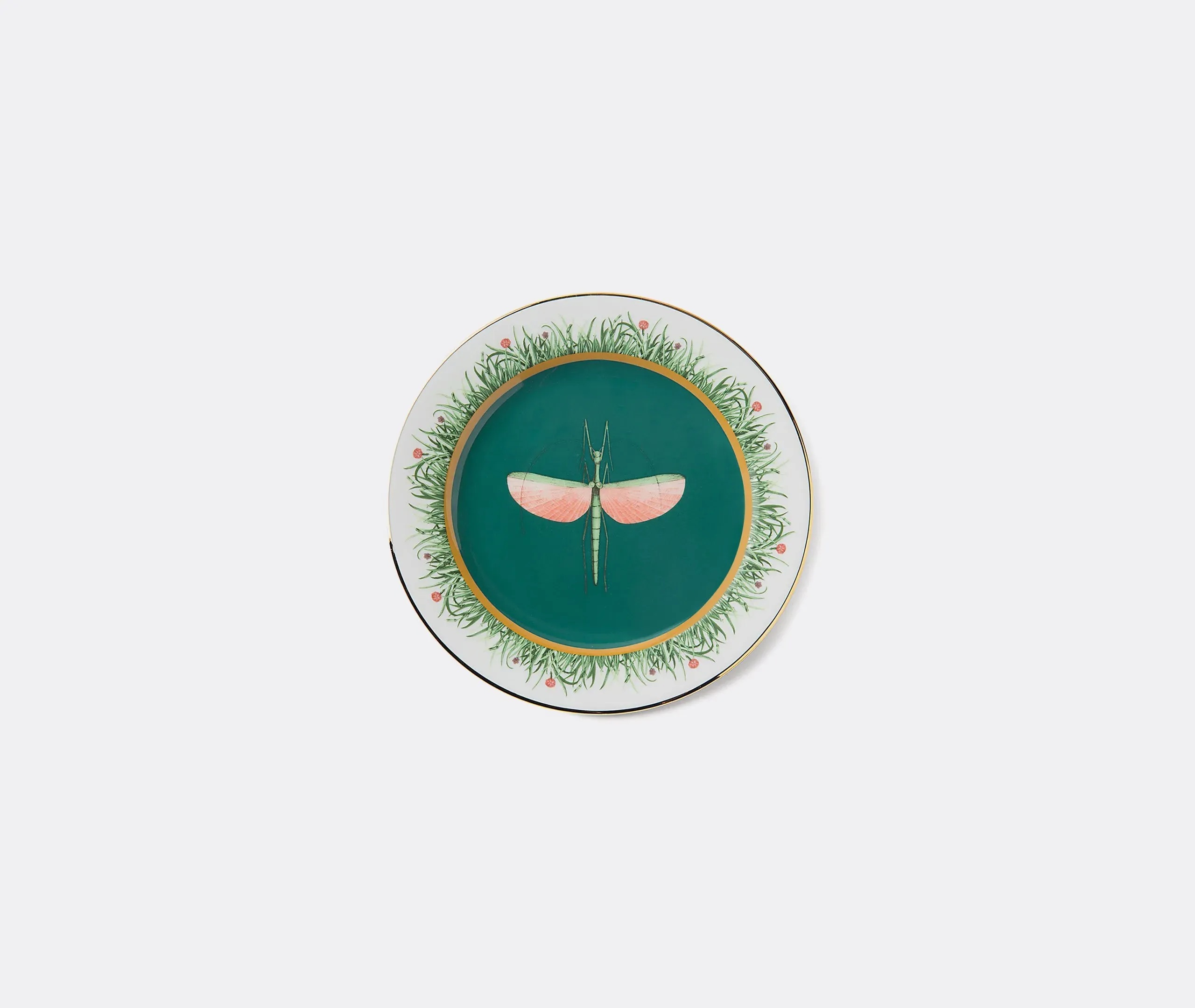 A handpainted dragonfly is the subject of this enchanting mini plate by La DoubleJ. Centered on fine, white porcelain, the libellula embodies the delicacy and beauty of the material, and is depicted in meticulous naturalistic detail in shades of pink and green. Dramatized against a jade background, this statement piece is encircled with a gold painted border and 18k gold edging. The 'Libellula' mini plate, which comes as a set of two, can be paired with other pieces from the series for delightful displays.