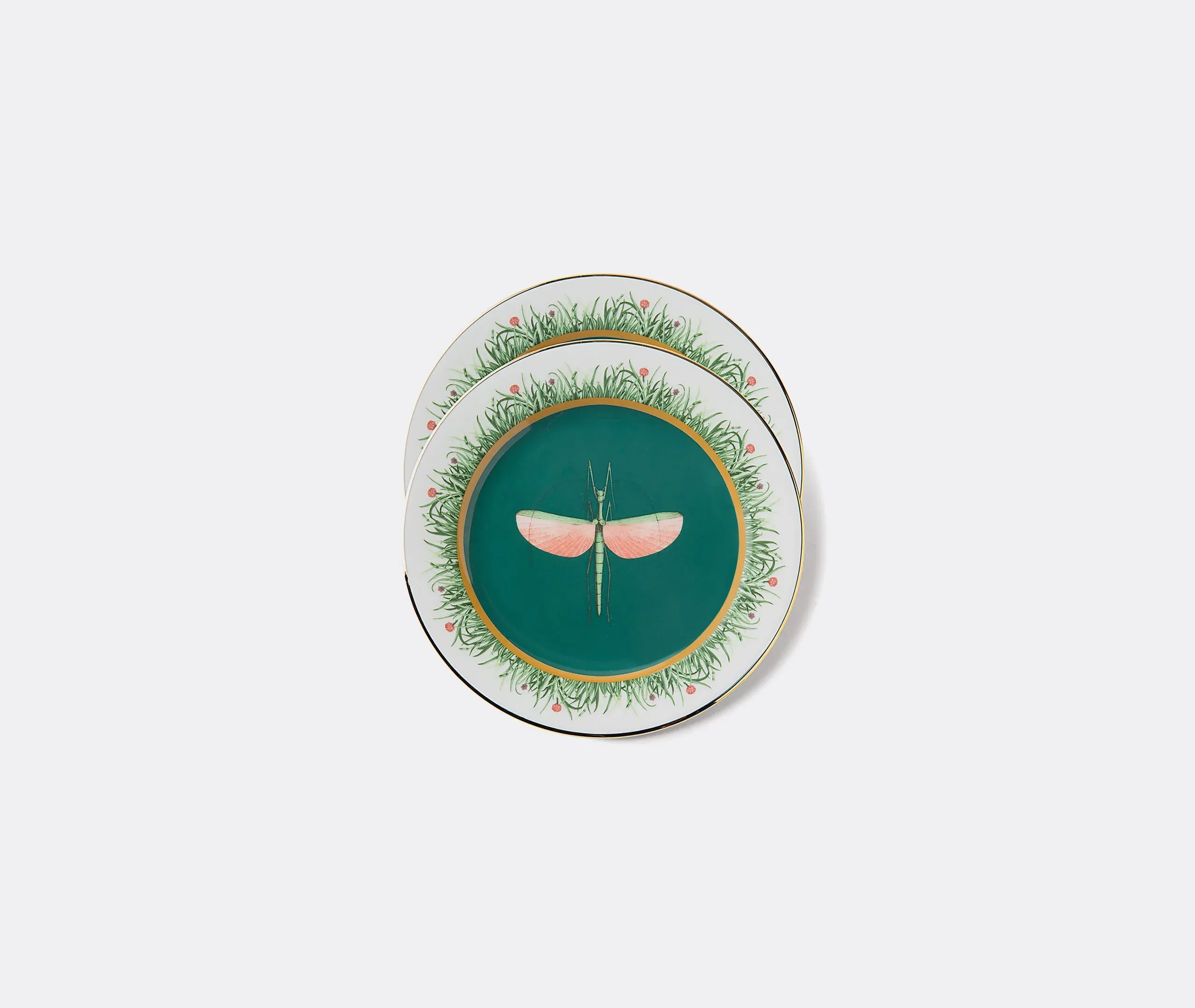 The Libellula mini plate set features handpainted dragonfly motifs on fine white porcelain with jade backgrounds. Each plate displays the dragonfly in meticulous naturalistic detail with pink and green shades. The design combines a gold painted border with 18k gold edging, and the set includes two plates for coordinated table settings.
