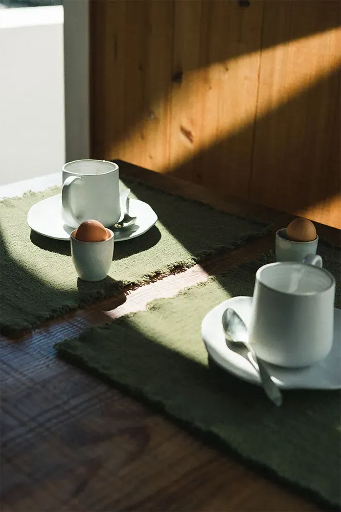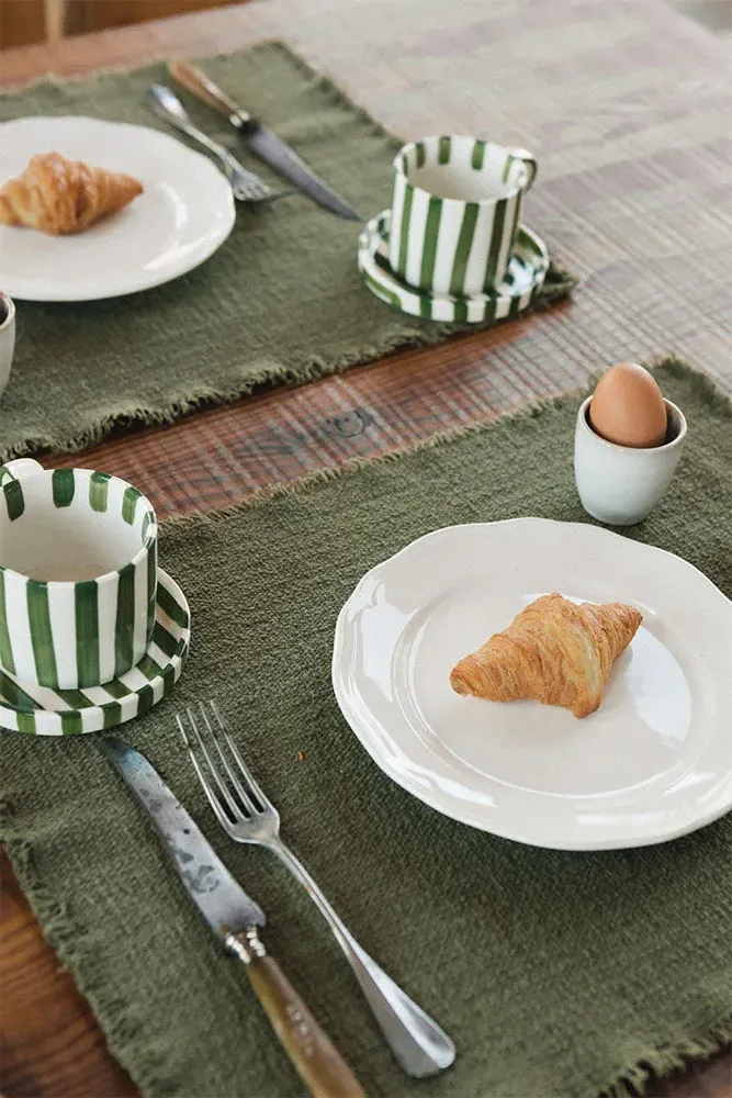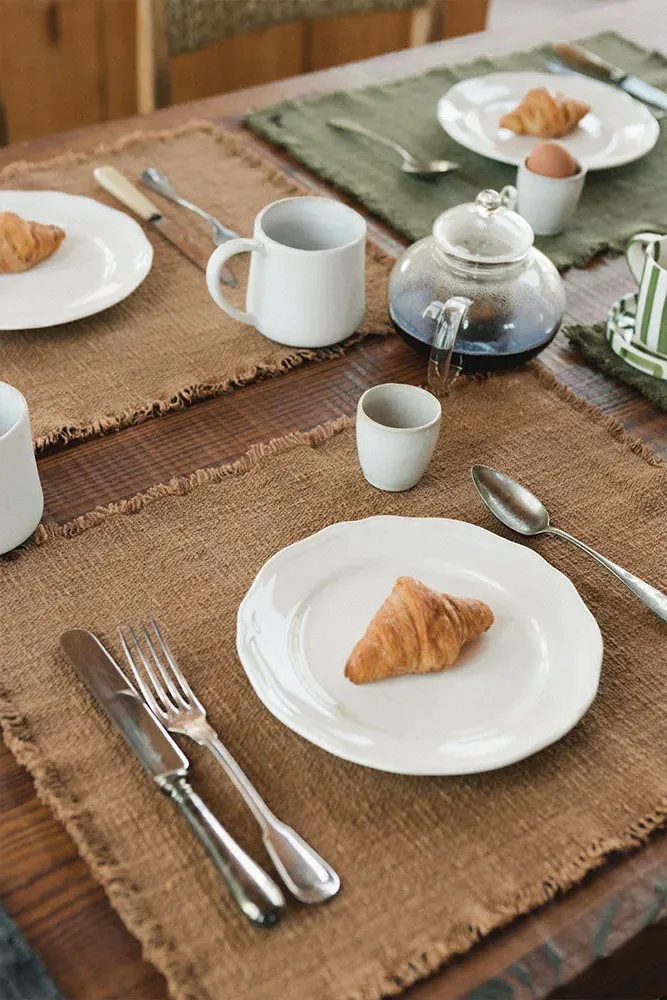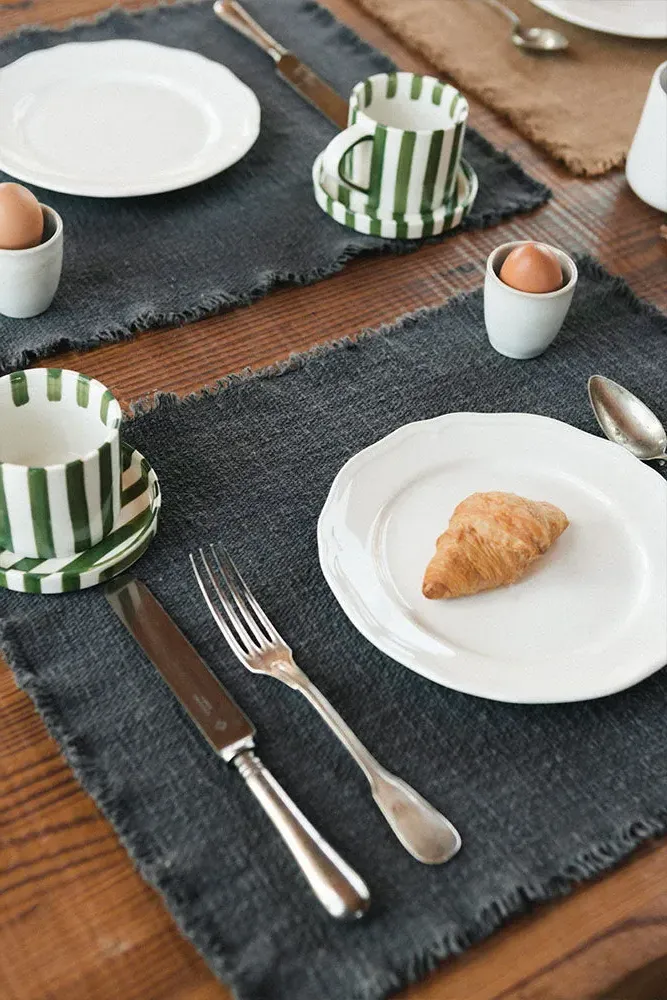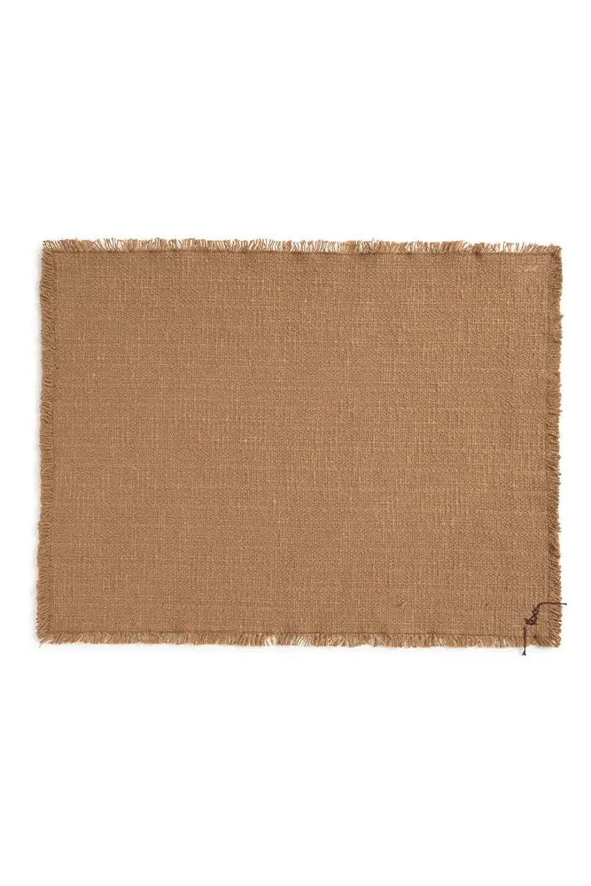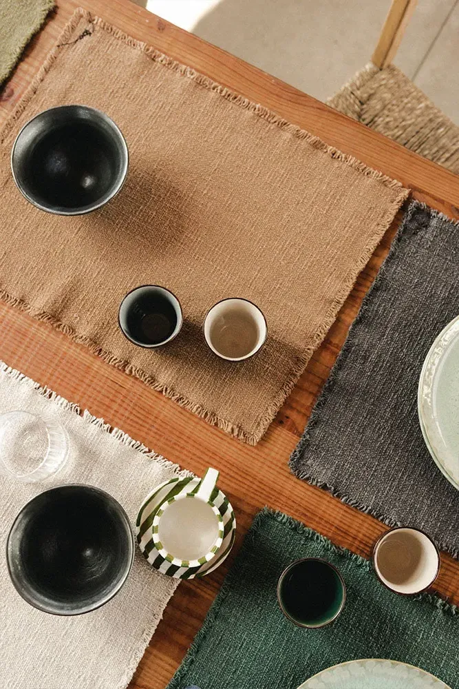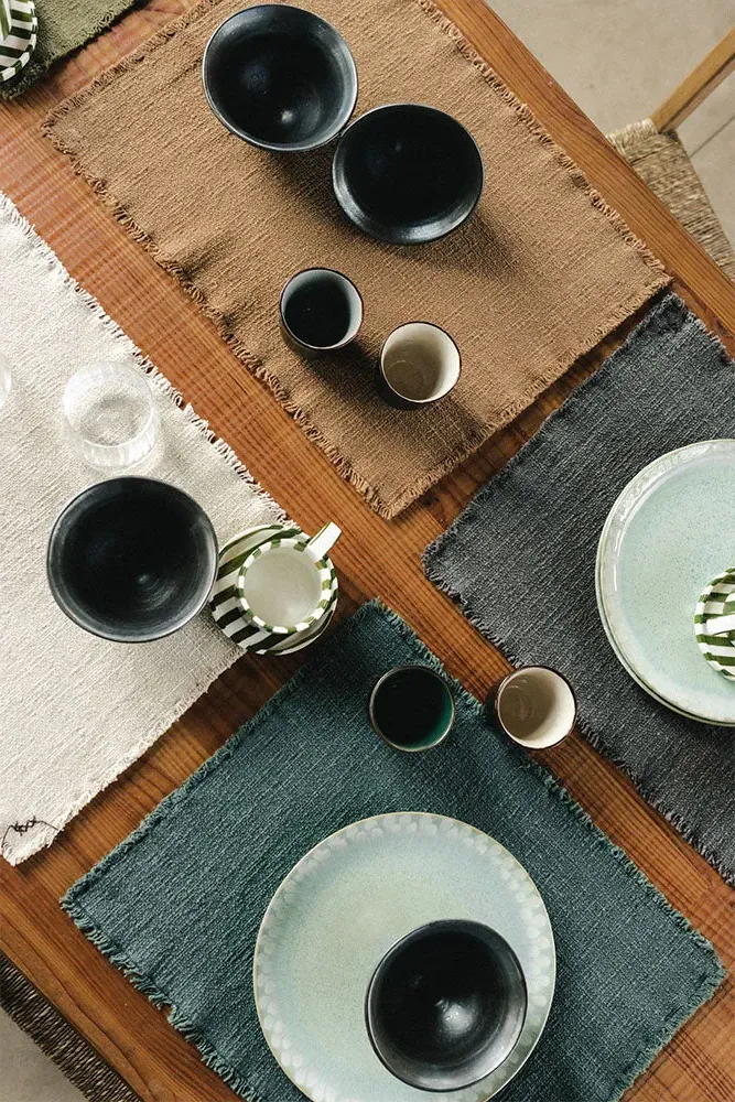 The Juarez placemats offer rustic refinement with their handcrafted construction from RugCycled® fibers and natural cotton. Each piece features unique variations in color and weave, while the organic texture and subtle irregularities reflect authentic handmade craftsmanship. The black line accents add visual interest, and the natural materials bring warmth to everyday dining. W40 x D51 cm per placemat.