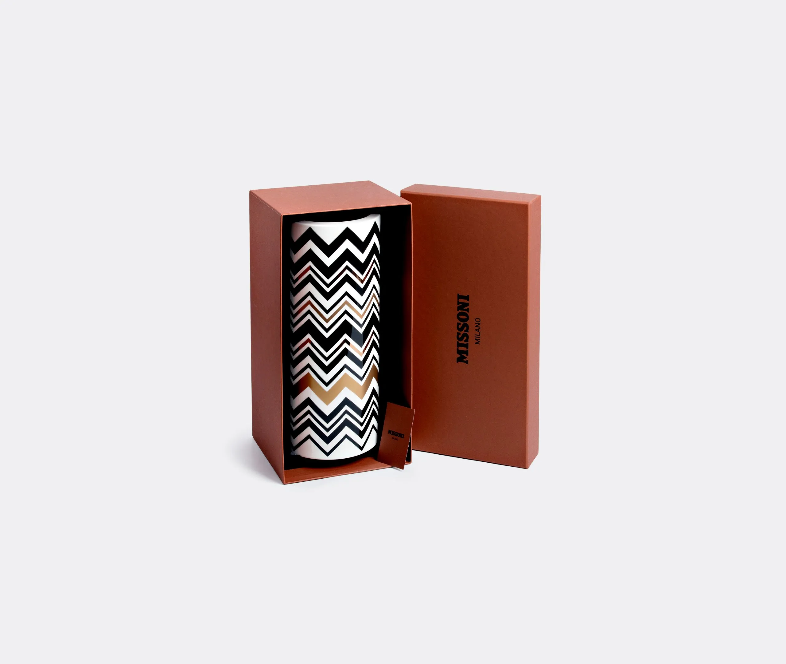 Fashion brand Missoni has been producing knitwear bearing its signature zigzag motifs, stripes, waves and slub yarns since 1953. The 'Zig Zag Gold' collection, with its multicolour zigzag print in bright tones, is a great example of how the brand has successfully adapted these same themes for homeware items produced by Its interiors spinoff — MissoniHome. This mug features the familiar print in white, black and gold across its entire exterior surface for an elegant and sophisticated home accent.
