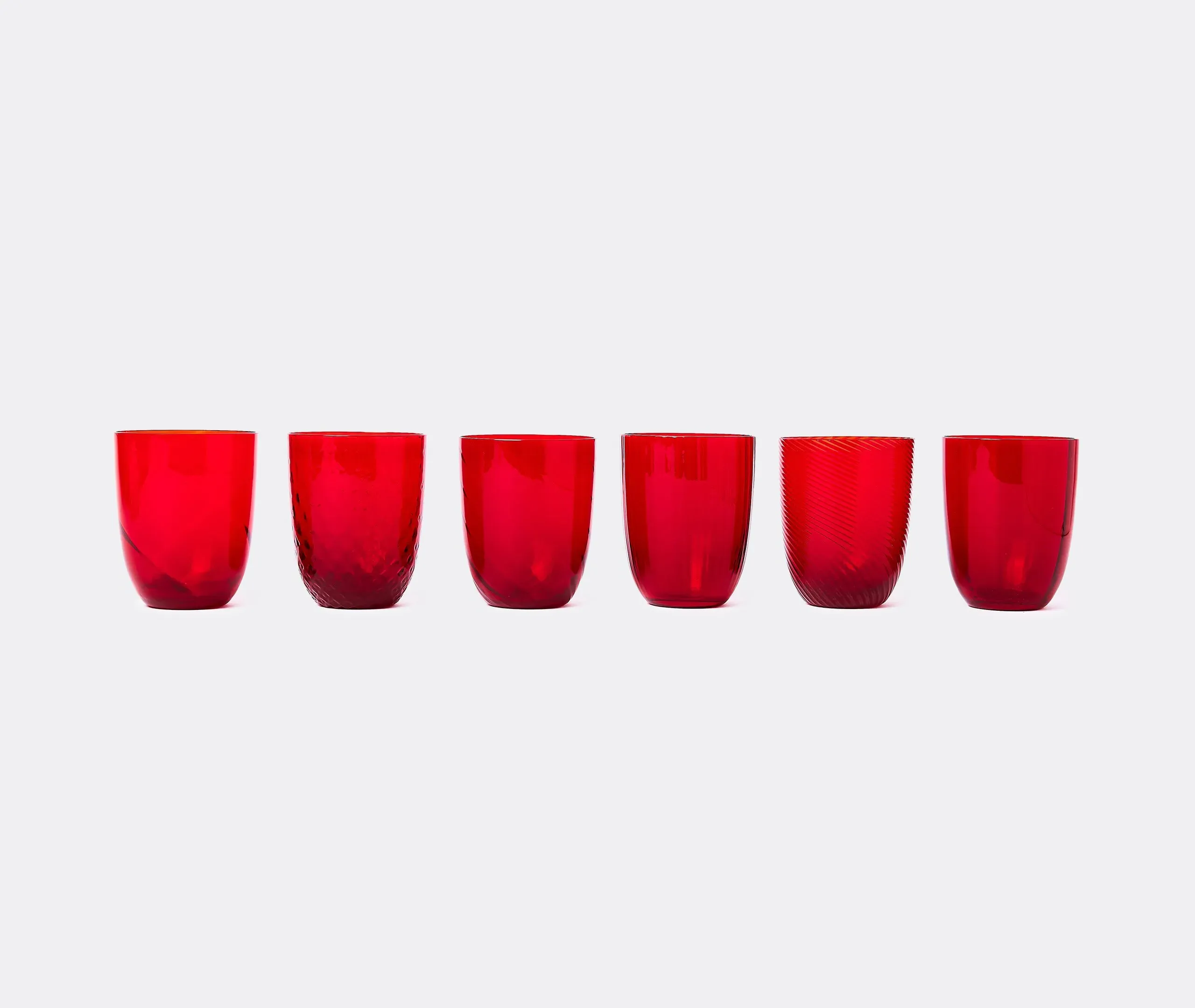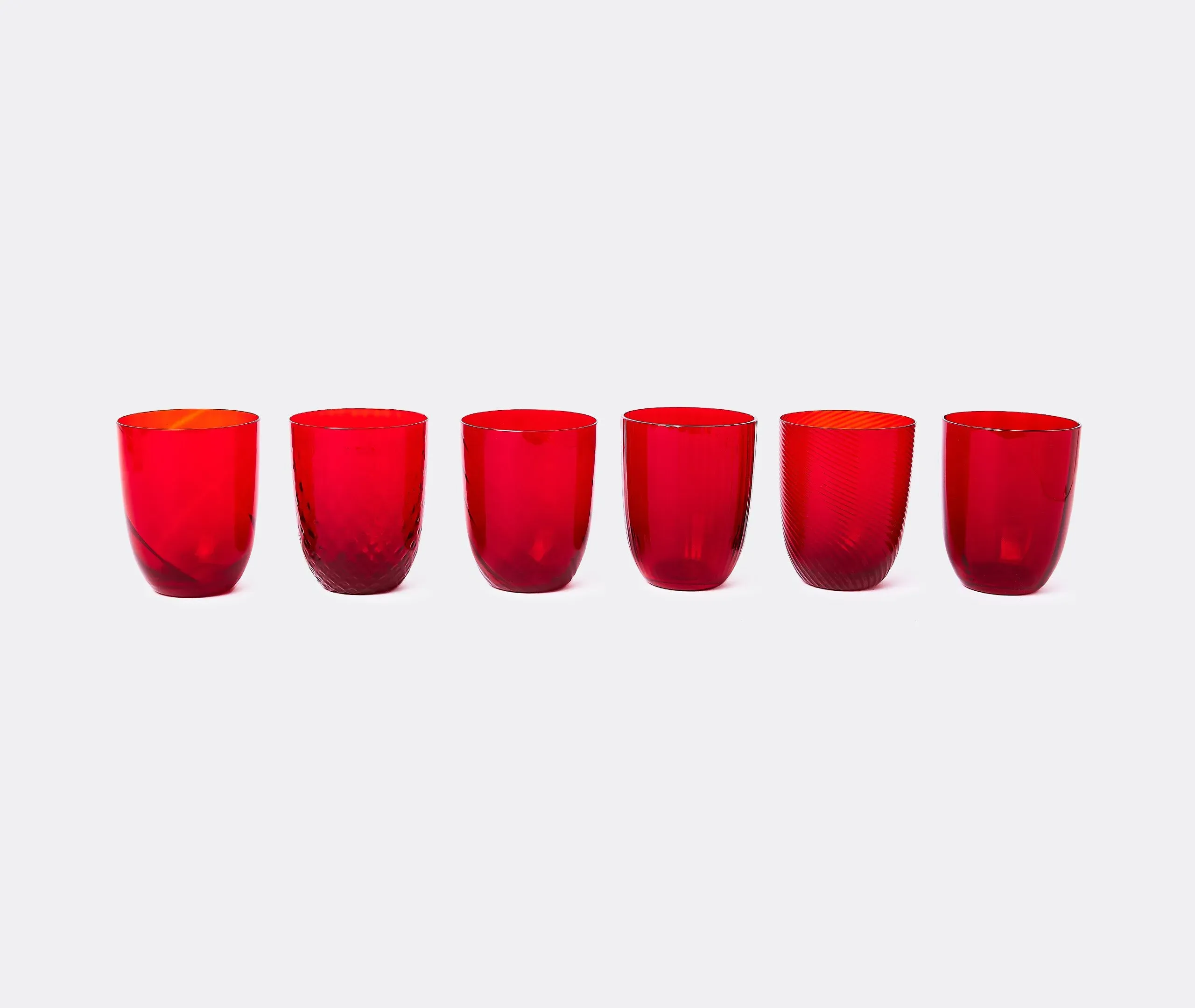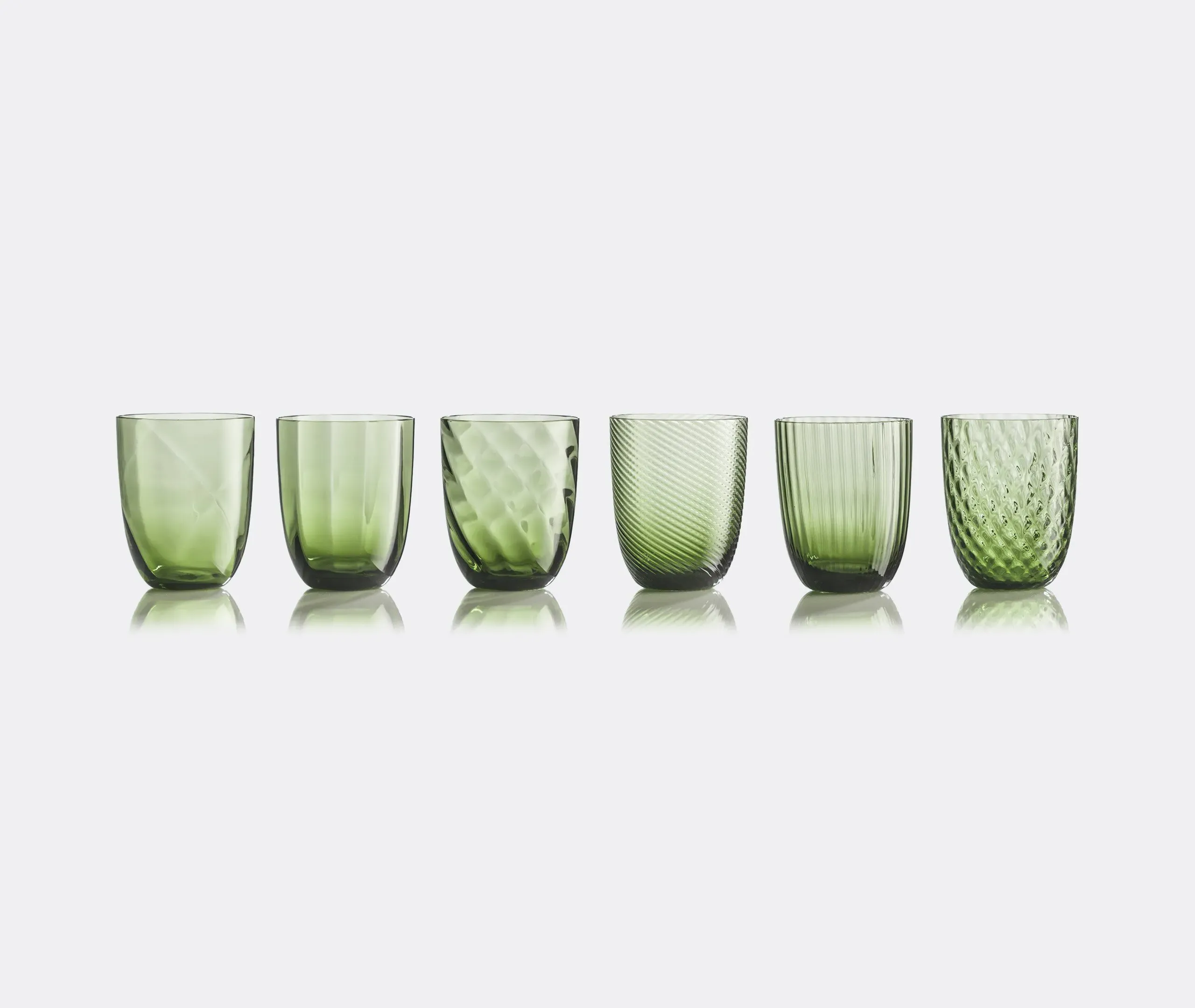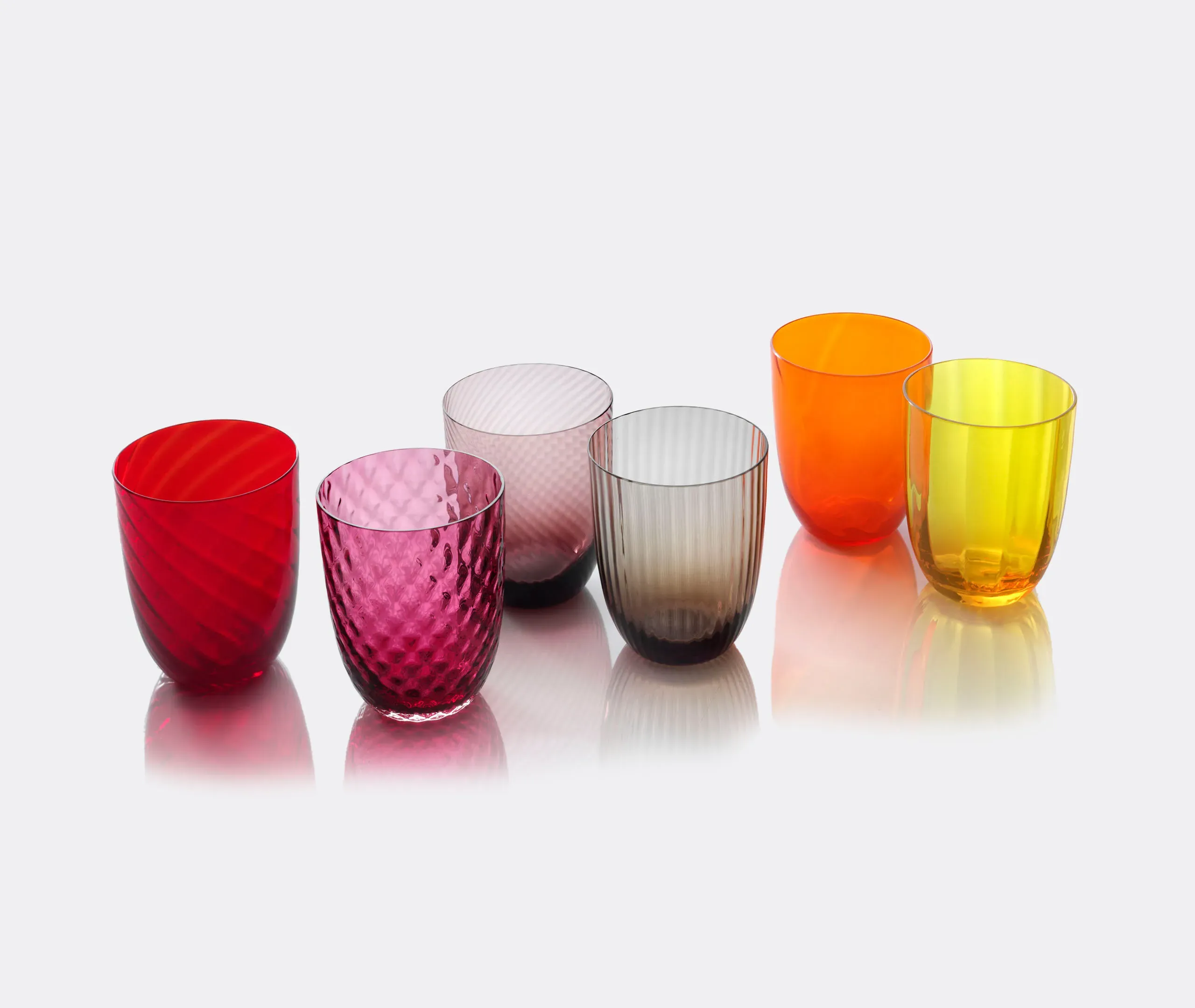 Born from designer Stefano Marcato's passion for the glass-making process, the 'Idra' water glass set combines six distinct textures for a collection that is at once original and harmonious. Produced by NasonMoretti, the unique glass surfaces span lens, rigadin, balloton, rigadin twisted and twisted optical designs, each one engraved into the glass while it is still hot, in true Murano tradition.