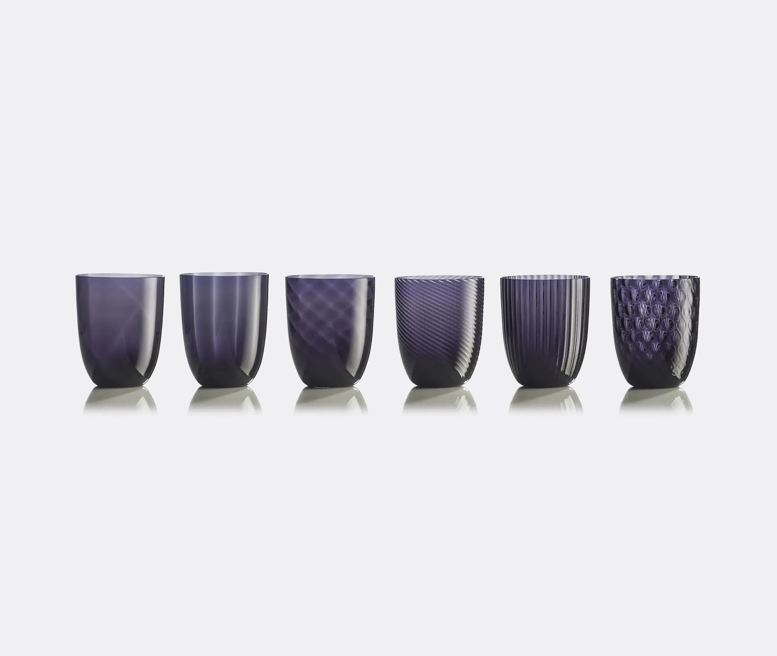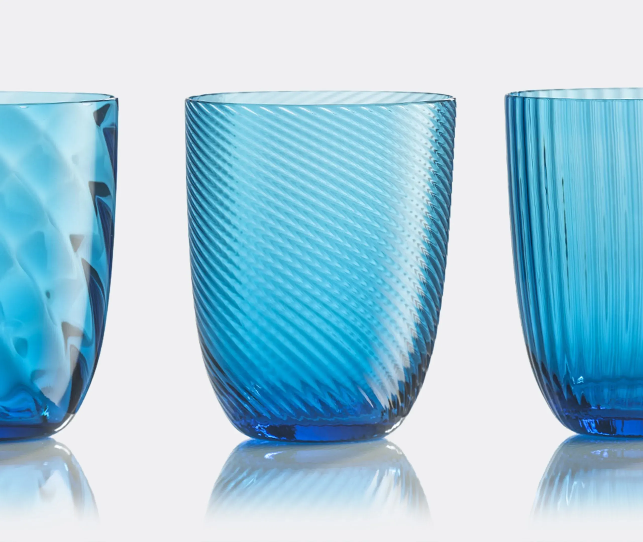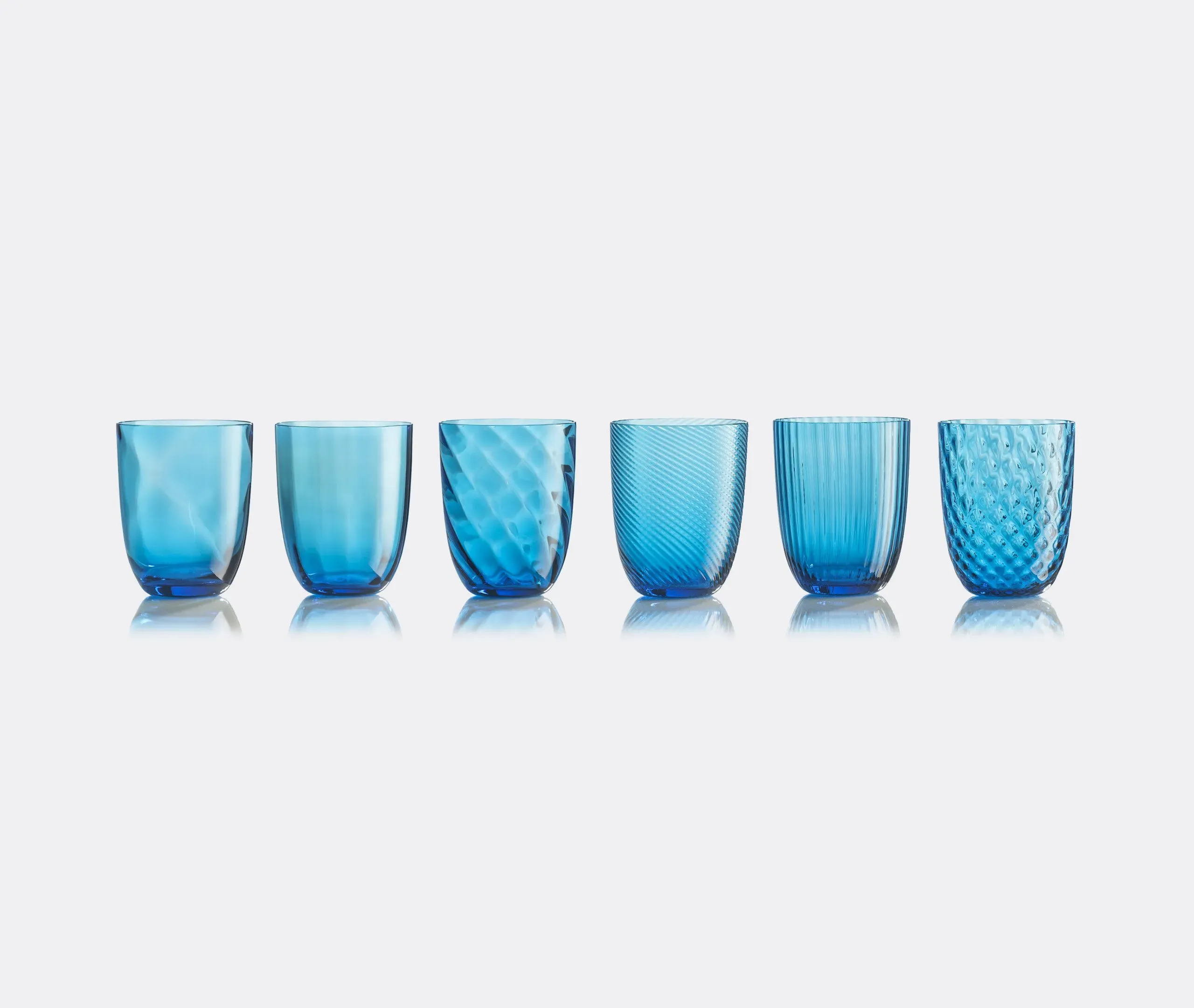 The Idra water glass set features six distinct textures that create an original yet harmonious collection. Each glass displays unique surface designs including lens, rigadin, balloton, and twisted optical patterns, engraved into the hot glass using traditional Murano craftsmanship. The blue coloring enhances the textural details while maintaining the set's cohesive aesthetic.