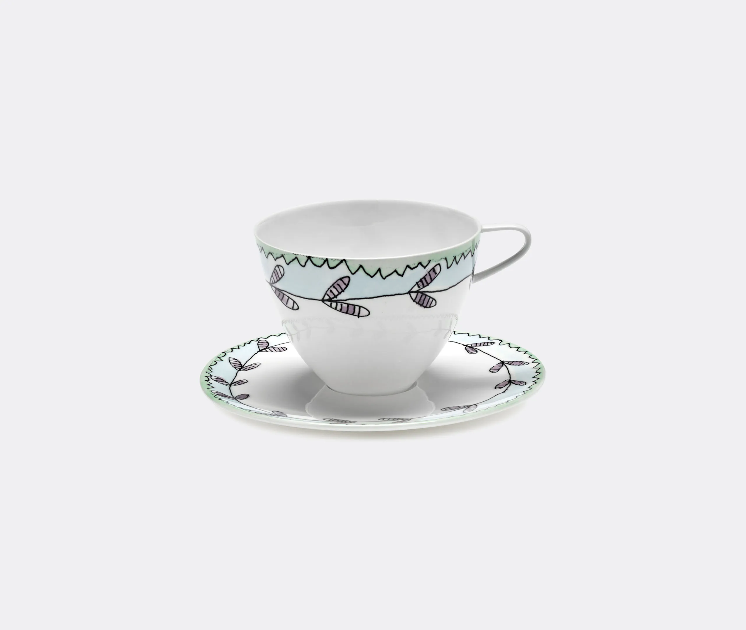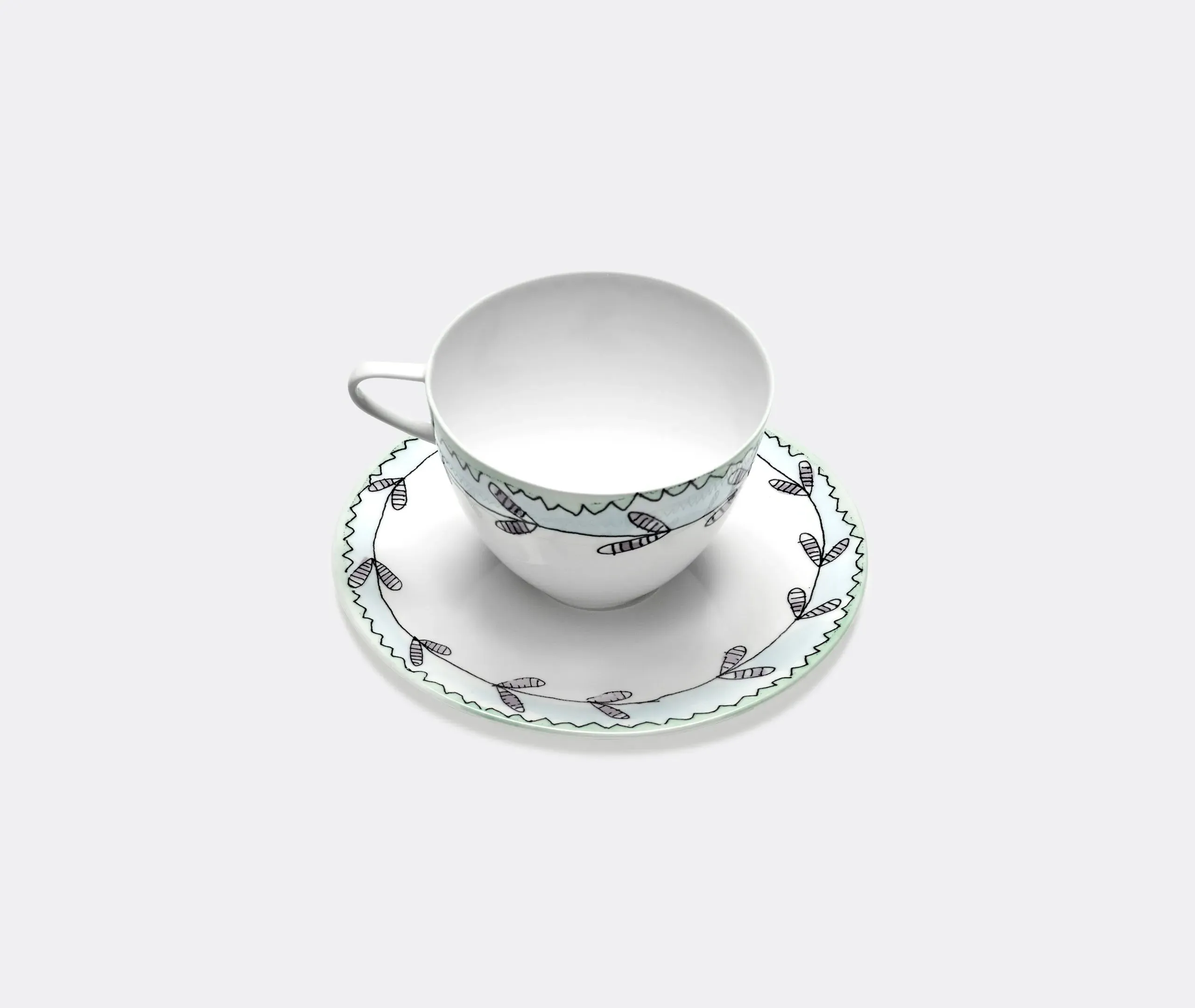 The coffee cup and saucer set combines fine bone china construction with delicate Blossom Milk florals and squiggled line details. Its glazed surface features blue floral bands on both cups and saucers, while the asymmetric shaping enhances the porcelain's natural character. The hand-finished application adds distinctive detail, and the coordinated motifs create cohesive presentation for coffee service.