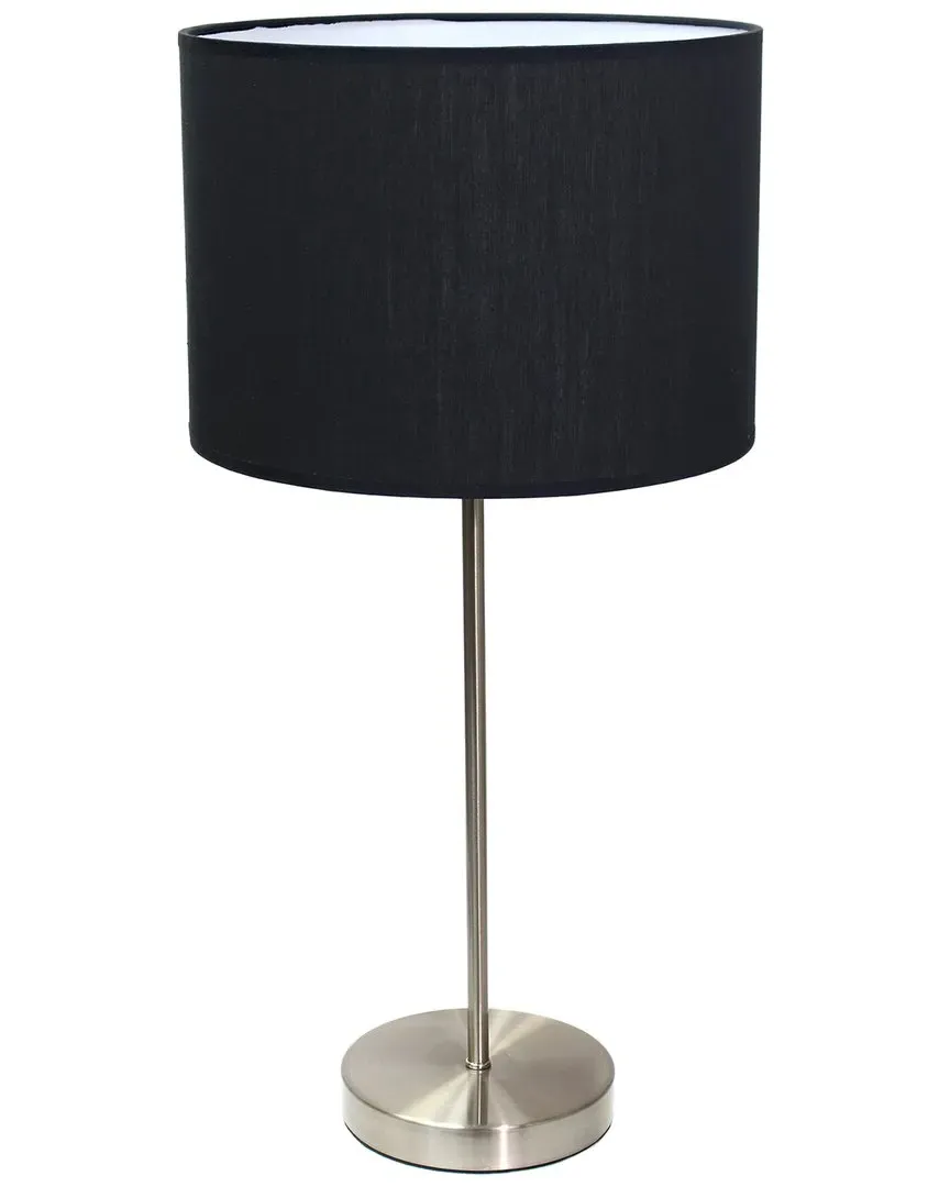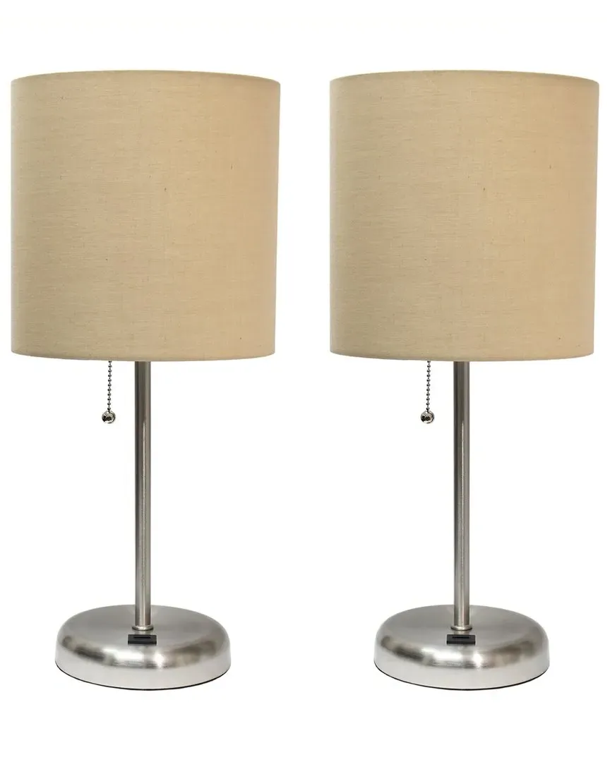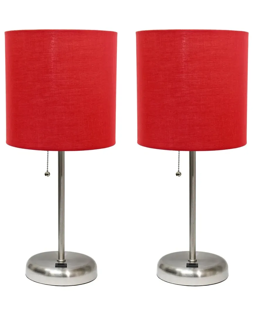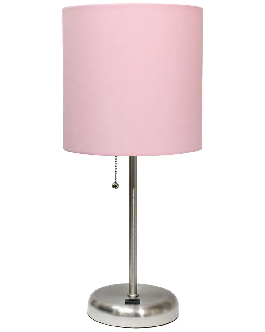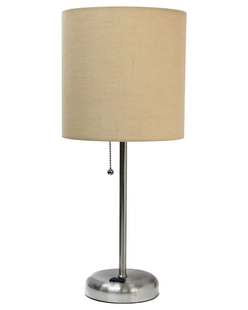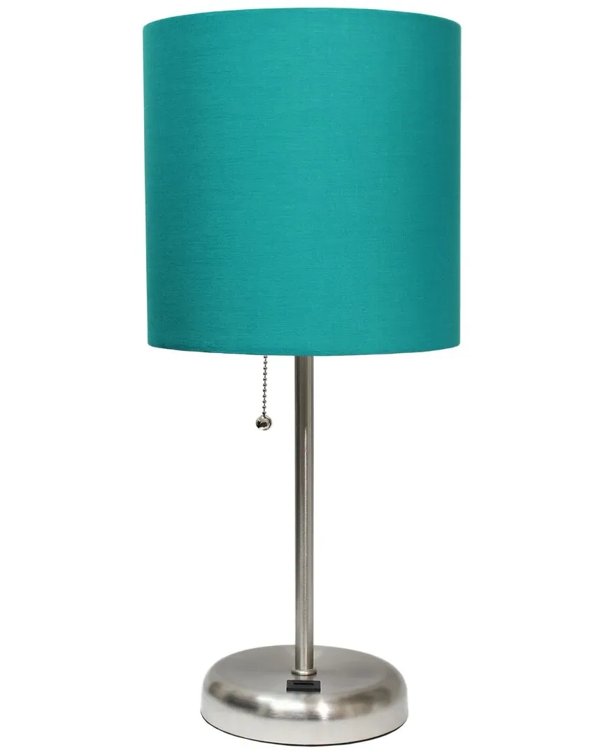 Color/finish: brushed steel/aqua Design details: Brushed Steel base with Charging Outlet; Fabric Shade; Perfect for bedrooms, kids room, college dorm, nursery, or fun office; Shade Diameter: 8.5" x Height: 19.5"; Uses 1 x 60W type A medium base bulb (not included); Power Outlet on base for charging your Cell phone, iPod, iPhone, iPad Measures 8.5in x 8.5in x 19.5in Brushed Steel/Aqua Metal base Requires 1x60W Incandescent (A-19) bulbs; not included Installation hardware included Imported