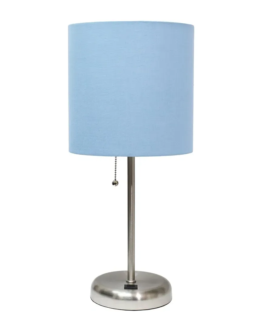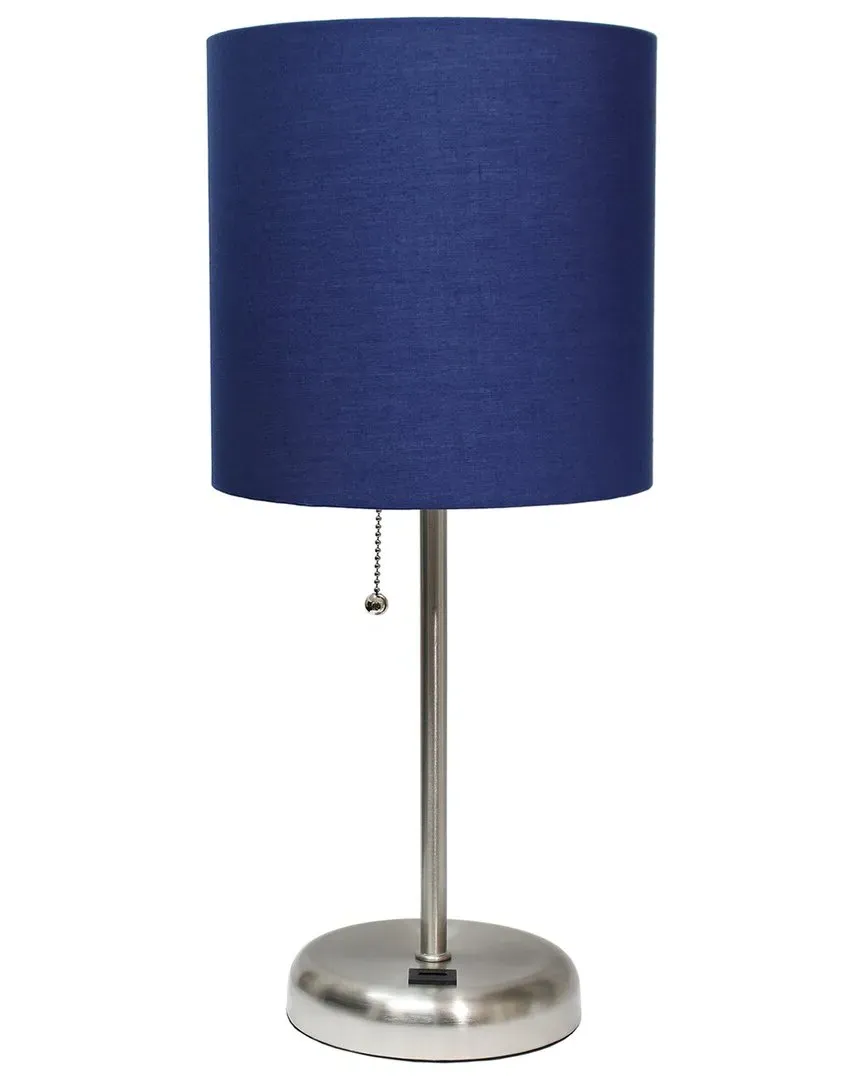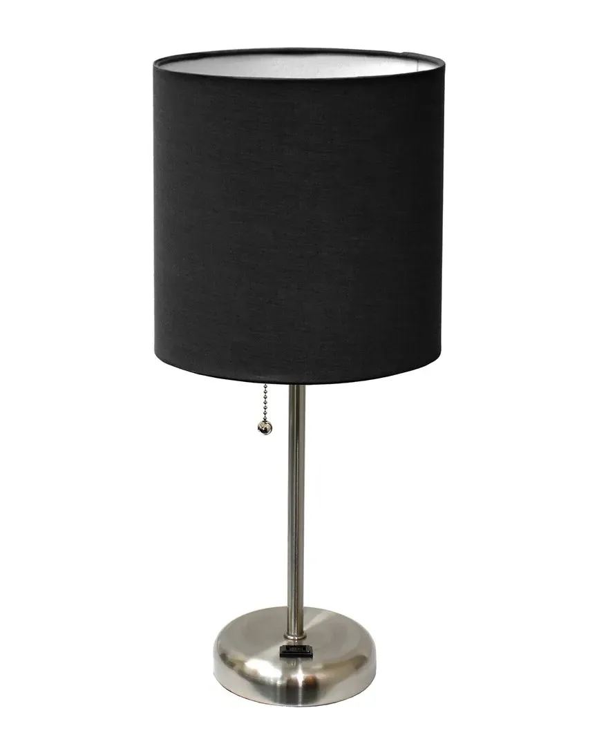 The table lamp offers practical lighting with its charging outlet and drum shade construction. Its white metal base provides clean lines, while the gray fabric shade delivers soft illumination. The lamp includes an LED bulb and features UL approval for reliability. Base measures 5.25in with an 8.5in shade.