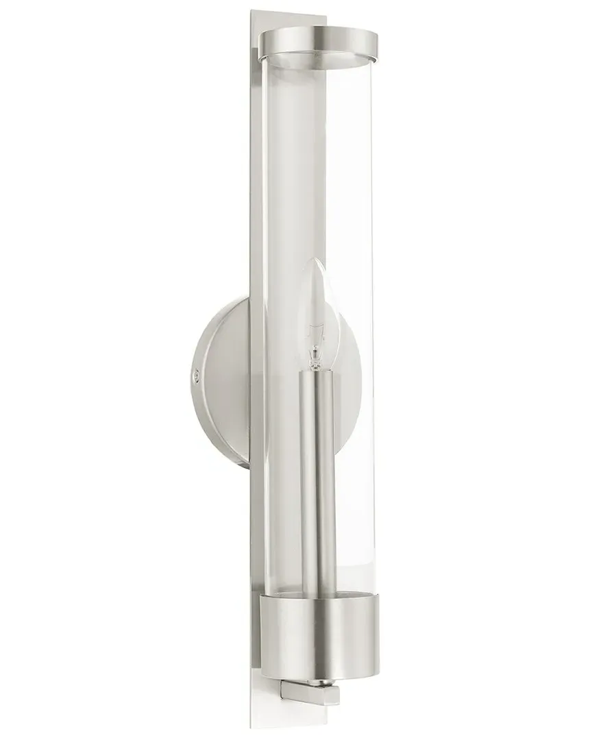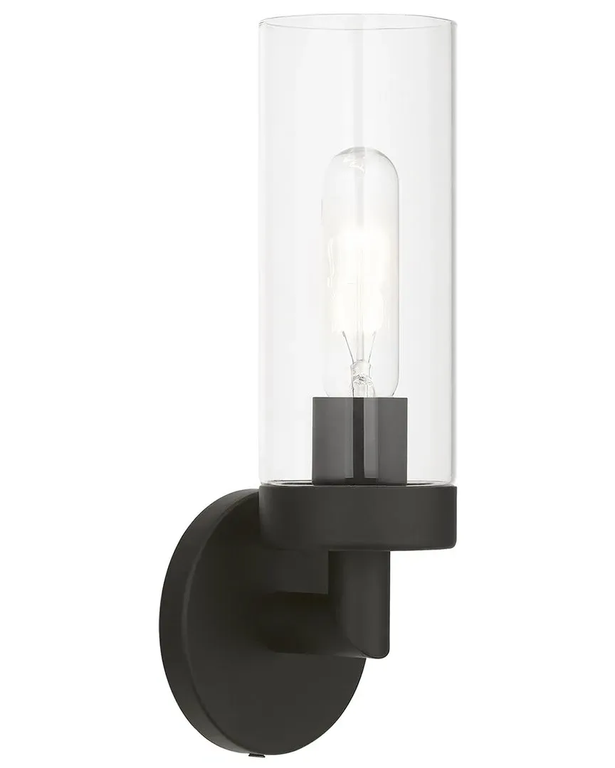 Color/finish: black Part of the Aero collection Design details: Add a dash of character and radiance to your home with this wall sconce. This single-light fixture from the Aero Collection features a black finish with a satin opal white glass. The clean lines of the back plate complement the cylindrical glass shade creating a minimal, sleek, urban look that works well in most decors. This fixture adds upscale charm and contemporary aesthetics to your home. Hand-crafted Hand-finished Pendant measures 4.25in Base color/finish: black steel Shade measures 2.375in x 7.875in Shade color/finish: satin opal white glass Requires 1 x 60 Watt Candelabra Base bulb(s) Installation hardware included Imported