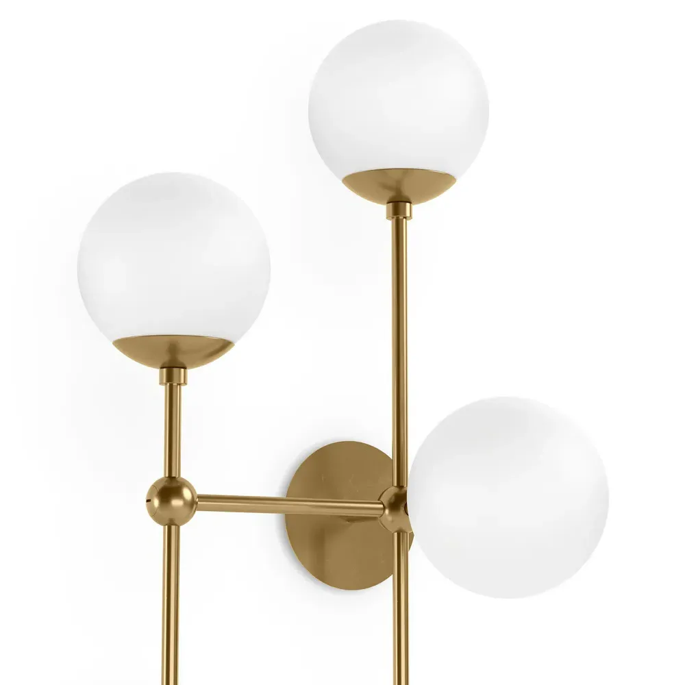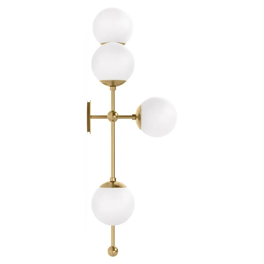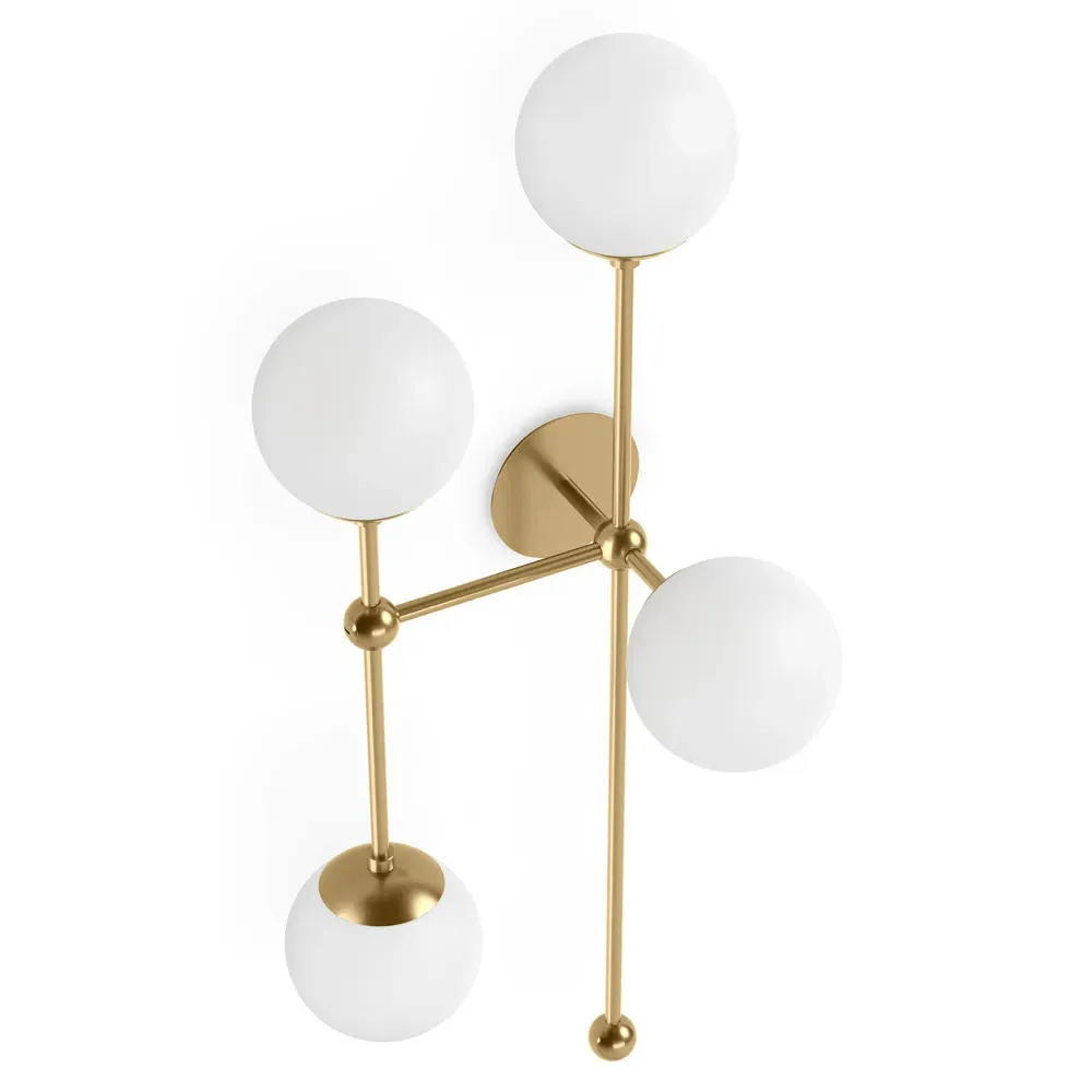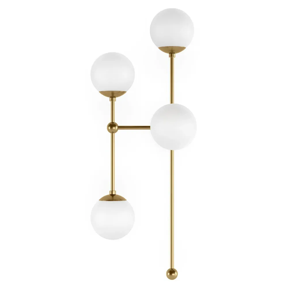 The Armstrong sconce offers sophisticated lighting with its four globe design and right-facing orientation. Constructed from brass and thermoplastic, it features a burnished brass finish accented by marble matte white globes. The hardwired fixture includes LED bulbs and provides versatile illumination with its extended arm design. W34.9 x D33.0 x H92.1 cm.