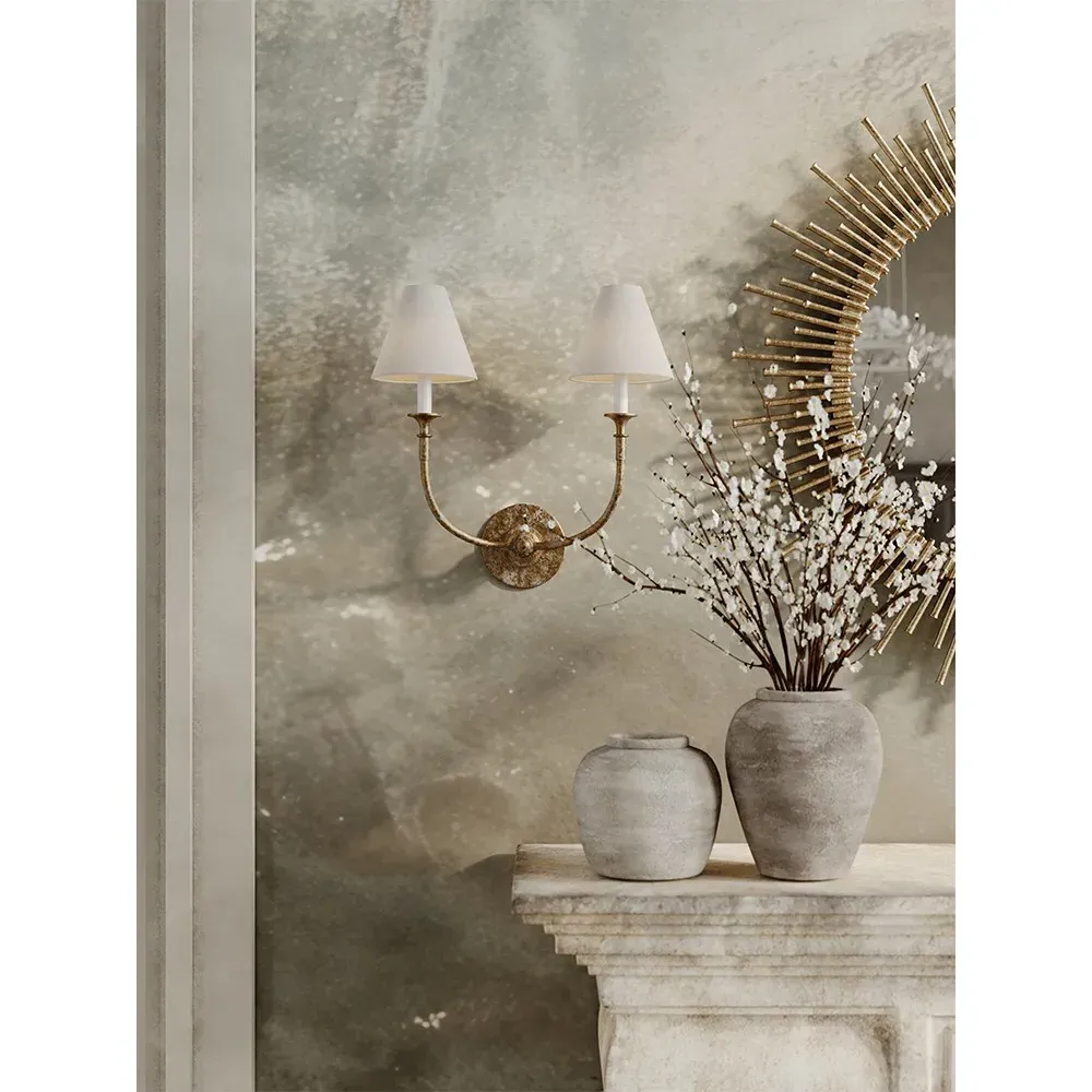 The Piaf Single wall sconce features ambient lighting with its antique gild finish, crafted from durable metal construction. Its single-light design provides focused illumination, while the round backplate offers secure wall attachment. The metal framework ensures lasting durability, and the streamlined profile complements various decor styles. W16.5 x D23.5 x H47.6 cm.
