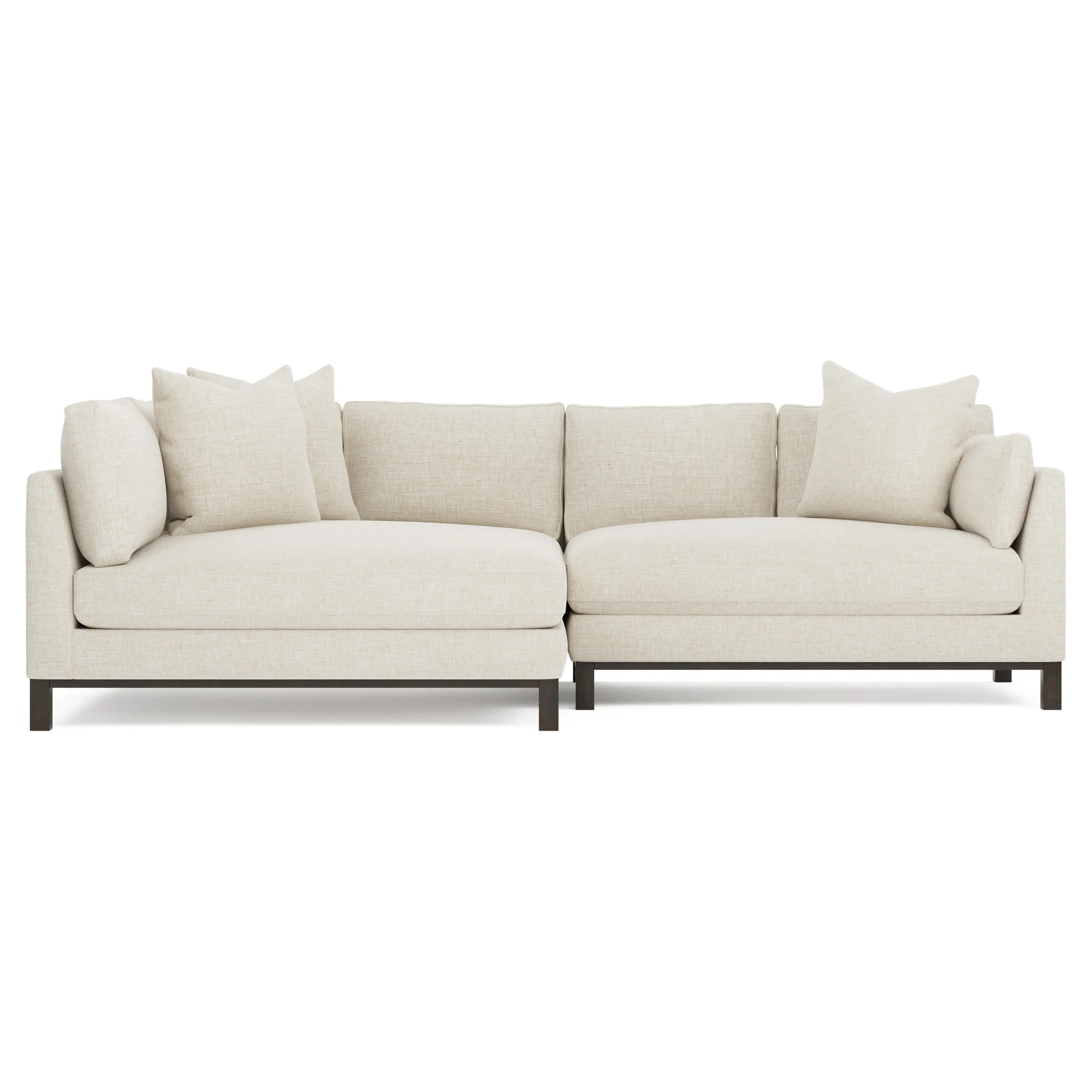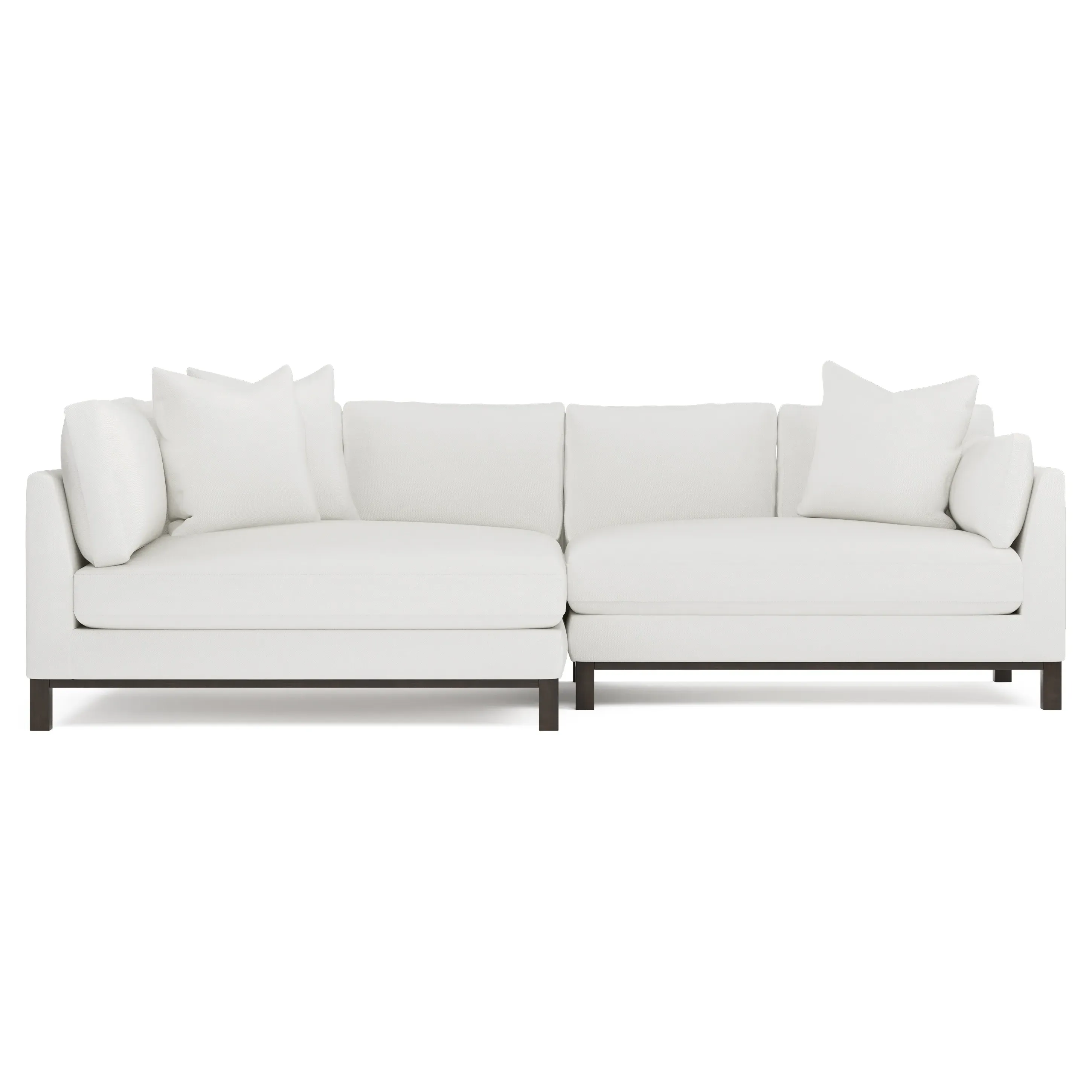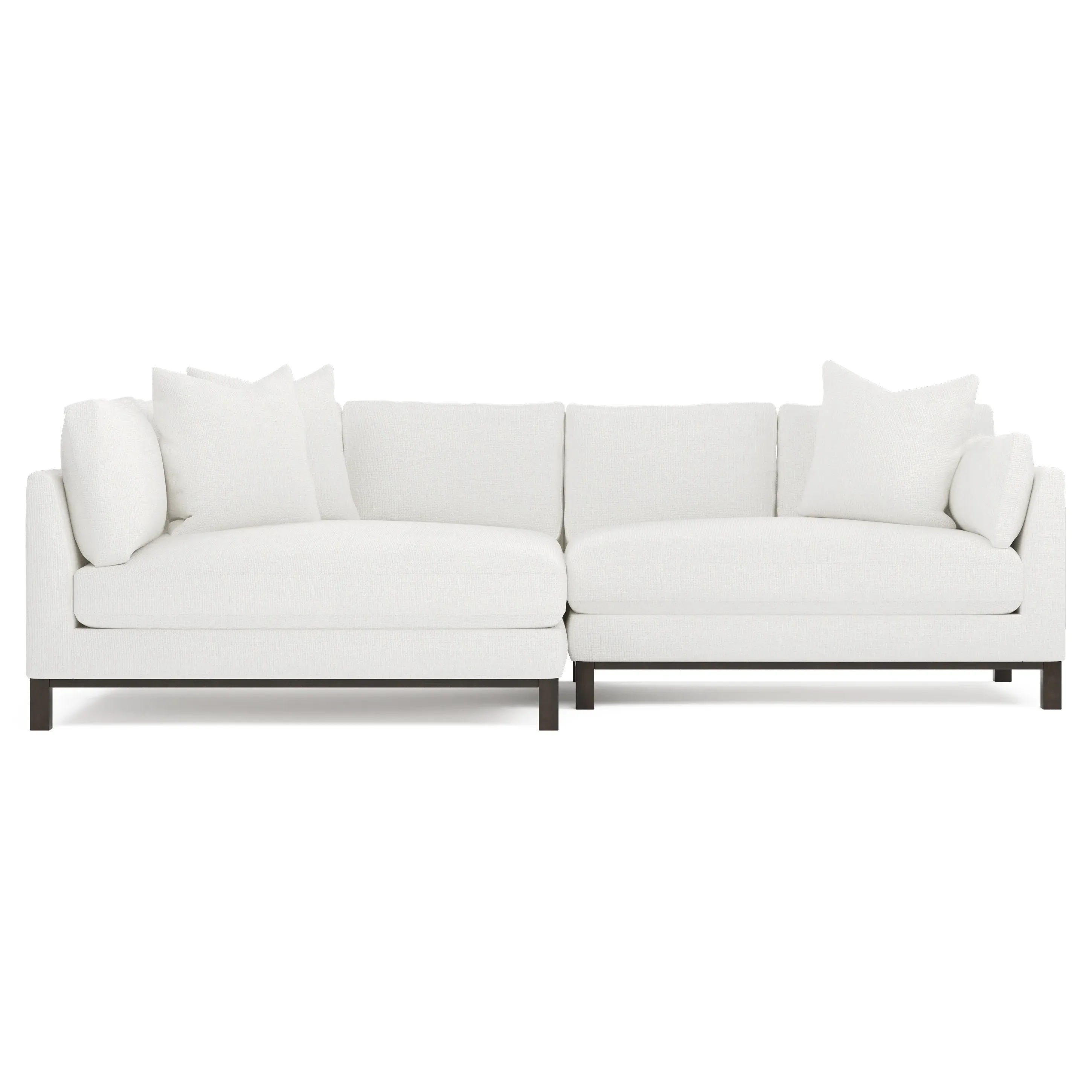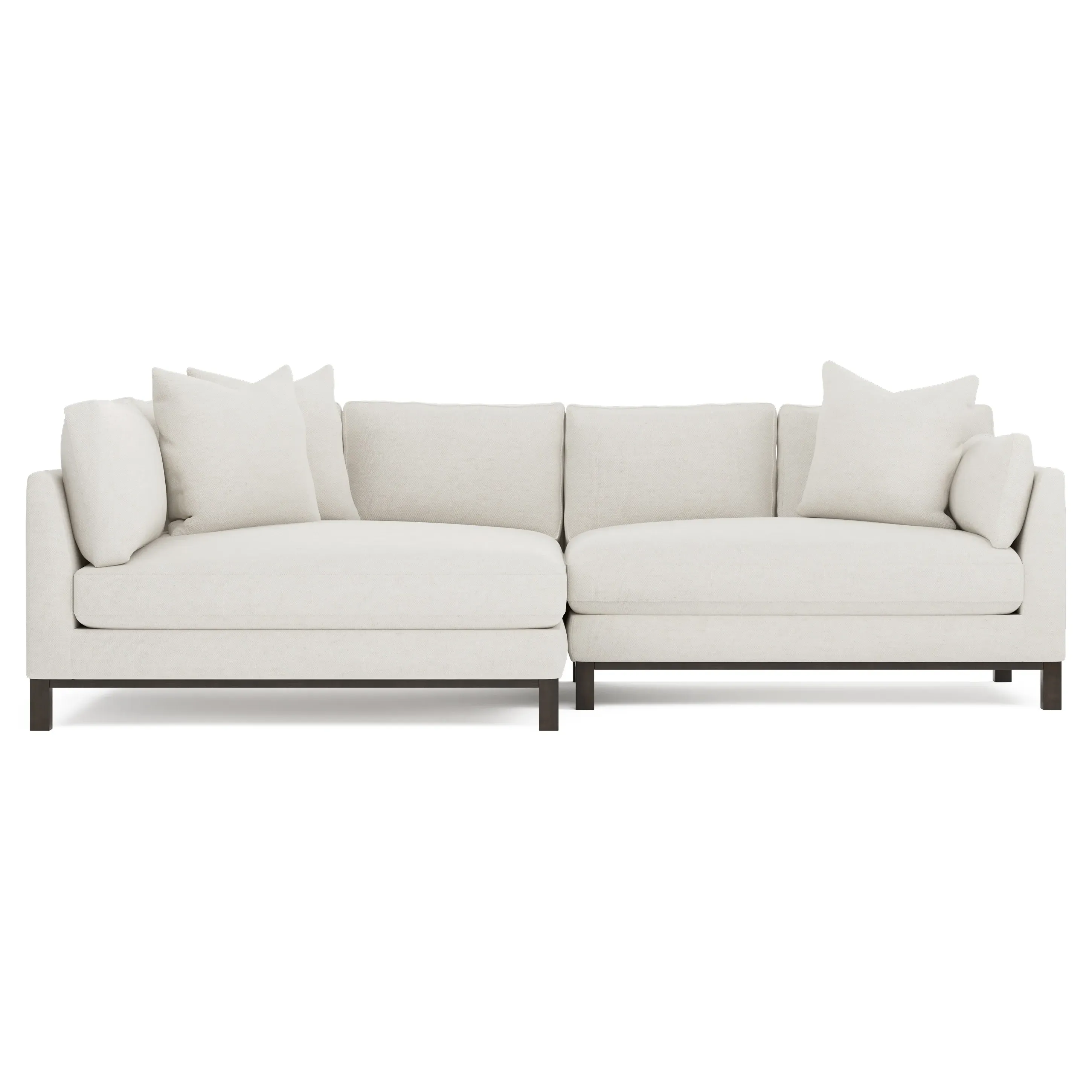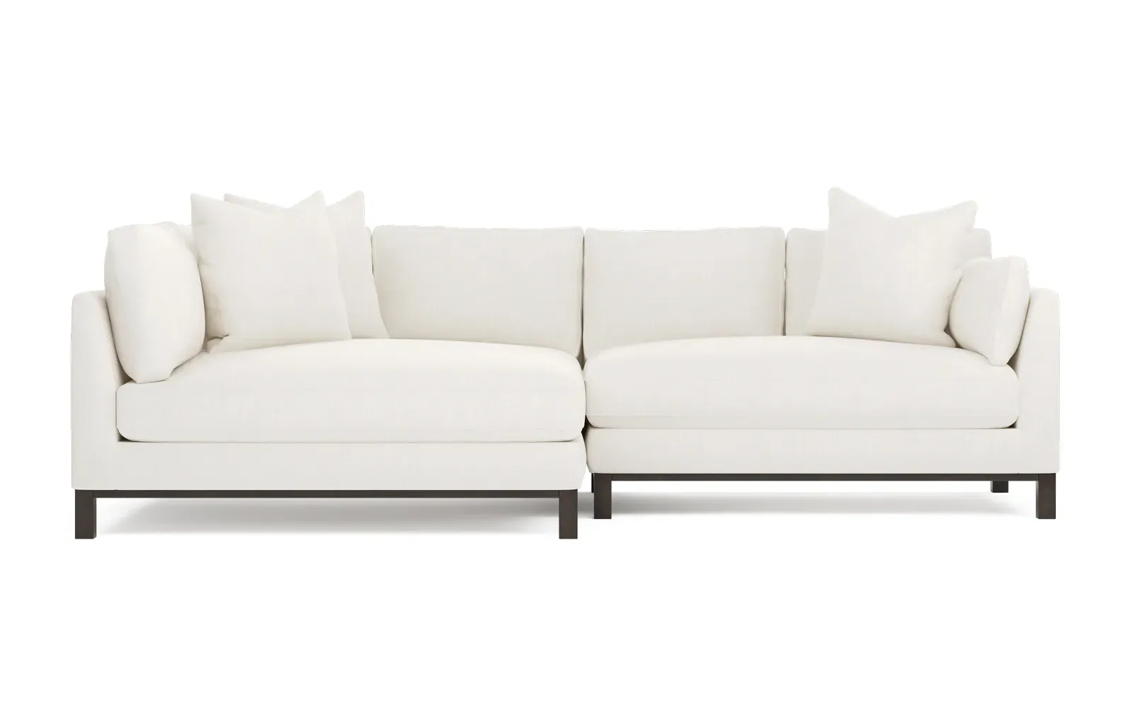 Designed with generous proportions, gently angled arms, and large throw pillows, the left 116” Adelle bumper sectional invites relaxation. A beautiful wood rail grounds the timeless transitional silhouette. Plush, comfortable seating is soft yet supportive, with a foam core surrounded by a blend of fiber, down, and feather fill. Choose from a variety of upholstery options, including linen, velvet, and performance fabrics. <b>Overall Dimensions:</b> 116" W x 61" D x 35" H. <b>Bumper Sofa Dimensions:</b> 58” W x 61” D x 35” H; <b>End Sofa Dimensions:</b> 58” W x 38” D x 35” H; <b>Seat Dimensions:</b> 25” D x 21” H; <b>Arm Height:</b> 28”; <b>Leg Height:</b> 5”. <b>Materials:</b> FSC®-certified, US-sourced, formaldehyde-free solid kiln-dried hardwood and furniture-grade laminates. <b>Material Finish:</b> Espresso legs. <b>Pieces Included:</b> Left bumper sofa, right end sofa.