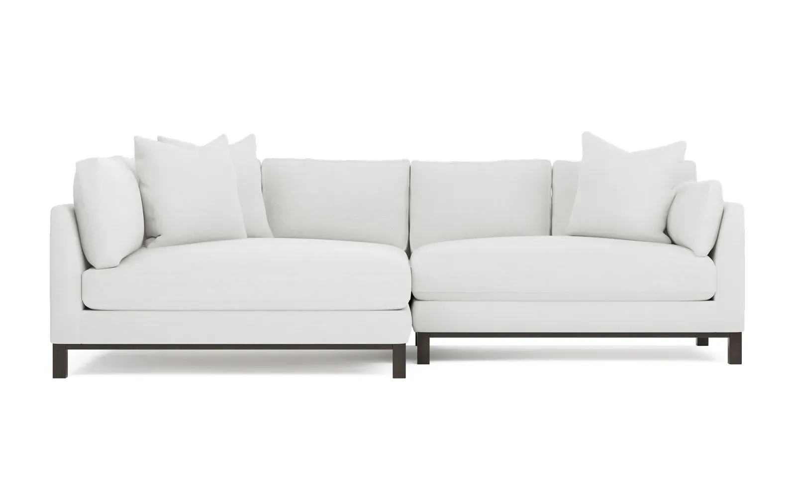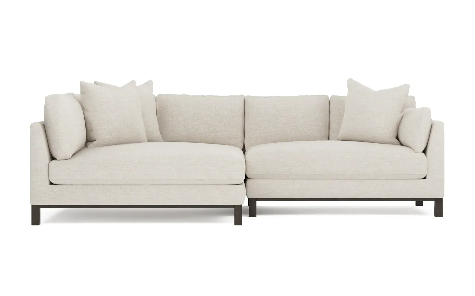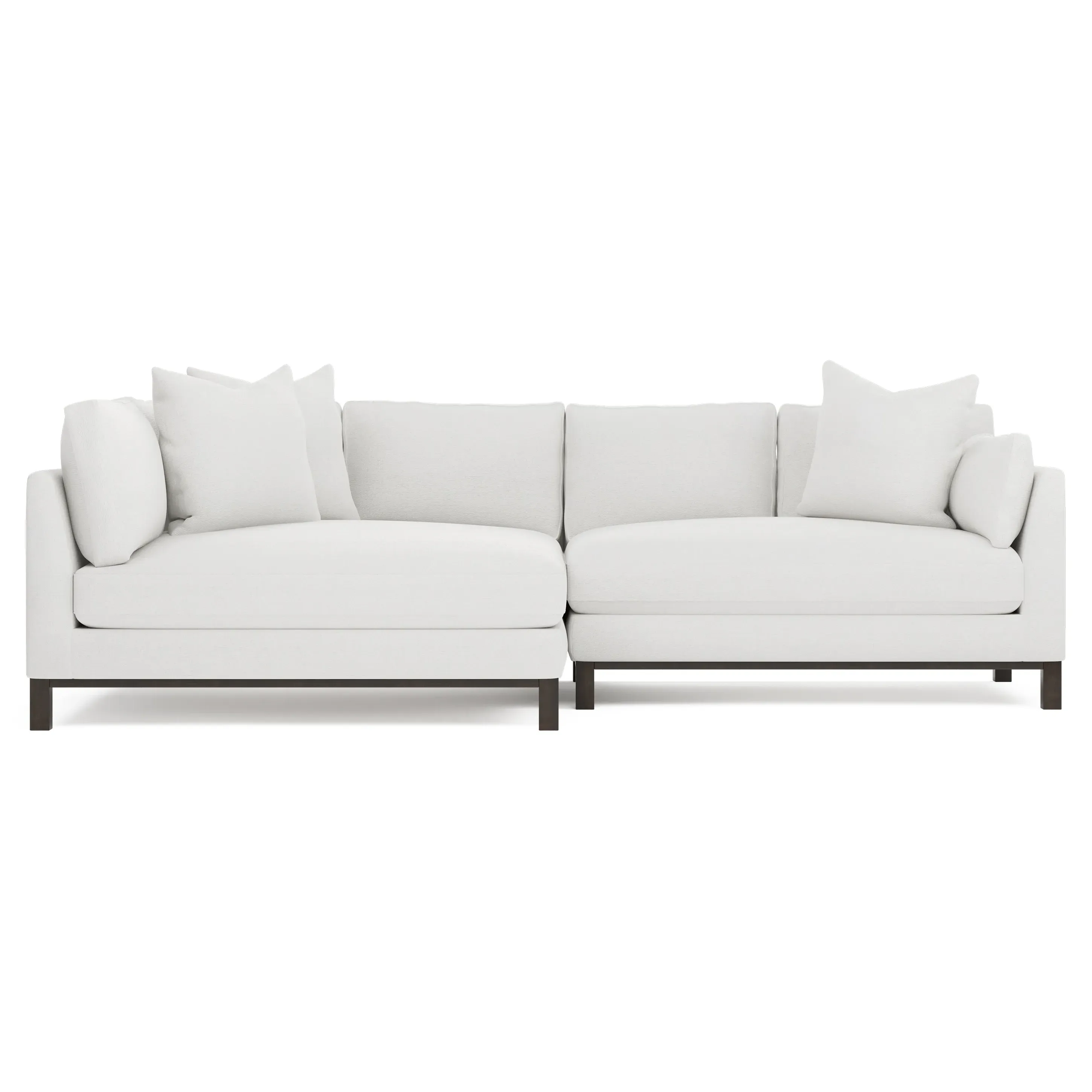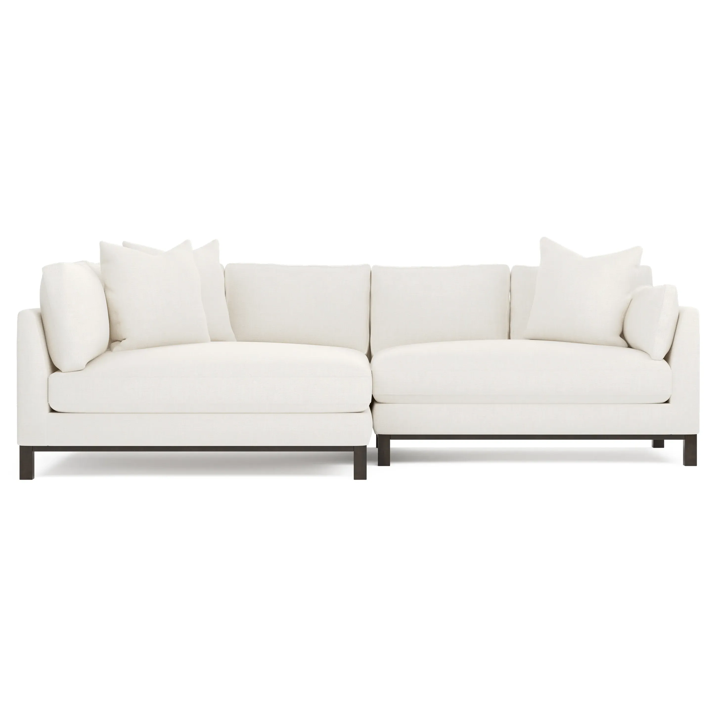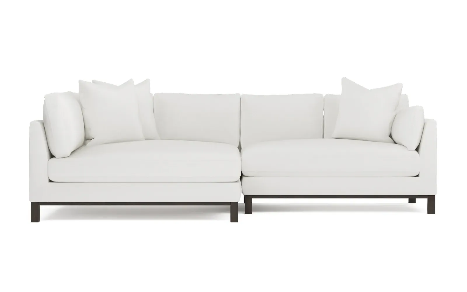 Designed with generous proportions, gently angled arms, and large throw pillows, the left 116” Adelle bumper sectional invites relaxation. A beautiful wood rail grounds the timeless transitional silhouette. Plush, comfortable seating is soft yet supportive, with a foam core surrounded by a blend of fiber, down, and feather fill. Choose from a variety of upholstery options, including linen, velvet, and performance fabrics. <b>Overall Dimensions:</b> 116" W x 61" D x 35" H. <b>Bumper Sofa Dimensions:</b> 58” W x 61” D x 35” H; <b>End Sofa Dimensions:</b> 58” W x 38” D x 35” H; <b>Seat Dimensions:</b> 25” D x 21” H; <b>Arm Height:</b> 28”; <b>Leg Height:</b> 5”. <b>Materials:</b> FSC®-certified, US-sourced, formaldehyde-free solid kiln-dried hardwood and furniture-grade laminates. <b>Material Finish:</b> Espresso legs. <b>Pieces Included:</b> Left bumper sofa, right end sofa.