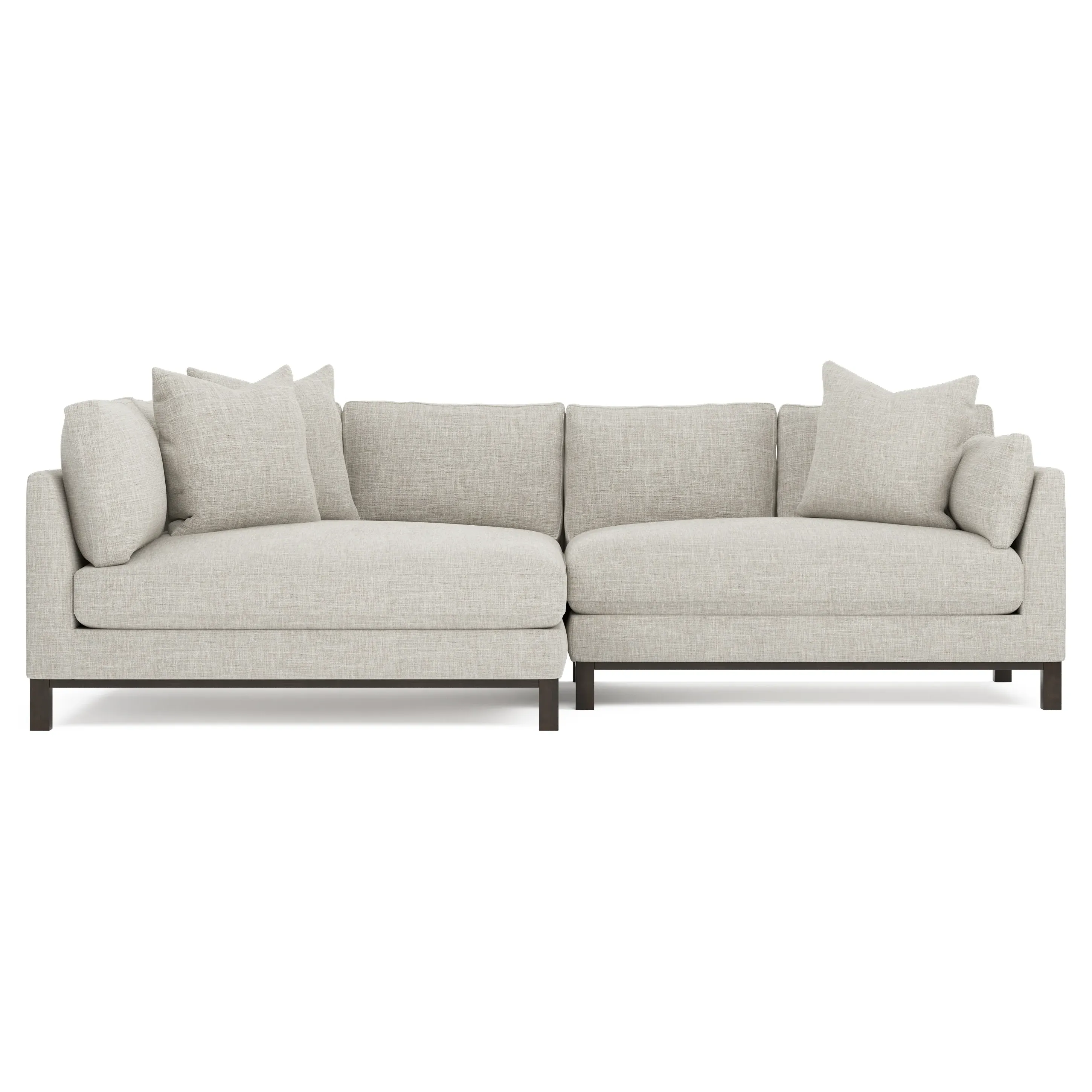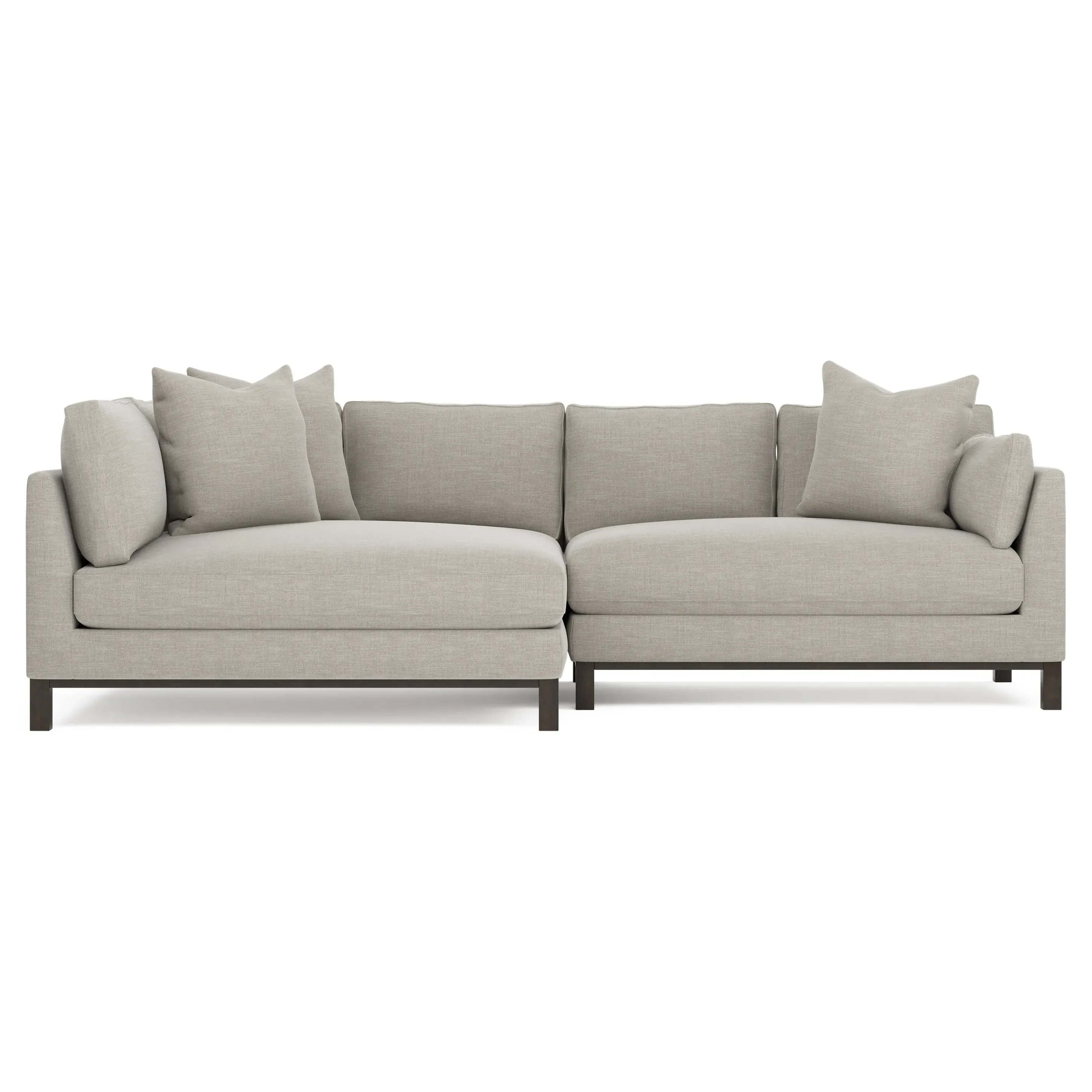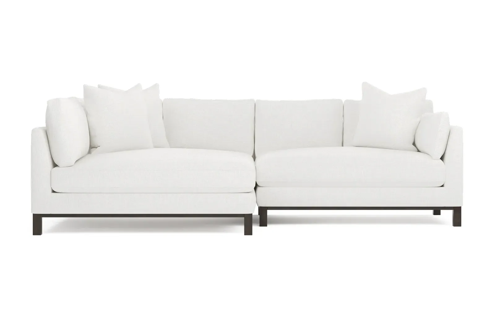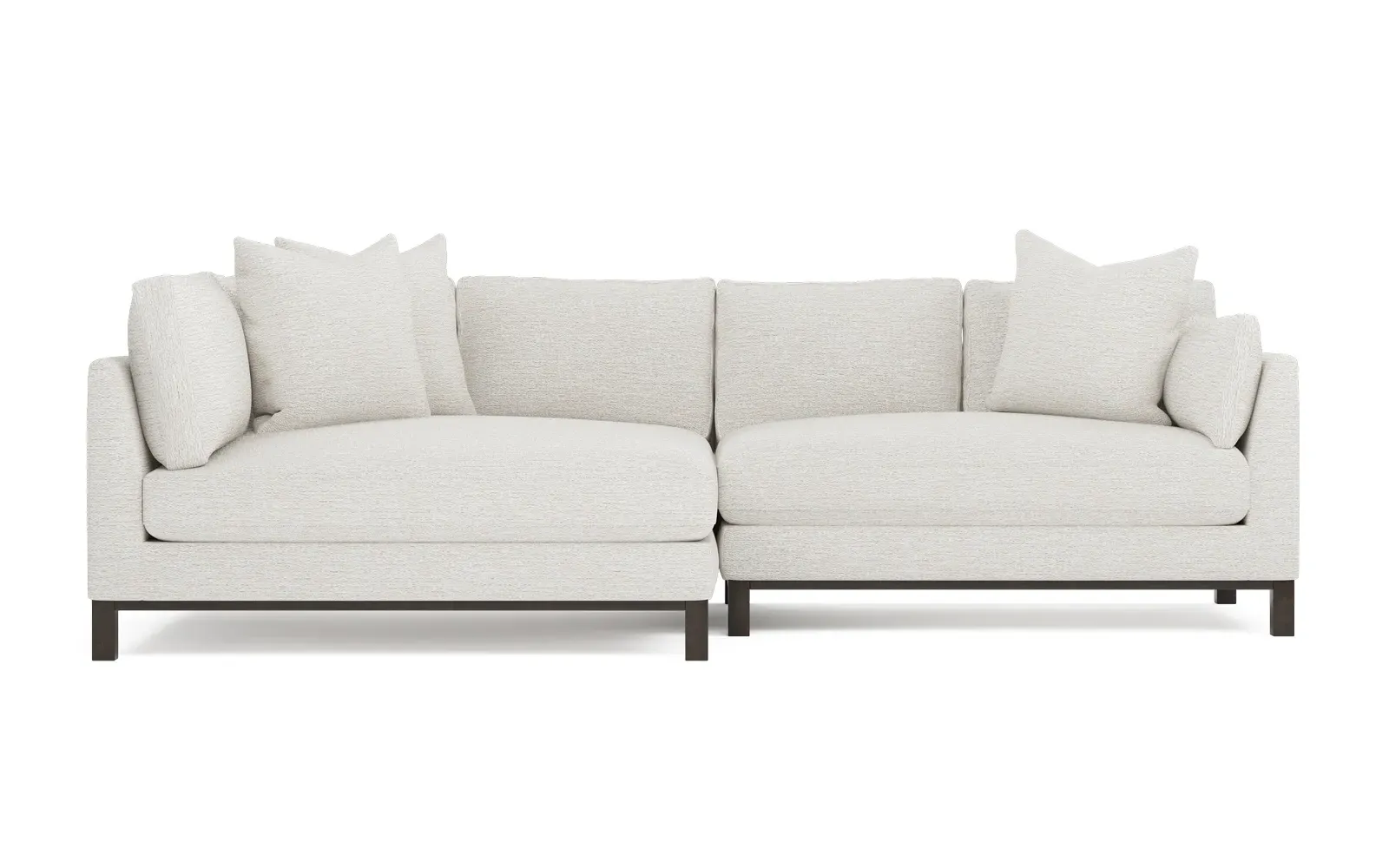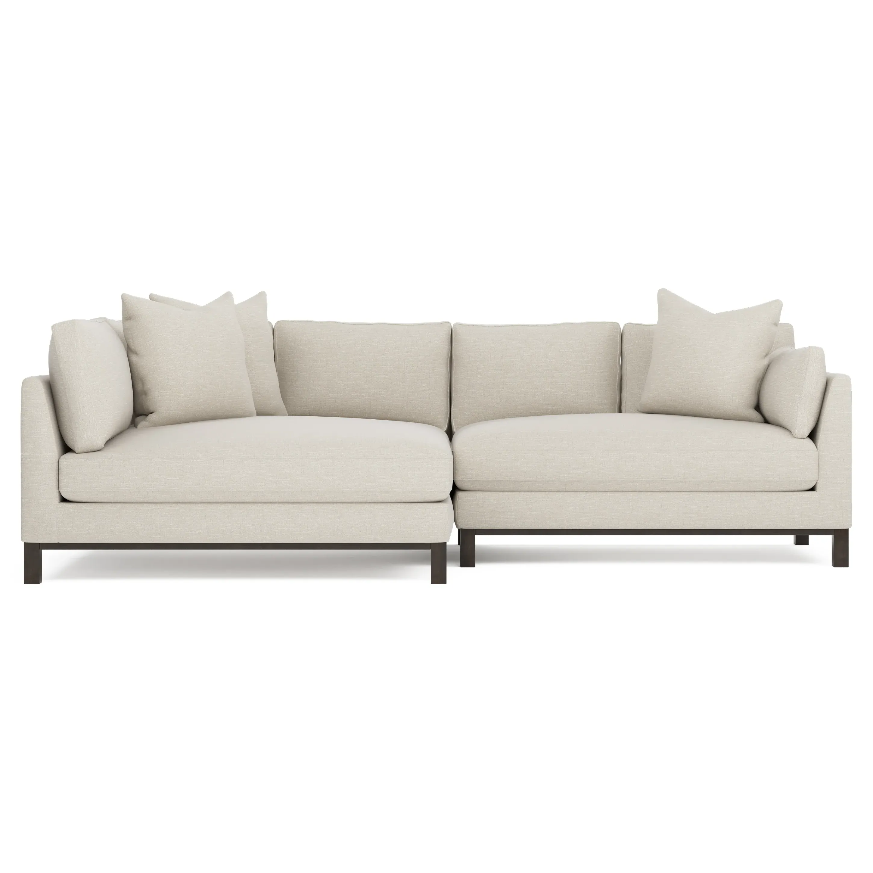 Designed with generous proportions, gently angled arms, and large throw pillows, the left 116” Adelle bumper sectional invites relaxation. A beautiful wood rail grounds the timeless transitional silhouette. Plush, comfortable seating is soft yet supportive, with a foam core surrounded by a blend of fiber, down, and feather fill. Choose from a variety of upholstery options, including linen, velvet, and performance fabrics. <b>Overall Dimensions:</b> 116" W x 61" D x 35" H. <b>Bumper Sofa Dimensions:</b> 58” W x 61” D x 35” H; <b>End Sofa Dimensions:</b> 58” W x 38” D x 35” H; <b>Seat Dimensions:</b> 25” D x 21” H; <b>Arm Height:</b> 28”; <b>Leg Height:</b> 5”. <b>Materials:</b> FSC®-certified, US-sourced, formaldehyde-free solid kiln-dried hardwood and furniture-grade laminates. <b>Material Finish:</b> Espresso legs. <b>Pieces Included:</b> Left bumper sofa, right end sofa.