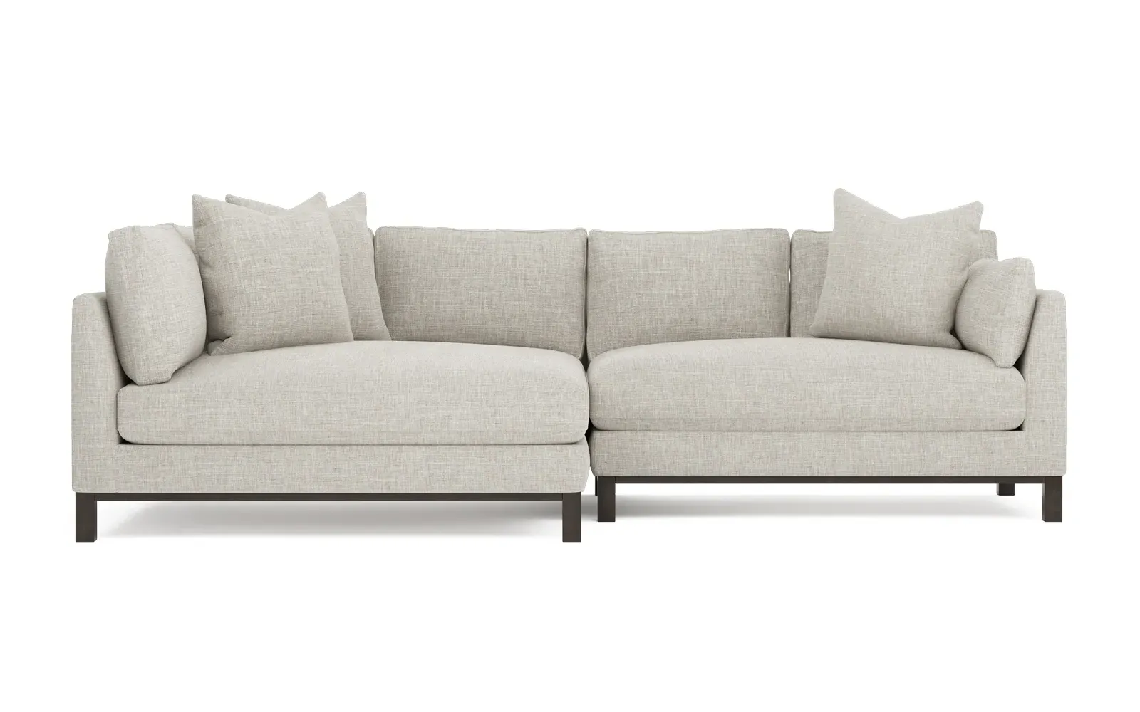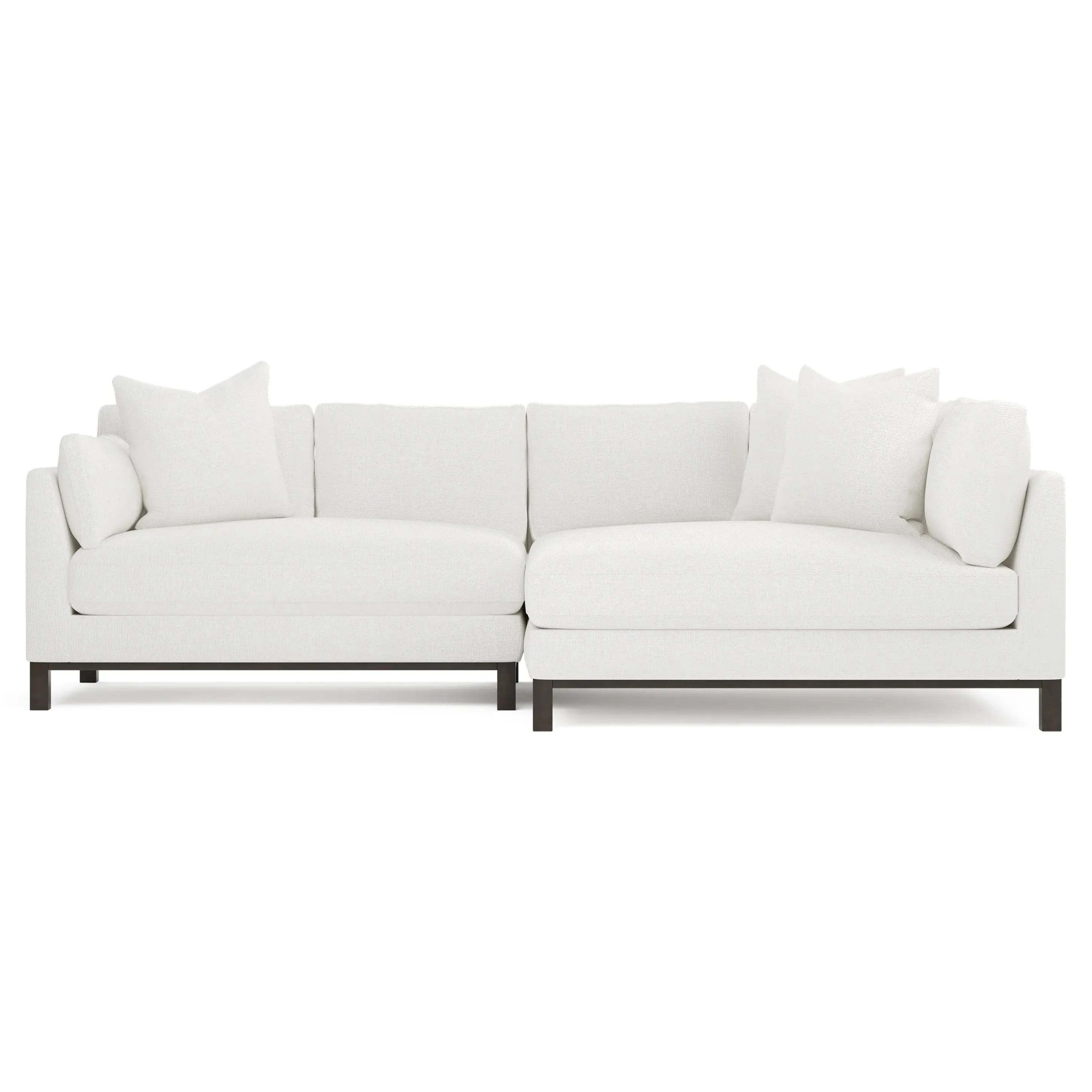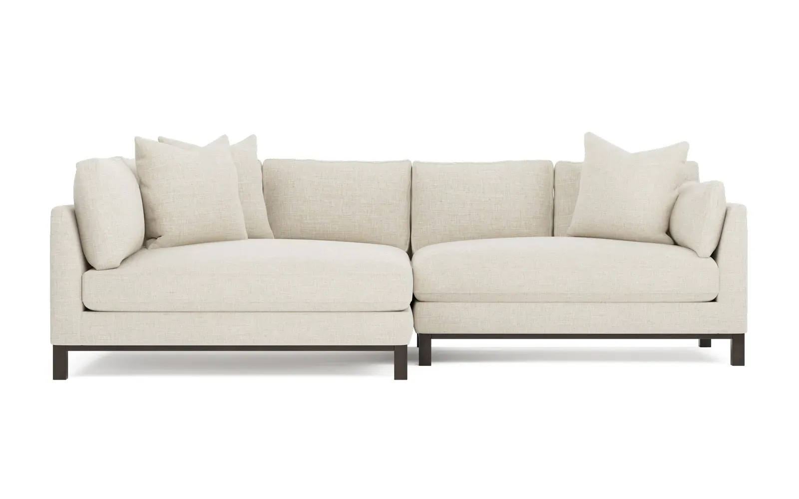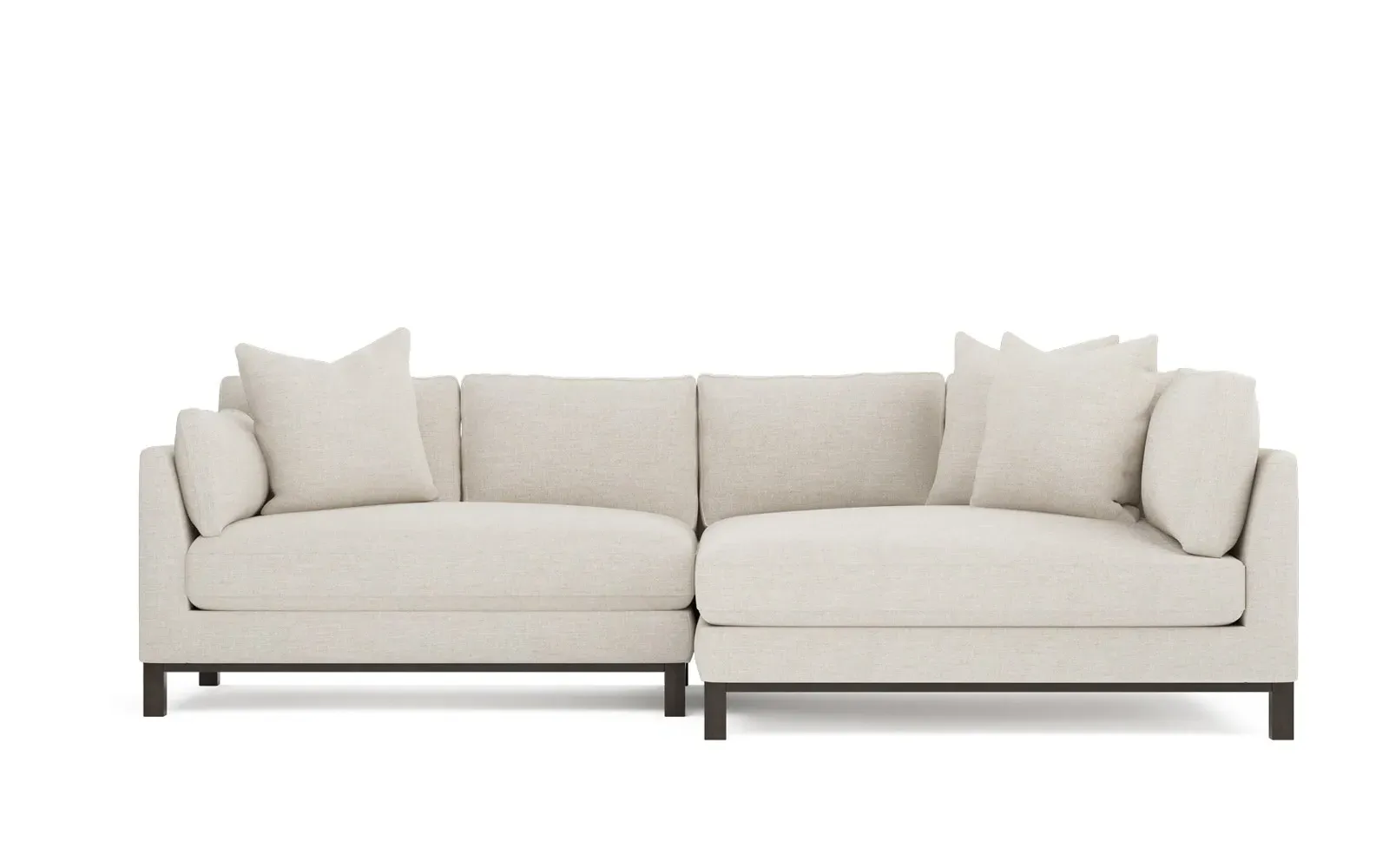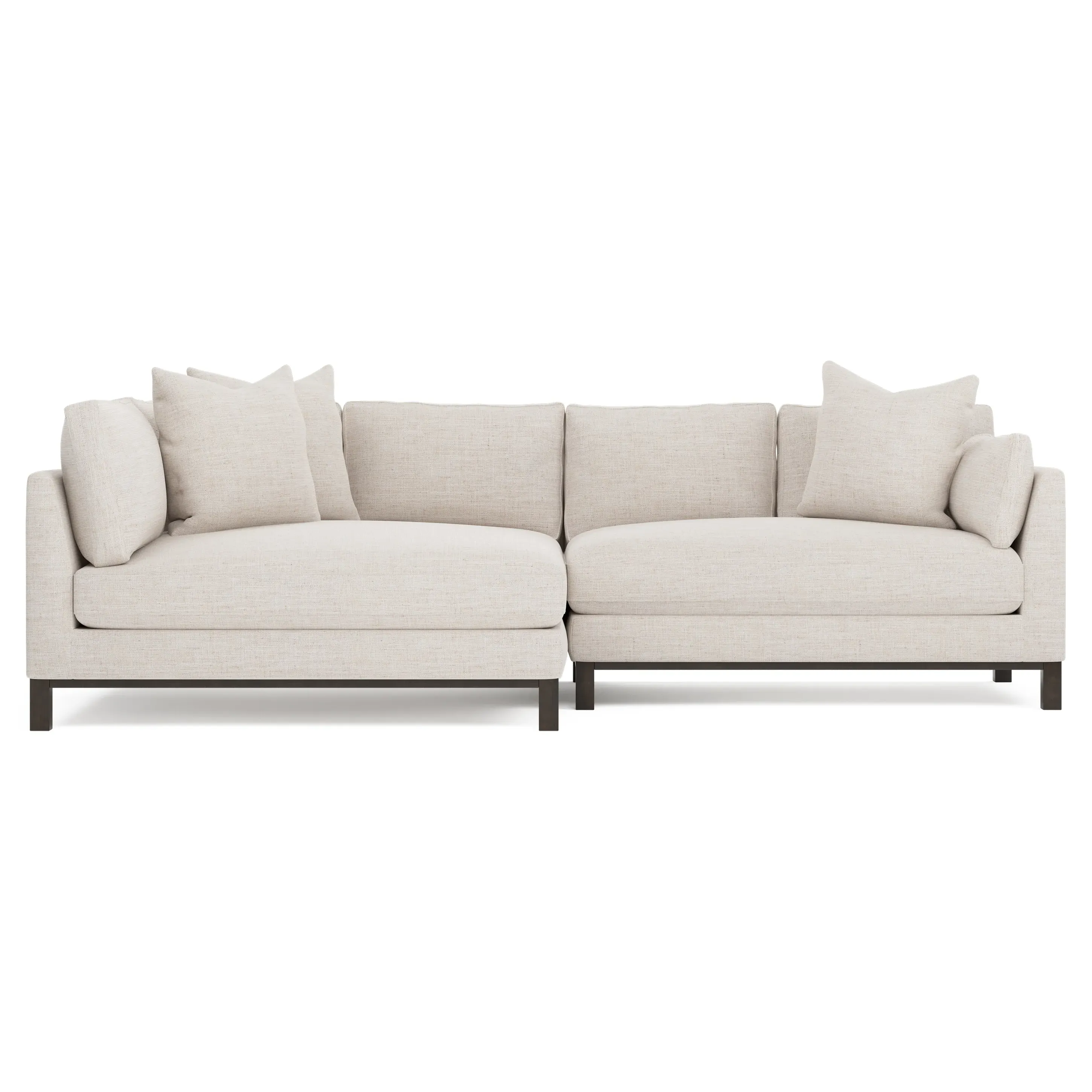 Designed with generous proportions, gently angled arms, and large throw pillows, the left 116” Adelle bumper sectional invites relaxation. A beautiful wood rail grounds the timeless transitional silhouette. Plush, comfortable seating is soft yet supportive, with a foam core surrounded by a blend of fiber, down, and feather fill. Choose from a variety of upholstery options, including linen, velvet, and performance fabrics. <b>Overall Dimensions:</b> 116" W x 61" D x 35" H. <b>Bumper Sofa Dimensions:</b> 58” W x 61” D x 35” H; <b>End Sofa Dimensions:</b> 58” W x 38” D x 35” H; <b>Seat Dimensions:</b> 25” D x 21” H; <b>Arm Height:</b> 28”; <b>Leg Height:</b> 5”. <b>Materials:</b> FSC®-certified, US-sourced, formaldehyde-free solid kiln-dried hardwood and furniture-grade laminates. <b>Material Finish:</b> Espresso legs. <b>Pieces Included:</b> Left bumper sofa, right end sofa.