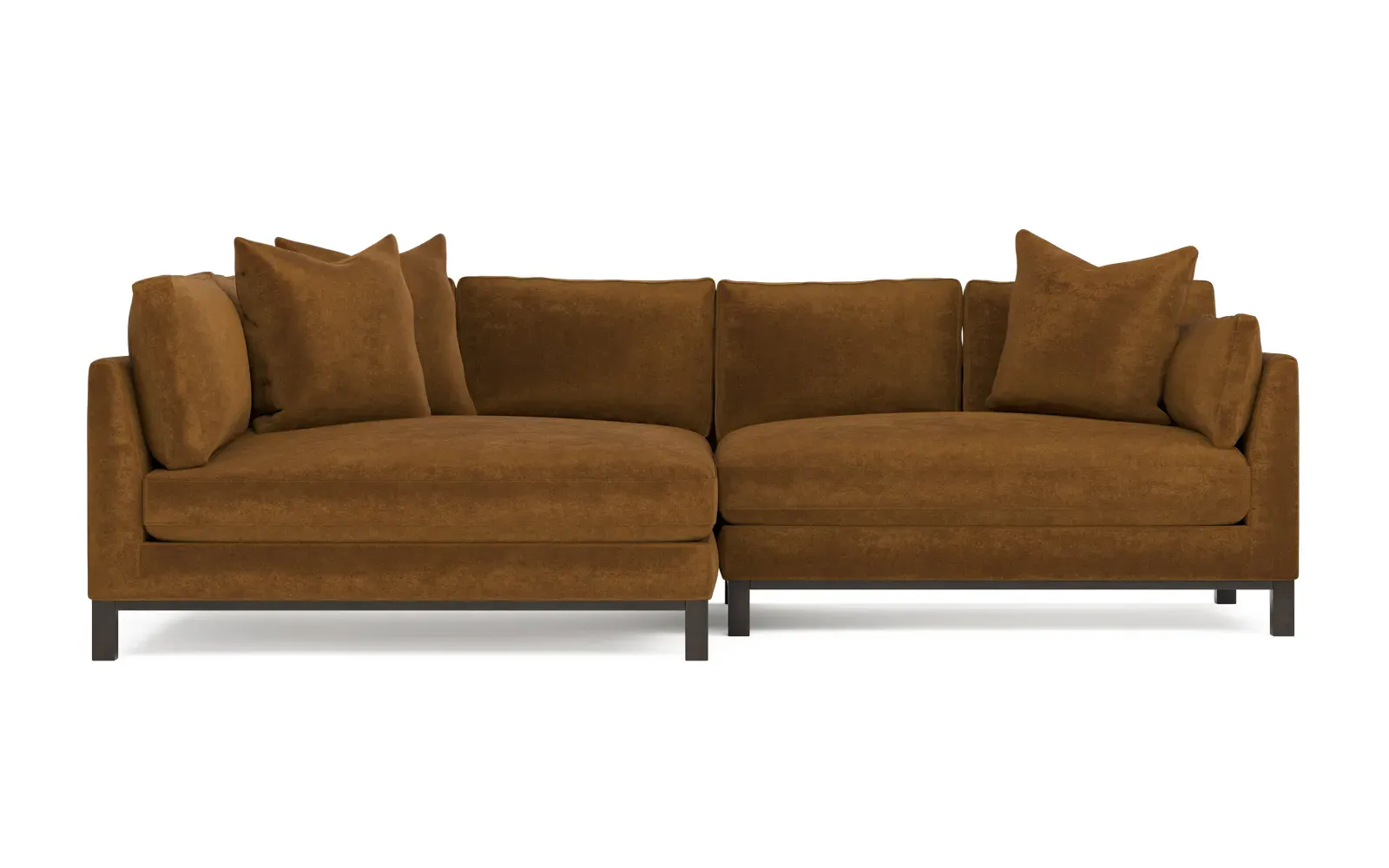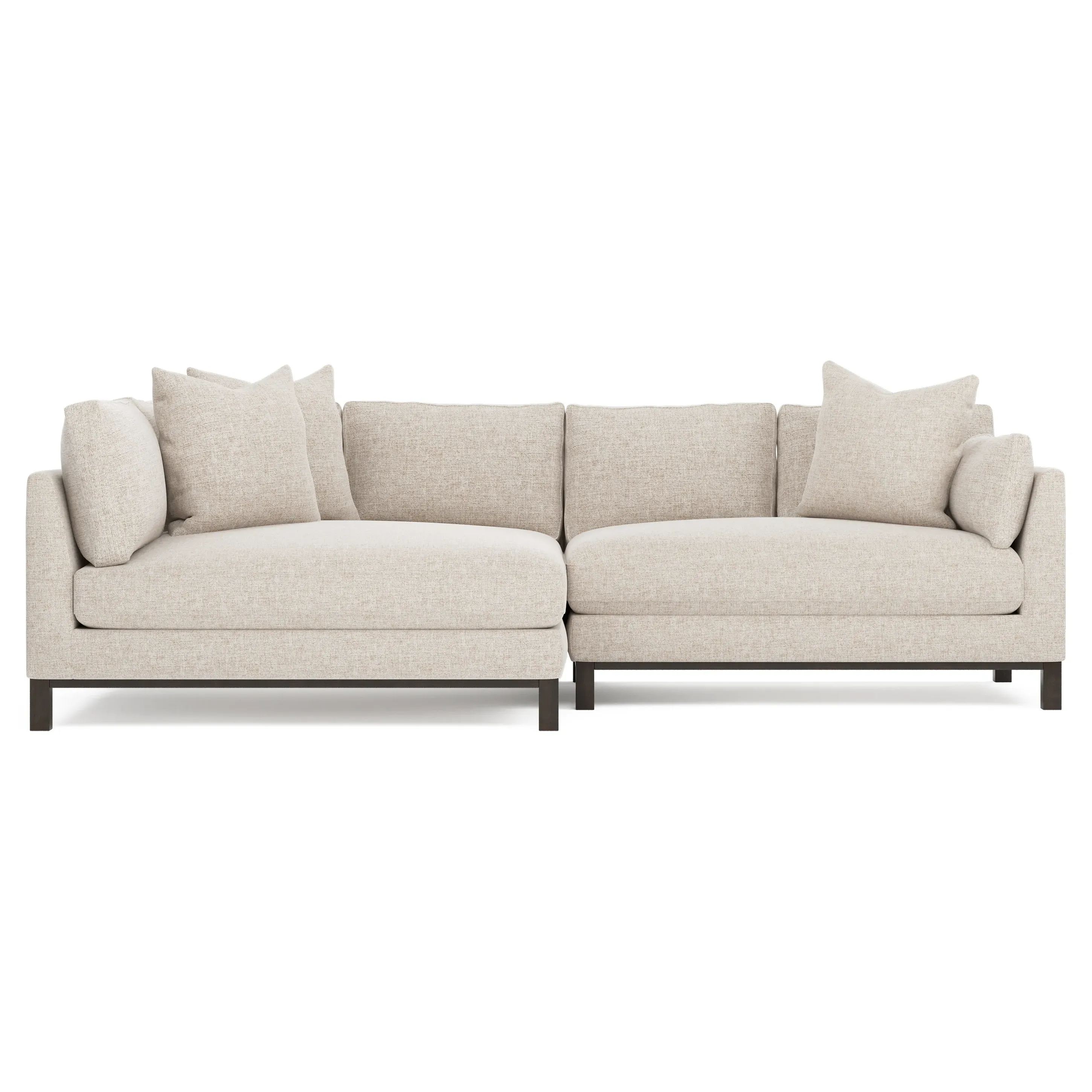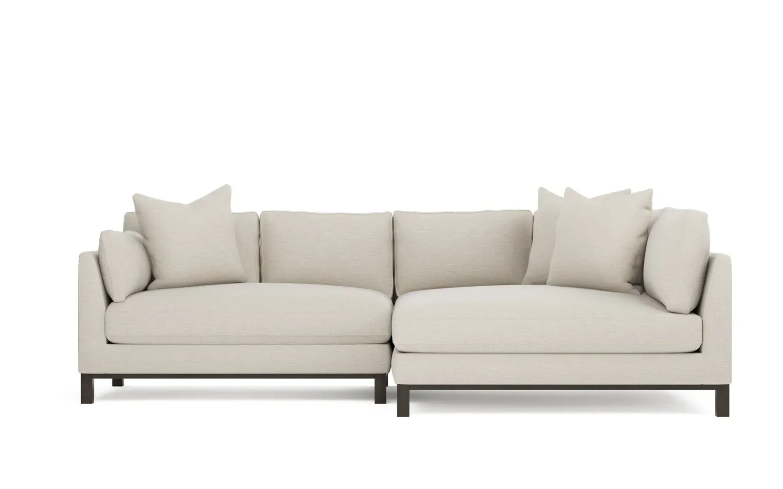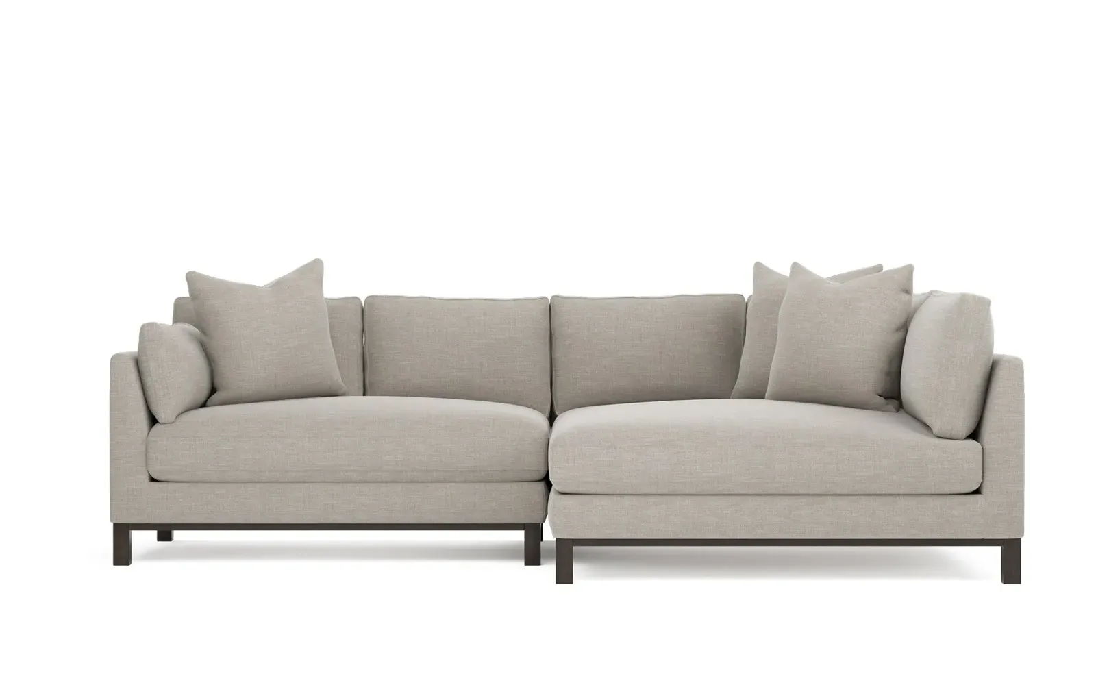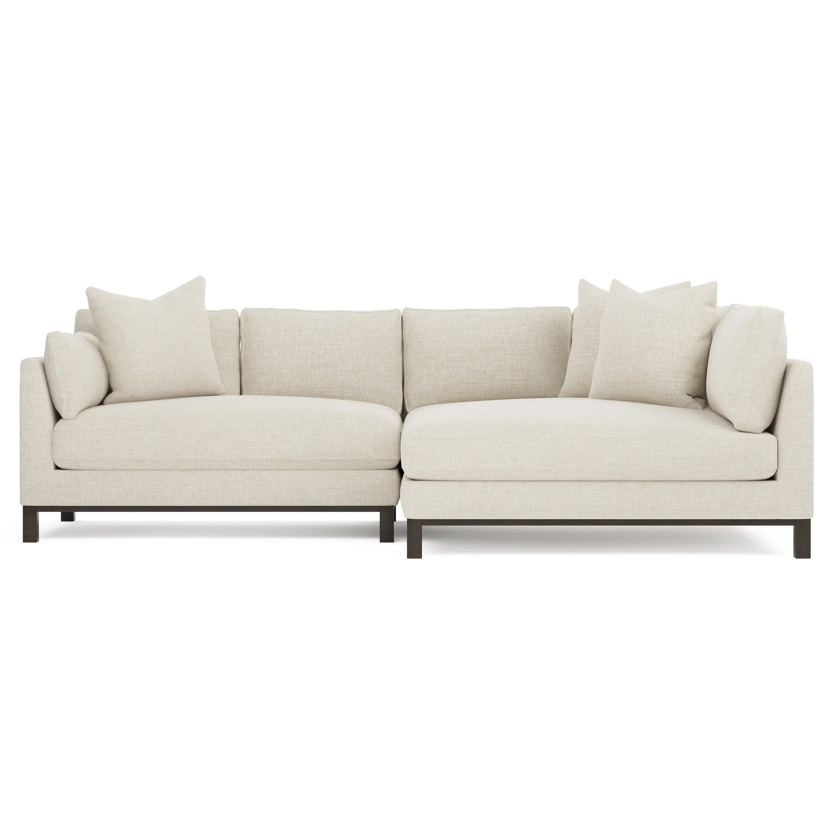 Designed with generous proportions, gently angled arms, and large throw pillows, the left 116” Adelle bumper sectional invites relaxation. A beautiful wood rail grounds the timeless transitional silhouette. Plush, comfortable seating is soft yet supportive, with a foam core surrounded by a blend of fiber, down, and feather fill. Choose from a variety of upholstery options, including linen, velvet, and performance fabrics. <b>Overall Dimensions:</b> 116" W x 61" D x 35" H. <b>Bumper Sofa Dimensions:</b> 58” W x 61” D x 35” H; <b>End Sofa Dimensions:</b> 58” W x 38” D x 35” H; <b>Seat Dimensions:</b> 25” D x 21” H; <b>Arm Height:</b> 28”; <b>Leg Height:</b> 5”. <b>Materials:</b> FSC®-certified, US-sourced, formaldehyde-free solid kiln-dried hardwood and furniture-grade laminates. <b>Material Finish:</b> Espresso legs. <b>Pieces Included:</b> Left bumper sofa, right end sofa.