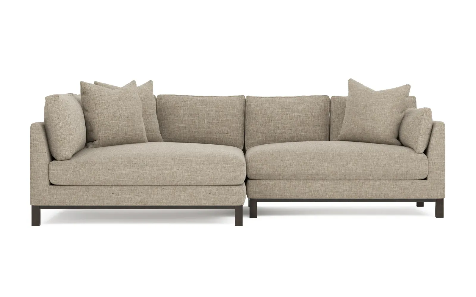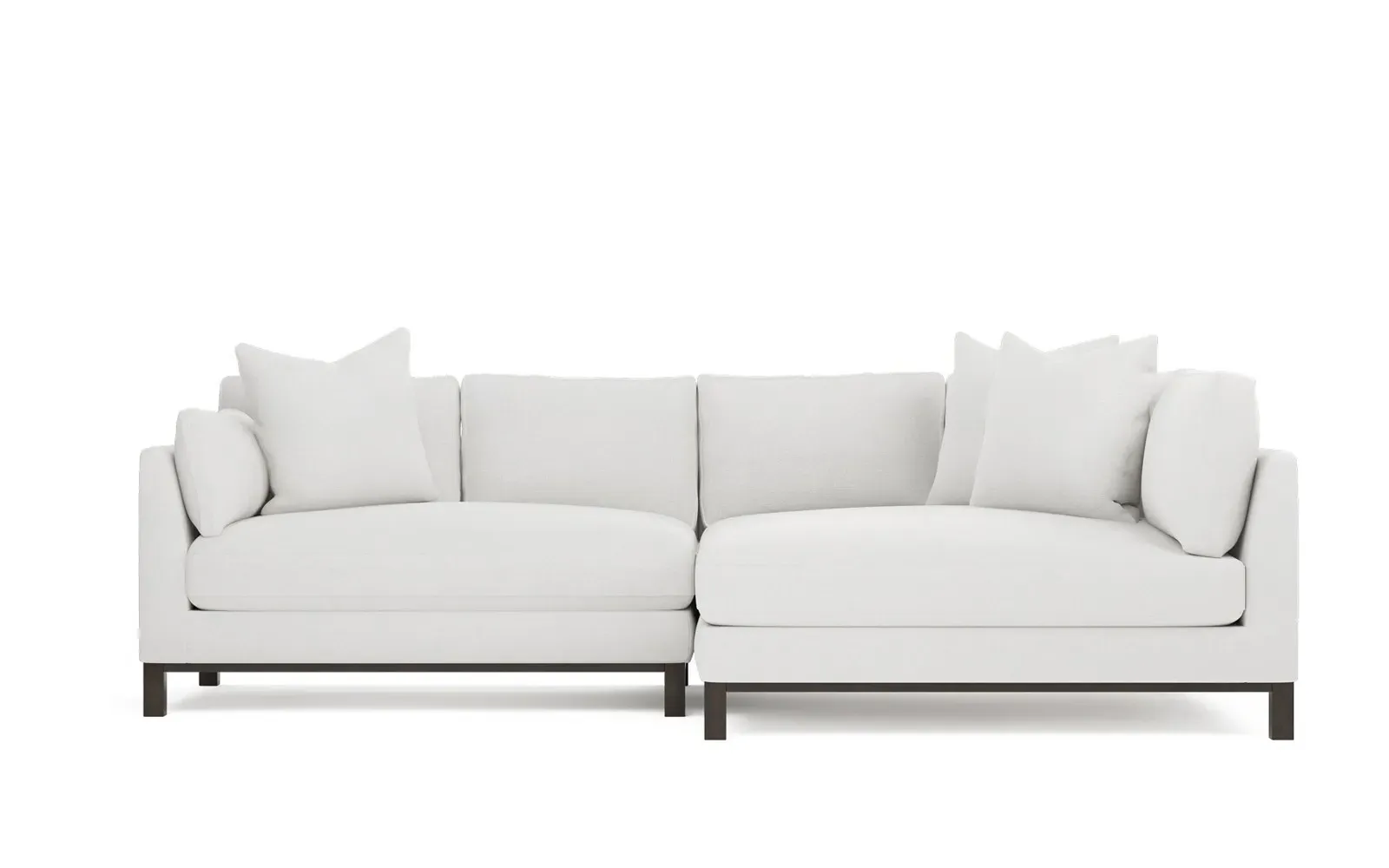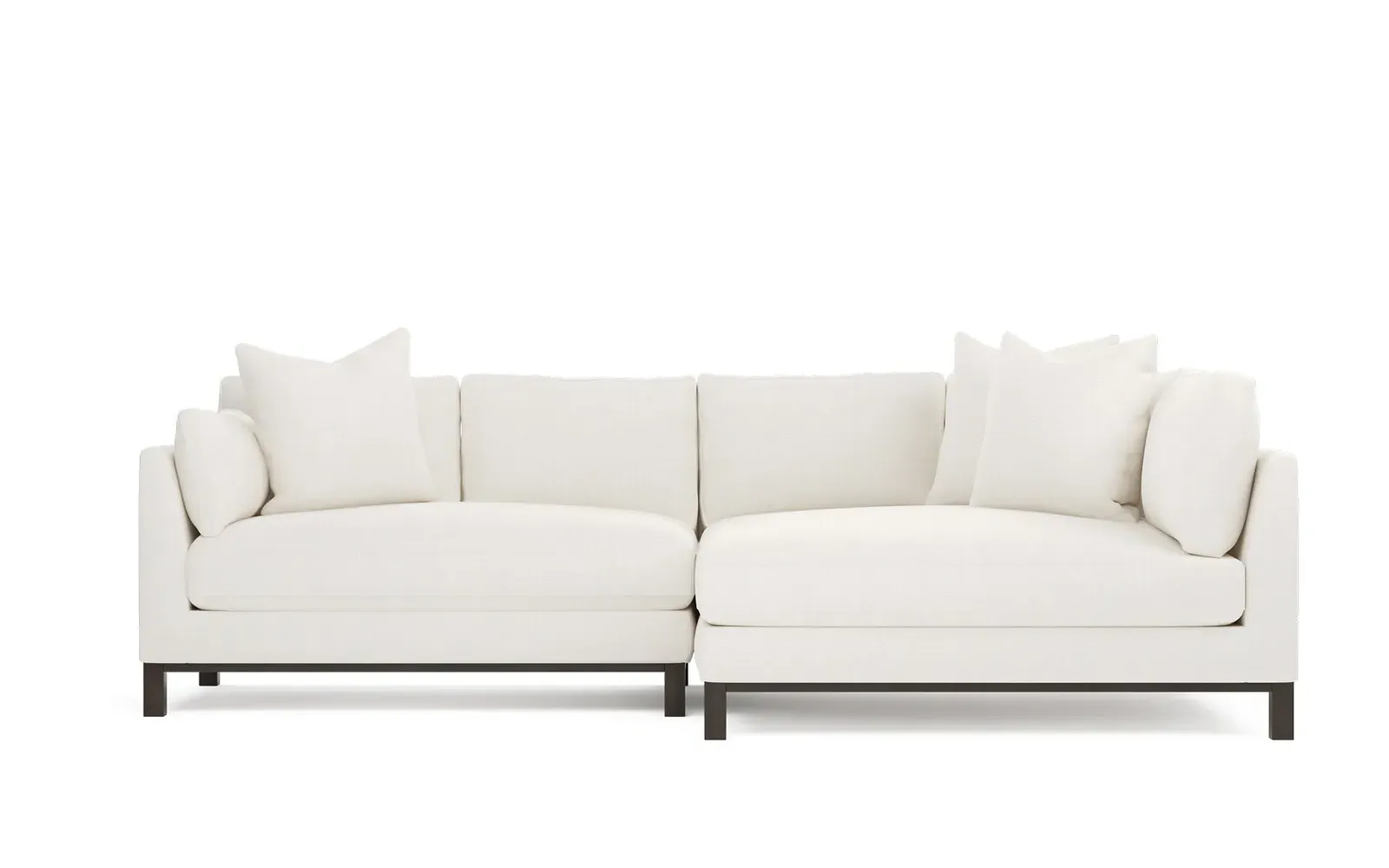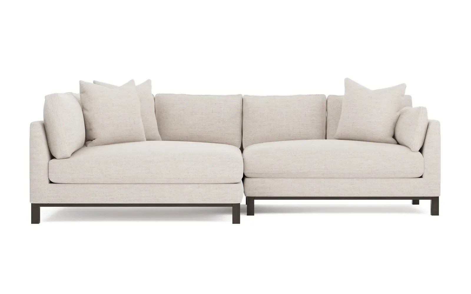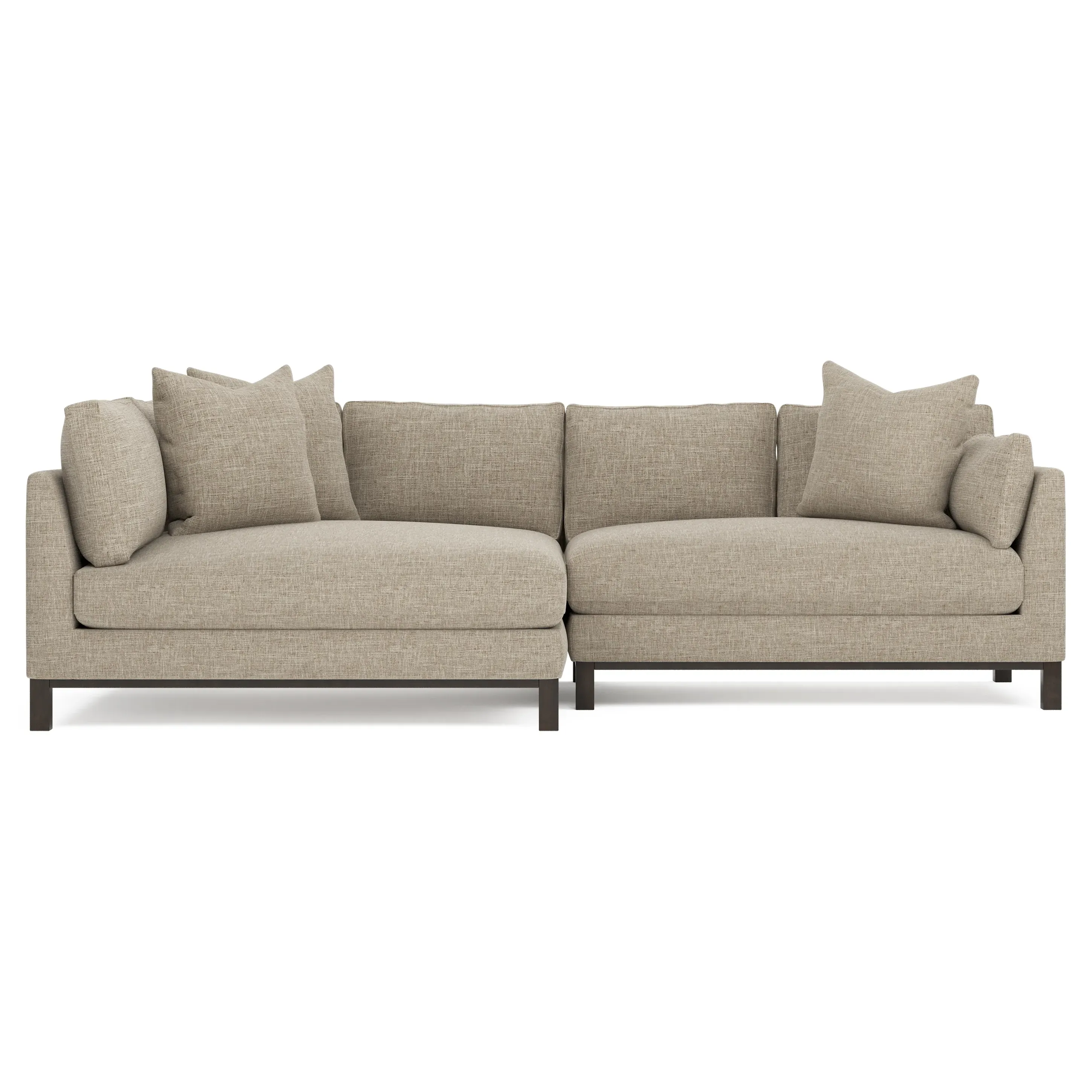 Designed with generous proportions, gently angled arms, and large throw pillows, the left 116” Adelle bumper sectional invites relaxation. A beautiful wood rail grounds the timeless transitional silhouette. Plush, comfortable seating is soft yet supportive, with a foam core surrounded by a blend of fiber, down, and feather fill. Choose from a variety of upholstery options, including linen, velvet, and performance fabrics. <b>Overall Dimensions:</b> 116" W x 61" D x 35" H. <b>Bumper Sofa Dimensions:</b> 58” W x 61” D x 35” H; <b>End Sofa Dimensions:</b> 58” W x 38” D x 35” H; <b>Seat Dimensions:</b> 25” D x 21” H; <b>Arm Height:</b> 28”; <b>Leg Height:</b> 5”. <b>Materials:</b> FSC®-certified, US-sourced, formaldehyde-free solid kiln-dried hardwood and furniture-grade laminates. <b>Material Finish:</b> Espresso legs. <b>Pieces Included:</b> Left bumper sofa, right end sofa.