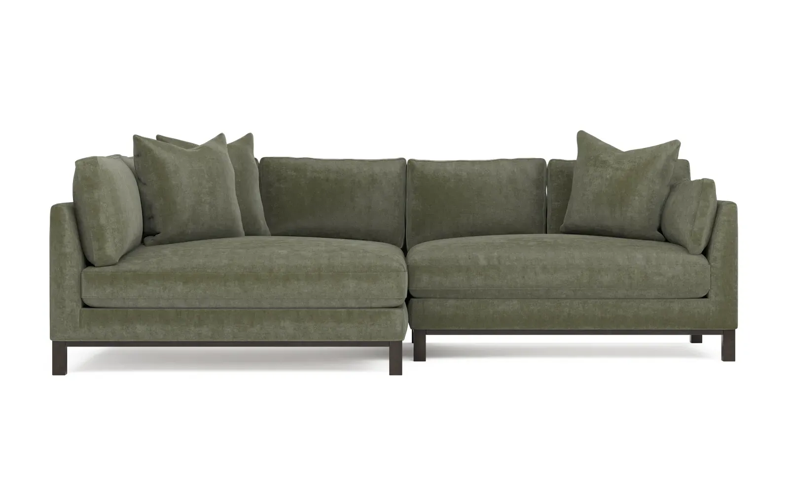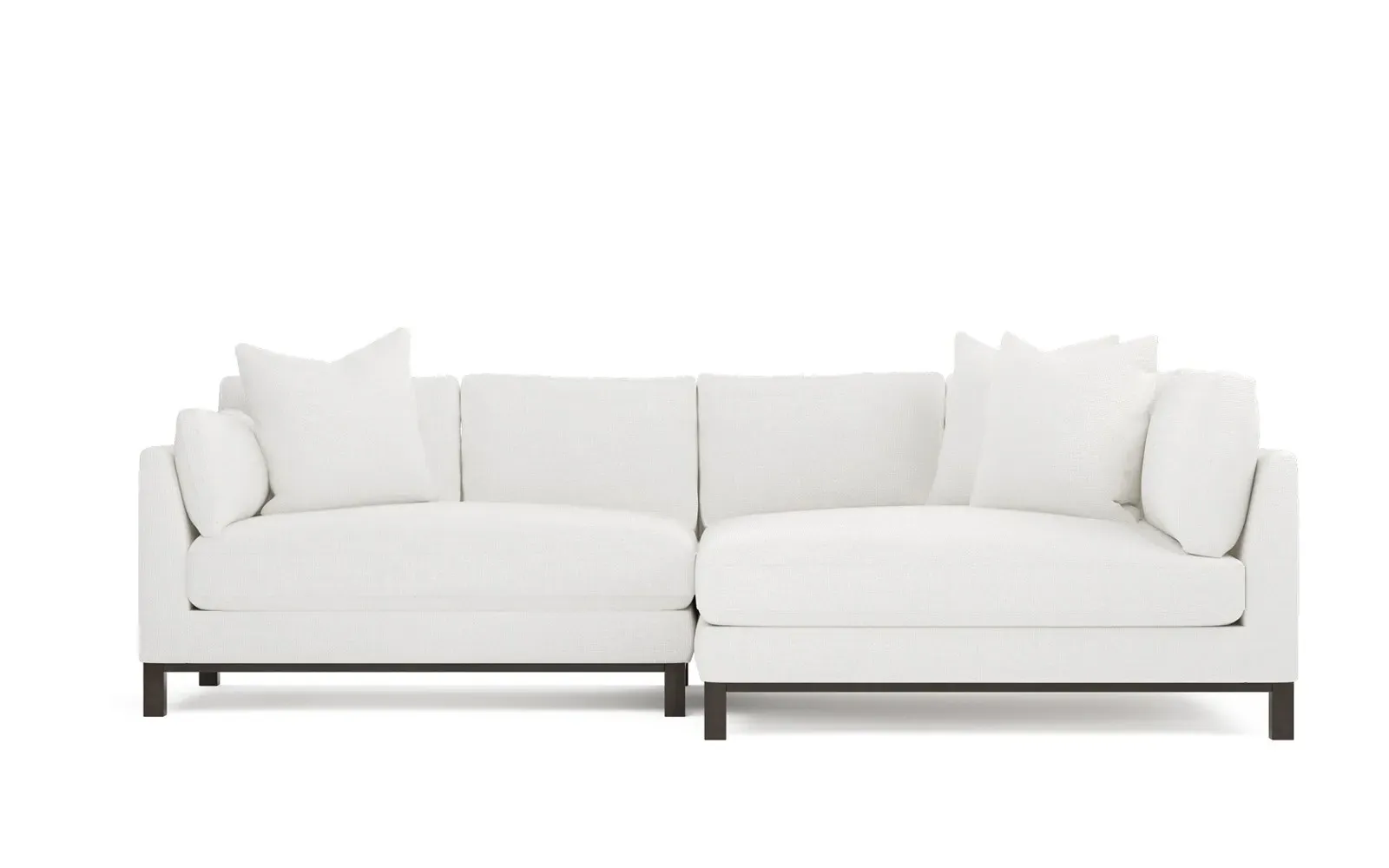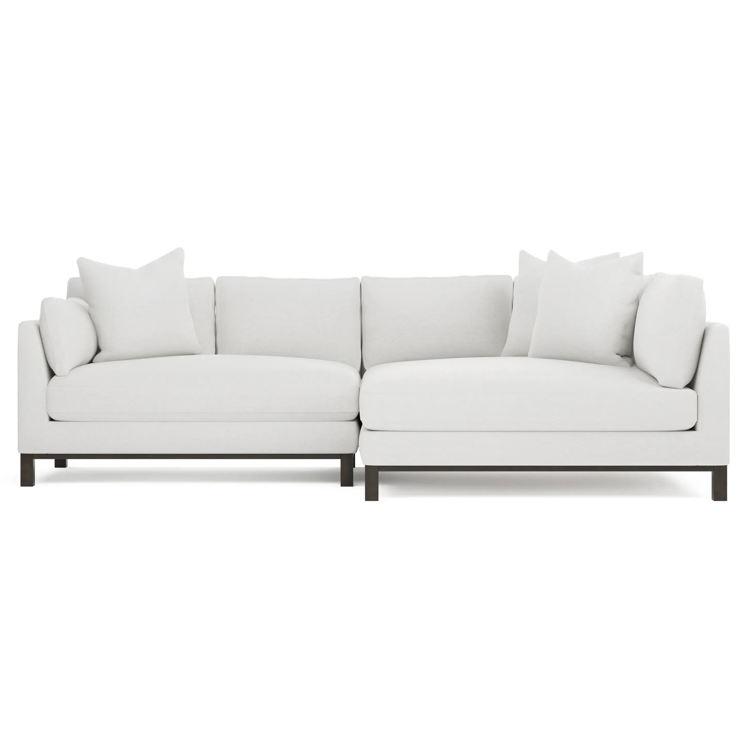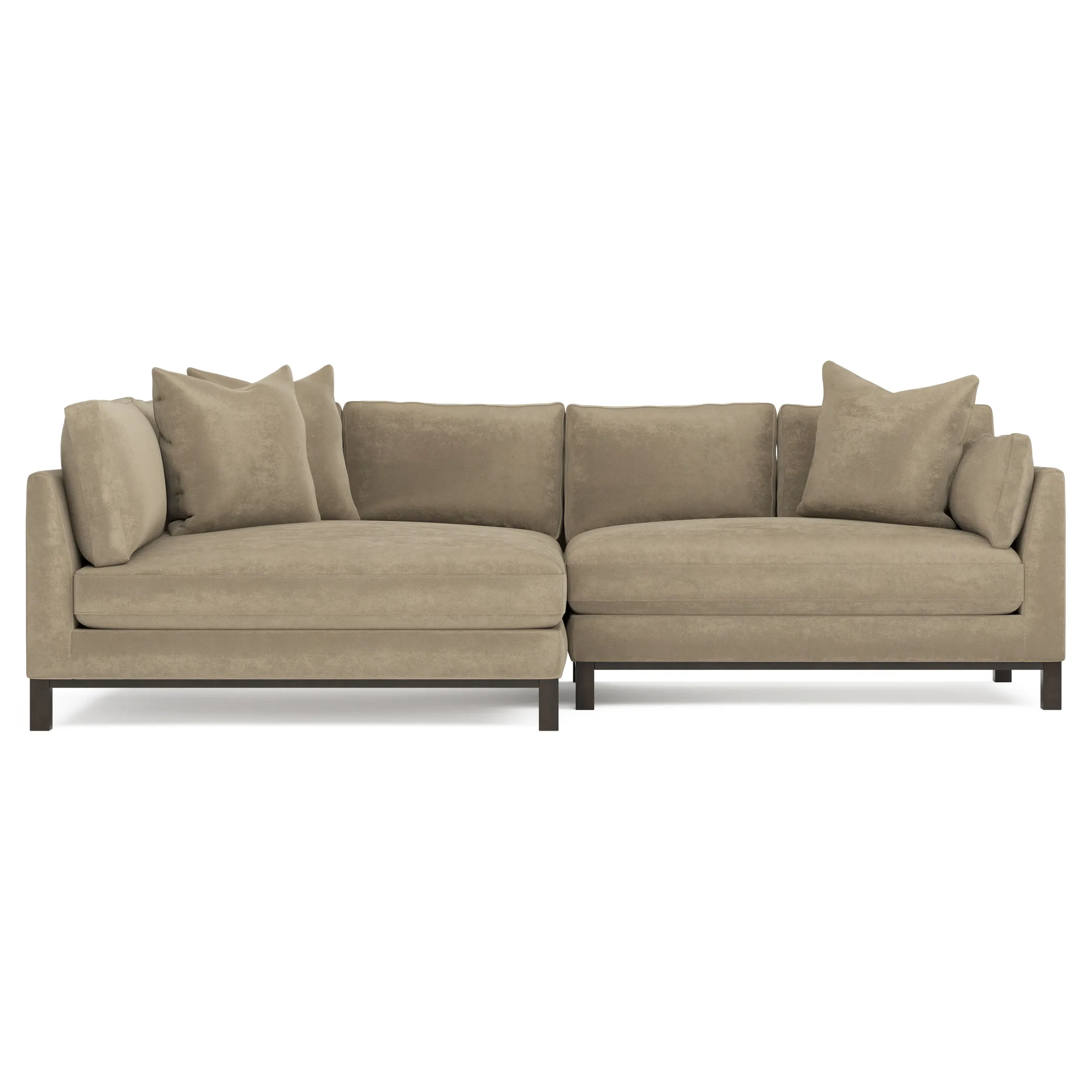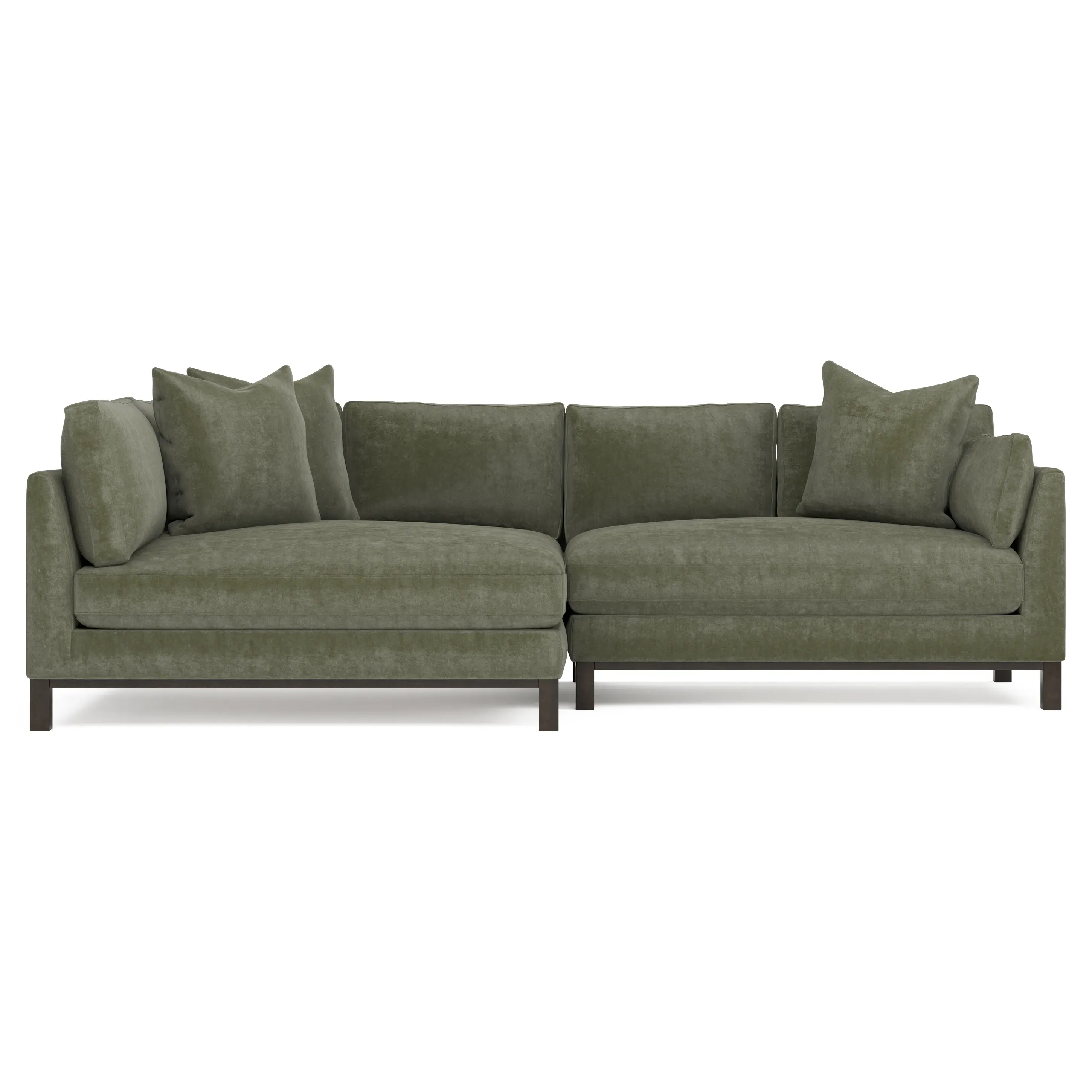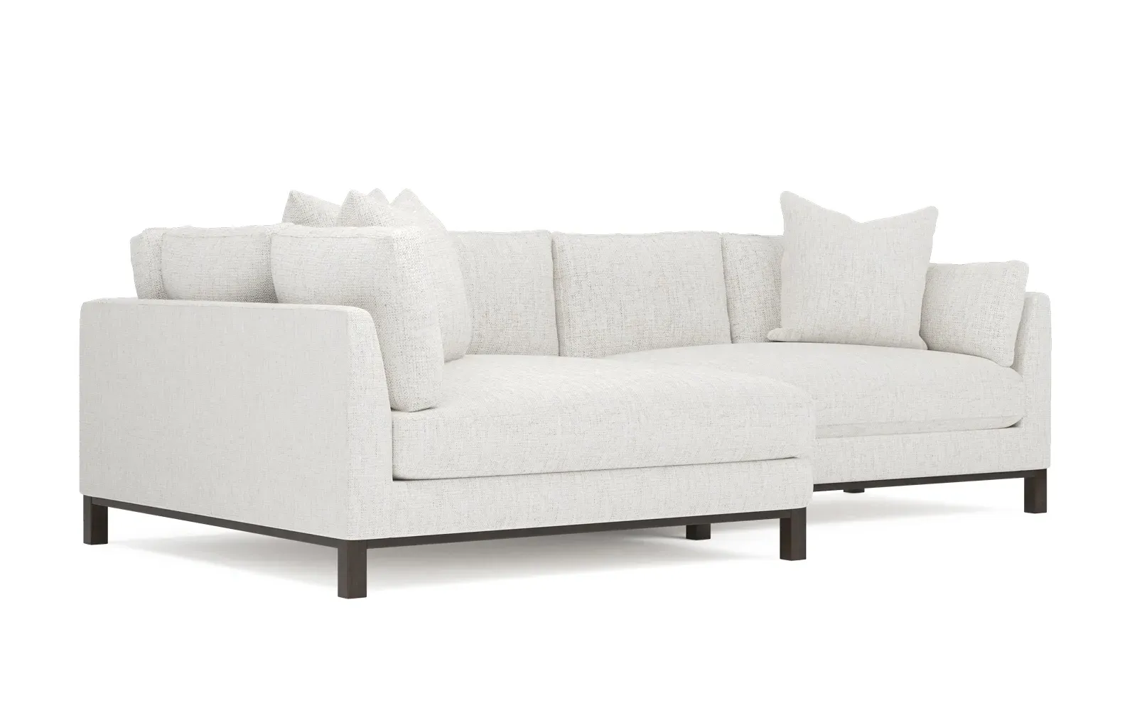 Designed with generous proportions, gently angled arms, and large throw pillows, the left 116” Adelle bumper sectional invites relaxation. A beautiful wood rail grounds the timeless transitional silhouette. Plush, comfortable seating is soft yet supportive, with a foam core surrounded by a blend of fiber, down, and feather fill. Choose from a variety of upholstery options, including linen, velvet, and performance fabrics. <b>Overall Dimensions:</b> 116" W x 61" D x 35" H. <b>Bumper Sofa Dimensions:</b> 58” W x 61” D x 35” H; <b>End Sofa Dimensions:</b> 58” W x 38” D x 35” H; <b>Seat Dimensions:</b> 25” D x 21” H; <b>Arm Height:</b> 28”; <b>Leg Height:</b> 5”. <b>Materials:</b> FSC®-certified, US-sourced, formaldehyde-free solid kiln-dried hardwood and furniture-grade laminates. <b>Material Finish:</b> Espresso legs. <b>Pieces Included:</b> Left bumper sofa, right end sofa.