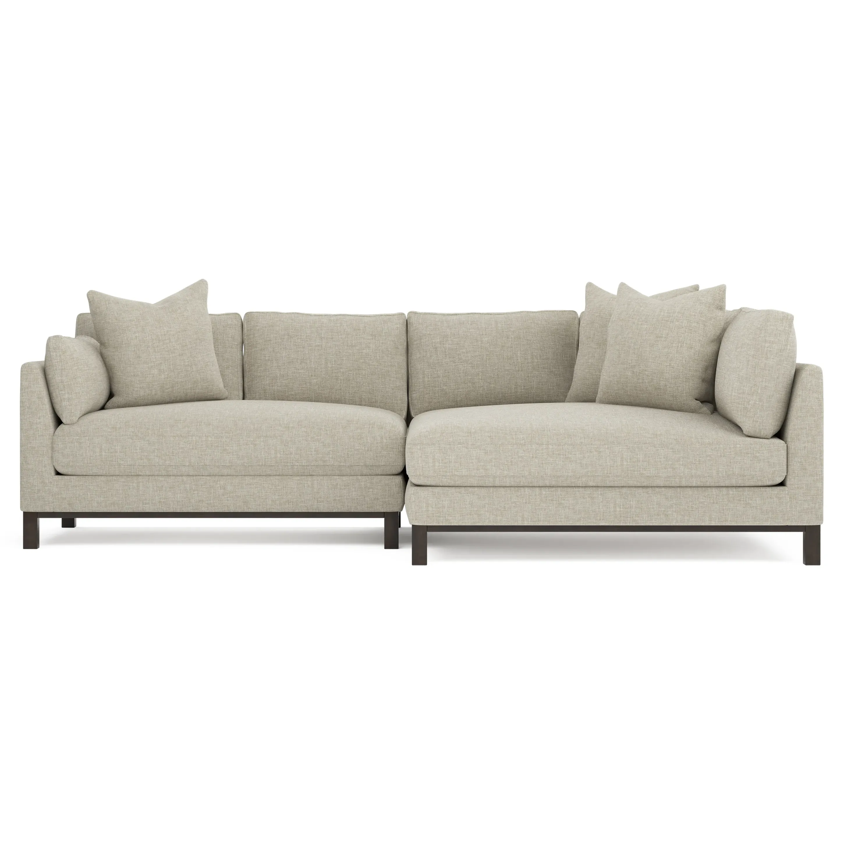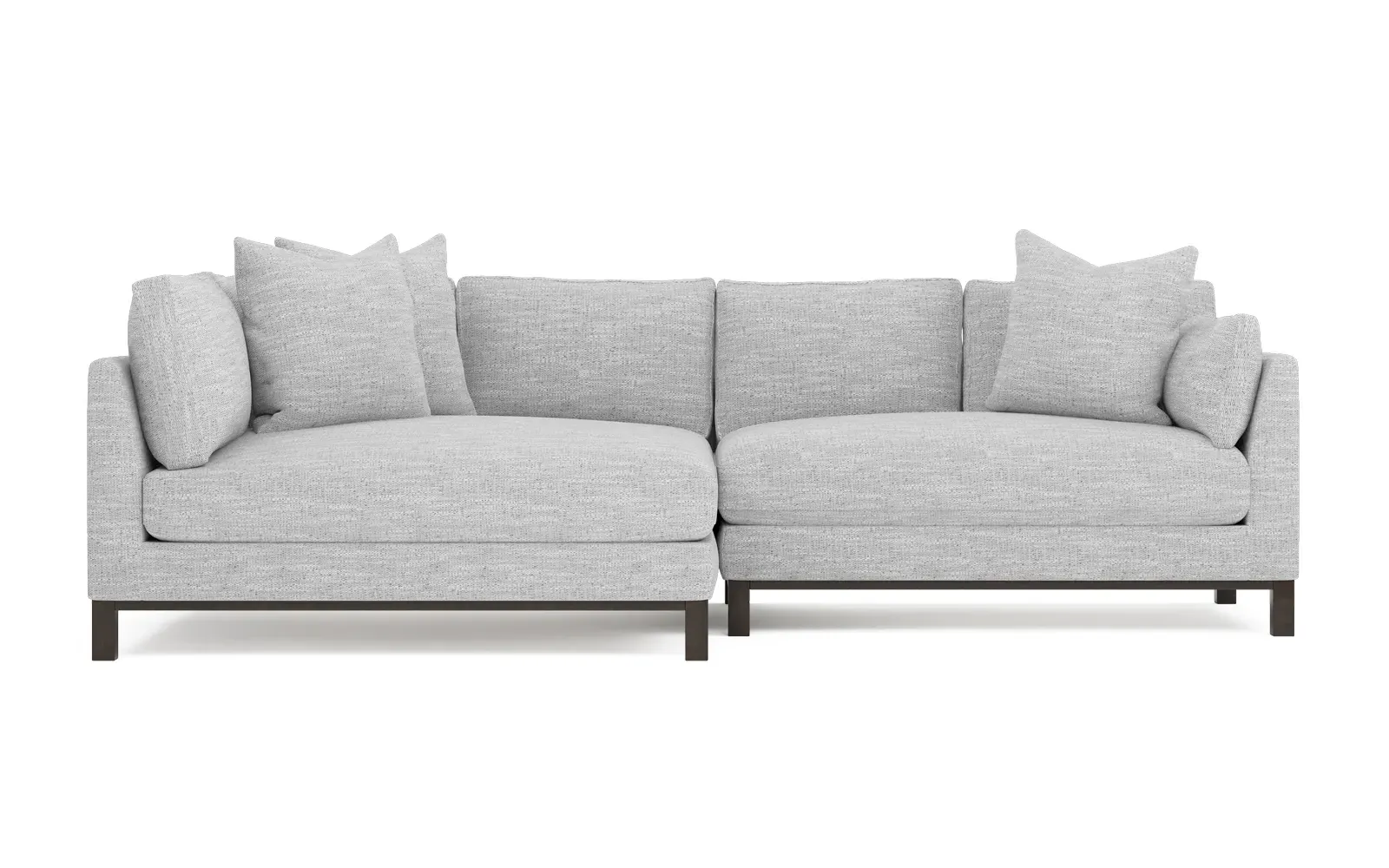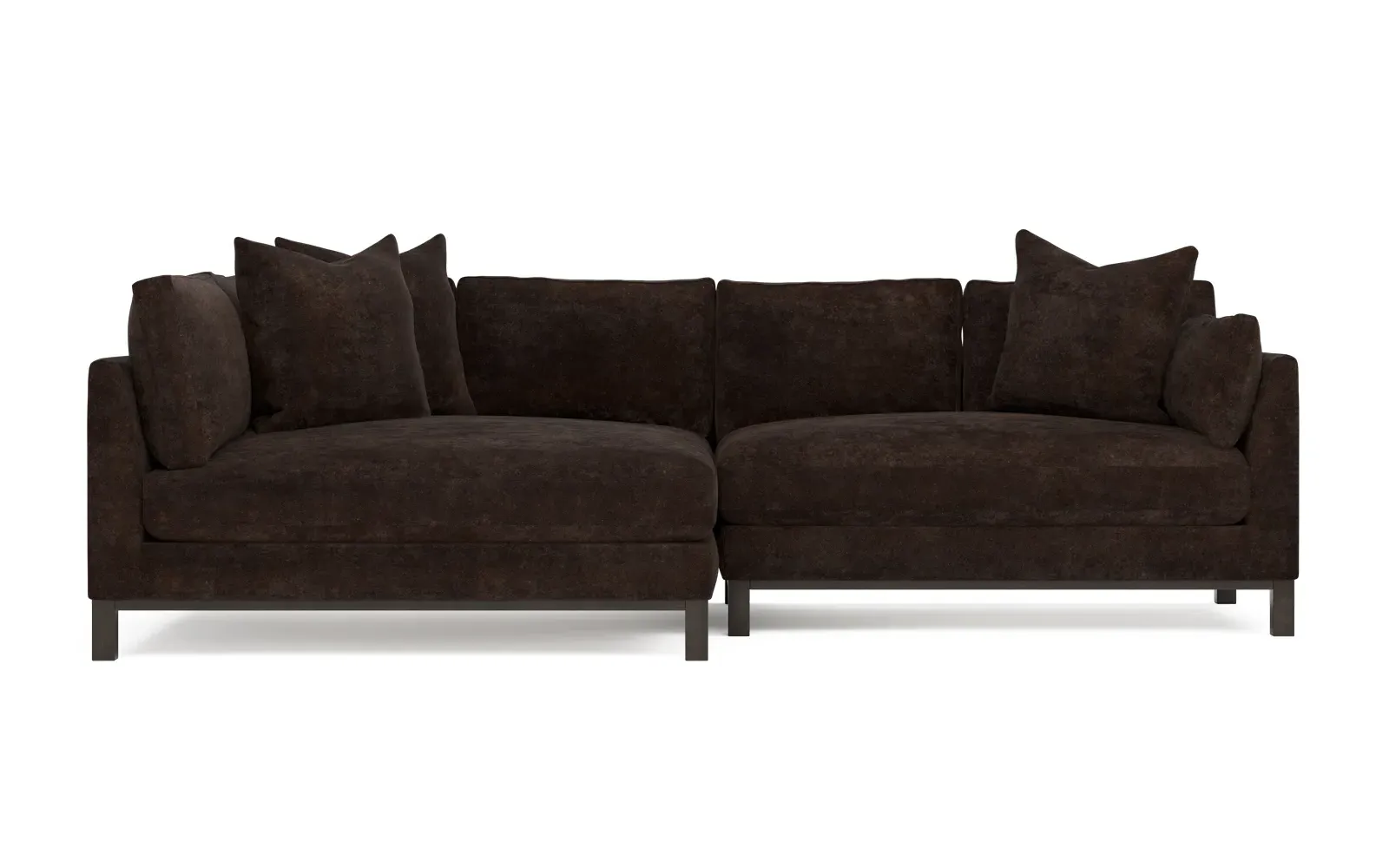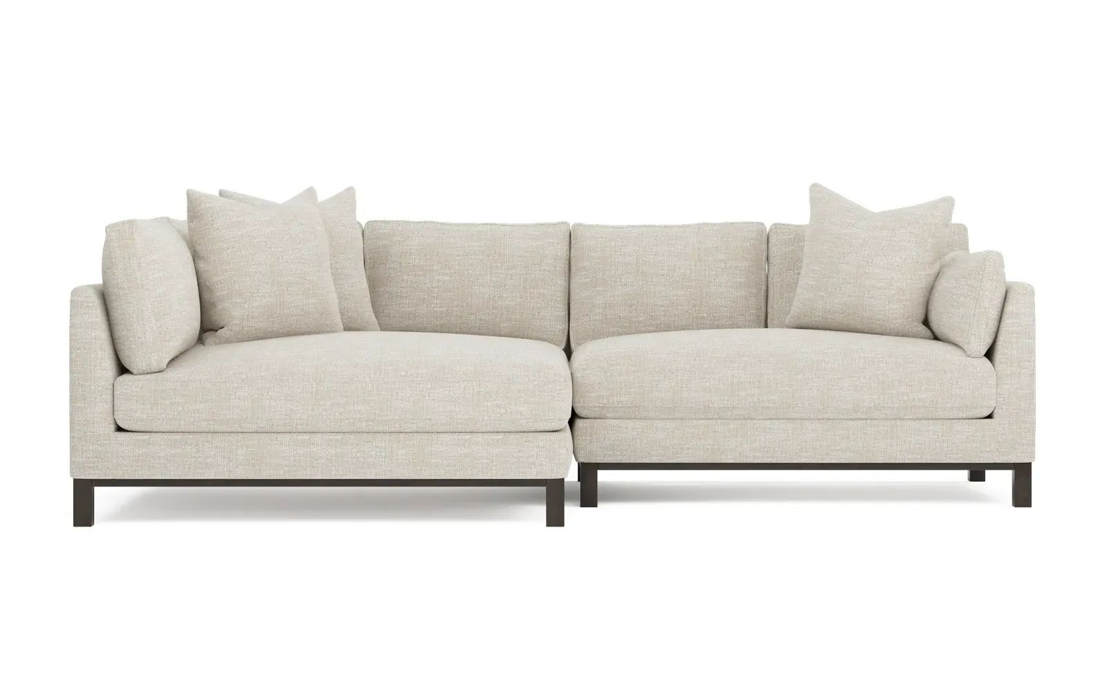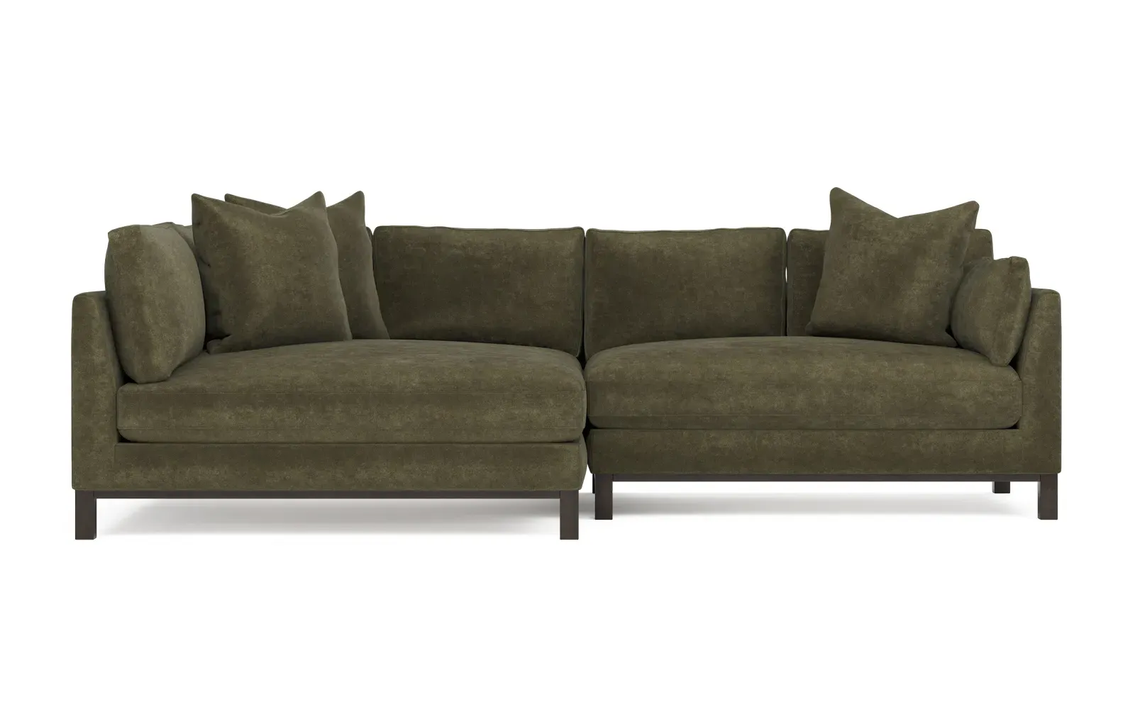 Designed with generous proportions, gently angled arms, and large throw pillows, the left 116” Adelle bumper sectional invites relaxation. A beautiful wood rail grounds the timeless transitional silhouette. Plush, comfortable seating is soft yet supportive, with a foam core surrounded by a blend of fiber, down, and feather fill. Choose from a variety of upholstery options, including linen, velvet, and performance fabrics. <b>Overall Dimensions:</b> 116" W x 61" D x 35" H. <b>Bumper Sofa Dimensions:</b> 58” W x 61” D x 35” H; <b>End Sofa Dimensions:</b> 58” W x 38” D x 35” H; <b>Seat Dimensions:</b> 25” D x 21” H; <b>Arm Height:</b> 28”; <b>Leg Height:</b> 5”. <b>Materials:</b> FSC®-certified, US-sourced, formaldehyde-free solid kiln-dried hardwood and furniture-grade laminates. <b>Material Finish:</b> Espresso legs. <b>Pieces Included:</b> Left bumper sofa, right end sofa.