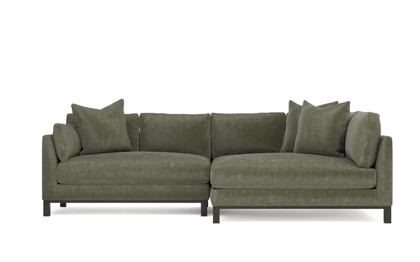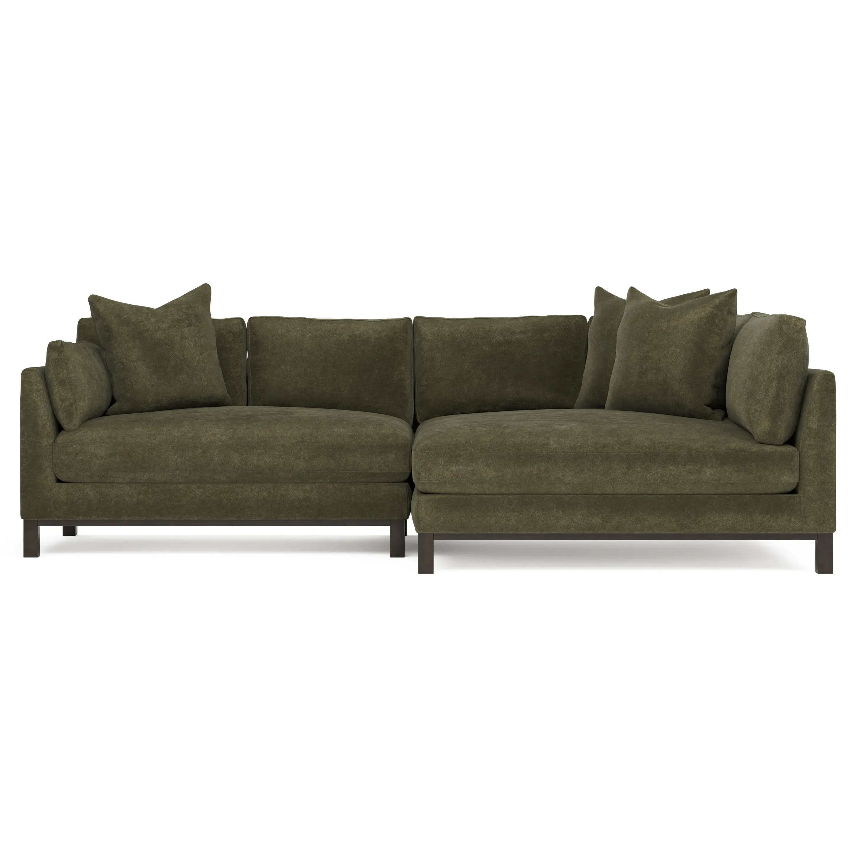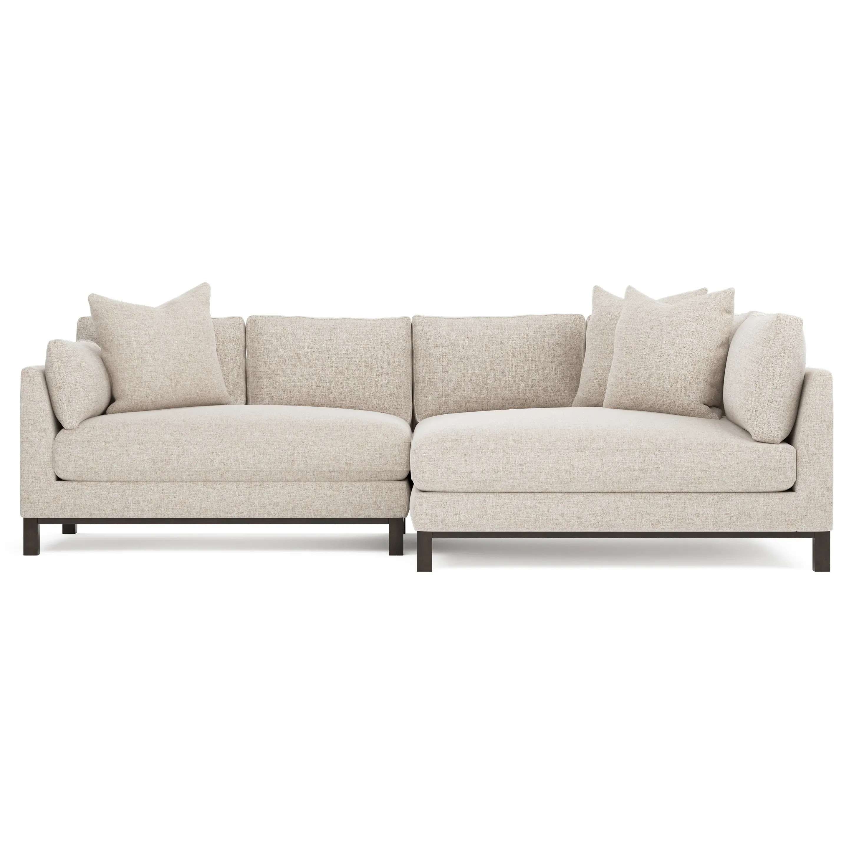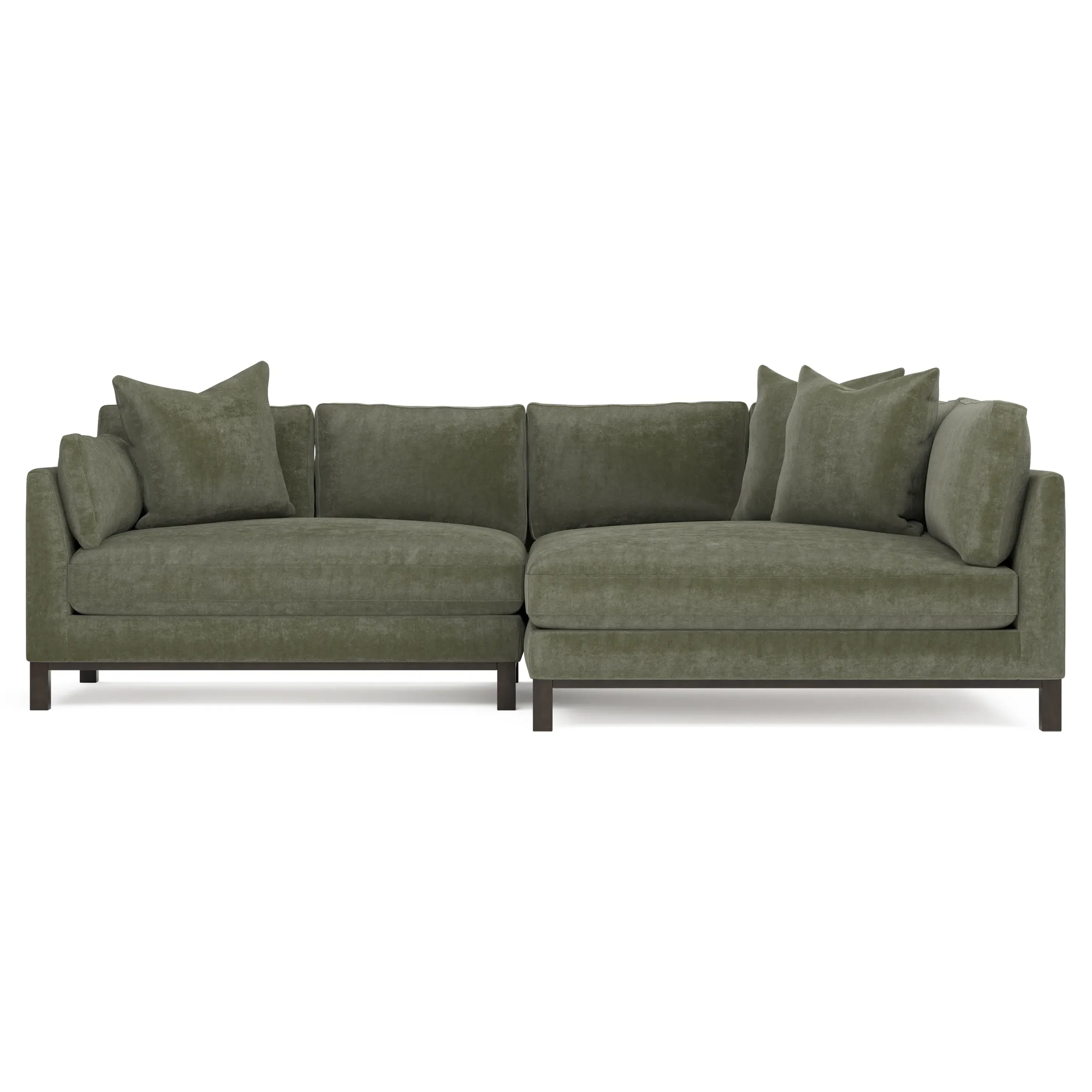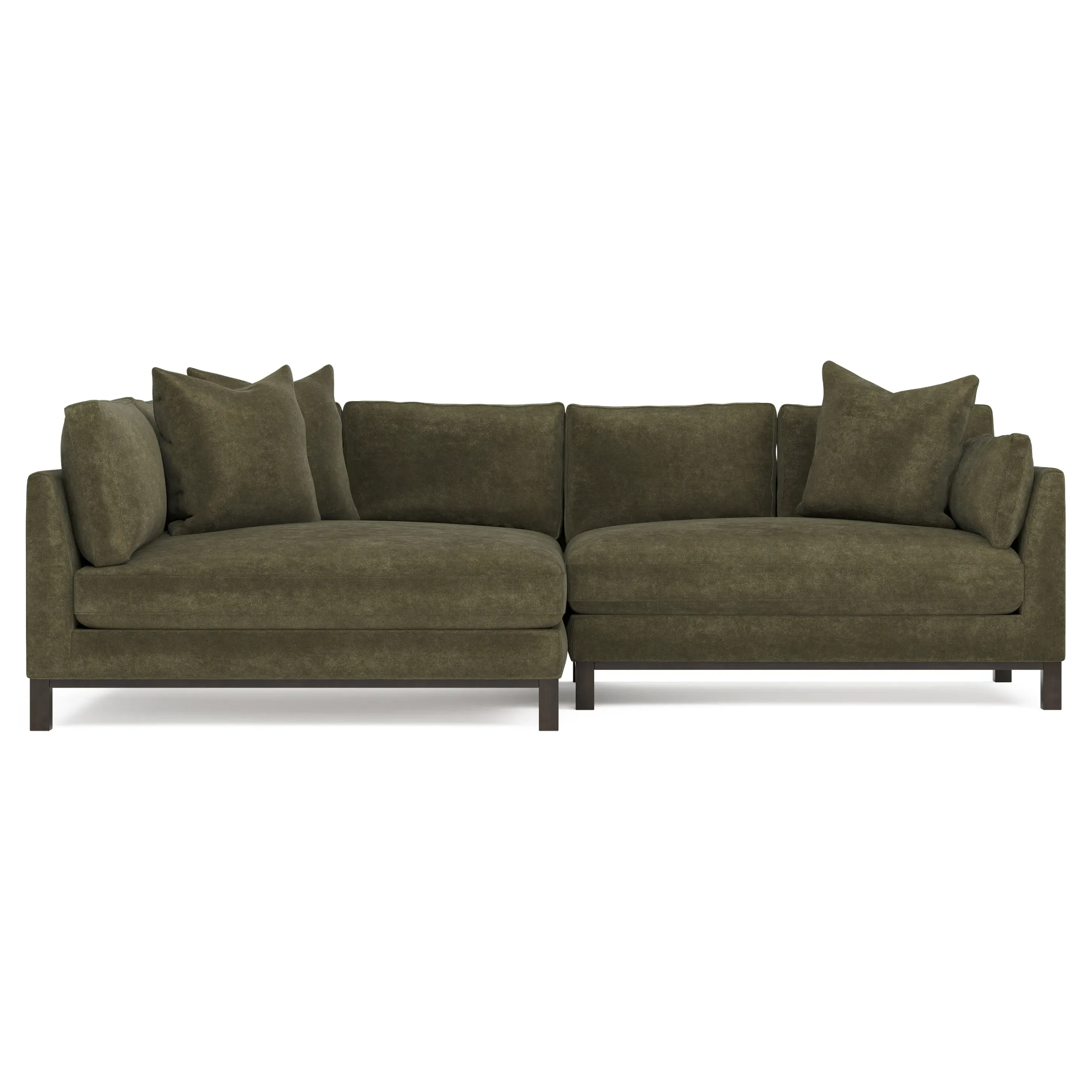 Designed with generous proportions, gently angled arms, and large throw pillows, the left 116” Adelle bumper sectional invites relaxation. A beautiful wood rail grounds the timeless transitional silhouette. Plush, comfortable seating is soft yet supportive, with a foam core surrounded by a blend of fiber, down, and feather fill. Choose from a variety of upholstery options, including linen, velvet, and performance fabrics. <b>Overall Dimensions:</b> 116" W x 61" D x 35" H. <b>Bumper Sofa Dimensions:</b> 58” W x 61” D x 35” H; <b>End Sofa Dimensions:</b> 58” W x 38” D x 35” H; <b>Seat Dimensions:</b> 25” D x 21” H; <b>Arm Height:</b> 28”; <b>Leg Height:</b> 5”. <b>Materials:</b> FSC®-certified, US-sourced, formaldehyde-free solid kiln-dried hardwood and furniture-grade laminates. <b>Material Finish:</b> Espresso legs. <b>Pieces Included:</b> Left bumper sofa, right end sofa.