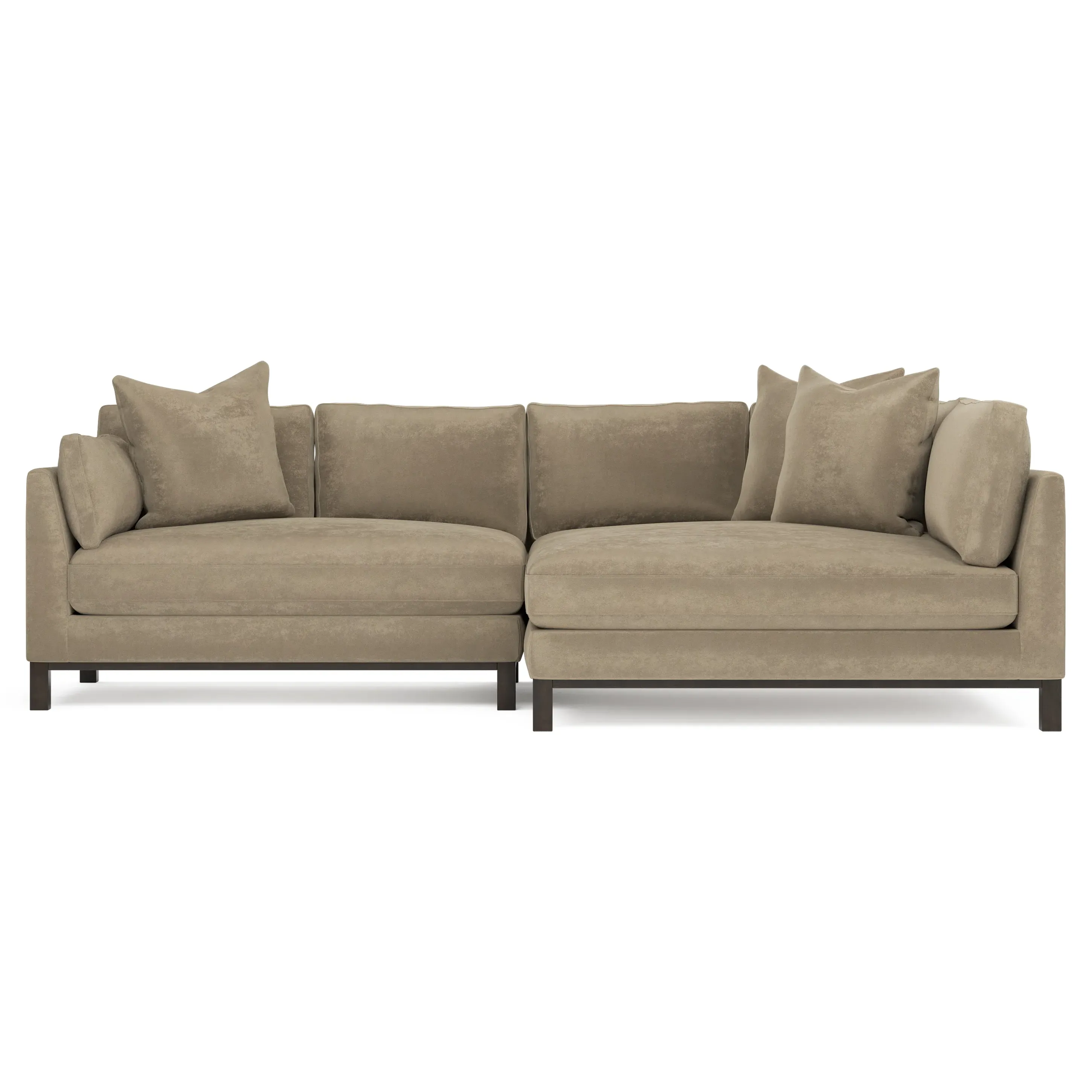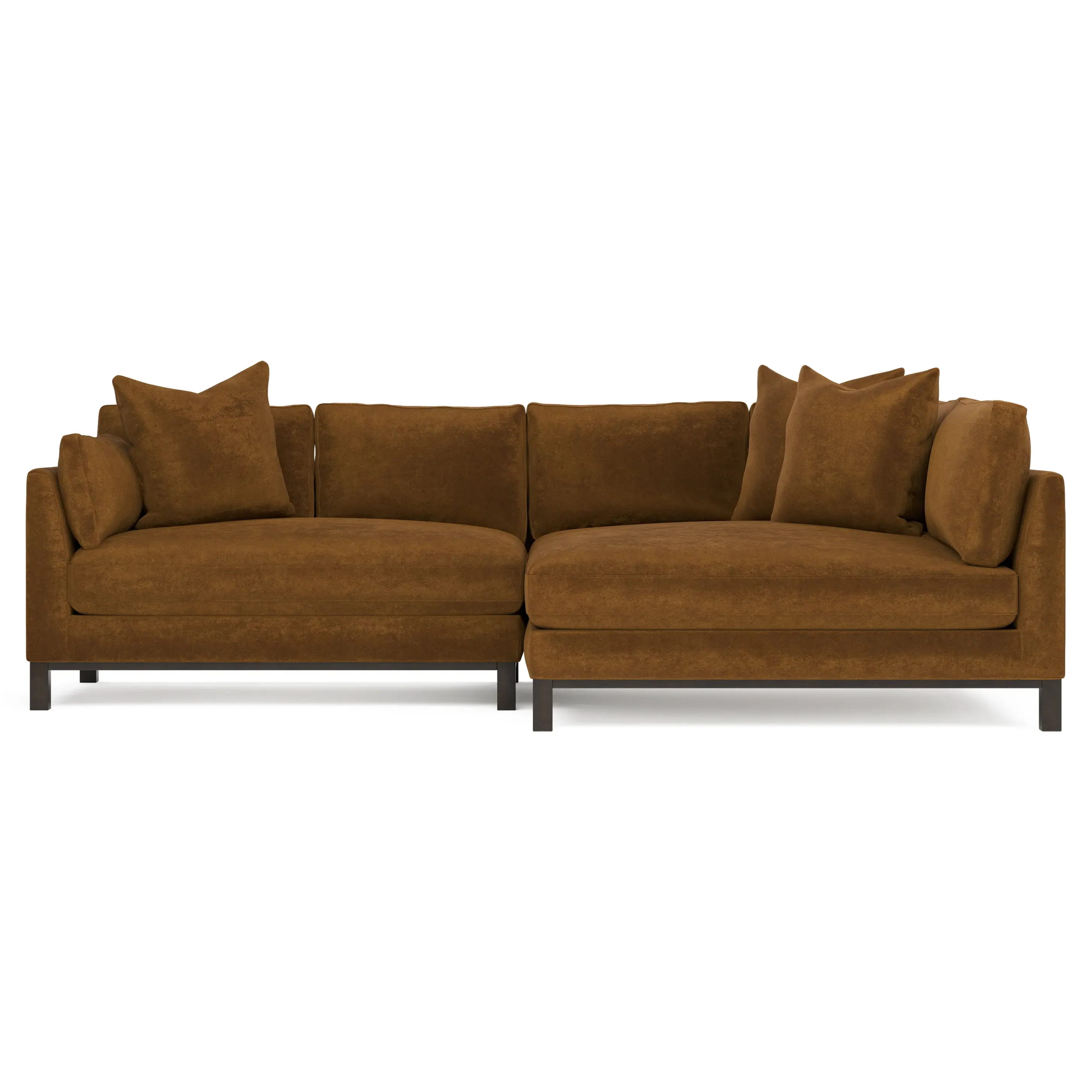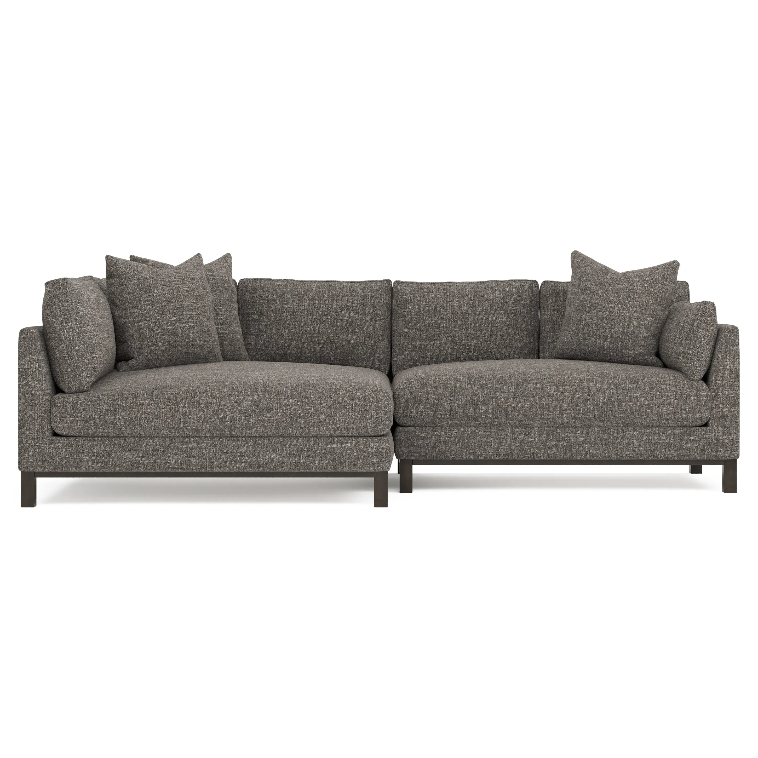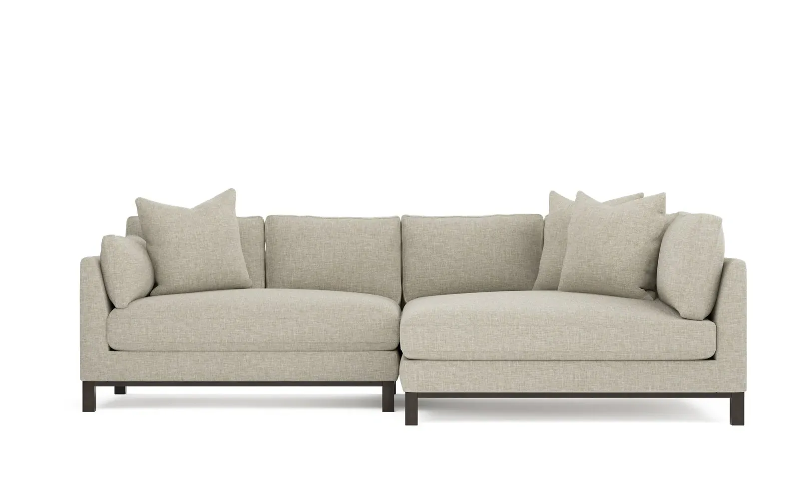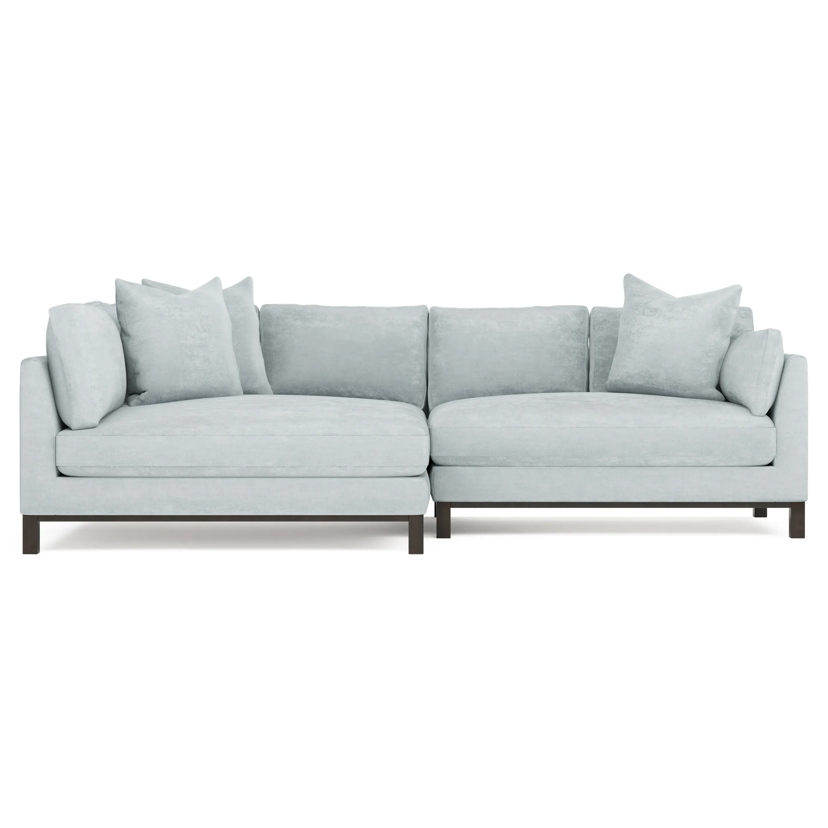 Designed with generous proportions, gently angled arms, and large throw pillows, the left 116” Adelle bumper sectional invites relaxation. A beautiful wood rail grounds the timeless transitional silhouette. Plush, comfortable seating is soft yet supportive, with a foam core surrounded by a blend of fiber, down, and feather fill. Choose from a variety of upholstery options, including linen, velvet, and performance fabrics. <b>Overall Dimensions:</b> 116" W x 61" D x 35" H. <b>Bumper Sofa Dimensions:</b> 58” W x 61” D x 35” H; <b>End Sofa Dimensions:</b> 58” W x 38” D x 35” H; <b>Seat Dimensions:</b> 25” D x 21” H; <b>Arm Height:</b> 28”; <b>Leg Height:</b> 5”. <b>Materials:</b> FSC®-certified, US-sourced, formaldehyde-free solid kiln-dried hardwood and furniture-grade laminates. <b>Material Finish:</b> Espresso legs. <b>Pieces Included:</b> Left bumper sofa, right end sofa.