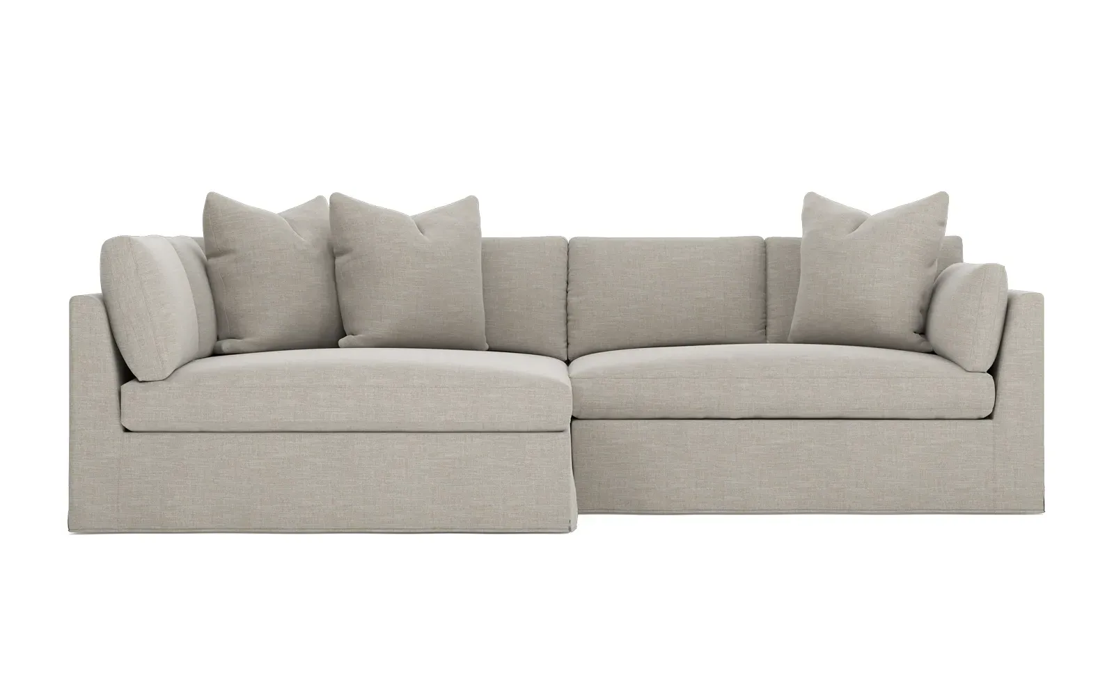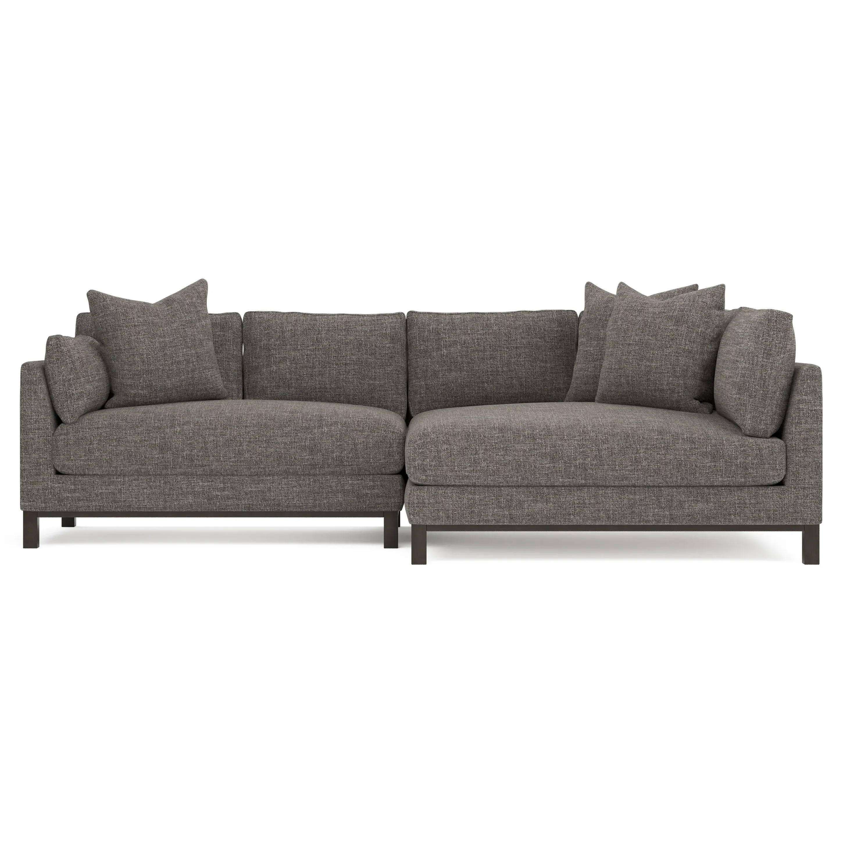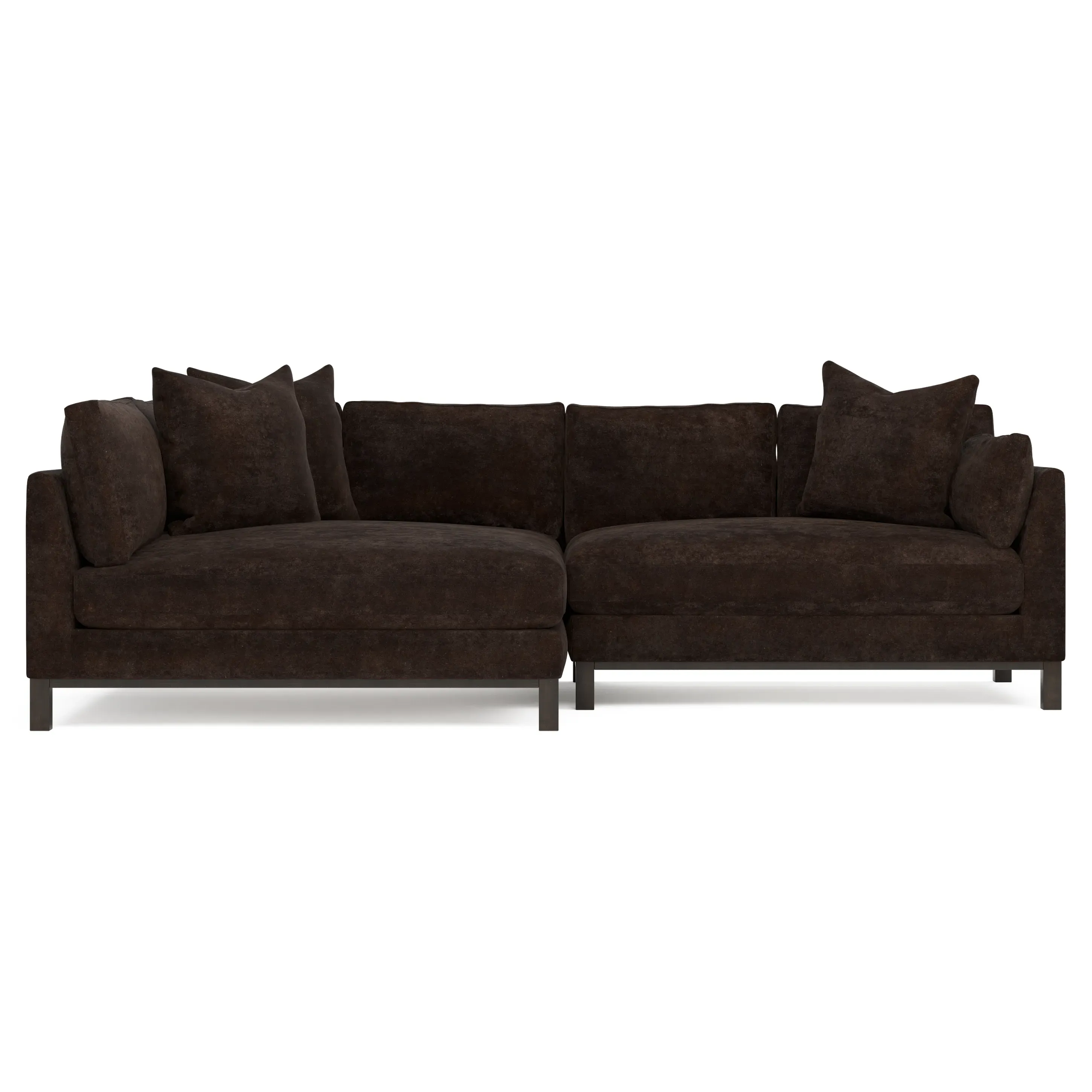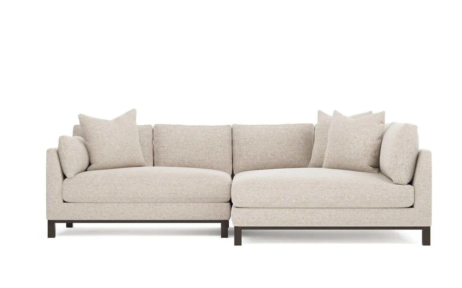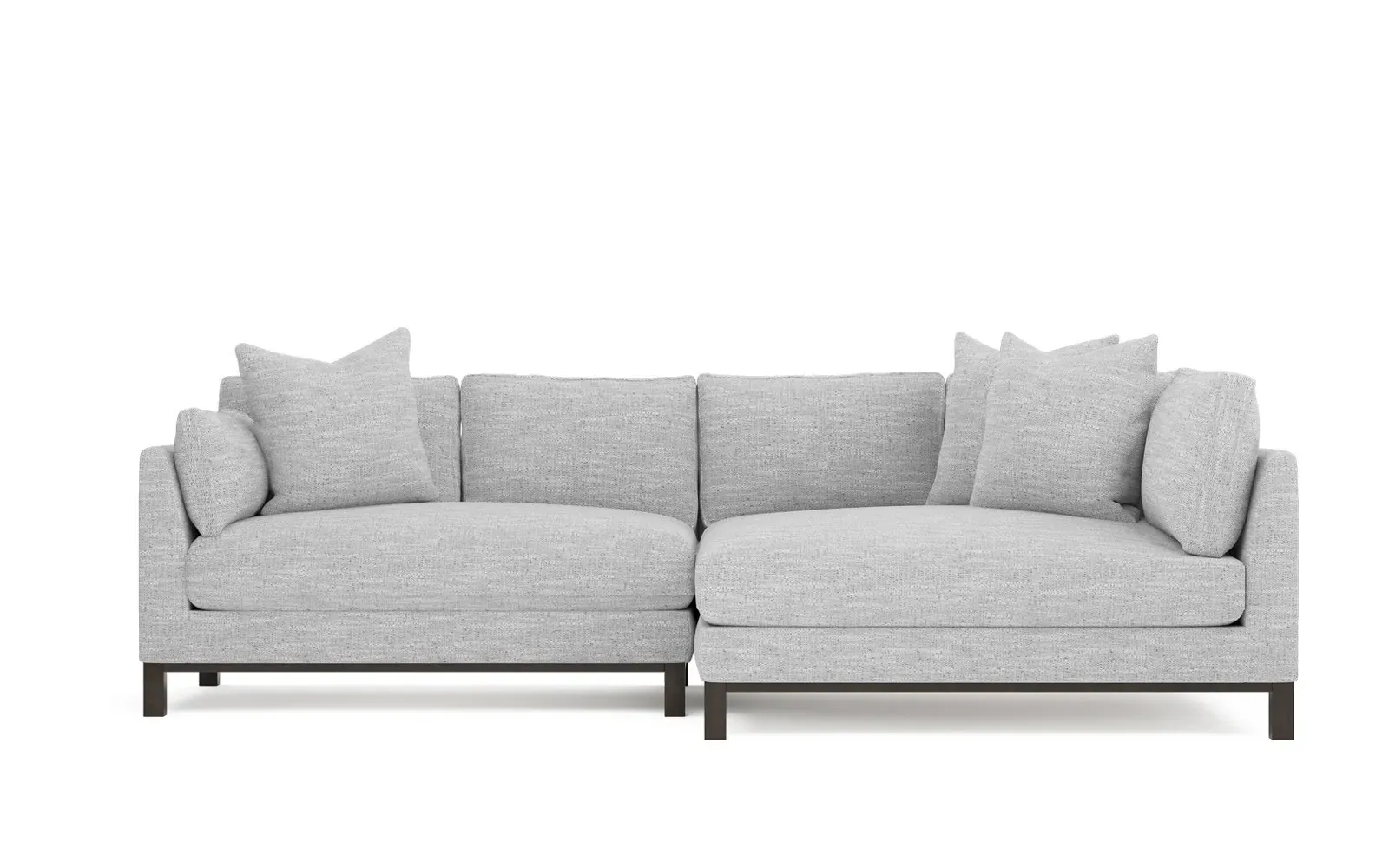Designed with generous proportions, gently angled arms, and large throw pillows, the left 116” Adelle bumper sectional invites relaxation. A beautiful wood rail grounds the timeless transitional silhouette. Plush, comfortable seating is soft yet supportive, with a foam core surrounded by a blend of fiber, down, and feather fill. Choose from a variety of upholstery options, including linen, velvet, and performance fabrics. <b>Overall Dimensions:</b> 116" W x 61" D x 35" H. <b>Bumper Sofa Dimensions:</b> 58” W x 61” D x 35” H; <b>End Sofa Dimensions:</b> 58” W x 38” D x 35” H; <b>Seat Dimensions:</b> 25” D x 21” H; <b>Arm Height:</b> 28”; <b>Leg Height:</b> 5”. <b>Materials:</b> FSC®-certified, US-sourced, formaldehyde-free solid kiln-dried hardwood and furniture-grade laminates. <b>Material Finish:</b> Espresso legs. <b>Pieces Included:</b> Left bumper sofa, right end sofa.