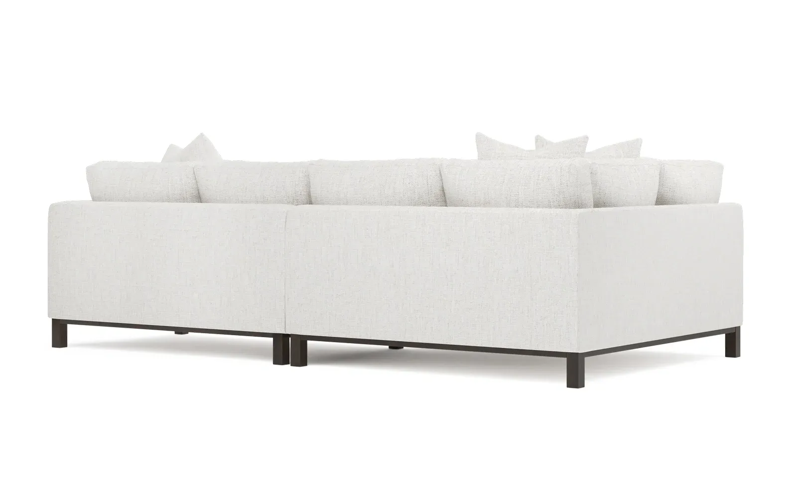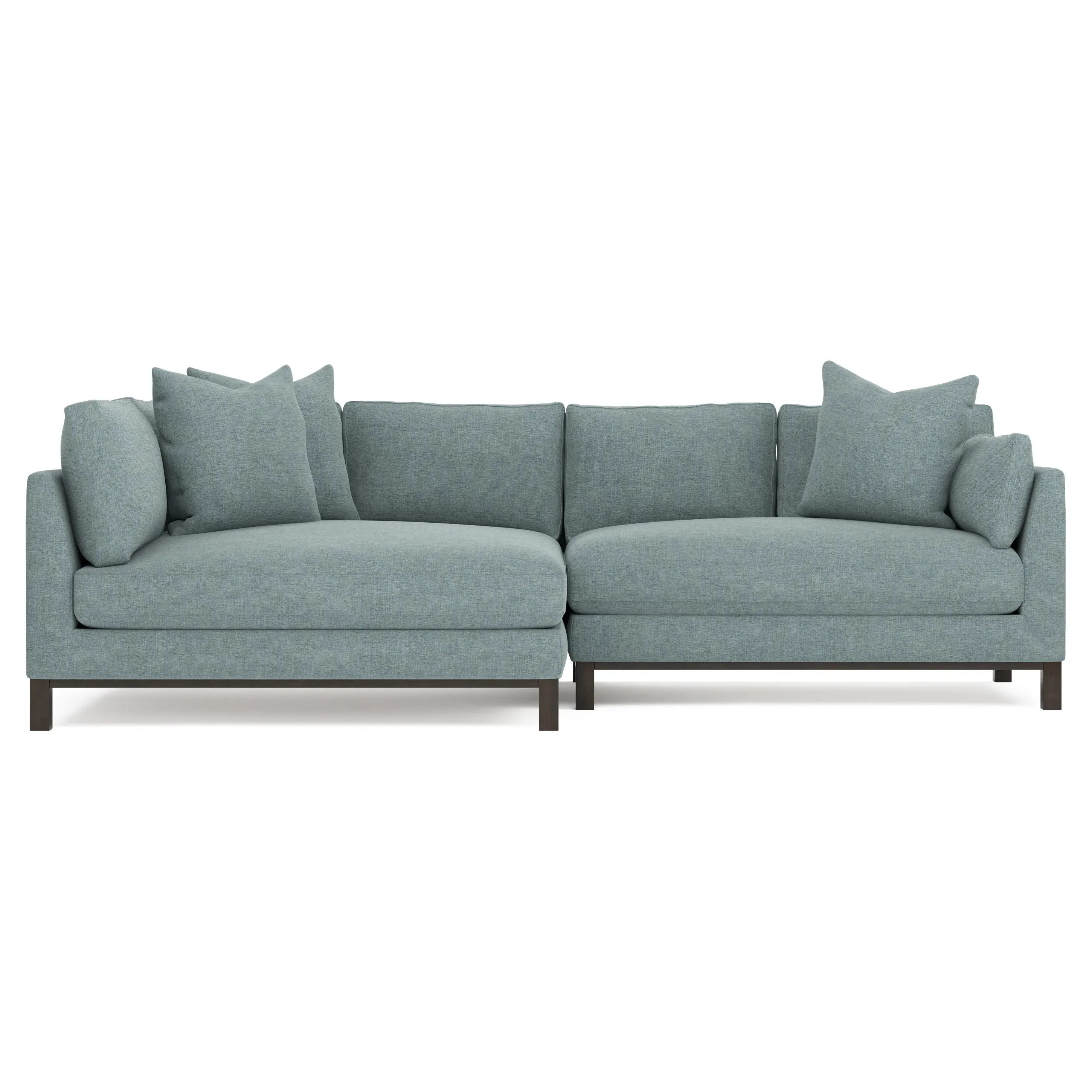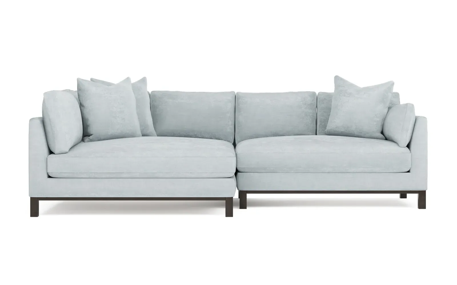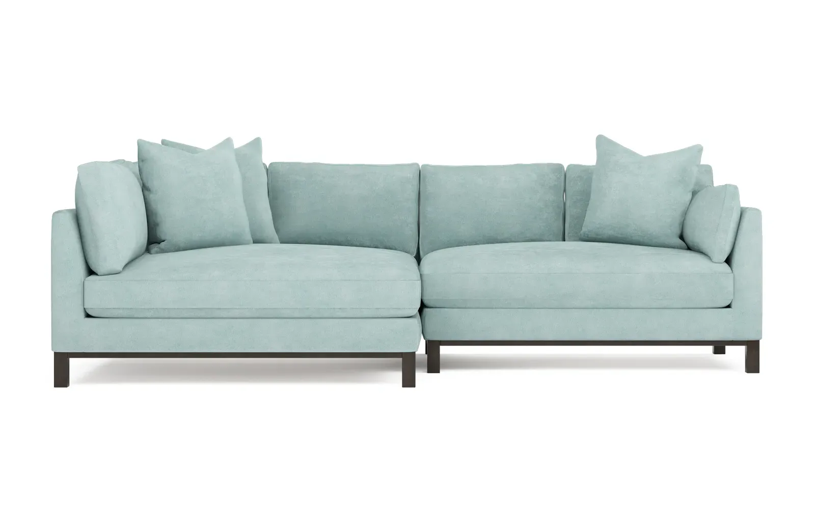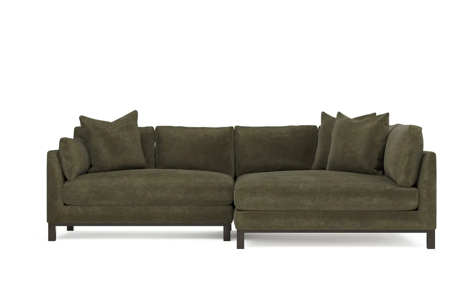 Designed with generous proportions, gently angled arms, and large throw pillows, the left 116” Adelle bumper sectional invites relaxation. A beautiful wood rail grounds the timeless transitional silhouette. Plush, comfortable seating is soft yet supportive, with a foam core surrounded by a blend of fiber, down, and feather fill. Choose from a variety of upholstery options, including linen, velvet, and performance fabrics. <b>Overall Dimensions:</b> 116" W x 61" D x 35" H. <b>Bumper Sofa Dimensions:</b> 58” W x 61” D x 35” H; <b>End Sofa Dimensions:</b> 58” W x 38” D x 35” H; <b>Seat Dimensions:</b> 25” D x 21” H; <b>Arm Height:</b> 28”; <b>Leg Height:</b> 5”. <b>Materials:</b> FSC®-certified, US-sourced, formaldehyde-free solid kiln-dried hardwood and furniture-grade laminates. <b>Material Finish:</b> Espresso legs. <b>Pieces Included:</b> Left bumper sofa, right end sofa.
