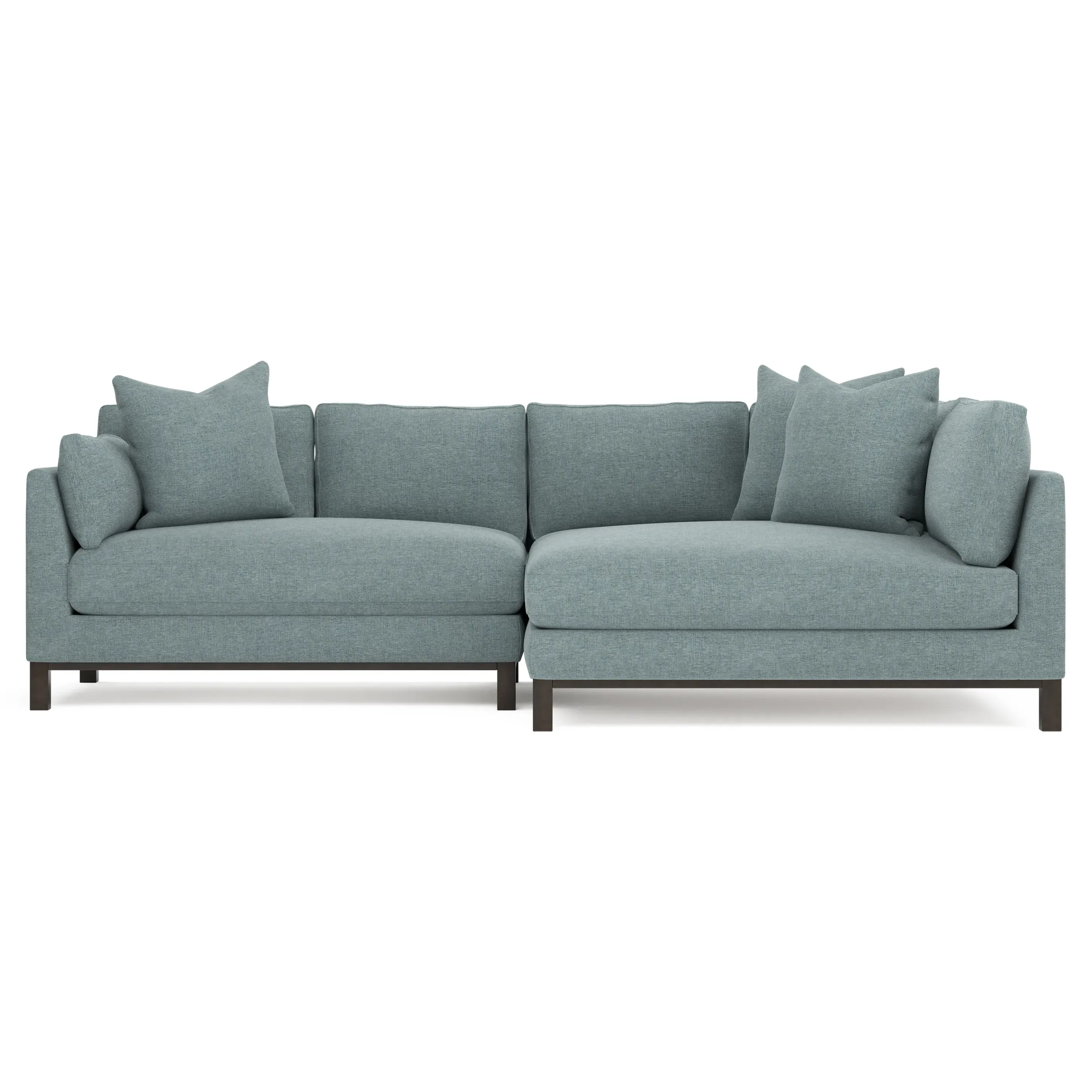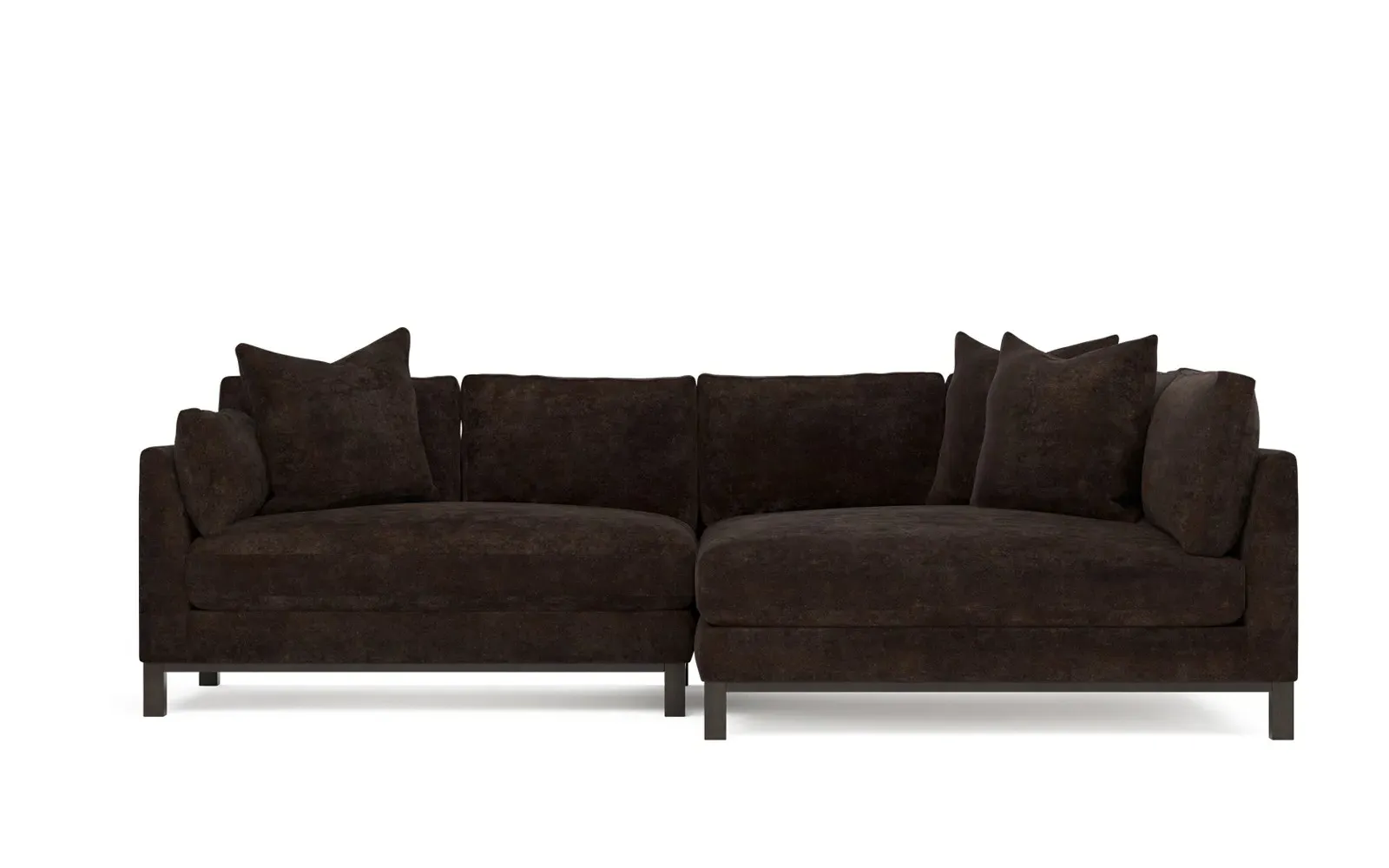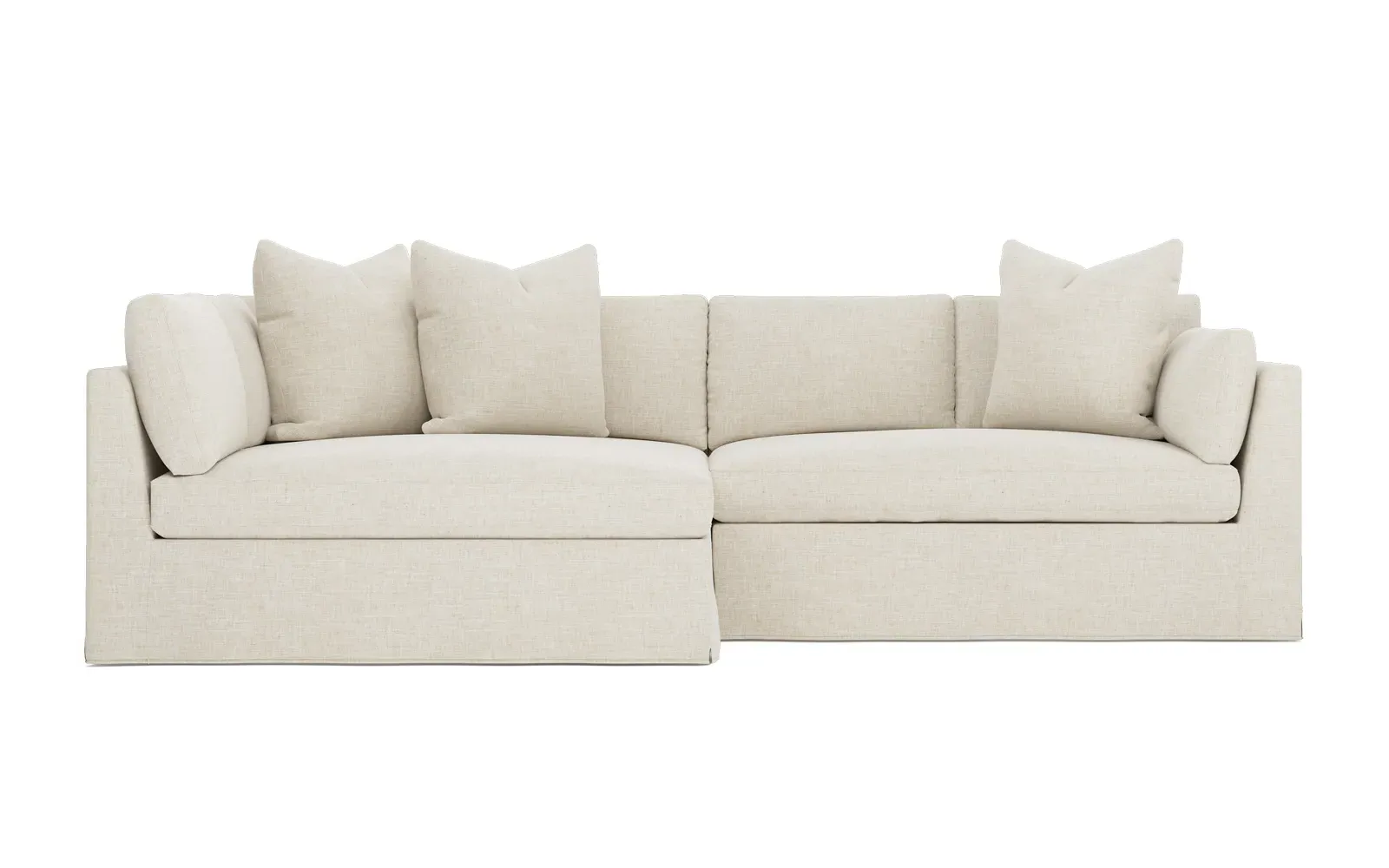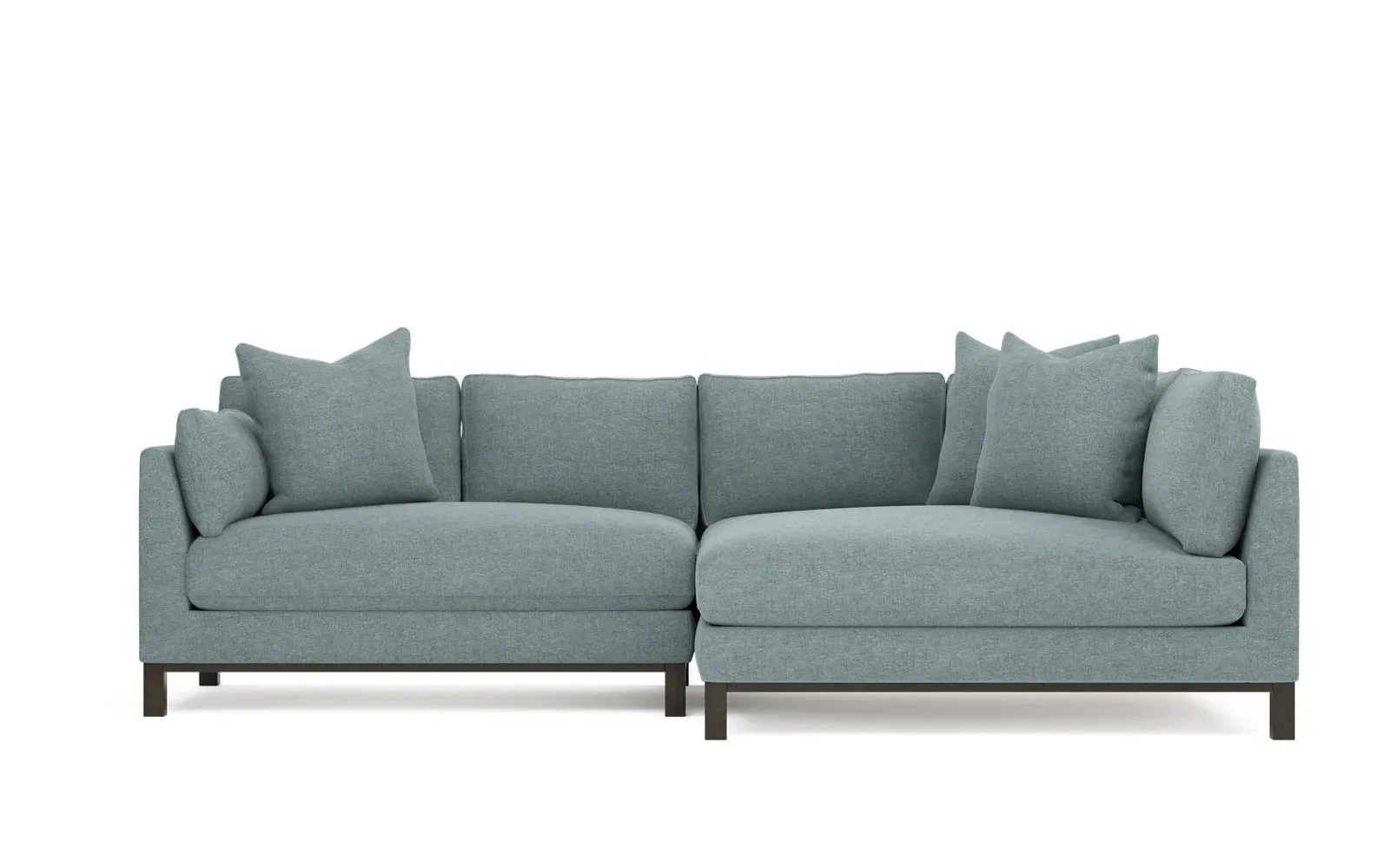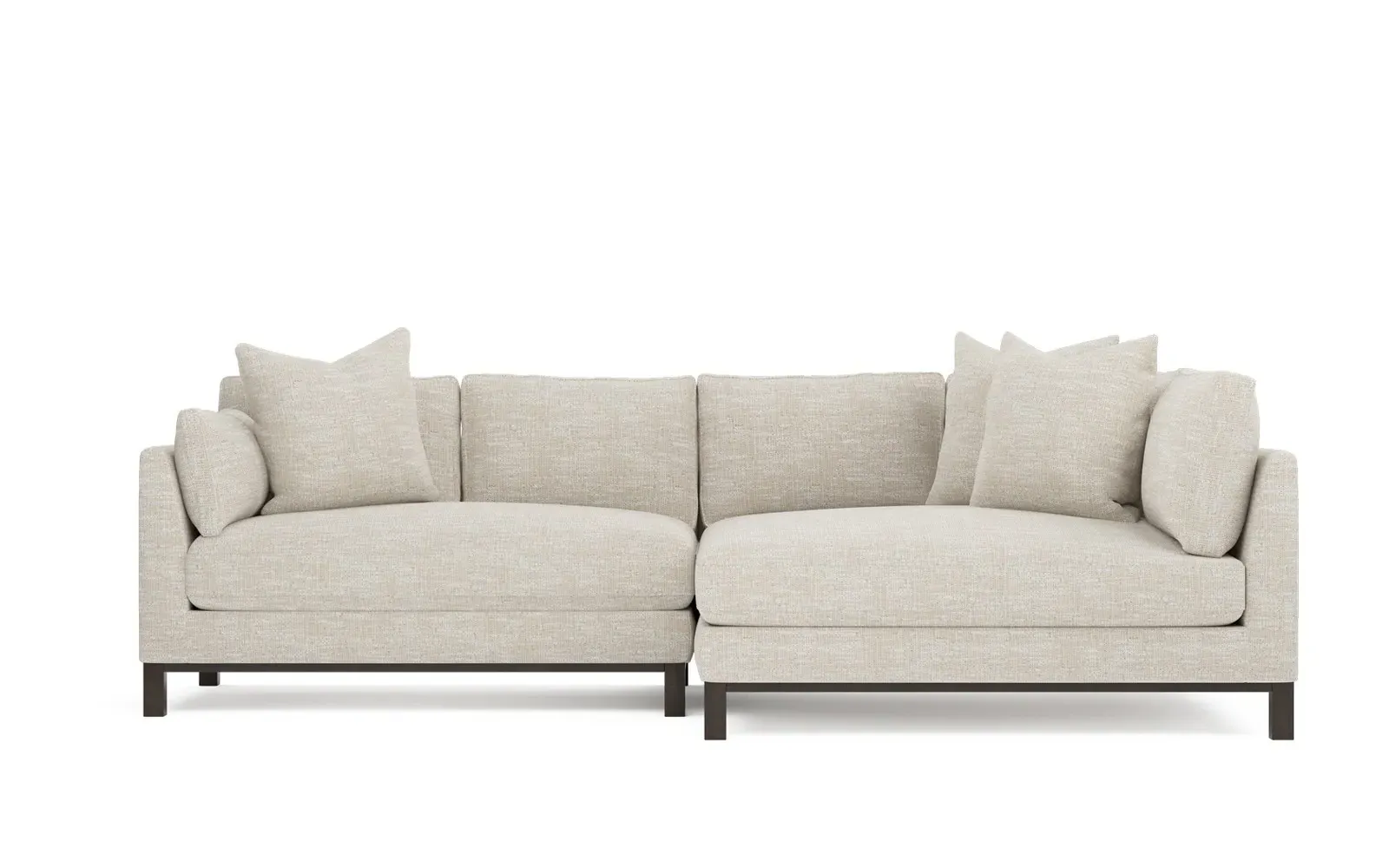 Designed with generous proportions, gently angled arms, and large throw pillows, the left 116” Adelle bumper sectional invites relaxation. A beautiful wood rail grounds the timeless transitional silhouette. Plush, comfortable seating is soft yet supportive, with a foam core surrounded by a blend of fiber, down, and feather fill. Choose from a variety of upholstery options, including linen, velvet, and performance fabrics. <b>Overall Dimensions:</b> 116" W x 61" D x 35" H. <b>Bumper Sofa Dimensions:</b> 58” W x 61” D x 35” H; <b>End Sofa Dimensions:</b> 58” W x 38” D x 35” H; <b>Seat Dimensions:</b> 25” D x 21” H; <b>Arm Height:</b> 28”; <b>Leg Height:</b> 5”. <b>Materials:</b> FSC®-certified, US-sourced, formaldehyde-free solid kiln-dried hardwood and furniture-grade laminates. <b>Material Finish:</b> Espresso legs. <b>Pieces Included:</b> Left bumper sofa, right end sofa.