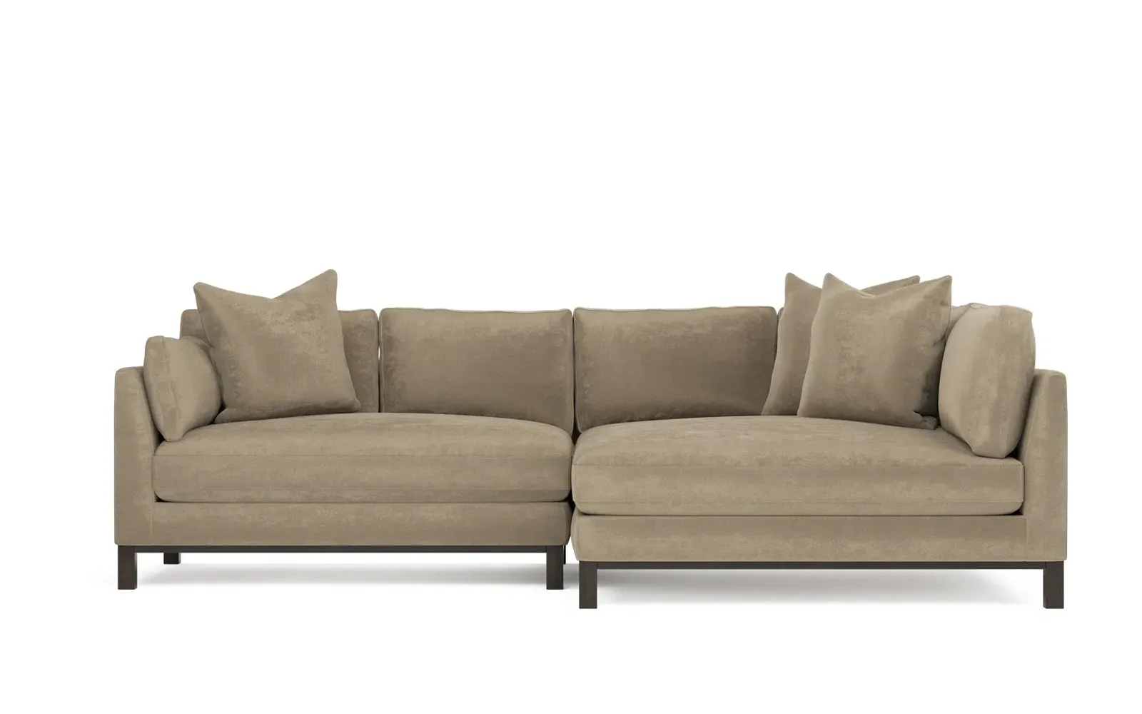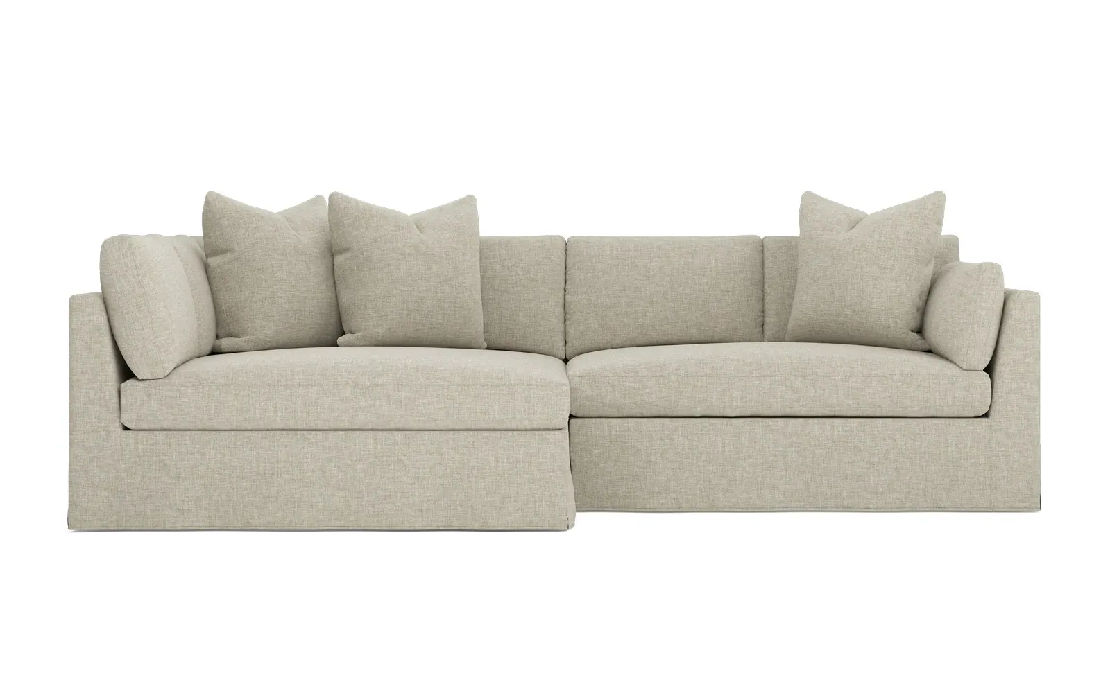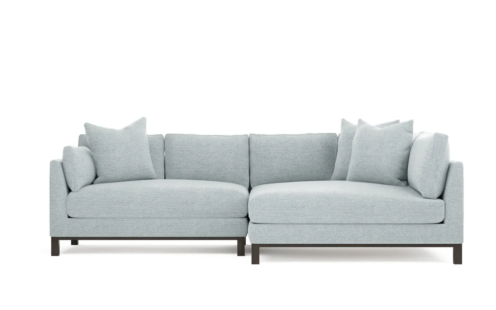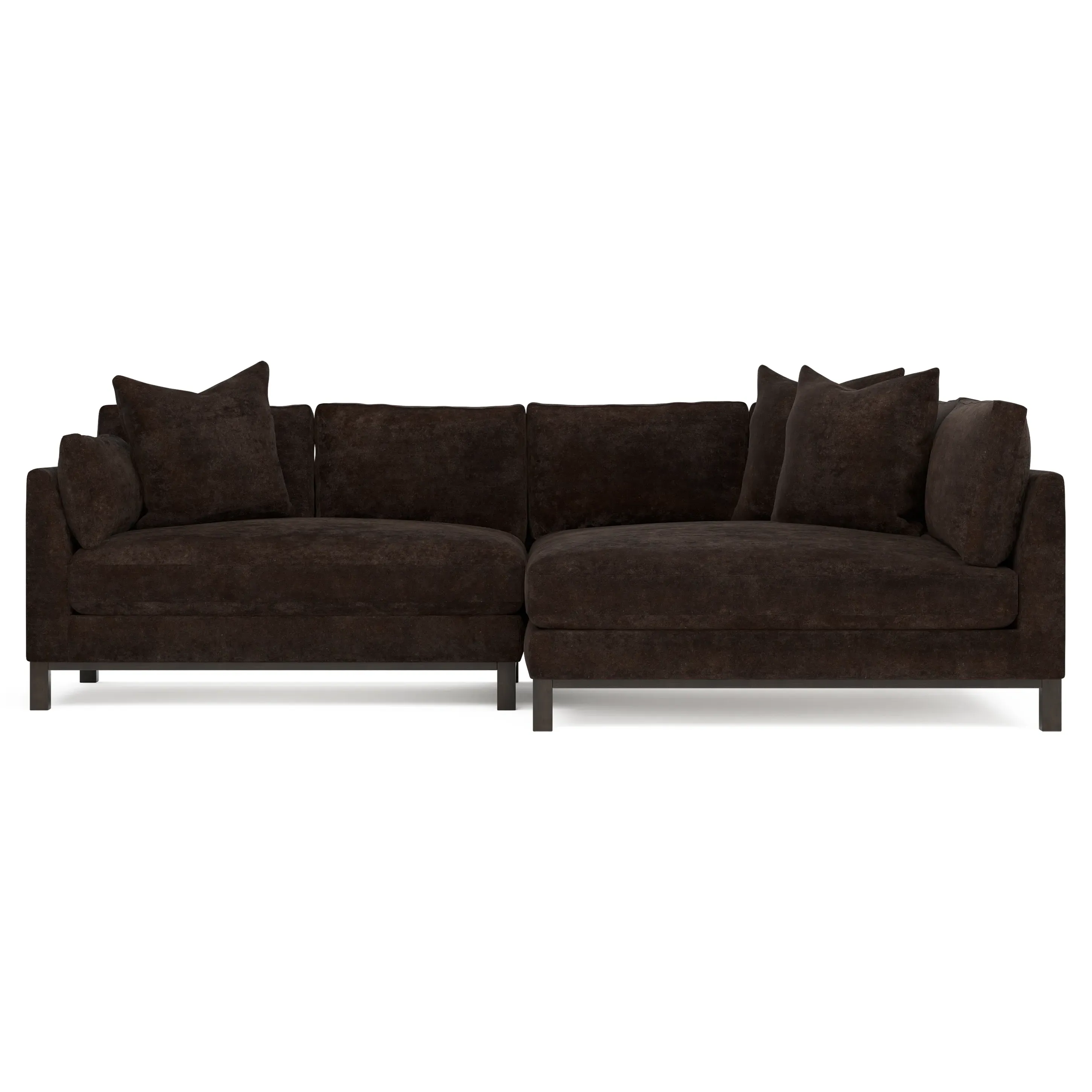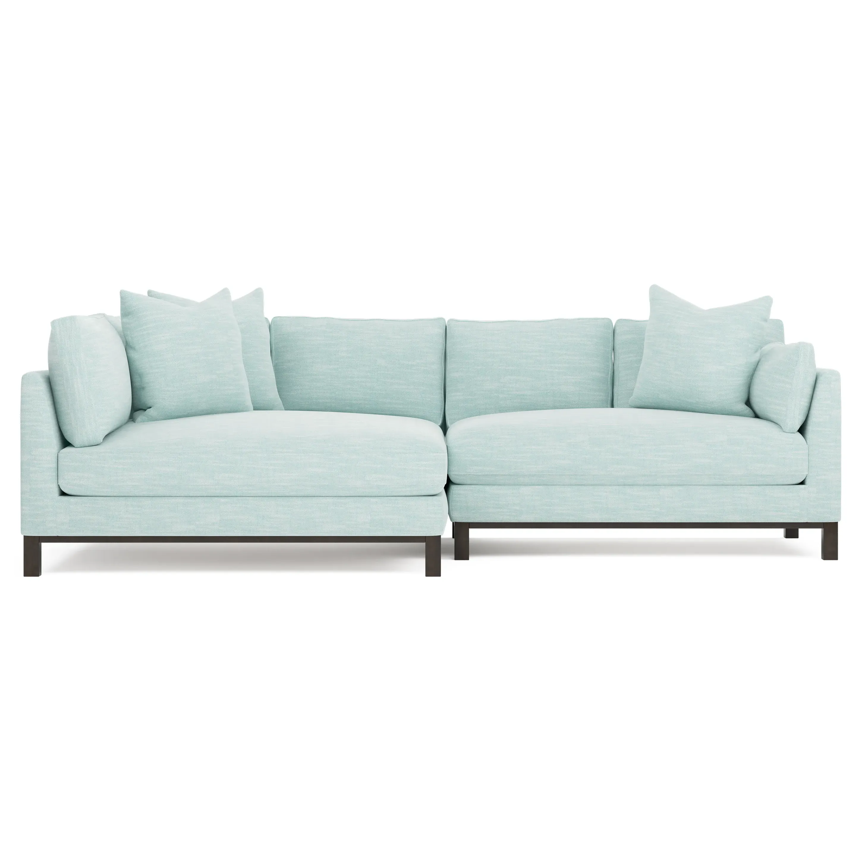 Designed with generous proportions, gently angled arms, and large throw pillows, the left 116” Adelle bumper sectional invites relaxation. A beautiful wood rail grounds the timeless transitional silhouette. Plush, comfortable seating is soft yet supportive, with a foam core surrounded by a blend of fiber, down, and feather fill. Choose from a variety of upholstery options, including linen, velvet, and performance fabrics. <b>Overall Dimensions:</b> 116" W x 61" D x 35" H. <b>Bumper Sofa Dimensions:</b> 58” W x 61” D x 35” H; <b>End Sofa Dimensions:</b> 58” W x 38” D x 35” H; <b>Seat Dimensions:</b> 25” D x 21” H; <b>Arm Height:</b> 28”; <b>Leg Height:</b> 5”. <b>Materials:</b> FSC®-certified, US-sourced, formaldehyde-free solid kiln-dried hardwood and furniture-grade laminates. <b>Material Finish:</b> Espresso legs. <b>Pieces Included:</b> Left bumper sofa, right end sofa.