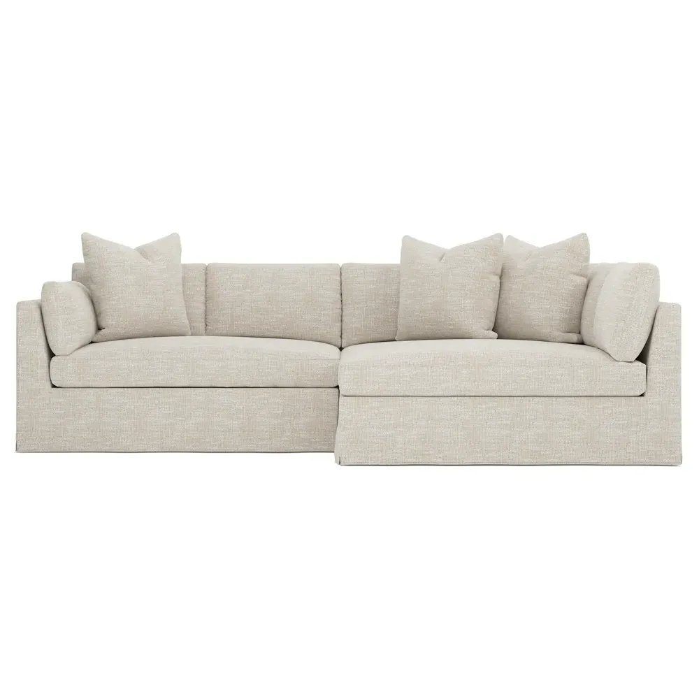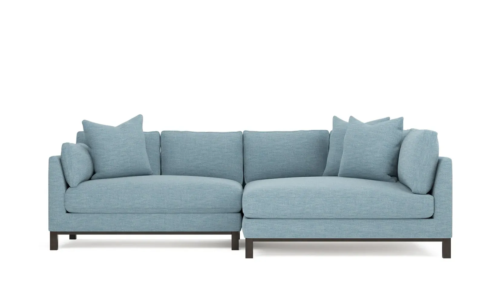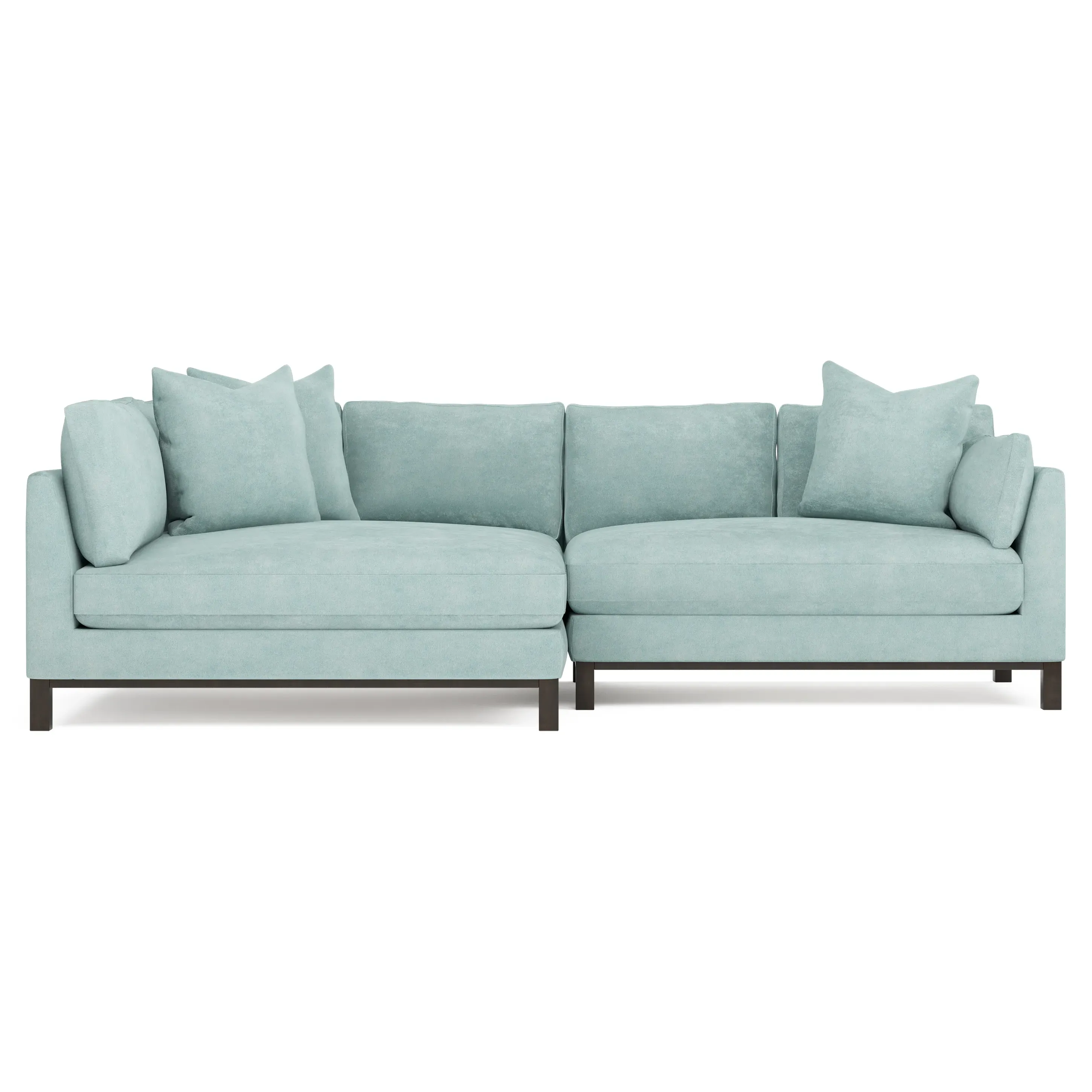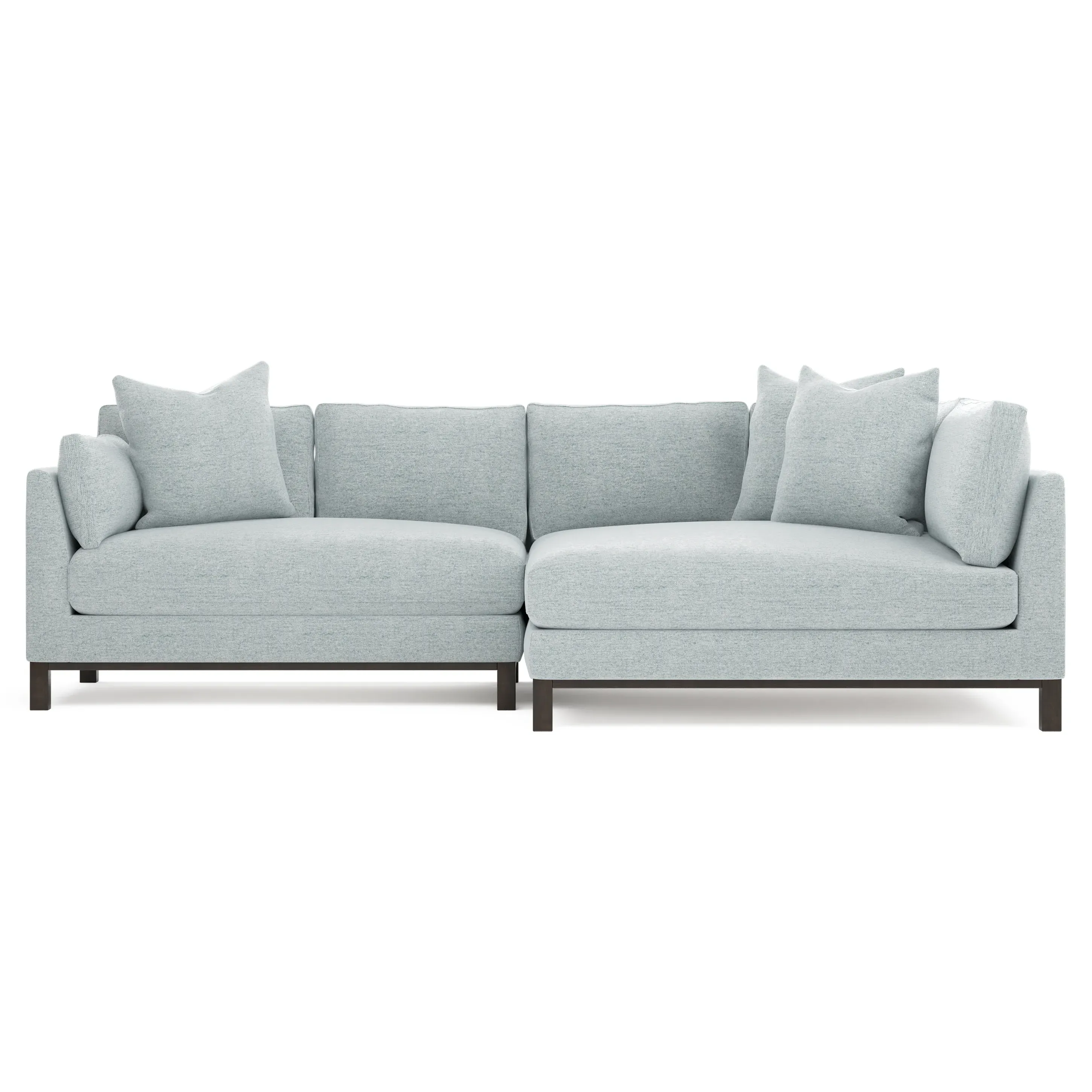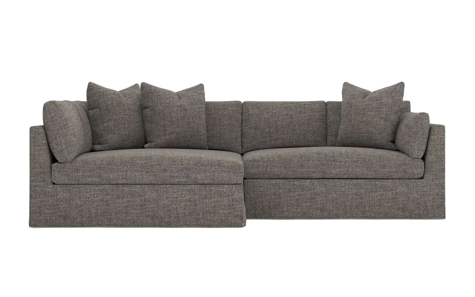 Designed with generous proportions, gently angled arms, and large throw pillows, the left 116” Adelle bumper sectional invites relaxation. A beautiful wood rail grounds the timeless transitional silhouette. Plush, comfortable seating is soft yet supportive, with a foam core surrounded by a blend of fiber, down, and feather fill. Choose from a variety of upholstery options, including linen, velvet, and performance fabrics. <b>Overall Dimensions:</b> 116" W x 61" D x 35" H. <b>Bumper Sofa Dimensions:</b> 58” W x 61” D x 35” H; <b>End Sofa Dimensions:</b> 58” W x 38” D x 35” H; <b>Seat Dimensions:</b> 25” D x 21” H; <b>Arm Height:</b> 28”; <b>Leg Height:</b> 5”. <b>Materials:</b> FSC®-certified, US-sourced, formaldehyde-free solid kiln-dried hardwood and furniture-grade laminates. <b>Material Finish:</b> Espresso legs. <b>Pieces Included:</b> Left bumper sofa, right end sofa.