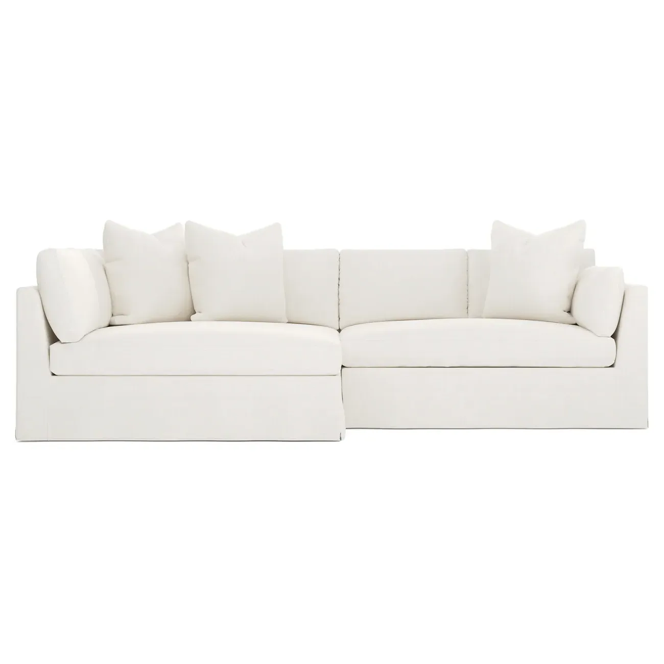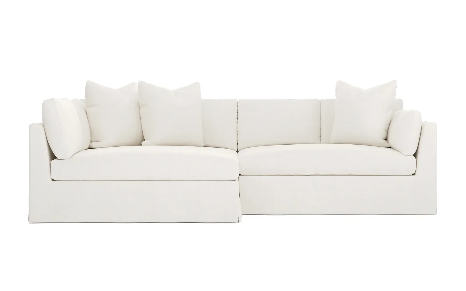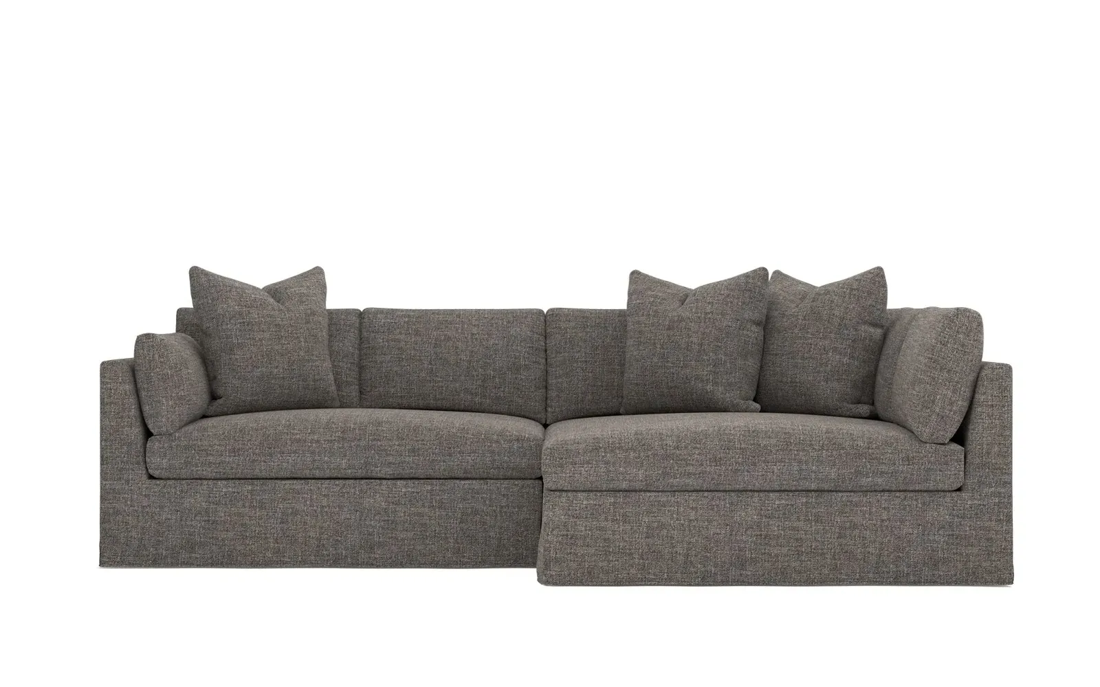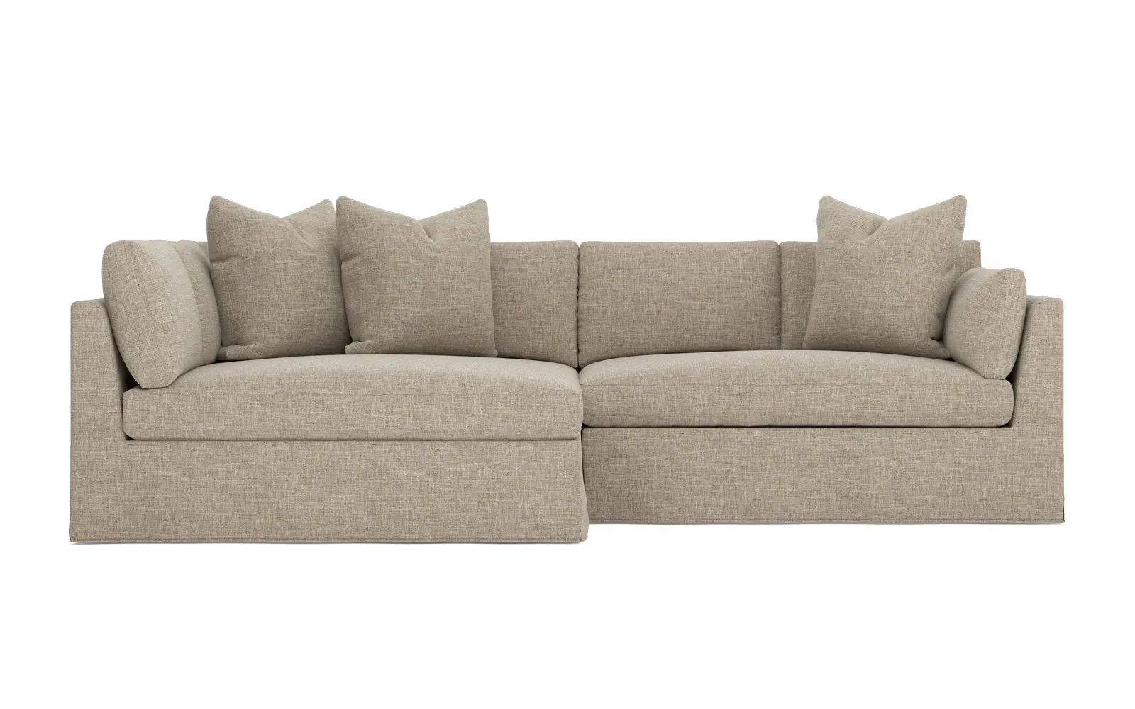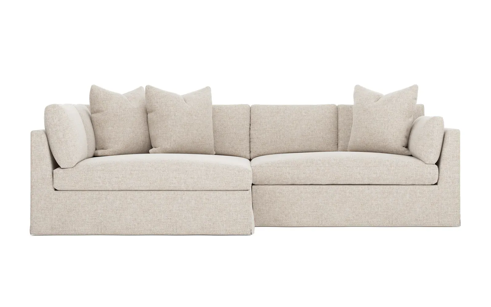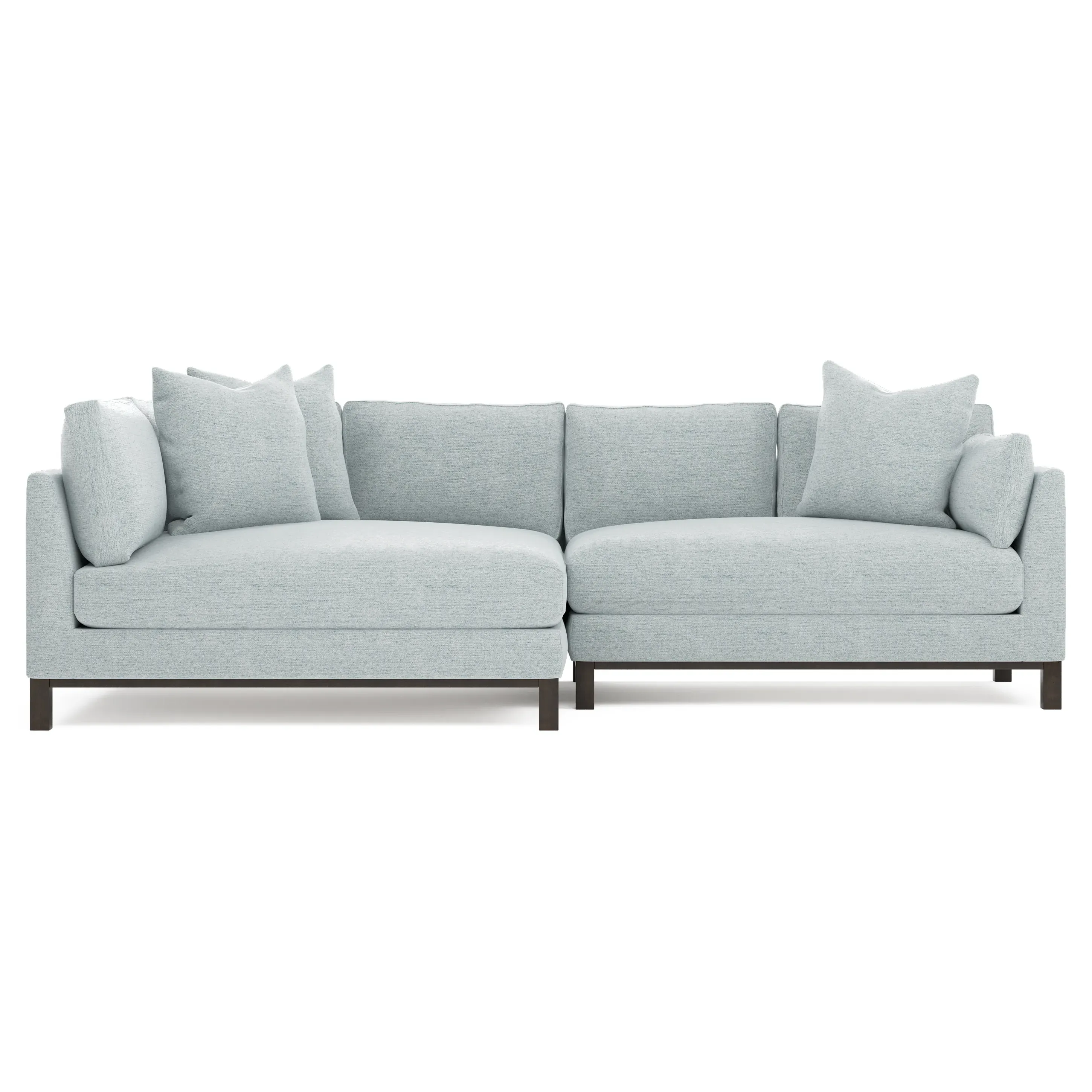 Designed with generous proportions, gently angled arms, and large throw pillows, the left 116” Adelle bumper sectional invites relaxation. A beautiful wood rail grounds the timeless transitional silhouette. Plush, comfortable seating is soft yet supportive, with a foam core surrounded by a blend of fiber, down, and feather fill. Choose from a variety of upholstery options, including linen, velvet, and performance fabrics. <b>Overall Dimensions:</b> 116" W x 61" D x 35" H. <b>Bumper Sofa Dimensions:</b> 58” W x 61” D x 35” H; <b>End Sofa Dimensions:</b> 58” W x 38” D x 35” H; <b>Seat Dimensions:</b> 25” D x 21” H; <b>Arm Height:</b> 28”; <b>Leg Height:</b> 5”. <b>Materials:</b> FSC®-certified, US-sourced, formaldehyde-free solid kiln-dried hardwood and furniture-grade laminates. <b>Material Finish:</b> Espresso legs. <b>Pieces Included:</b> Left bumper sofa, right end sofa.
