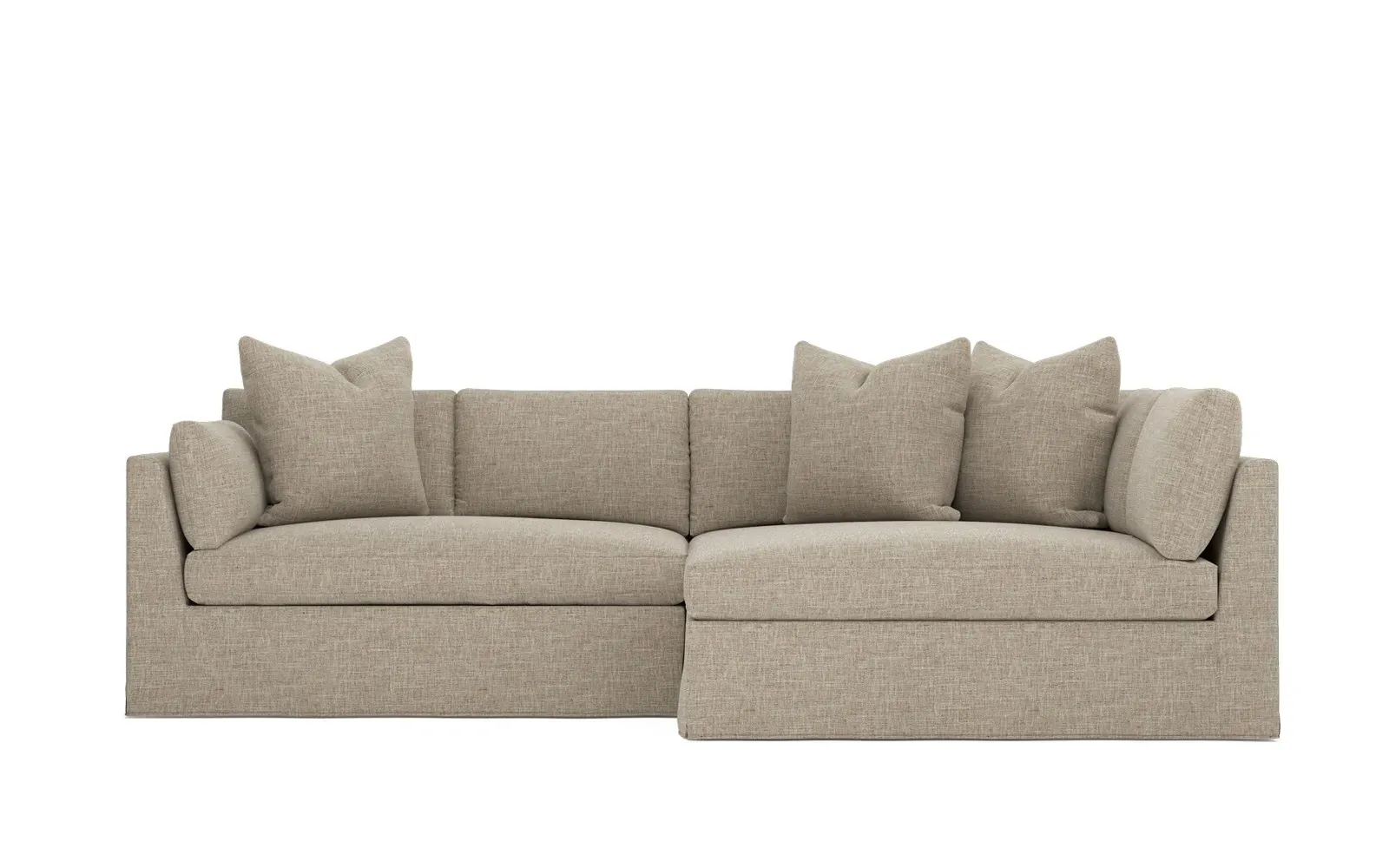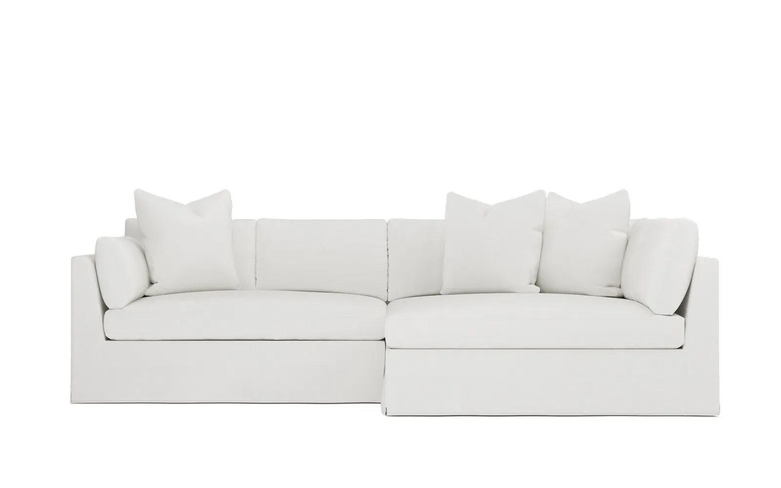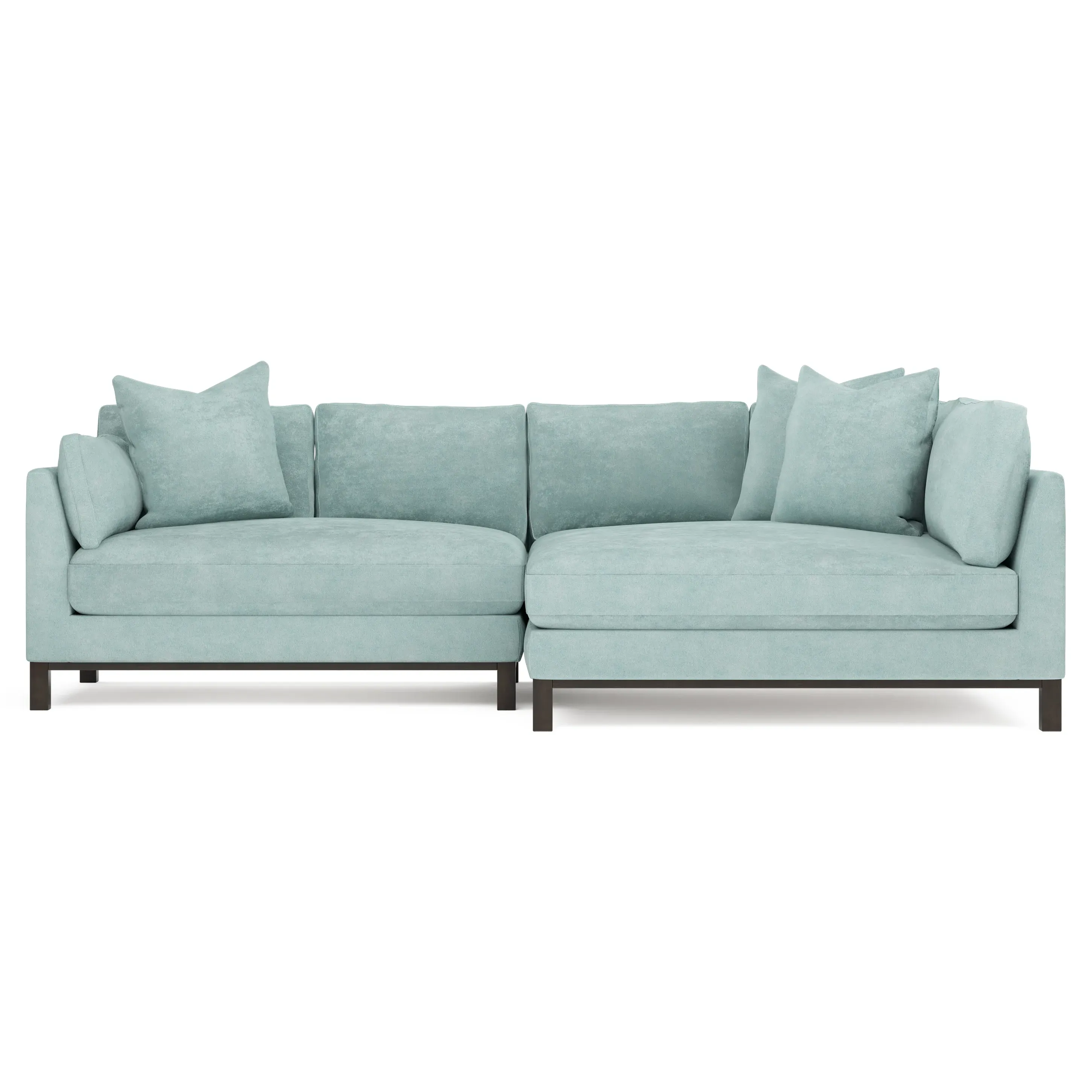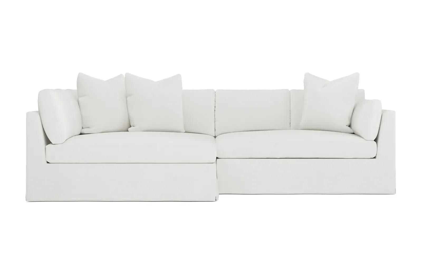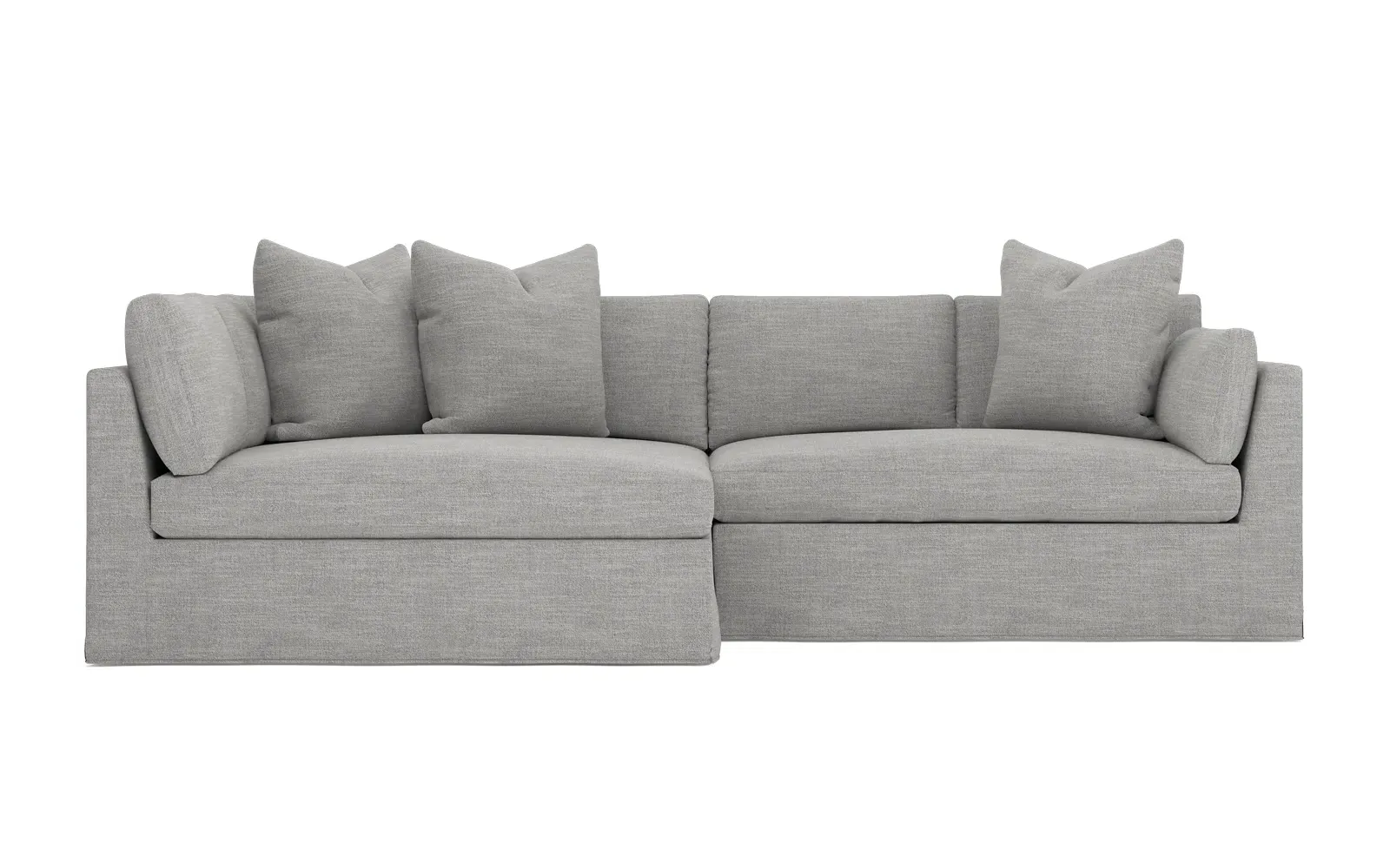 Designed with generous proportions, gently angled arms, and large throw pillows, the left 116” Adelle bumper sectional invites relaxation. A beautiful wood rail grounds the timeless transitional silhouette. Plush, comfortable seating is soft yet supportive, with a foam core surrounded by a blend of fiber, down, and feather fill. Choose from a variety of upholstery options, including linen, velvet, and performance fabrics. <b>Overall Dimensions:</b> 116" W x 61" D x 35" H. <b>Bumper Sofa Dimensions:</b> 58” W x 61” D x 35” H; <b>End Sofa Dimensions:</b> 58” W x 38” D x 35” H; <b>Seat Dimensions:</b> 25” D x 21” H; <b>Arm Height:</b> 28”; <b>Leg Height:</b> 5”. <b>Materials:</b> FSC®-certified, US-sourced, formaldehyde-free solid kiln-dried hardwood and furniture-grade laminates. <b>Material Finish:</b> Espresso legs. <b>Pieces Included:</b> Left bumper sofa, right end sofa.