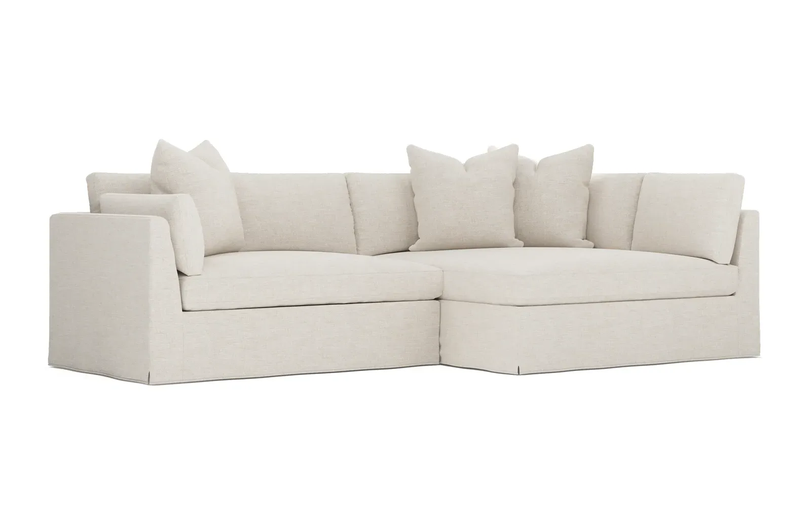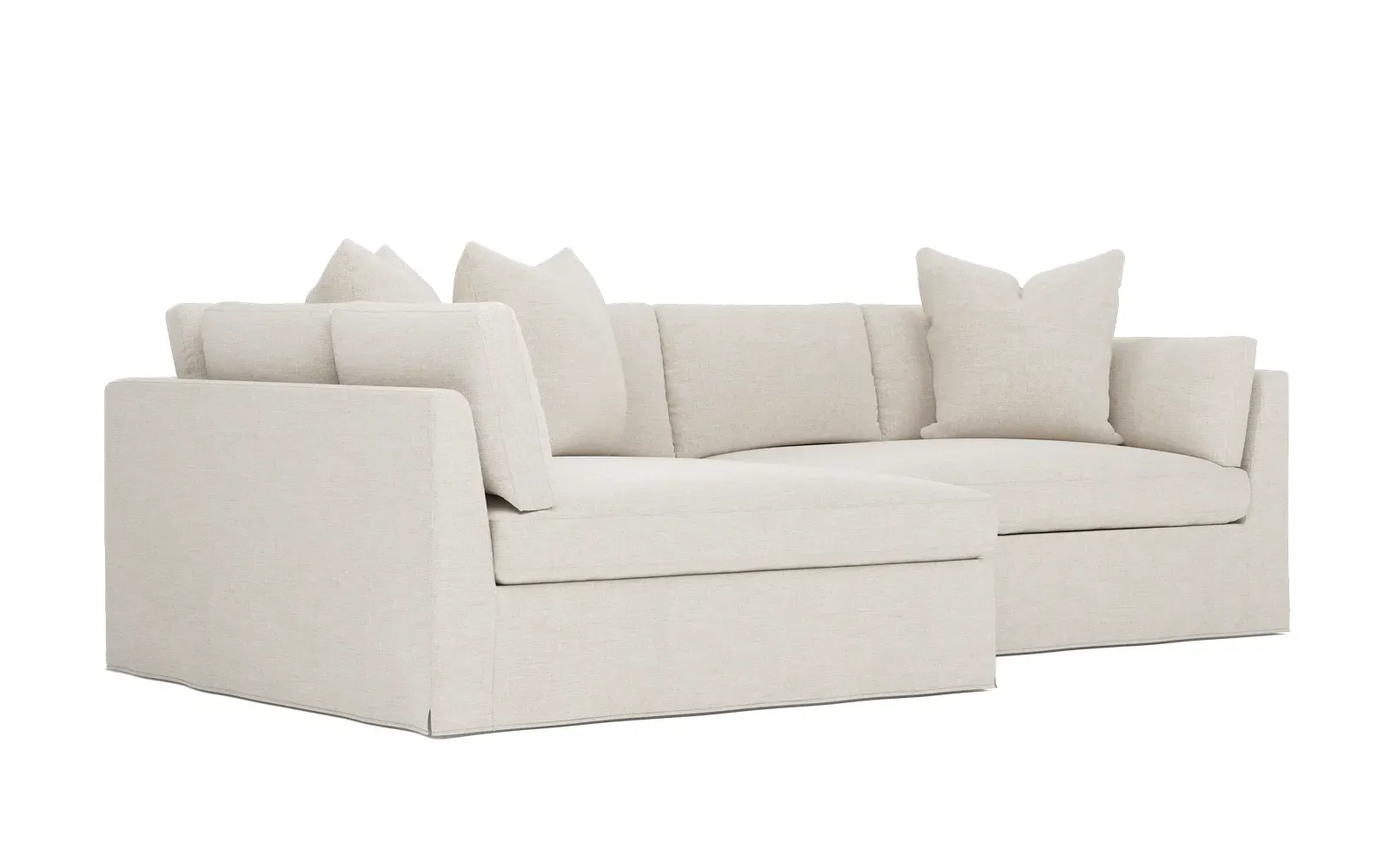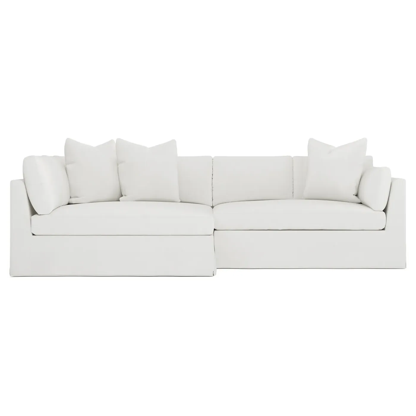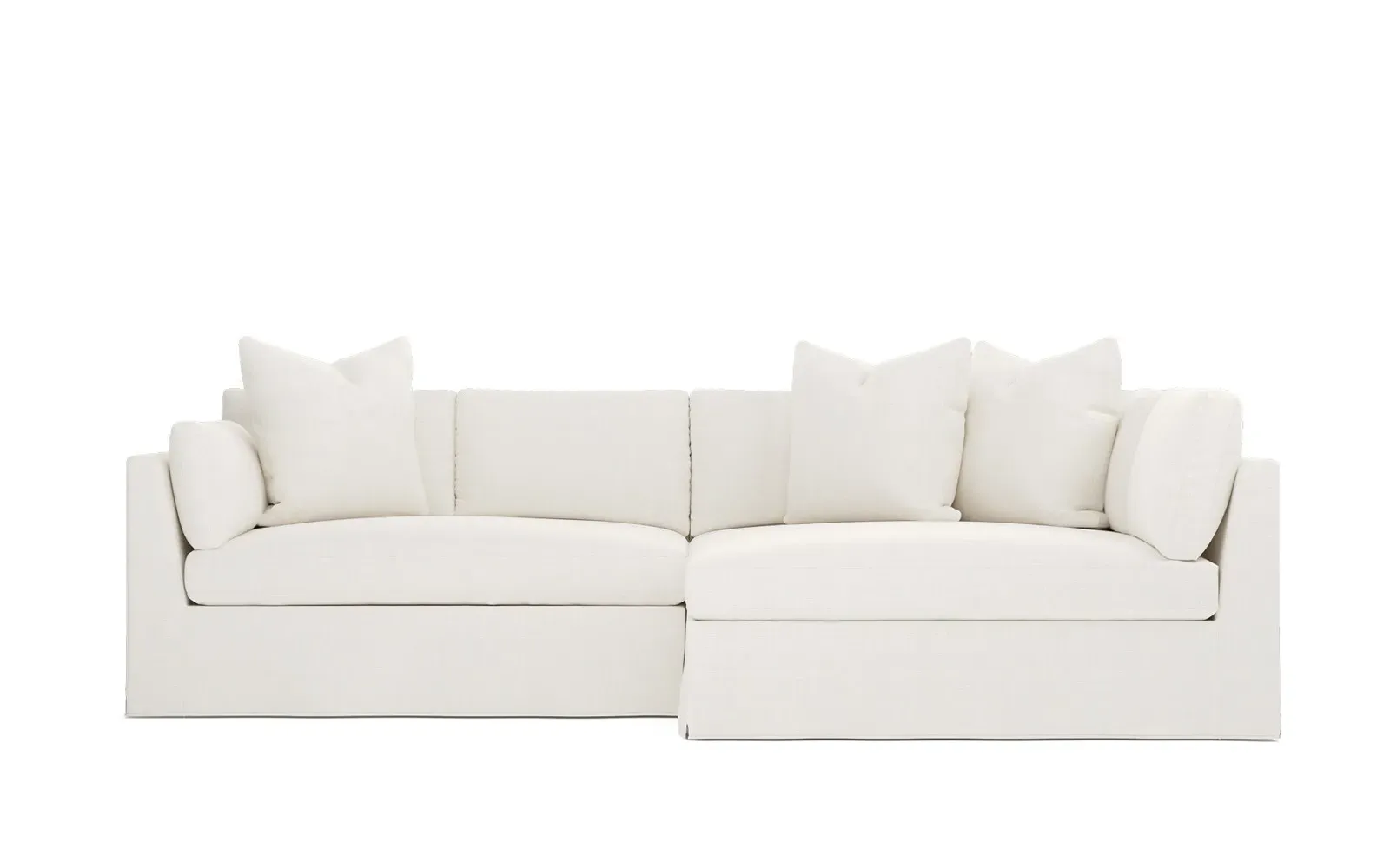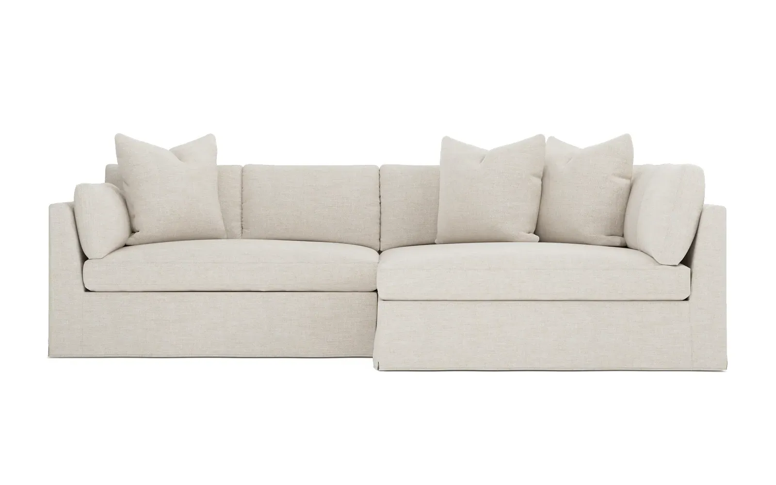 Designed with generous proportions, gently angled arms, and large throw pillows, the left 116” Adelle bumper sectional invites relaxation. A beautiful wood rail grounds the timeless transitional silhouette. Plush, comfortable seating is soft yet supportive, with a foam core surrounded by a blend of fiber, down, and feather fill. Choose from a variety of upholstery options, including linen, velvet, and performance fabrics. <b>Overall Dimensions:</b> 116" W x 61" D x 35" H. <b>Bumper Sofa Dimensions:</b> 58” W x 61” D x 35” H; <b>End Sofa Dimensions:</b> 58” W x 38” D x 35” H; <b>Seat Dimensions:</b> 25” D x 21” H; <b>Arm Height:</b> 28”; <b>Leg Height:</b> 5”. <b>Materials:</b> FSC®-certified, US-sourced, formaldehyde-free solid kiln-dried hardwood and furniture-grade laminates. <b>Material Finish:</b> Espresso legs. <b>Pieces Included:</b> Left bumper sofa, right end sofa.