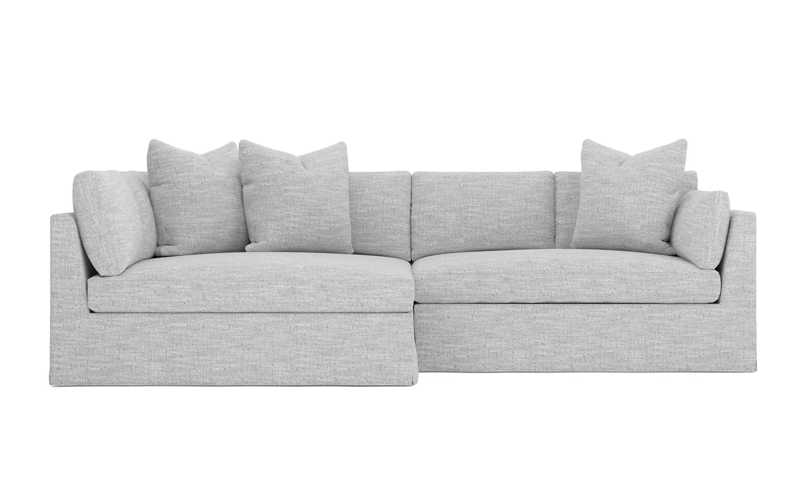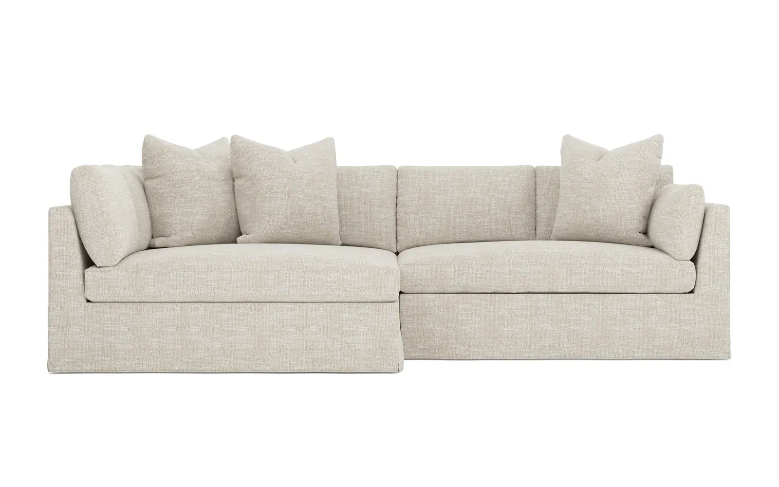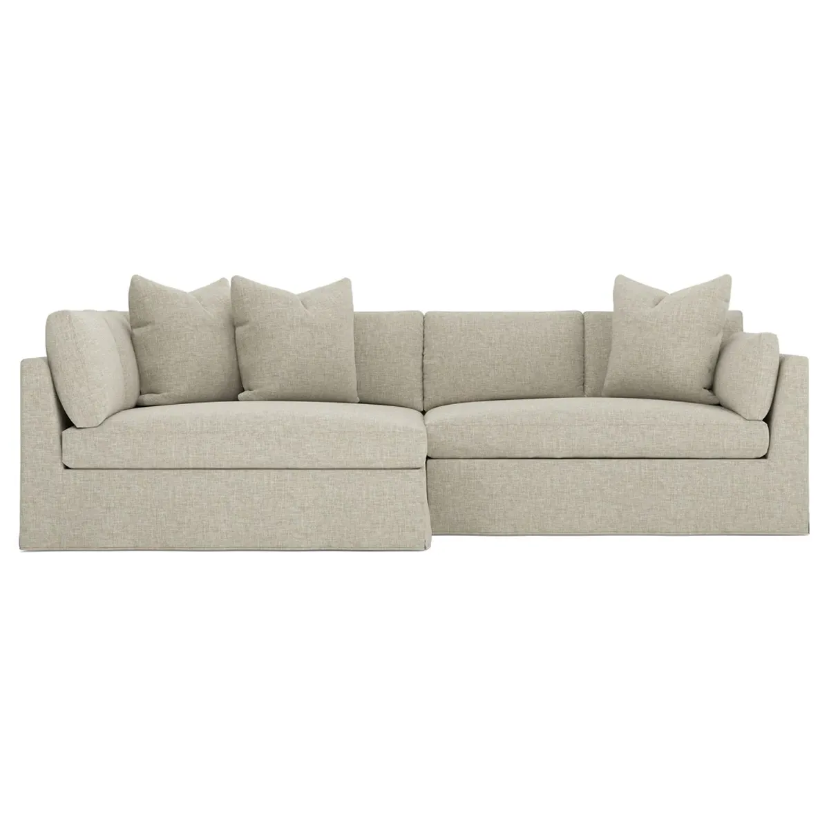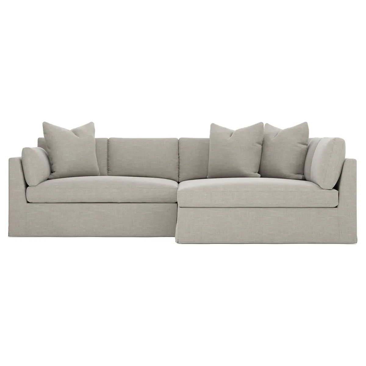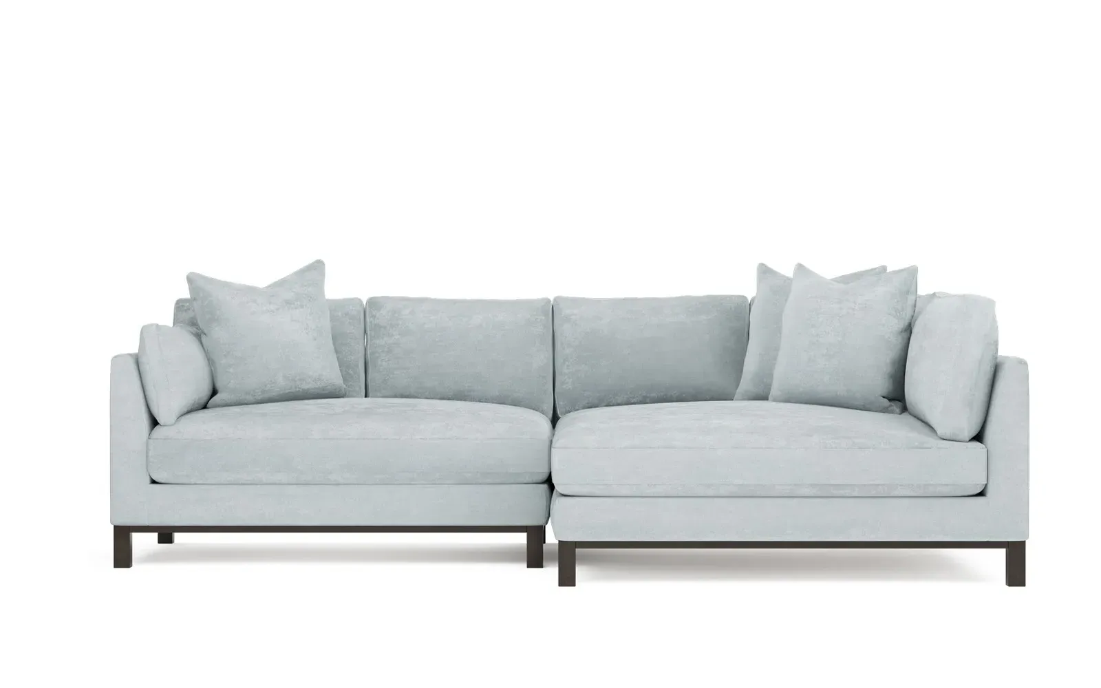 Designed with generous proportions, gently angled arms, and large throw pillows, the left 116” Adelle bumper sectional invites relaxation. A beautiful wood rail grounds the timeless transitional silhouette. Plush, comfortable seating is soft yet supportive, with a foam core surrounded by a blend of fiber, down, and feather fill. Choose from a variety of upholstery options, including linen, velvet, and performance fabrics. <b>Overall Dimensions:</b> 116" W x 61" D x 35" H. <b>Bumper Sofa Dimensions:</b> 58” W x 61” D x 35” H; <b>End Sofa Dimensions:</b> 58” W x 38” D x 35” H; <b>Seat Dimensions:</b> 25” D x 21” H; <b>Arm Height:</b> 28”; <b>Leg Height:</b> 5”. <b>Materials:</b> FSC®-certified, US-sourced, formaldehyde-free solid kiln-dried hardwood and furniture-grade laminates. <b>Material Finish:</b> Espresso legs. <b>Pieces Included:</b> Left bumper sofa, right end sofa.