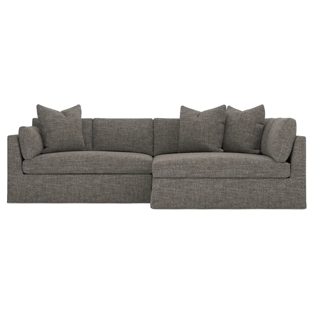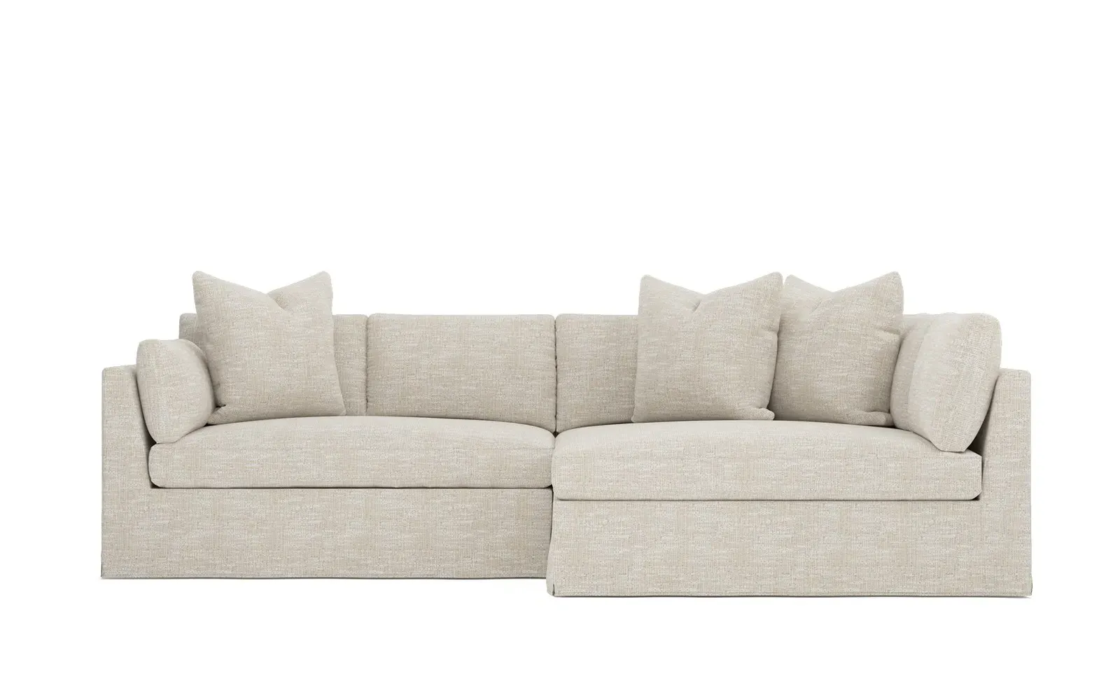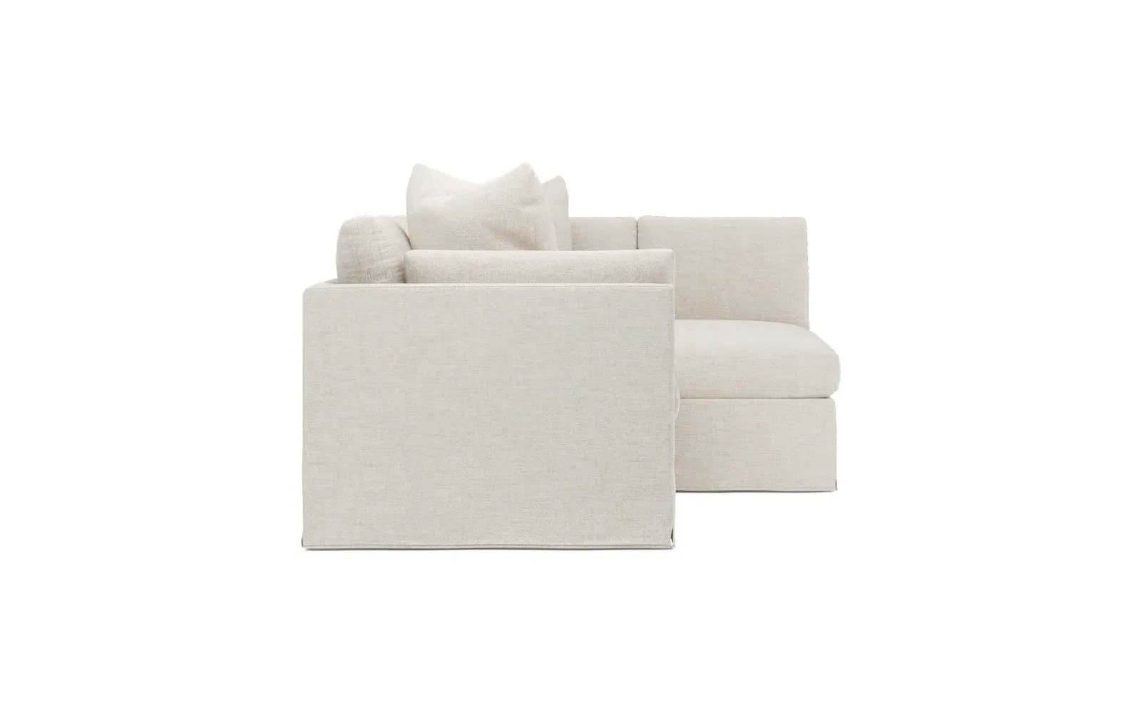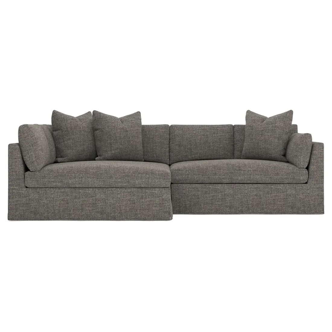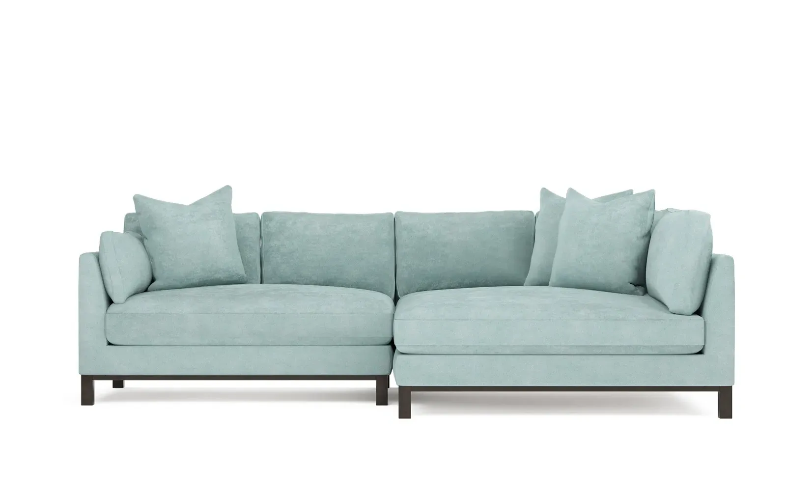 Designed with generous proportions, gently angled arms, and large throw pillows, the left 116” Adelle bumper sectional invites relaxation. A beautiful wood rail grounds the timeless transitional silhouette. Plush, comfortable seating is soft yet supportive, with a foam core surrounded by a blend of fiber, down, and feather fill. Choose from a variety of upholstery options, including linen, velvet, and performance fabrics. <b>Overall Dimensions:</b> 116" W x 61" D x 35" H. <b>Bumper Sofa Dimensions:</b> 58” W x 61” D x 35” H; <b>End Sofa Dimensions:</b> 58” W x 38” D x 35” H; <b>Seat Dimensions:</b> 25” D x 21” H; <b>Arm Height:</b> 28”; <b>Leg Height:</b> 5”. <b>Materials:</b> FSC®-certified, US-sourced, formaldehyde-free solid kiln-dried hardwood and furniture-grade laminates. <b>Material Finish:</b> Espresso legs. <b>Pieces Included:</b> Left bumper sofa, right end sofa.