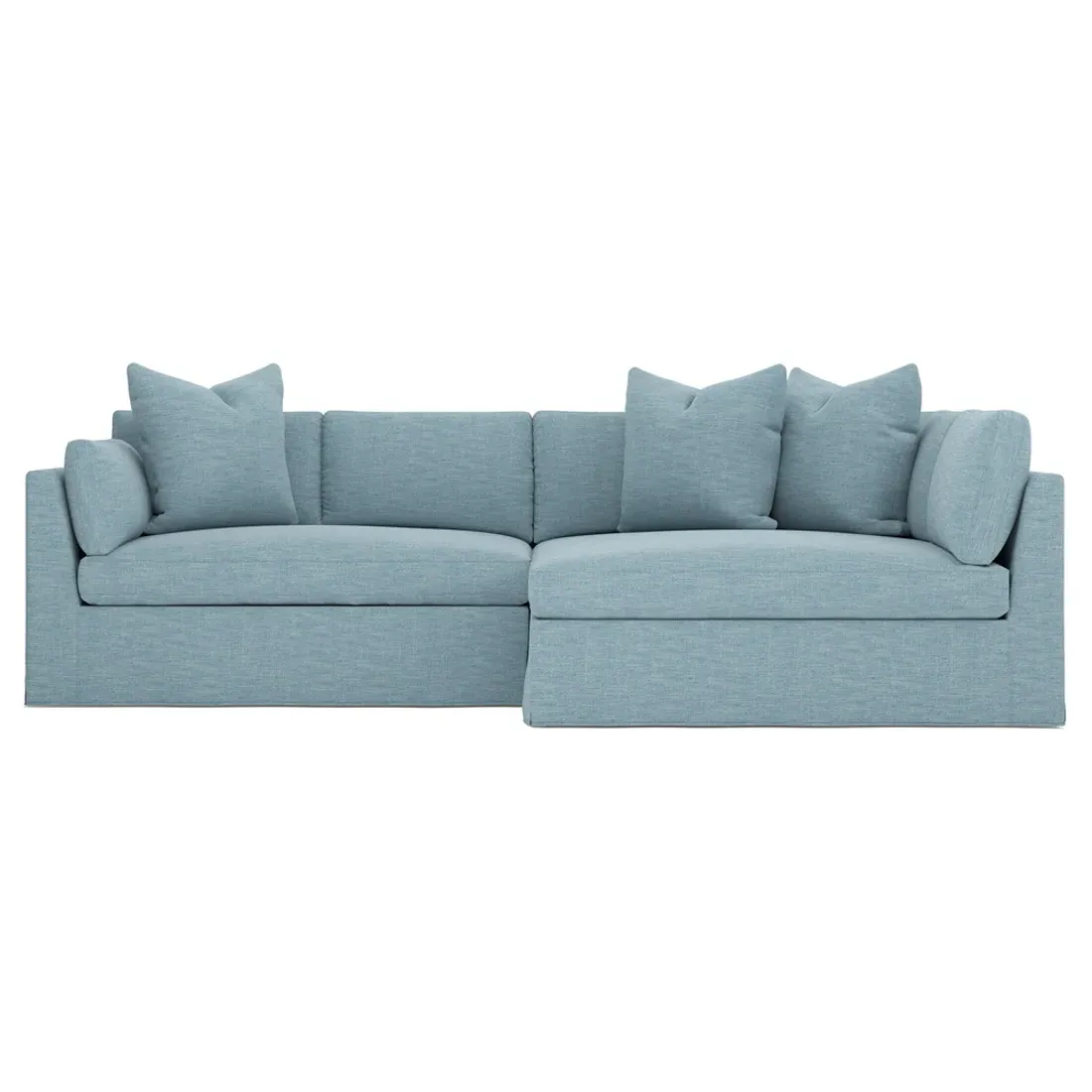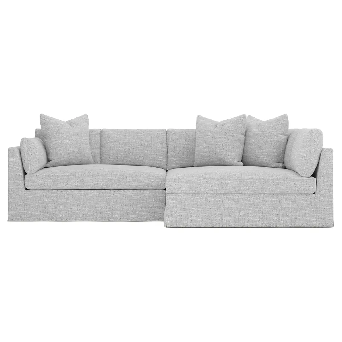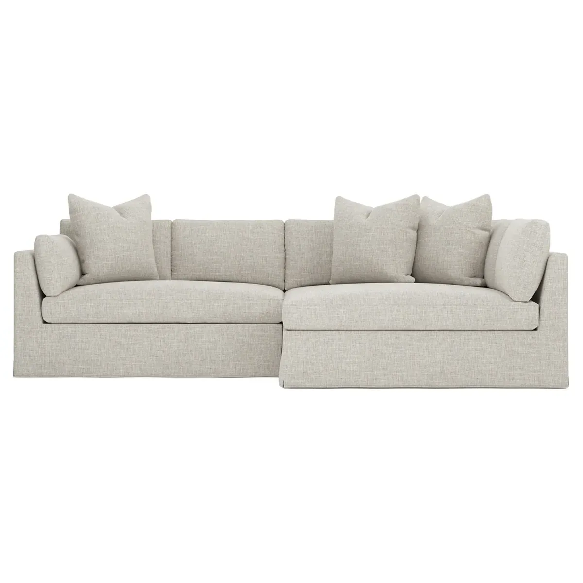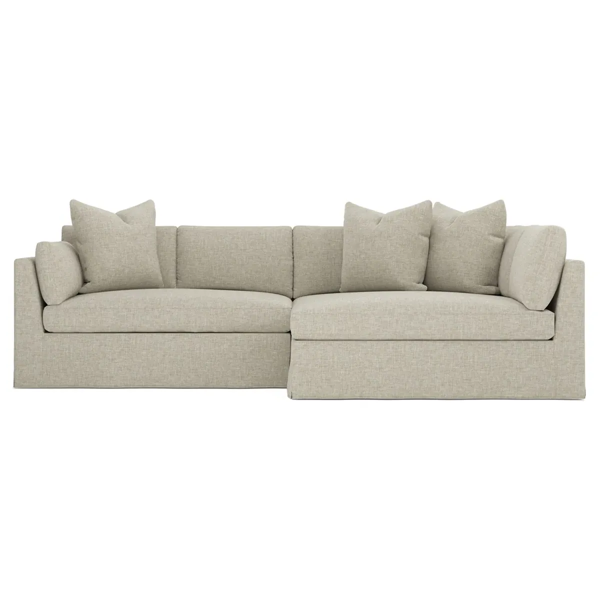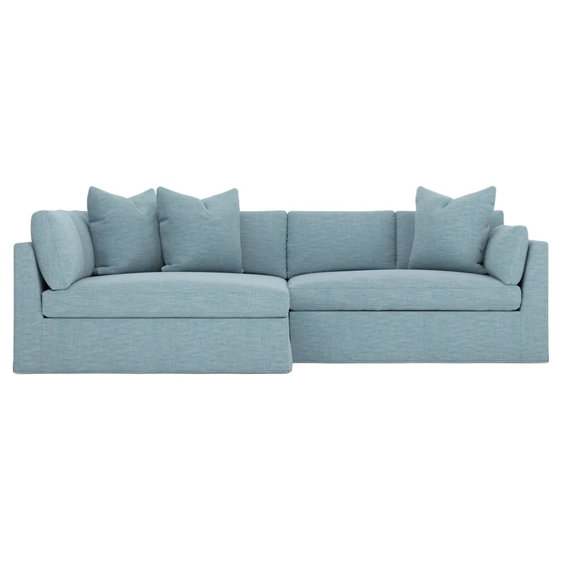 Designed with generous proportions, gently angled arms, and large throw pillows, the left 116” Adelle bumper sectional invites relaxation. A beautiful wood rail grounds the timeless transitional silhouette. Plush, comfortable seating is soft yet supportive, with a foam core surrounded by a blend of fiber, down, and feather fill. Choose from a variety of upholstery options, including linen, velvet, and performance fabrics. <b>Overall Dimensions:</b> 116" W x 61" D x 35" H. <b>Bumper Sofa Dimensions:</b> 58” W x 61” D x 35” H; <b>End Sofa Dimensions:</b> 58” W x 38” D x 35” H; <b>Seat Dimensions:</b> 25” D x 21” H; <b>Arm Height:</b> 28”; <b>Leg Height:</b> 5”. <b>Materials:</b> FSC®-certified, US-sourced, formaldehyde-free solid kiln-dried hardwood and furniture-grade laminates. <b>Material Finish:</b> Espresso legs. <b>Pieces Included:</b> Left bumper sofa, right end sofa.