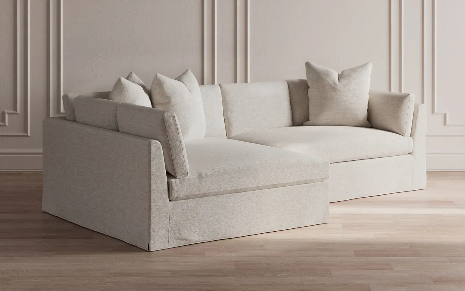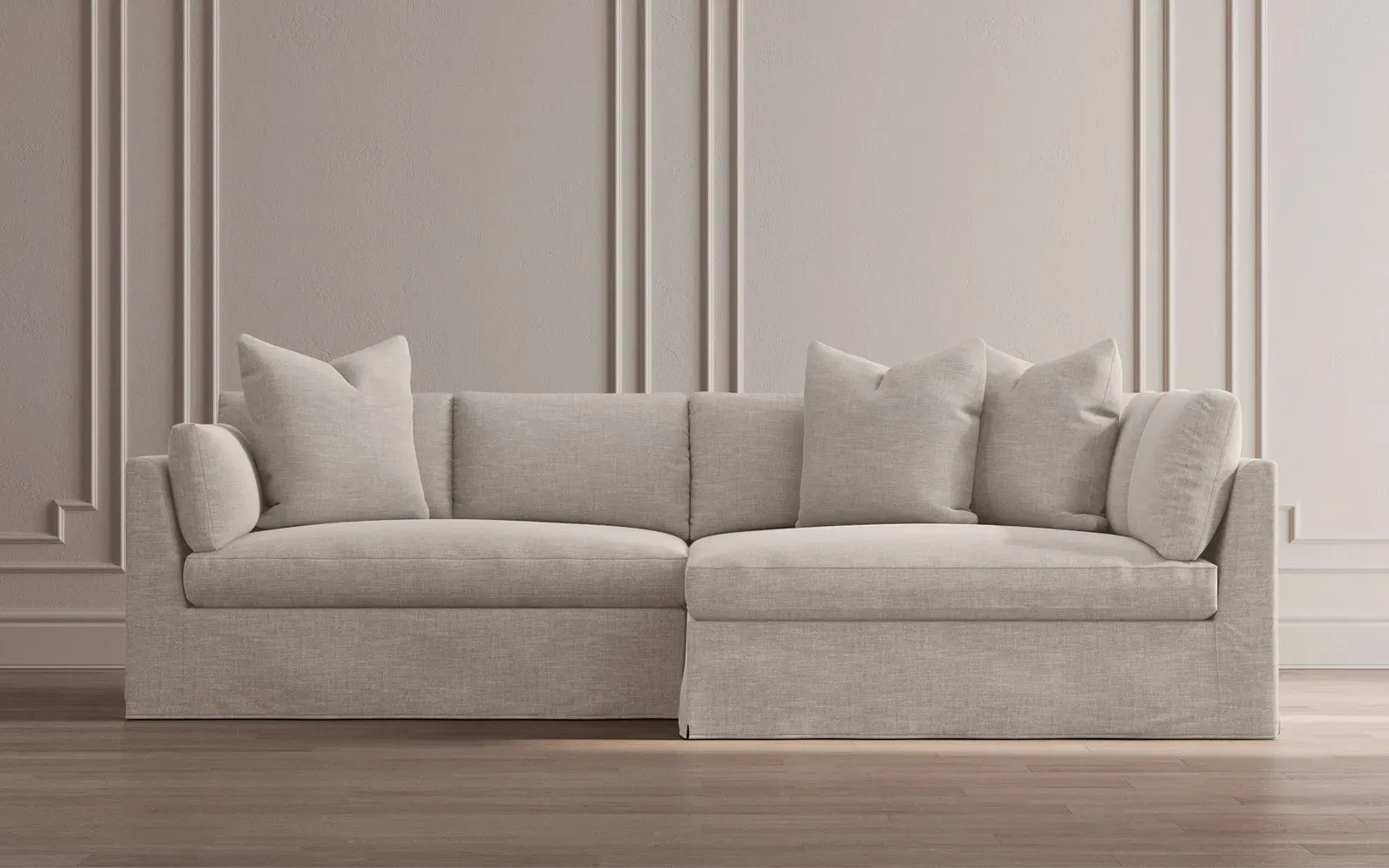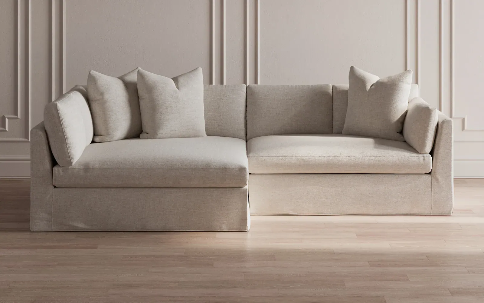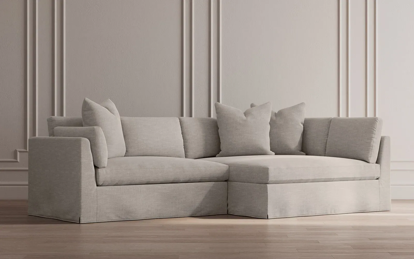 The Adelle sectional sofa offers generous proportions with its gently angled arms and large throw pillows. Its plush seating provides comfort and support, featuring a foam core surrounded by fiber, down, and feather fill. The wood rail grounds the design, while the FSC-certified kiln-dried hardwood frame ensures durability. W295 x D155 x H89 cm.