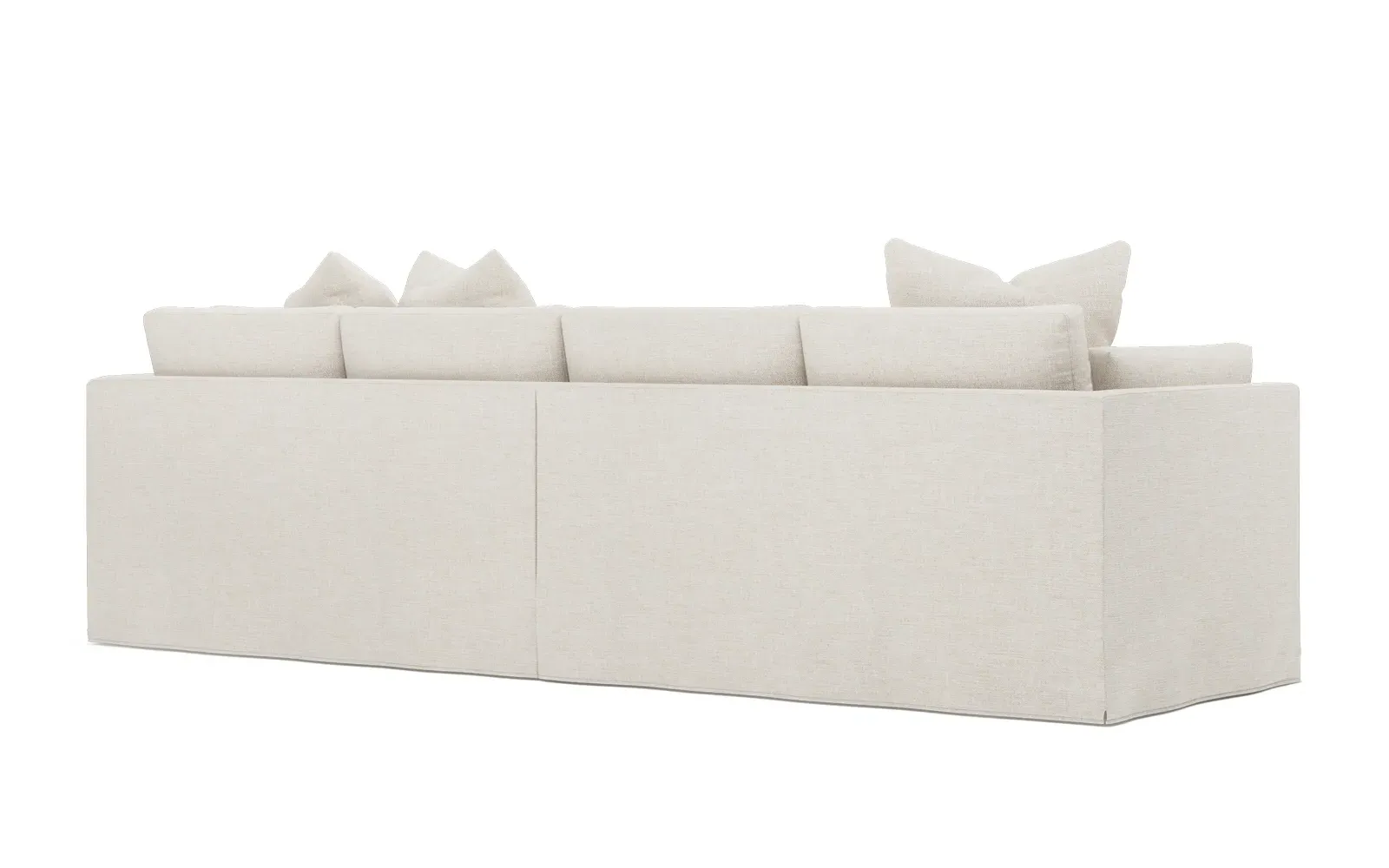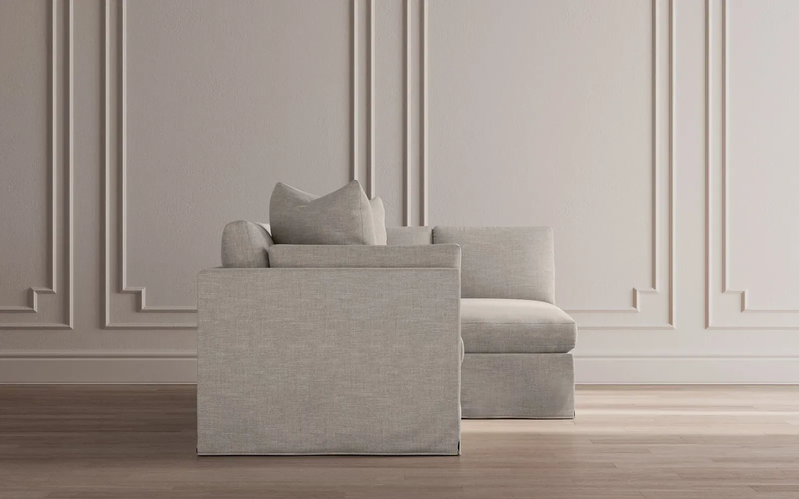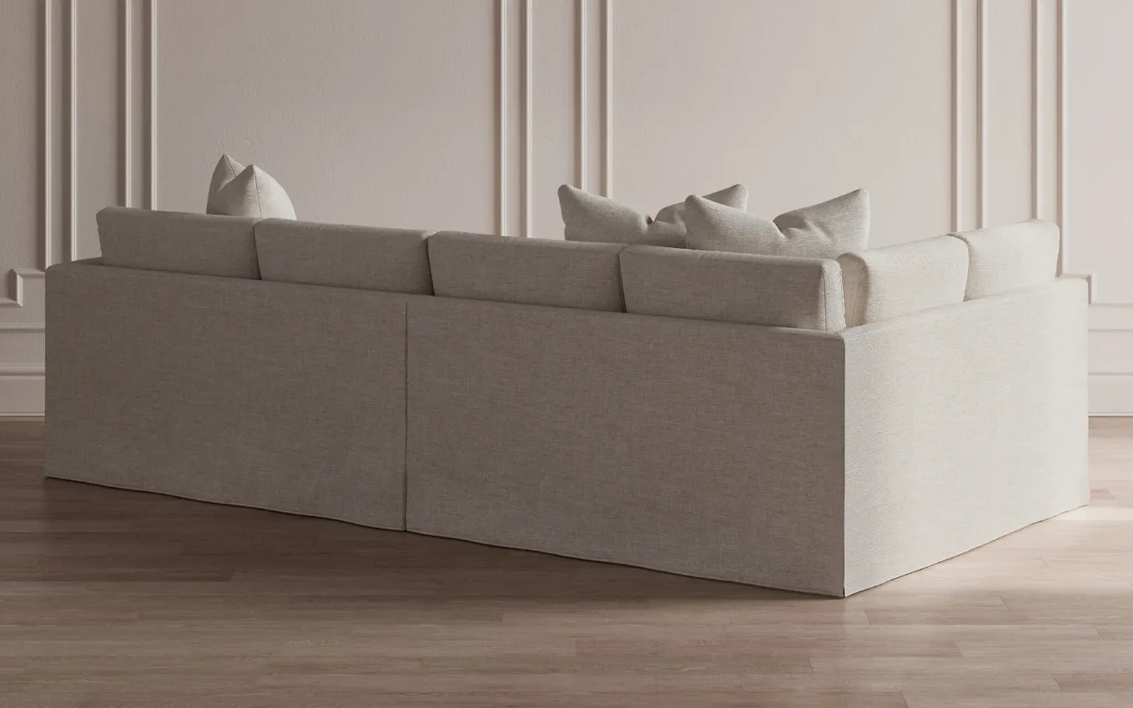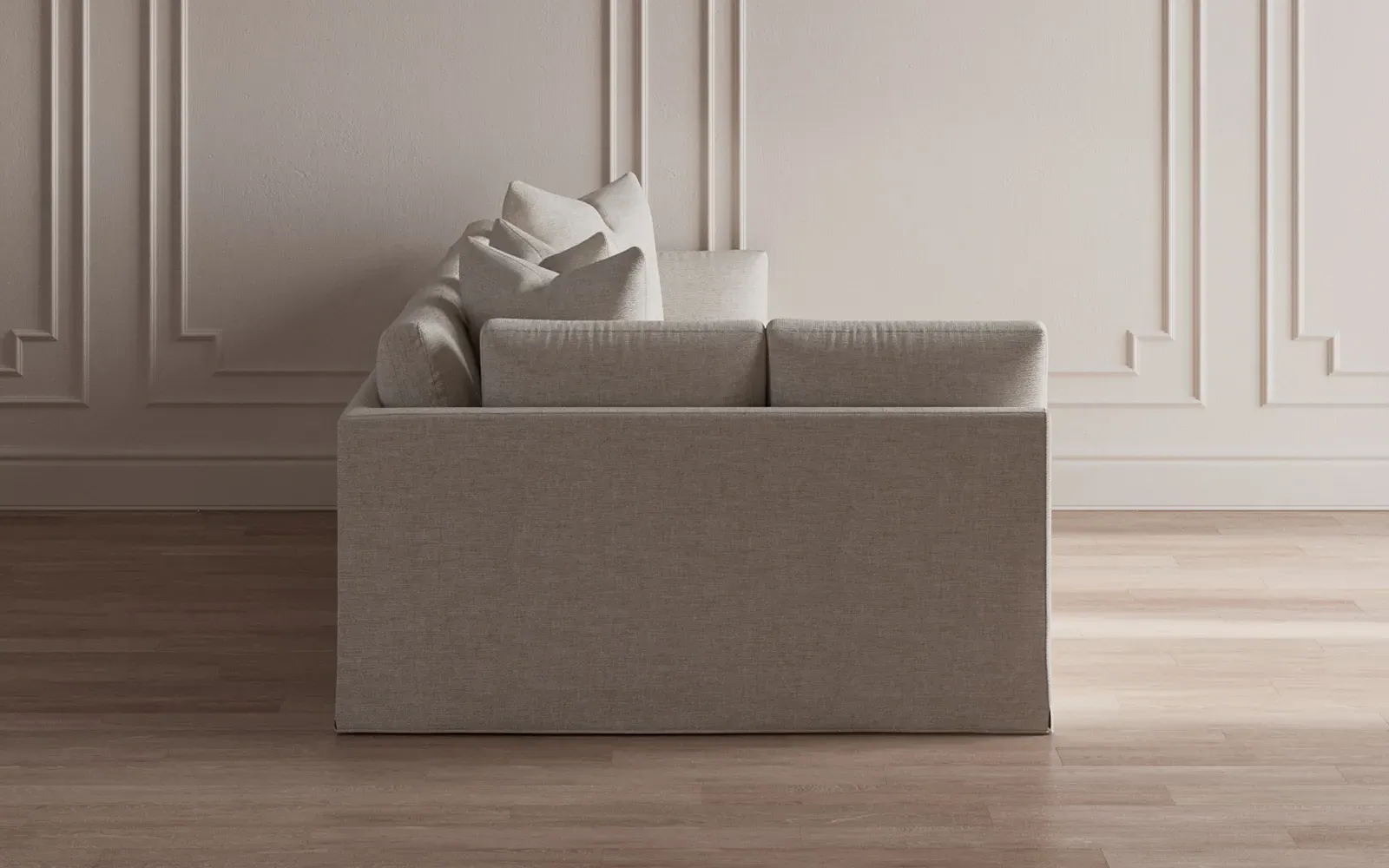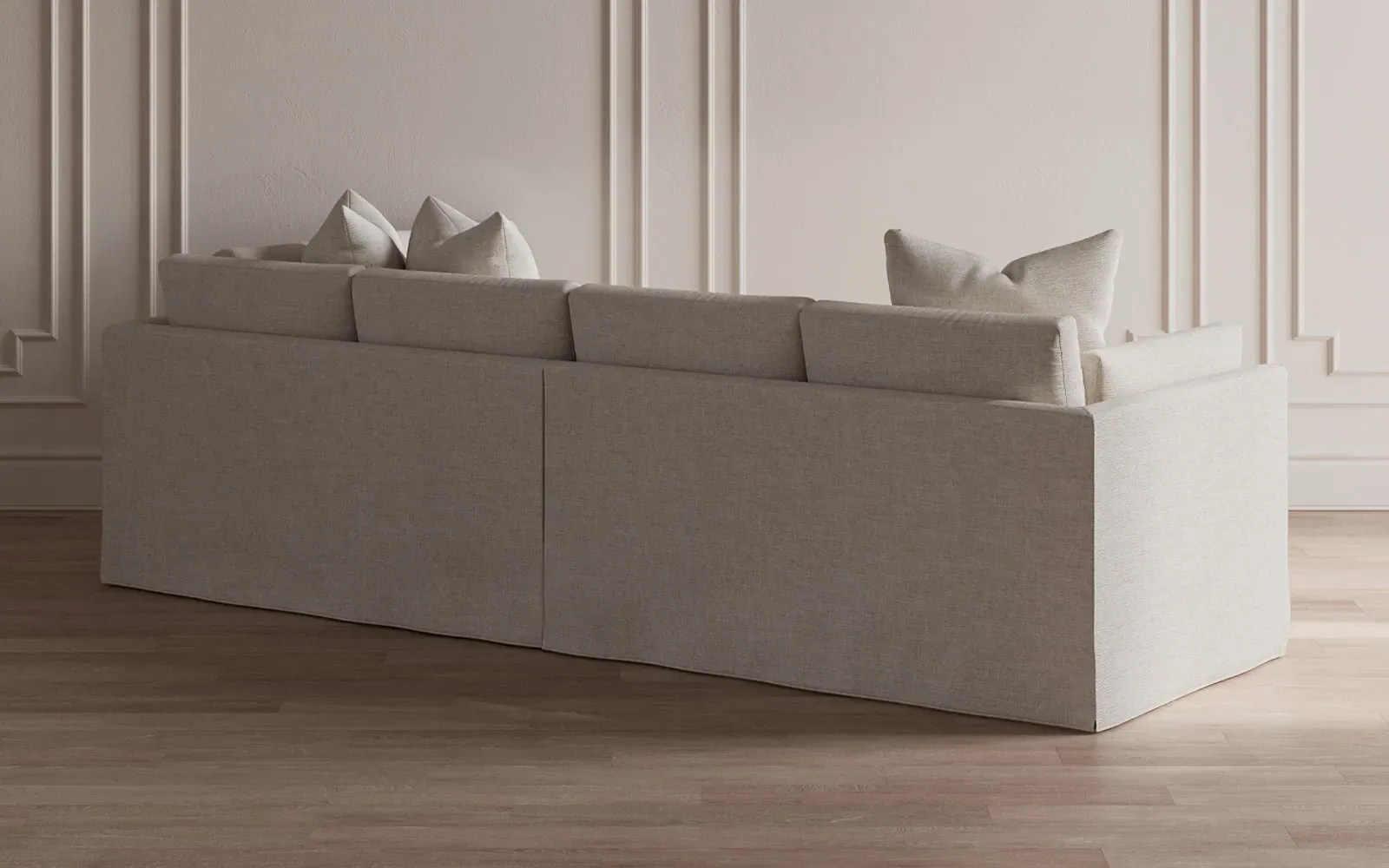 The Adelle sectional sofa offers generous proportions with its gently angled arms and large throw pillows. Its plush seating provides comfort and support, featuring a foam core surrounded by fiber, down, and feather fill. The wood rail grounds the design, while the FSC-certified kiln-dried hardwood frame ensures durability. W295 x D155 x H89 cm.