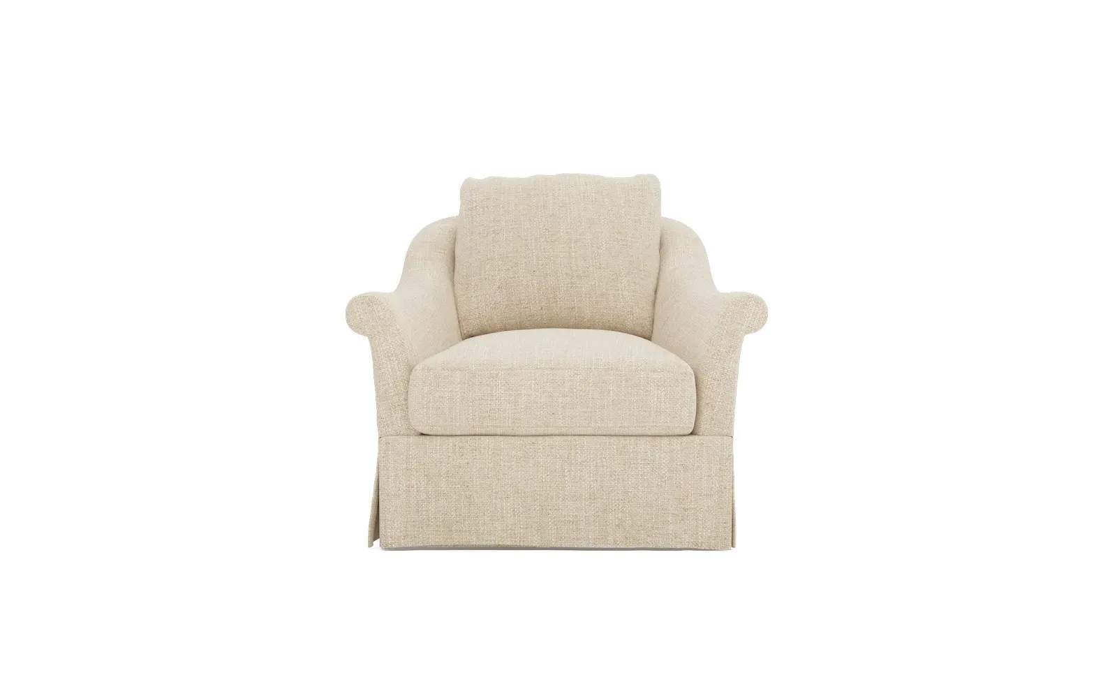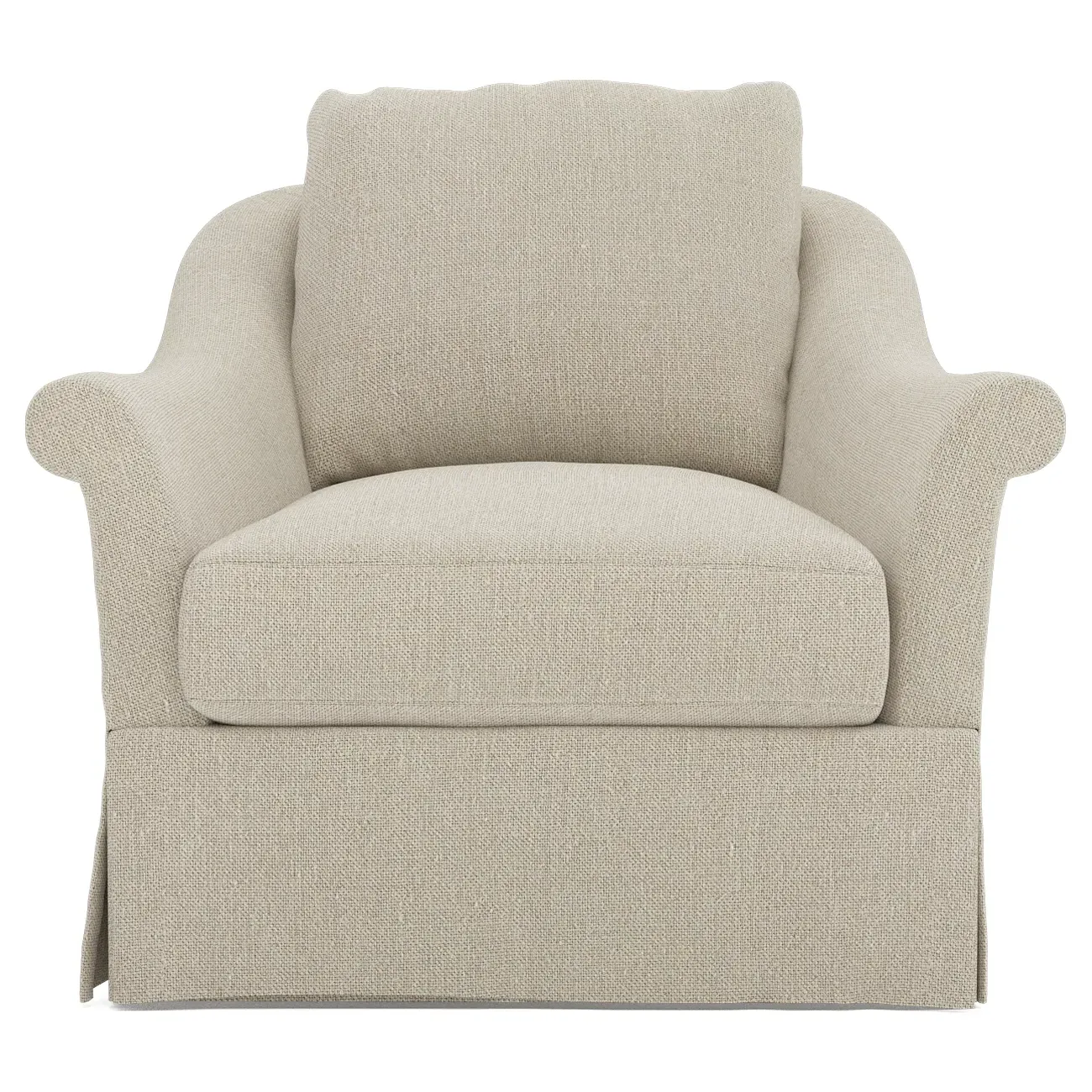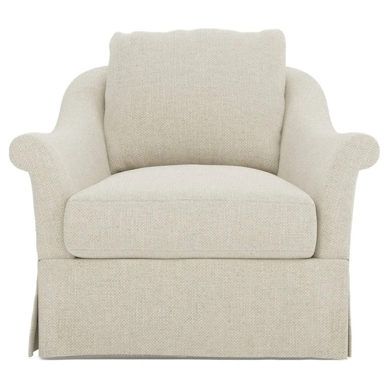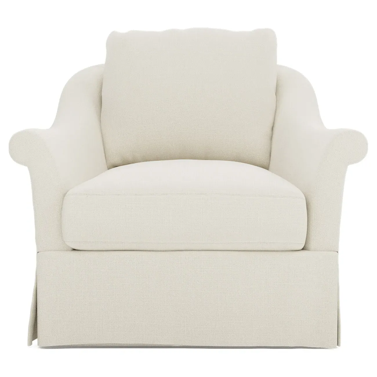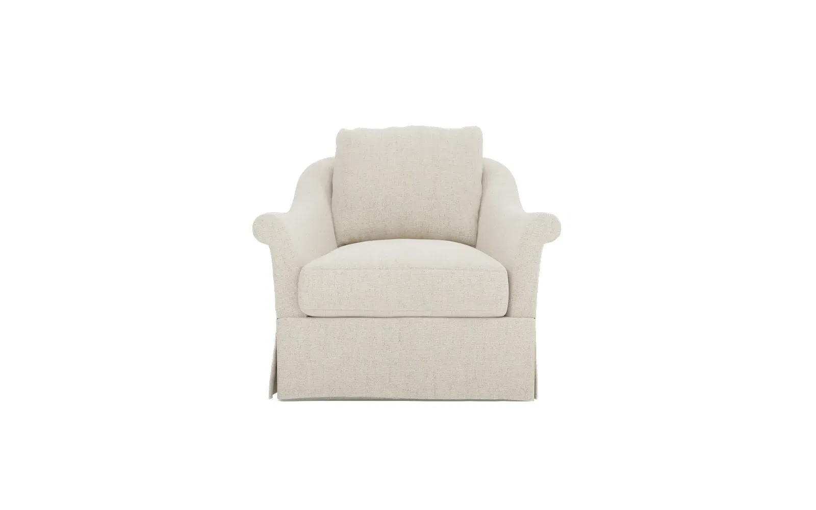 A Kathy Kuo Home exclusive, our Amelie swivel chair exudes timeless elegance with its French-inspired design. The seat cushion offers EXTRAORDINARY COMFORT, with a foam core surrounded by a blend of feathers and duck down. With flared roll arms, a skirted base, and a gently curved, subtly tapered back, the chic silhouette embodies classic sophistication and is beautiful from every angle. Choose from a variety of slipcover options, including linen and performance fabrics. <b>Overall Dimensions:</b> 36" W x 40" D x 31" H. <b>Seat Dimensions:</b> 24" W x 23” D x 18” H; Arm Height: 25”; Back Rail Height: 31”. <b>Materials:</b> Hardwoods and engineered hardwoods from certified sustainable forests, powder-coated steel, recycled fiber, premium soy-based foam, and synthetic fiber. <b>Standard Cushion Fill (Down/Feather):</b> A premium soy-based, high-resiliency foam core is wrapped in an envelope of 90% feather and 10% duck down, then encased in a downproof ticking and sewn into channels to maintain an even sit. Back cushions are filled with a mixture of 90% feather and 10% duck down. <b>Seat Comfort (Down/Feather):</b> This cushion fill creates the plush yet supportive sit we love. Cushions with feather and down fill require regular fluffing and rotating to maintain their shape.