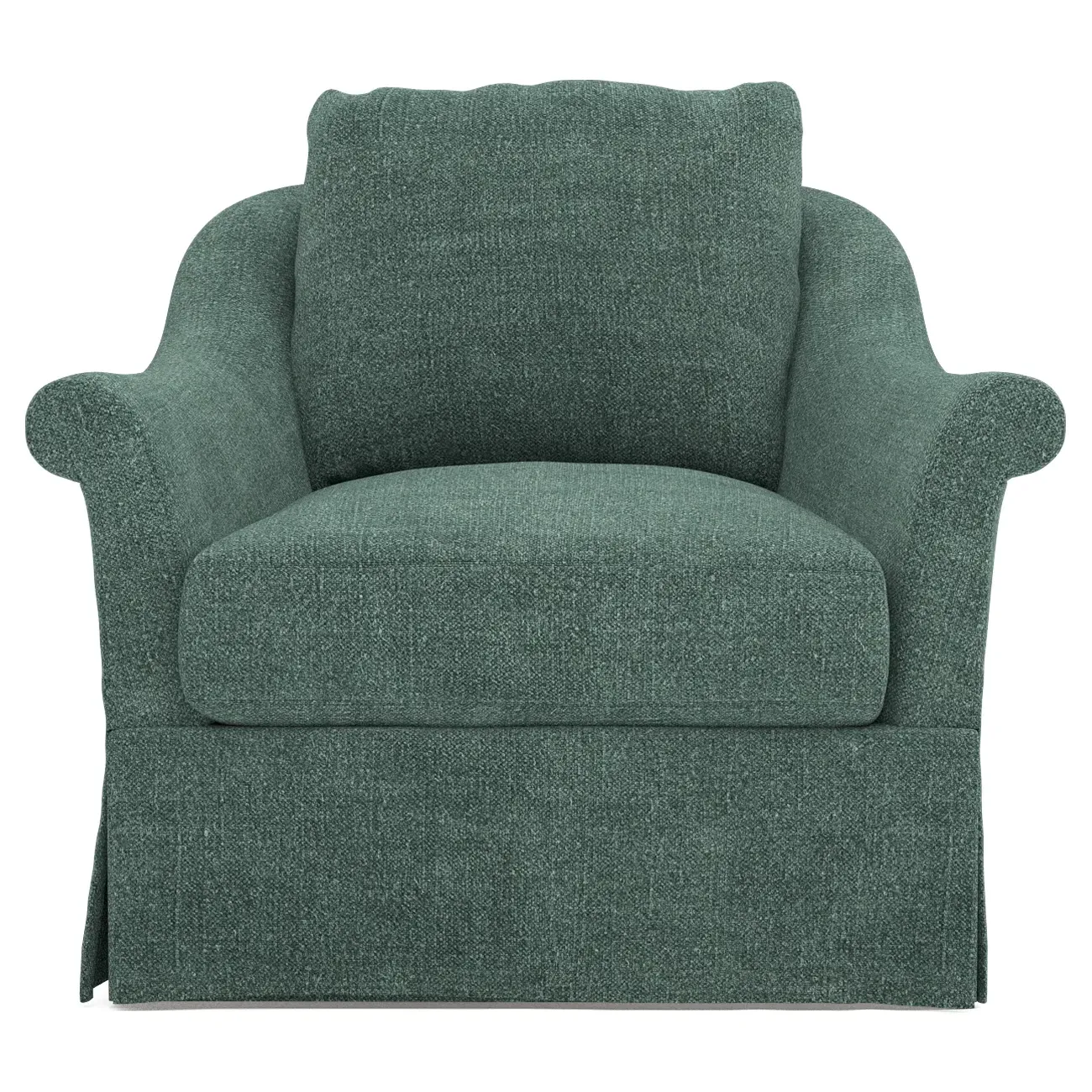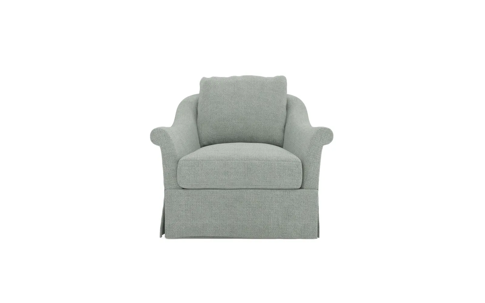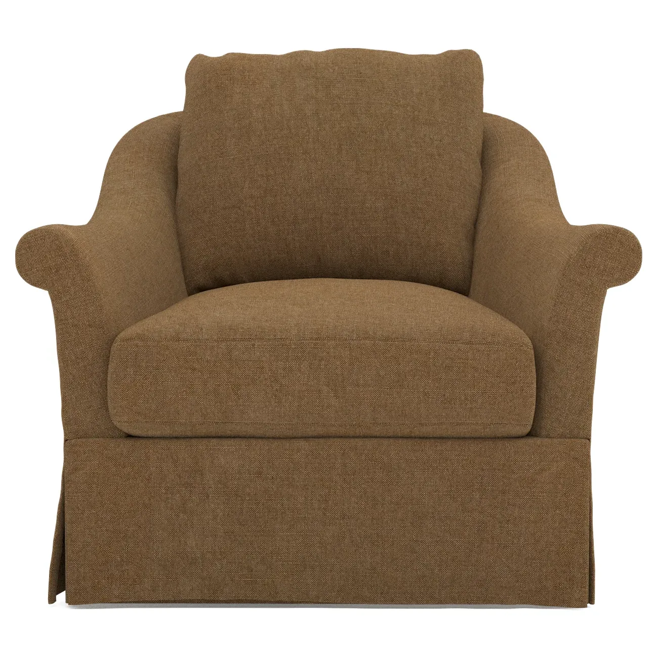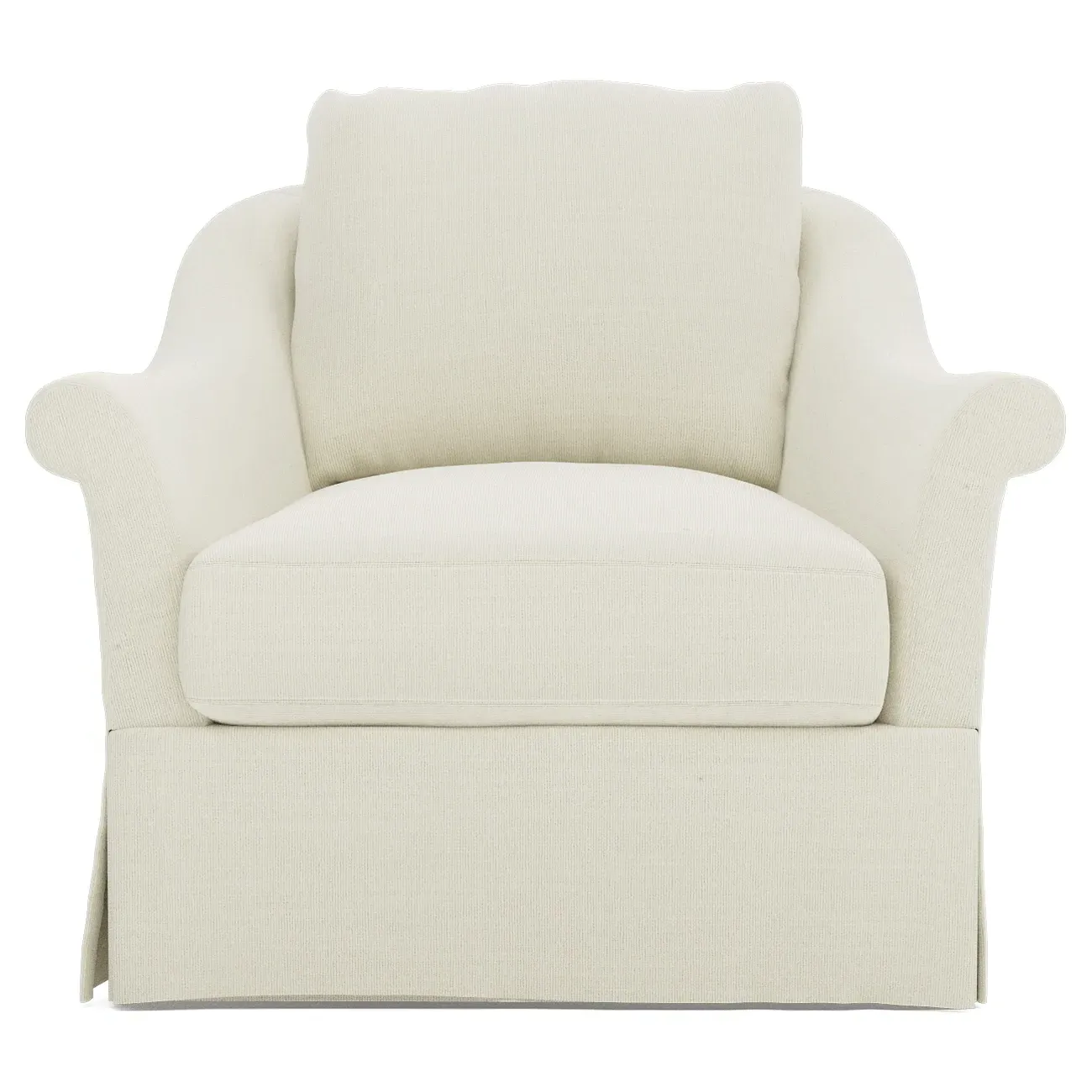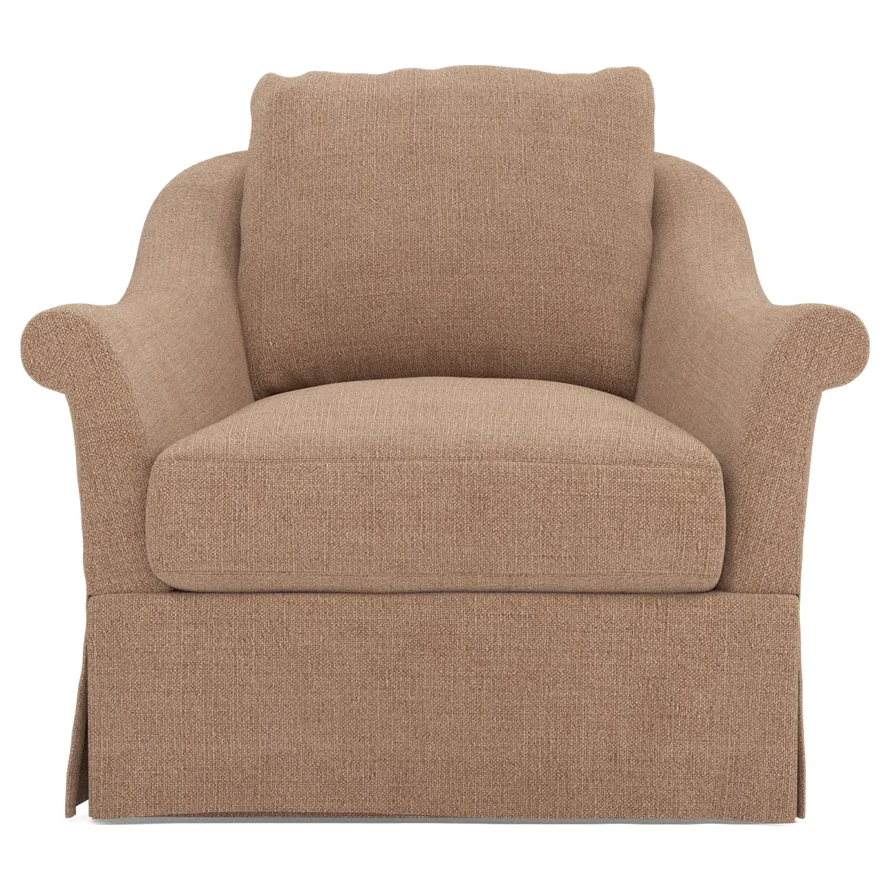 A Kathy Kuo Home exclusive, our Amelie swivel chair exudes timeless elegance with its French-inspired design. The seat cushion offers EXTRAORDINARY COMFORT, with a foam core surrounded by a blend of feathers and duck down. With flared roll arms, a skirted base, and a gently curved, subtly tapered back, the chic silhouette embodies classic sophistication and is beautiful from every angle. Choose from a variety of slipcover options, including linen and performance fabrics. <b>Overall Dimensions:</b> 36" W x 40" D x 31" H. <b>Seat Dimensions:</b> 24" W x 23” D x 18” H; Arm Height: 25”; Back Rail Height: 31”. <b>Materials:</b> Hardwoods and engineered hardwoods from certified sustainable forests, powder-coated steel, recycled fiber, premium soy-based foam, and synthetic fiber. <b>Standard Cushion Fill (Down/Feather):</b> A premium soy-based, high-resiliency foam core is wrapped in an envelope of 90% feather and 10% duck down, then encased in a downproof ticking and sewn into channels to maintain an even sit. Back cushions are filled with a mixture of 90% feather and 10% duck down. <b>Seat Comfort (Down/Feather):</b> This cushion fill creates the plush yet supportive sit we love. Cushions with feather and down fill require regular fluffing and rotating to maintain their shape.