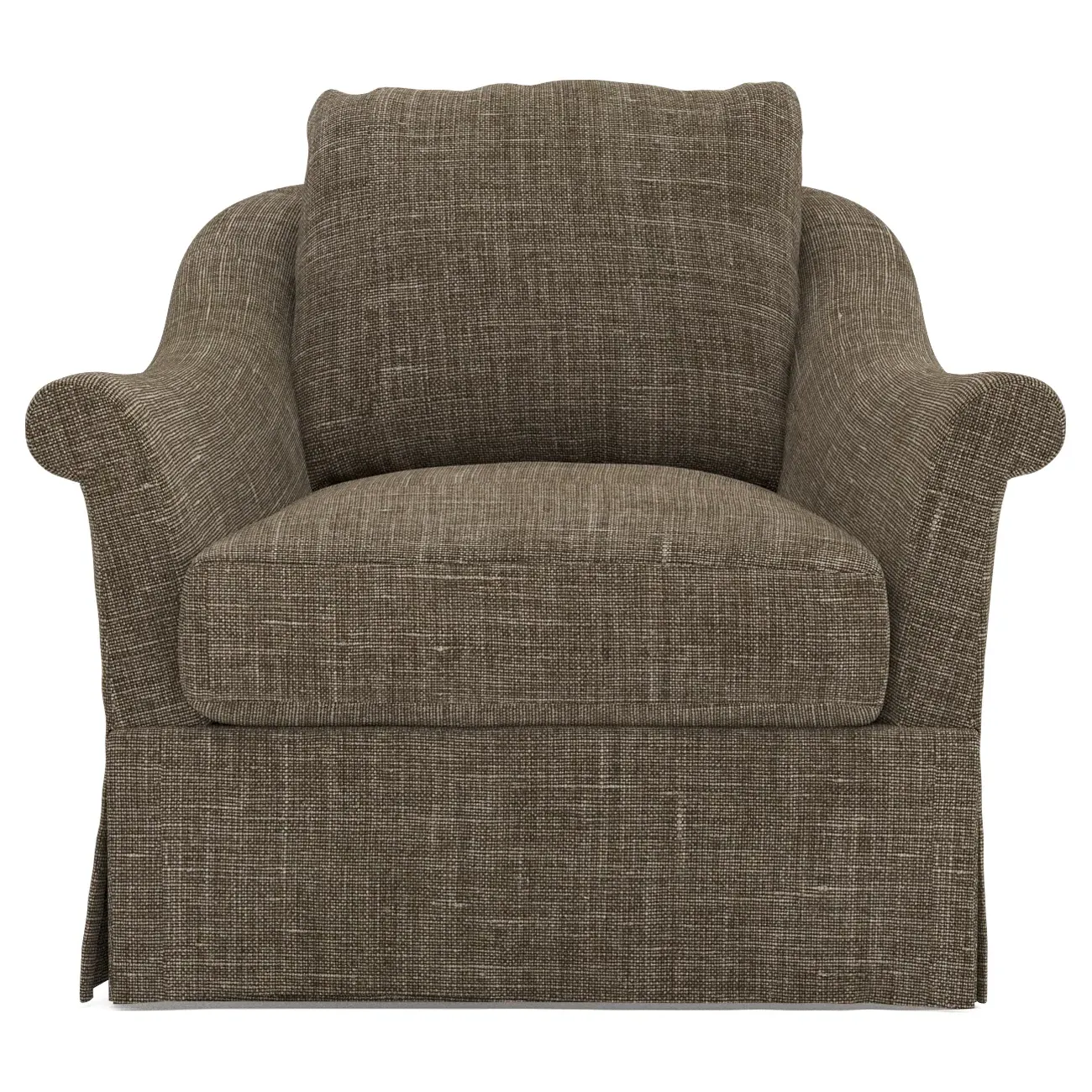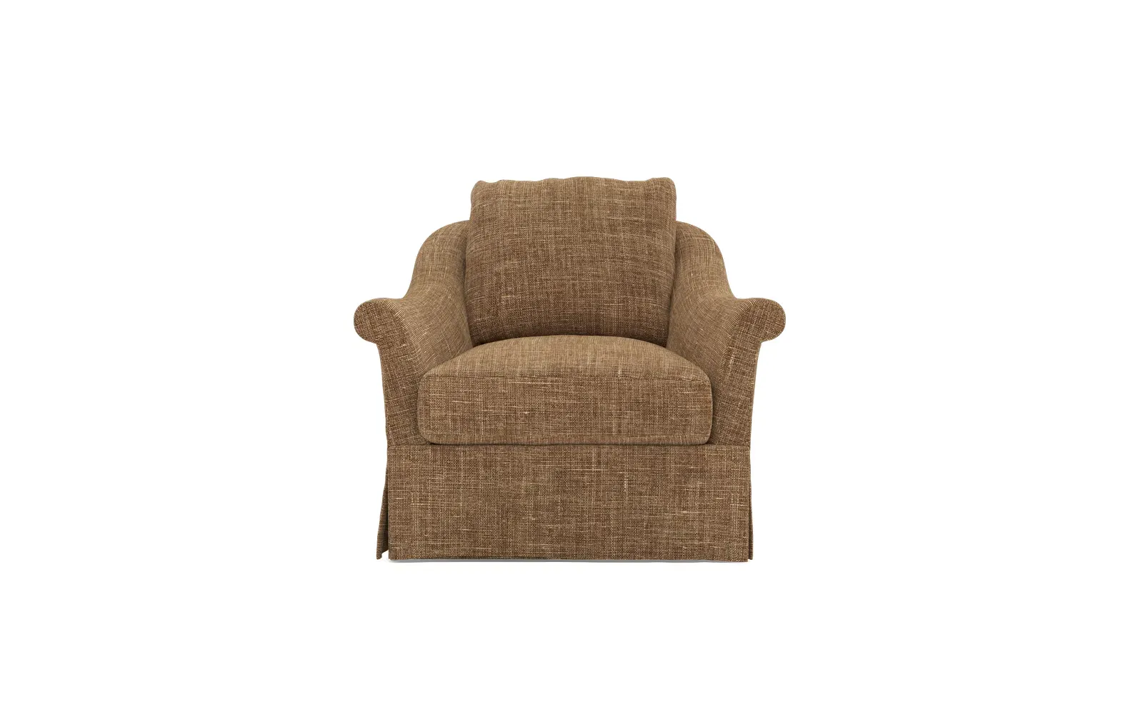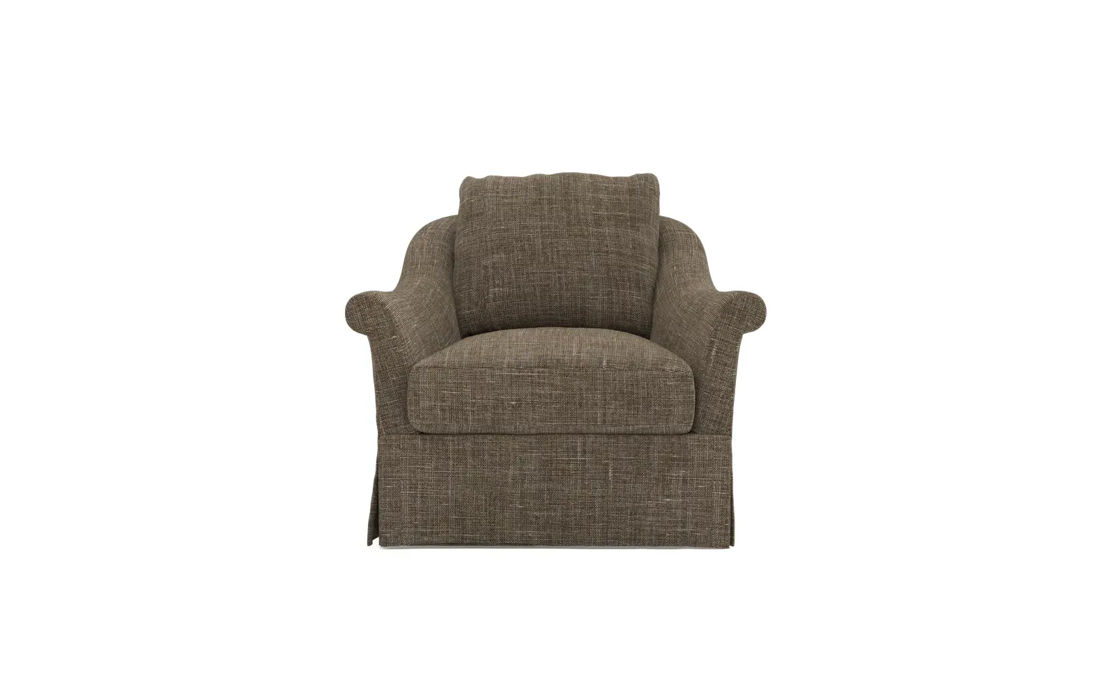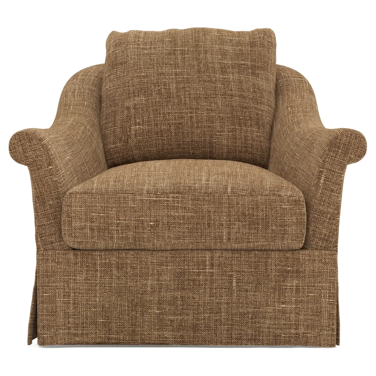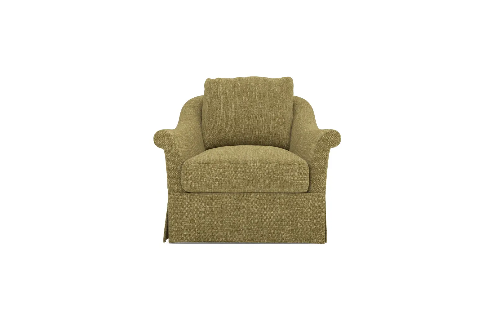 A Kathy Kuo Home exclusive, our Amelie swivel chair exudes timeless elegance with its French-inspired design. The seat cushion offers EXTRAORDINARY COMFORT, with a foam core surrounded by a blend of feathers and duck down. With flared roll arms, a skirted base, and a gently curved, subtly tapered back, the chic silhouette embodies classic sophistication and is beautiful from every angle. Choose from a variety of slipcover options, including linen and performance fabrics. <b>Overall Dimensions:</b> 36" W x 40" D x 31" H. <b>Seat Dimensions:</b> 24" W x 23” D x 18” H; Arm Height: 25”; Back Rail Height: 31”. <b>Materials:</b> Hardwoods and engineered hardwoods from certified sustainable forests, powder-coated steel, recycled fiber, premium soy-based foam, and synthetic fiber. <b>Standard Cushion Fill (Down/Feather):</b> A premium soy-based, high-resiliency foam core is wrapped in an envelope of 90% feather and 10% duck down, then encased in a downproof ticking and sewn into channels to maintain an even sit. Back cushions are filled with a mixture of 90% feather and 10% duck down. <b>Seat Comfort (Down/Feather):</b> This cushion fill creates the plush yet supportive sit we love. Cushions with feather and down fill require regular fluffing and rotating to maintain their shape.
