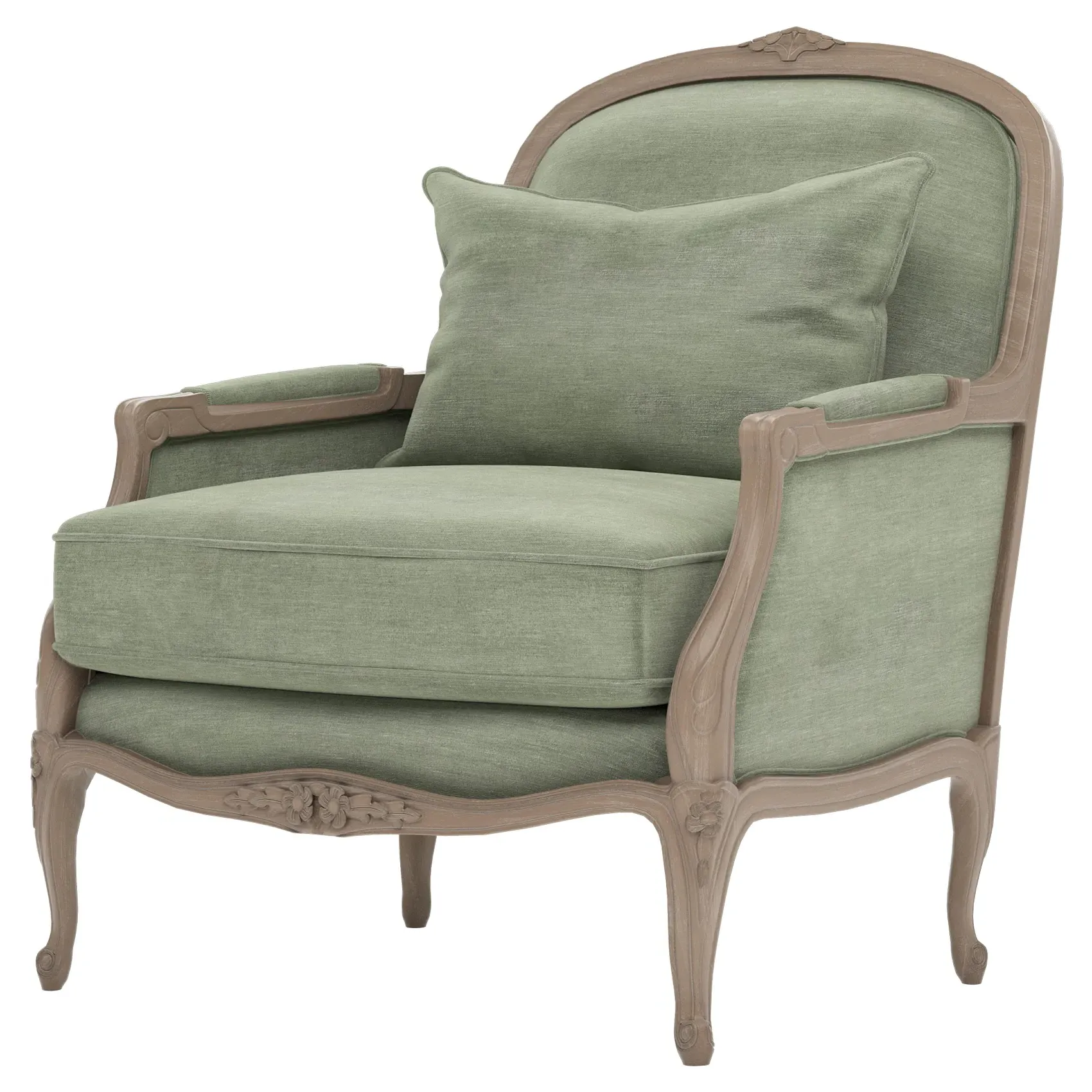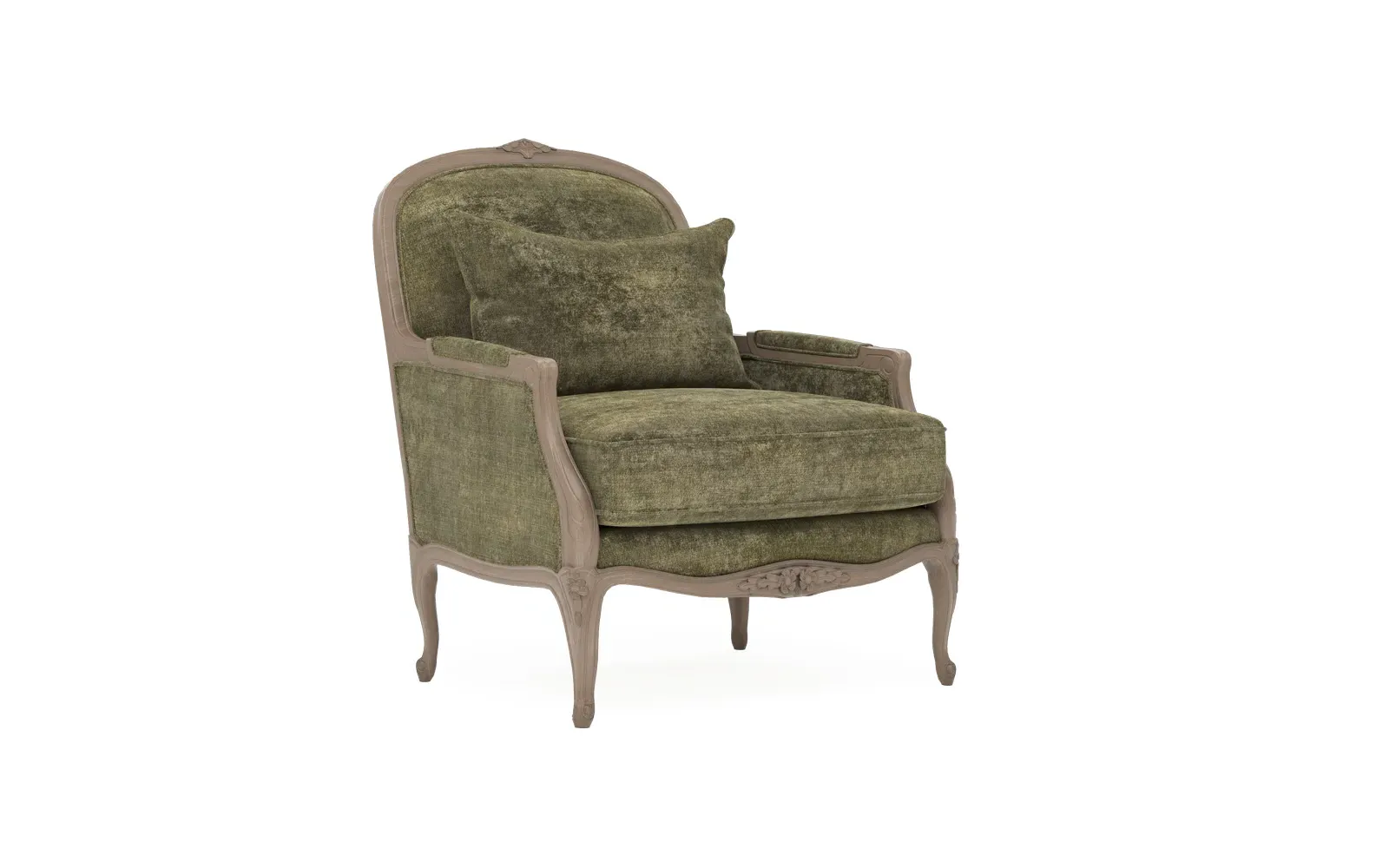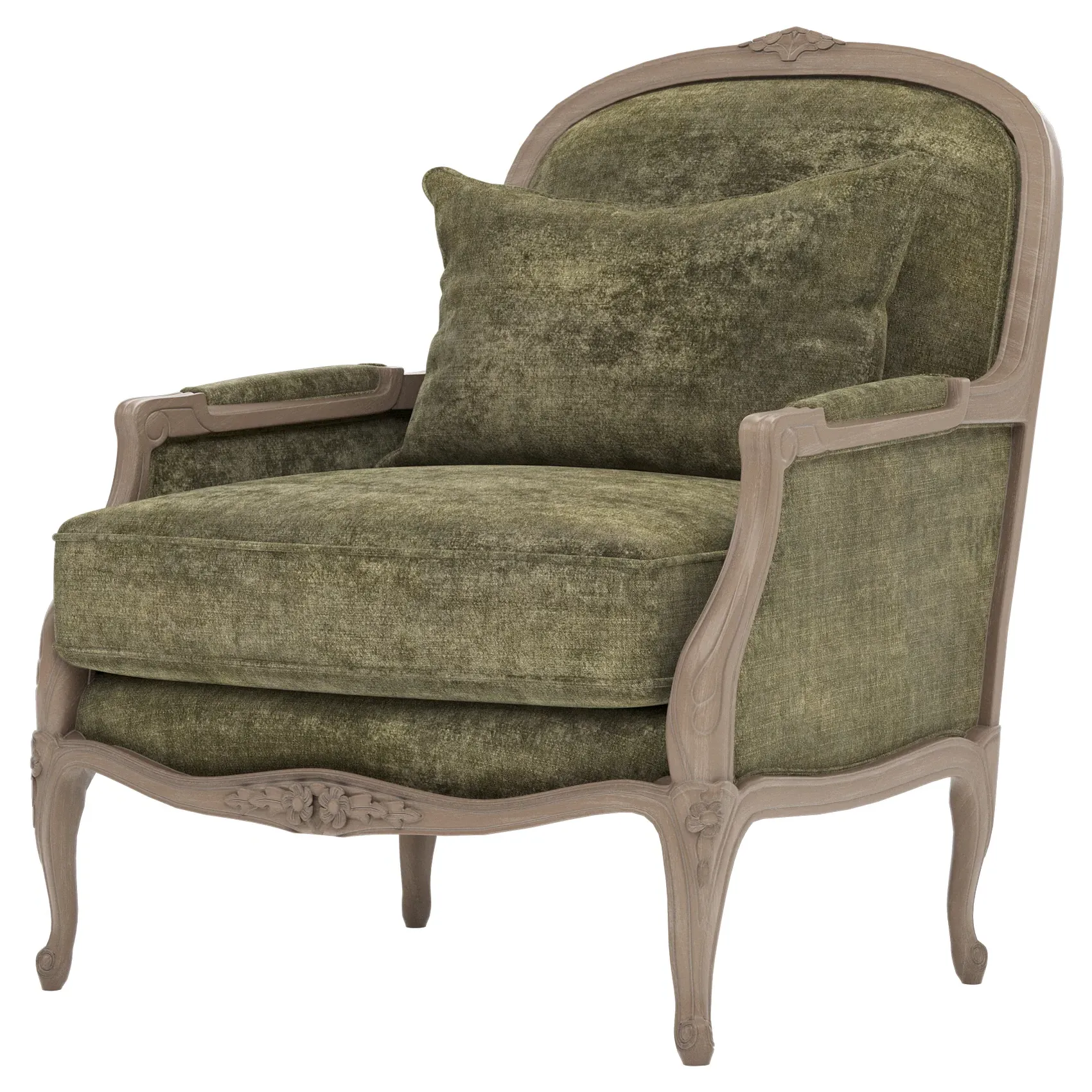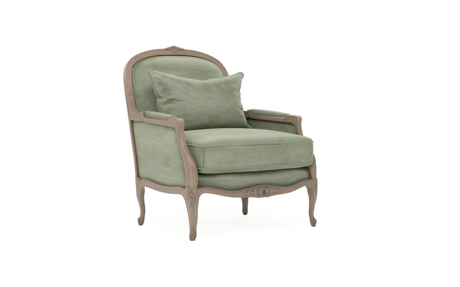 The Antoinette Bergere Chair combines traditional French styling with willow green velvet upholstery and a driftwood hardwood frame. Its CertiPUR-US certified foam core provides high-resiliency support, while the convoluted foam layer and channeled downproof jacket filled with polyester fiber and feather-down blend ensures lasting comfort. The hardwood construction with driftwood finish adds durability and natural appeal. W89 x D91 x H104 cm.