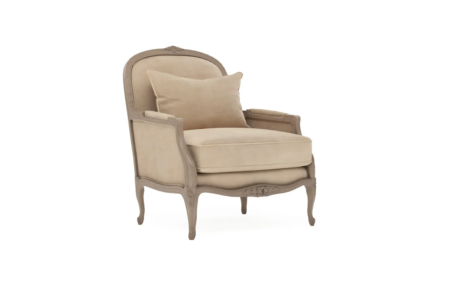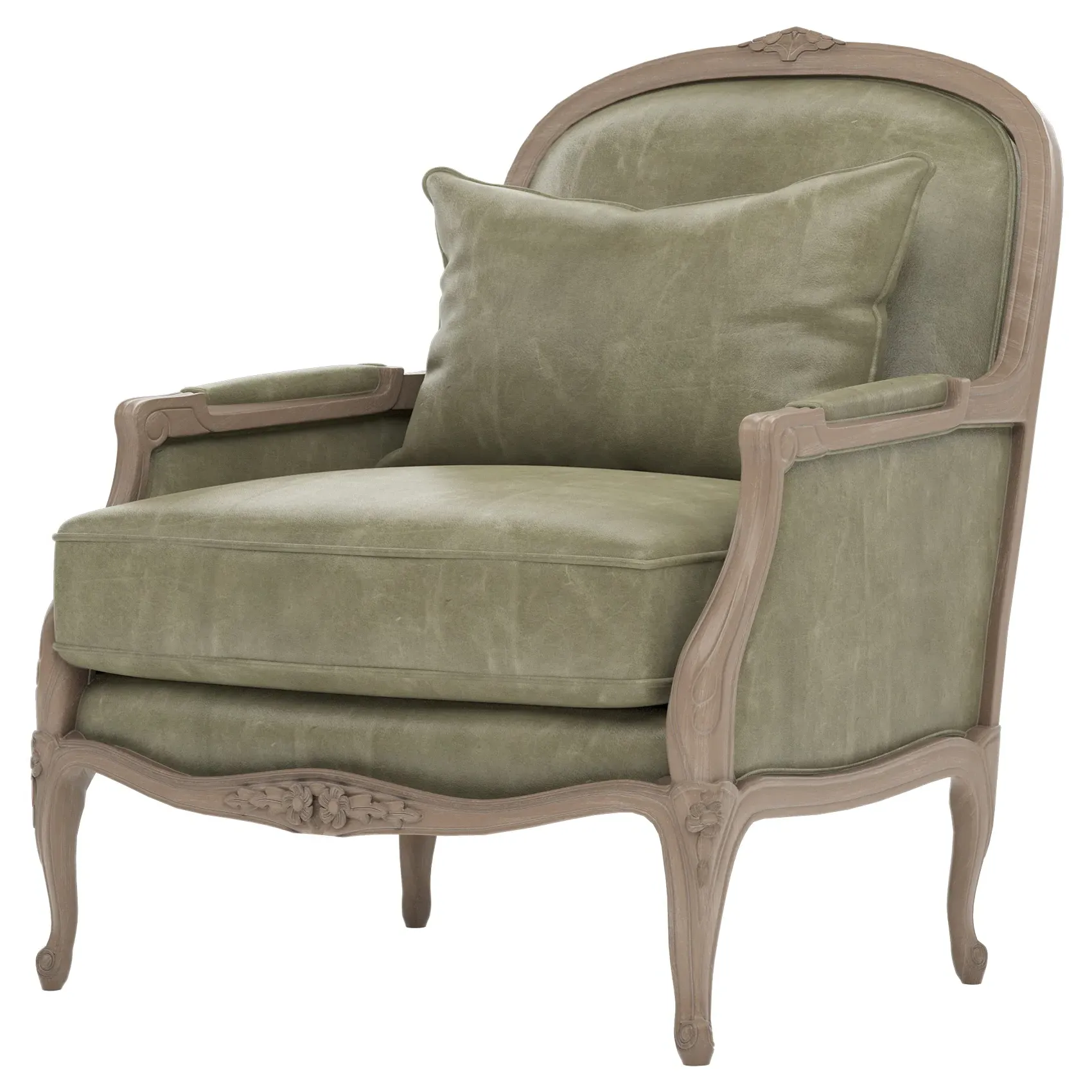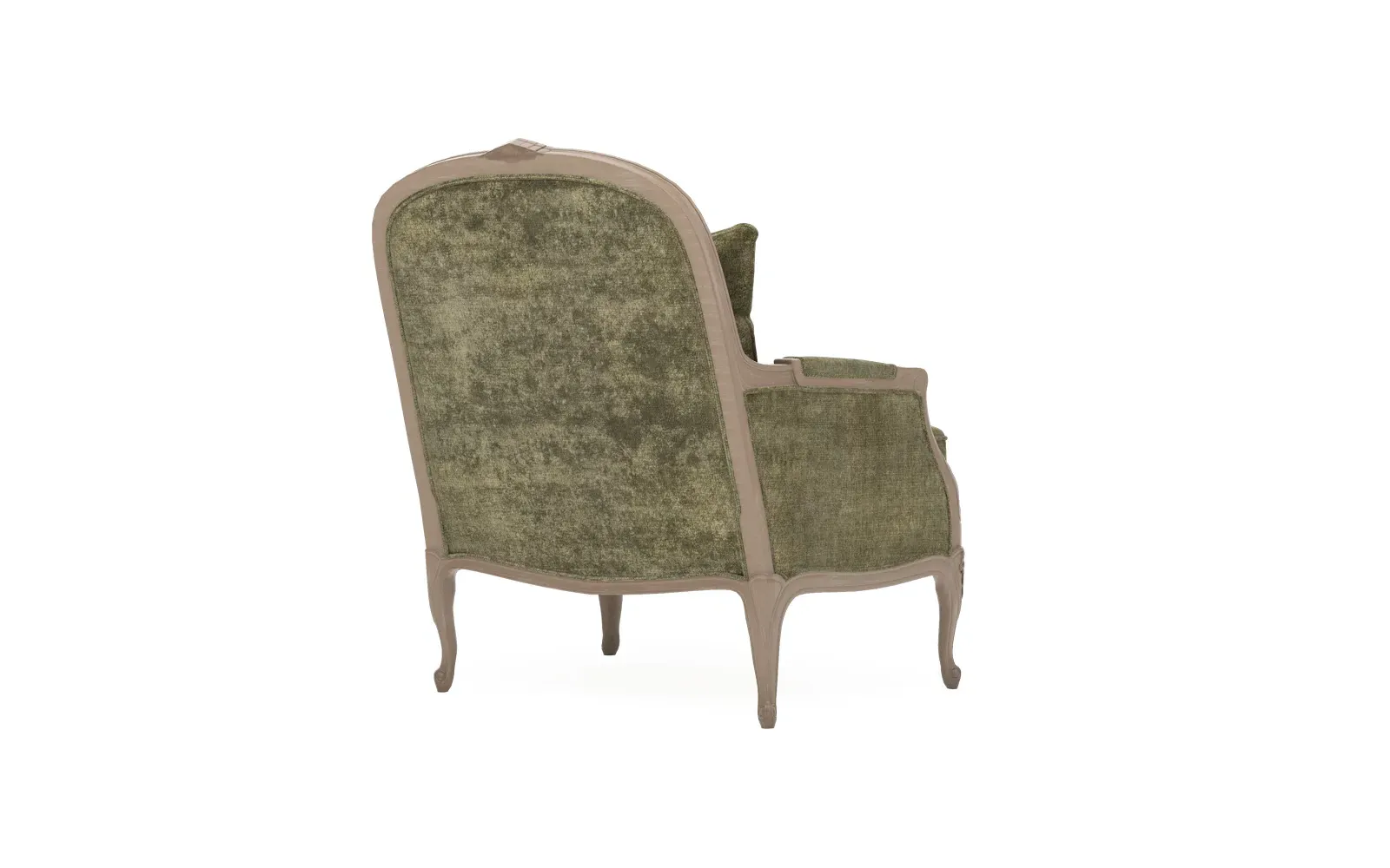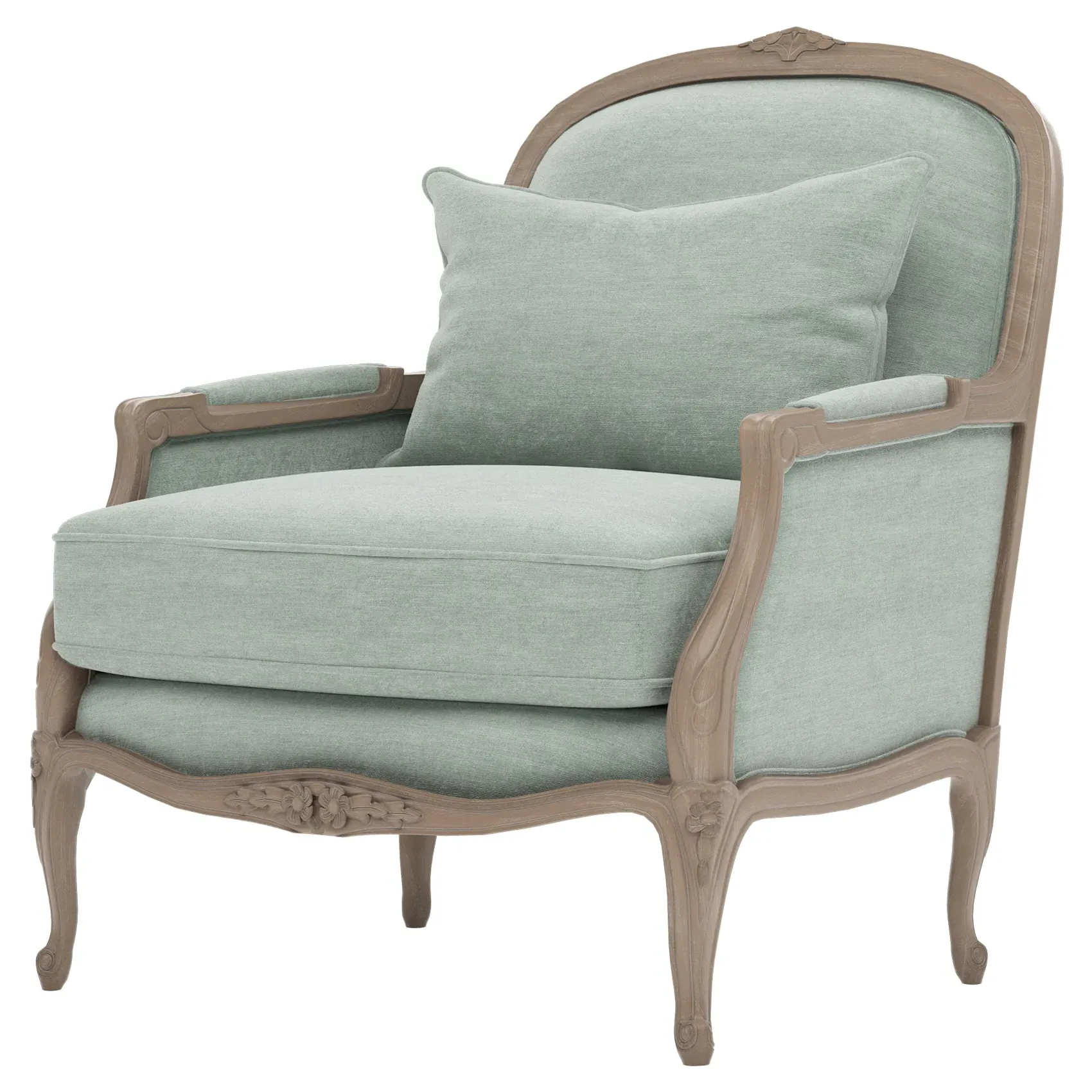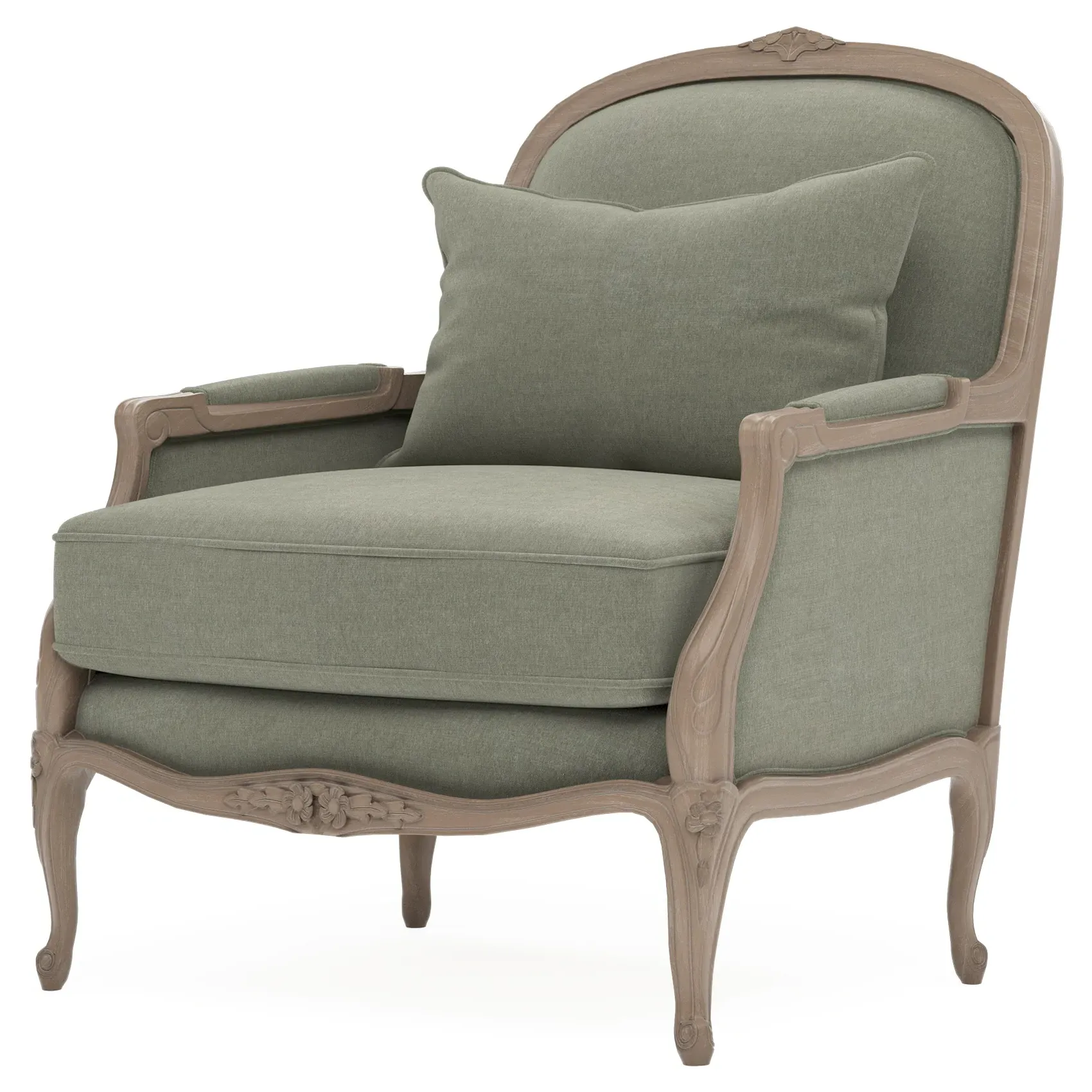 The Antoinette Bergere Chair combines traditional French styling with willow green velvet upholstery and a driftwood hardwood frame. Its CertiPUR-US certified foam core provides high-resiliency support, while the convoluted foam layer and channeled downproof jacket filled with polyester fiber and feather-down blend ensures lasting comfort. The hardwood construction with driftwood finish adds durability and natural appeal. W89 x D91 x H104 cm.