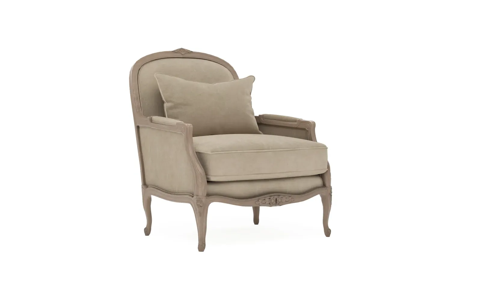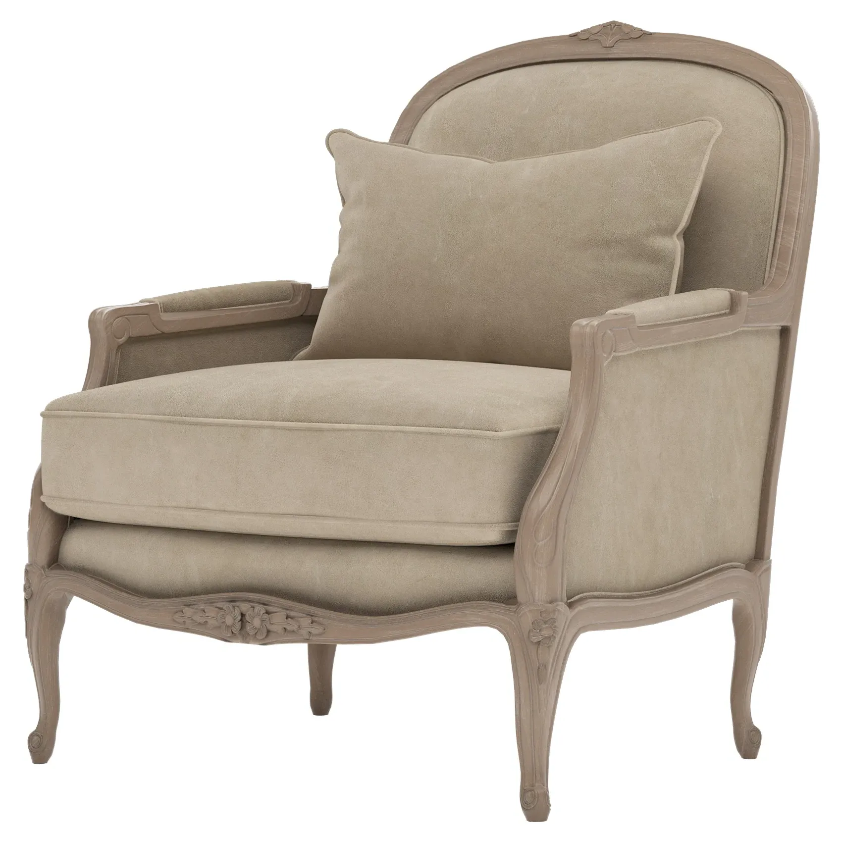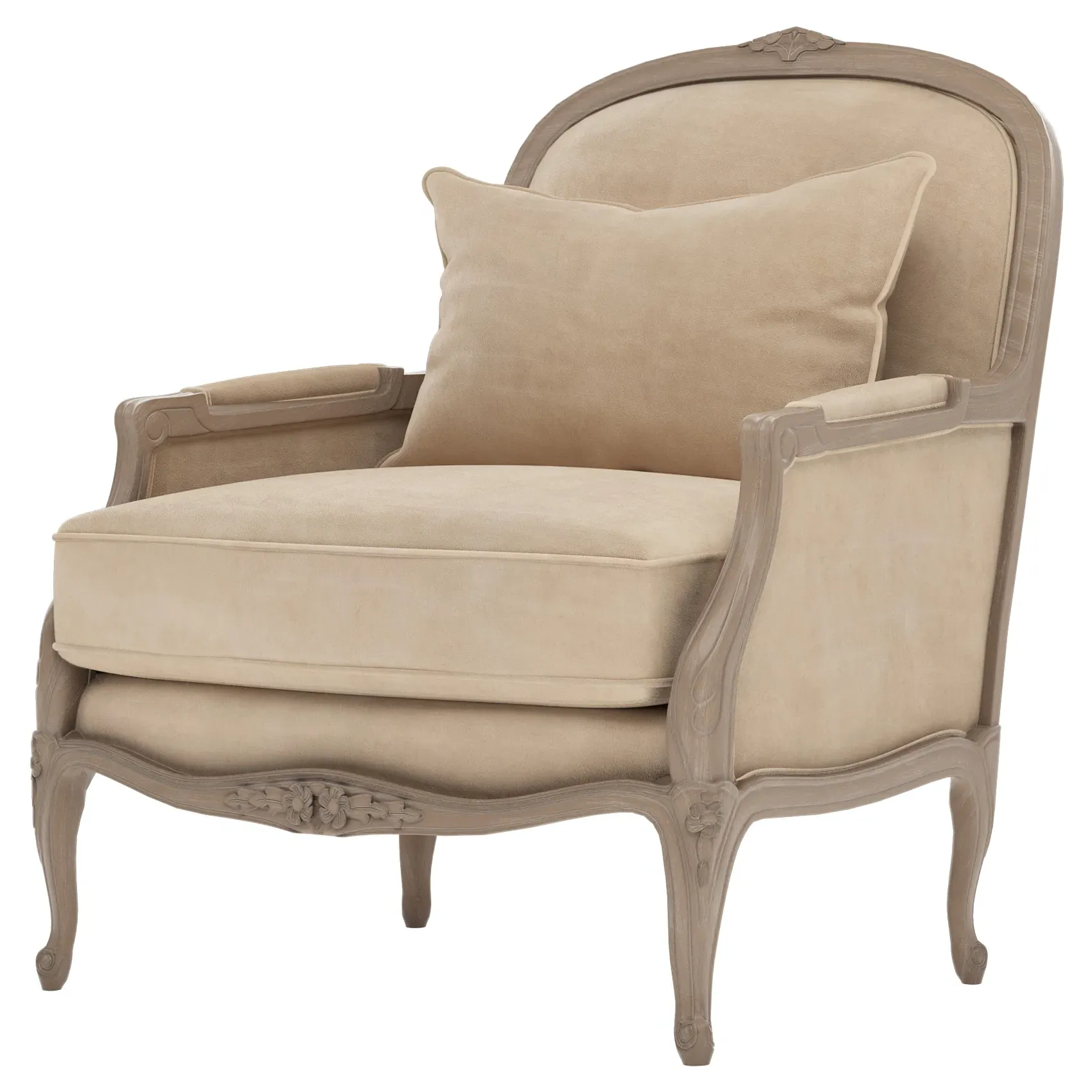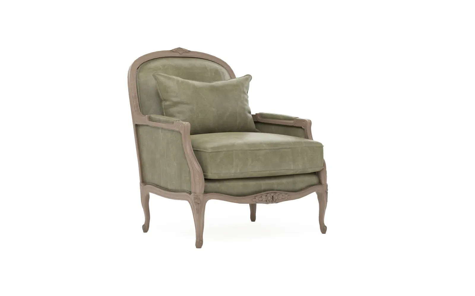 The Antoinette Bergere Chair combines traditional French styling with willow green velvet upholstery and a driftwood hardwood frame. Its CertiPUR-US certified foam core provides high-resiliency support, while the convoluted foam layer and channeled downproof jacket filled with polyester fiber and feather-down blend ensures lasting comfort. The hardwood construction with driftwood finish adds durability and natural appeal. W89 x D91 x H104 cm.