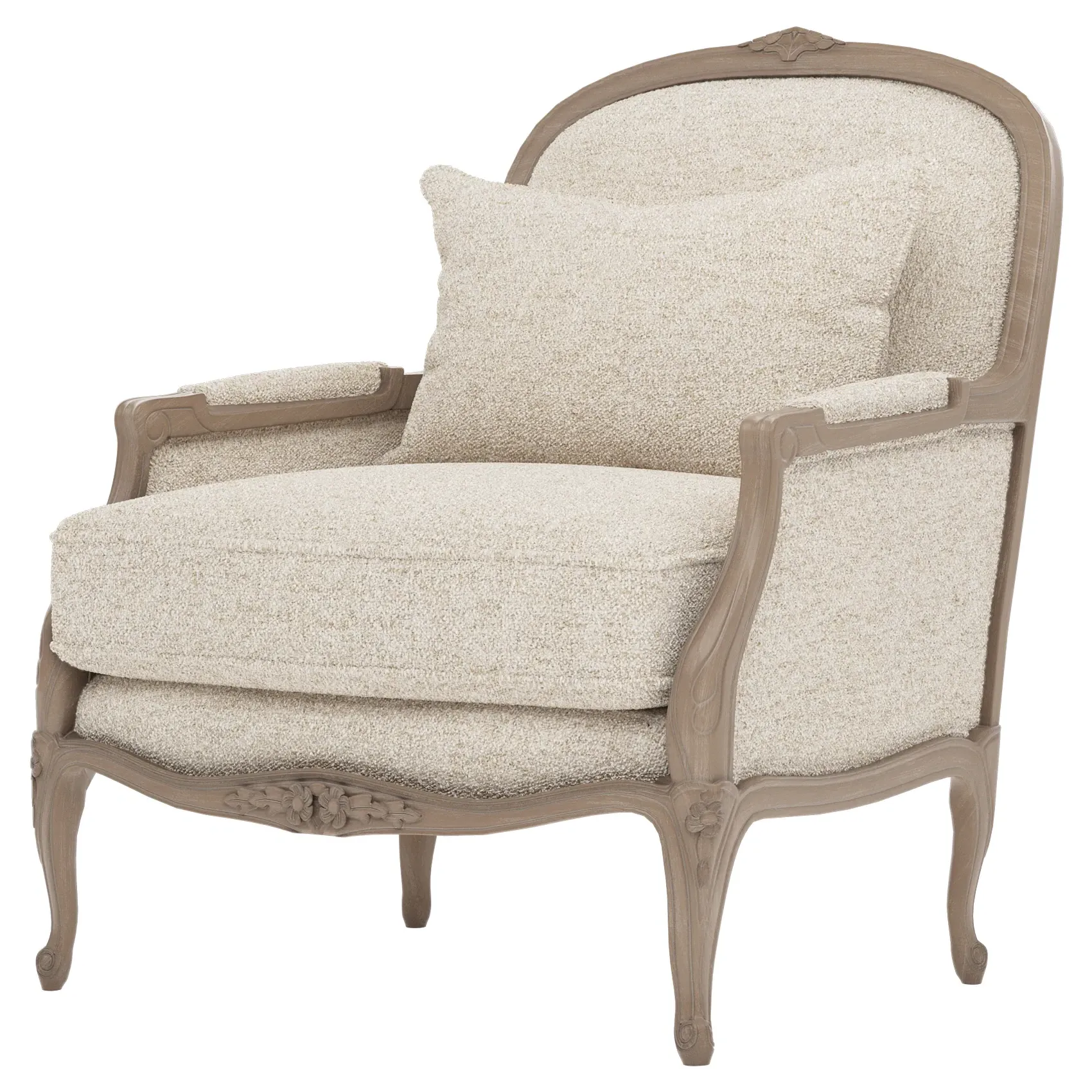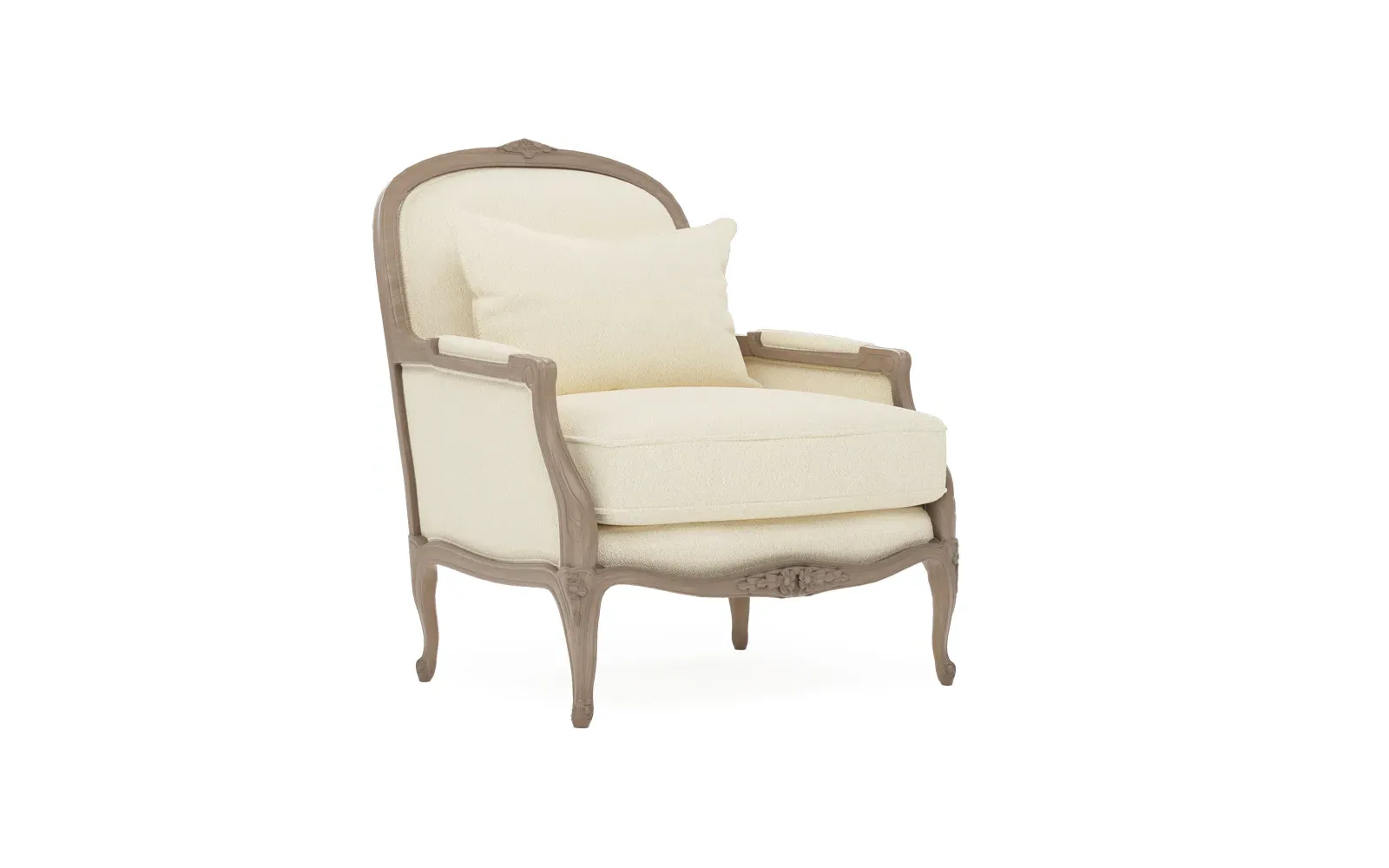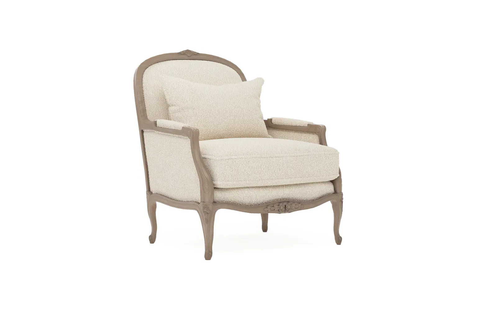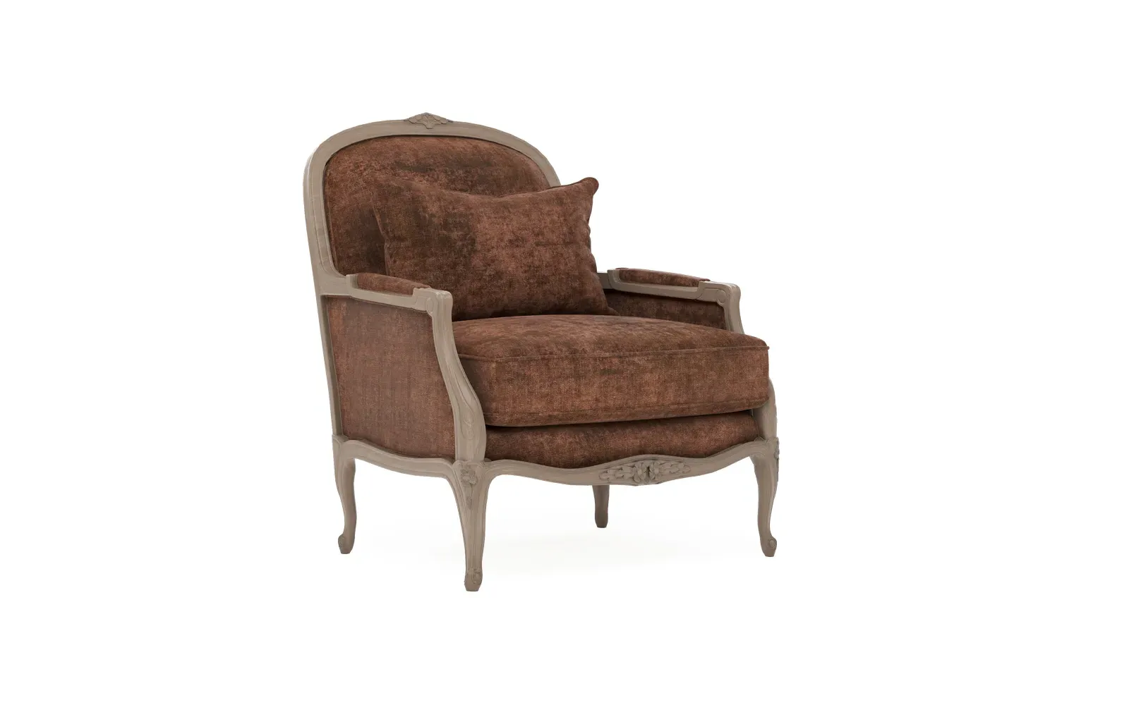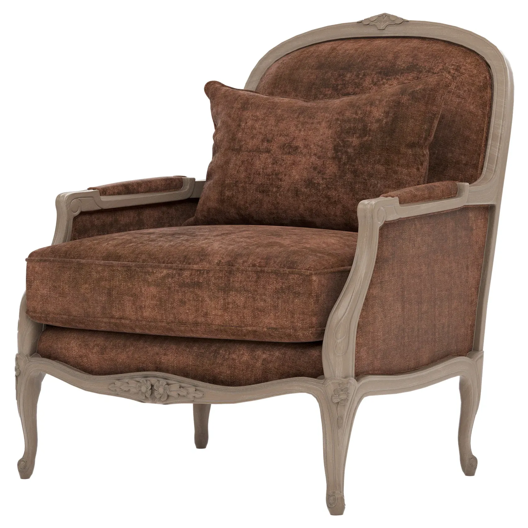 The Antoinette Bergere Chair combines traditional French styling with willow green velvet upholstery and a driftwood hardwood frame. Its CertiPUR-US certified foam core provides high-resiliency support, while the convoluted foam layer and channeled downproof jacket filled with polyester fiber and feather-down blend ensures lasting comfort. The hardwood construction with driftwood finish adds durability and natural appeal. W89 x D91 x H104 cm.