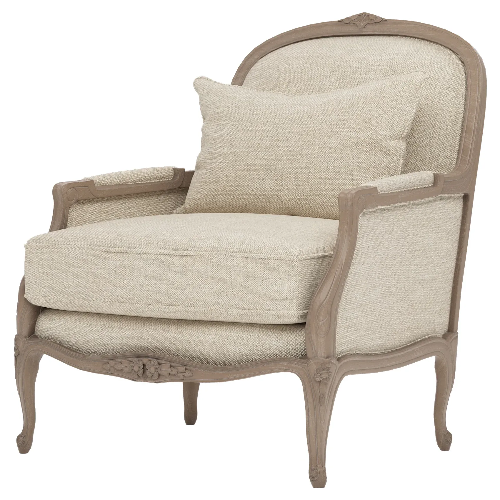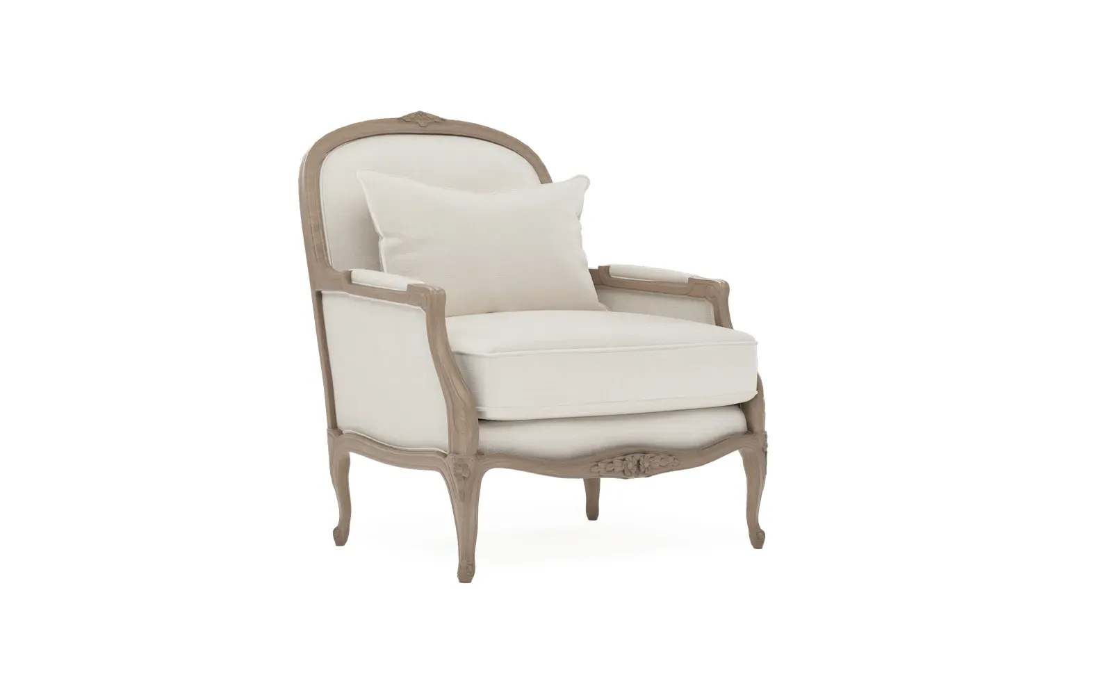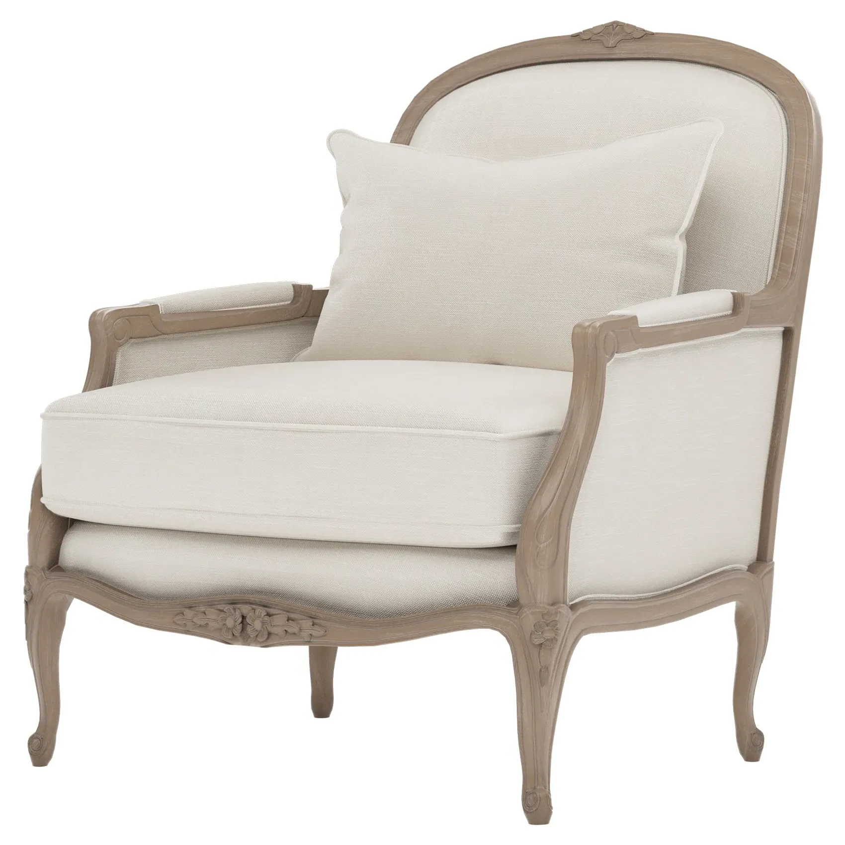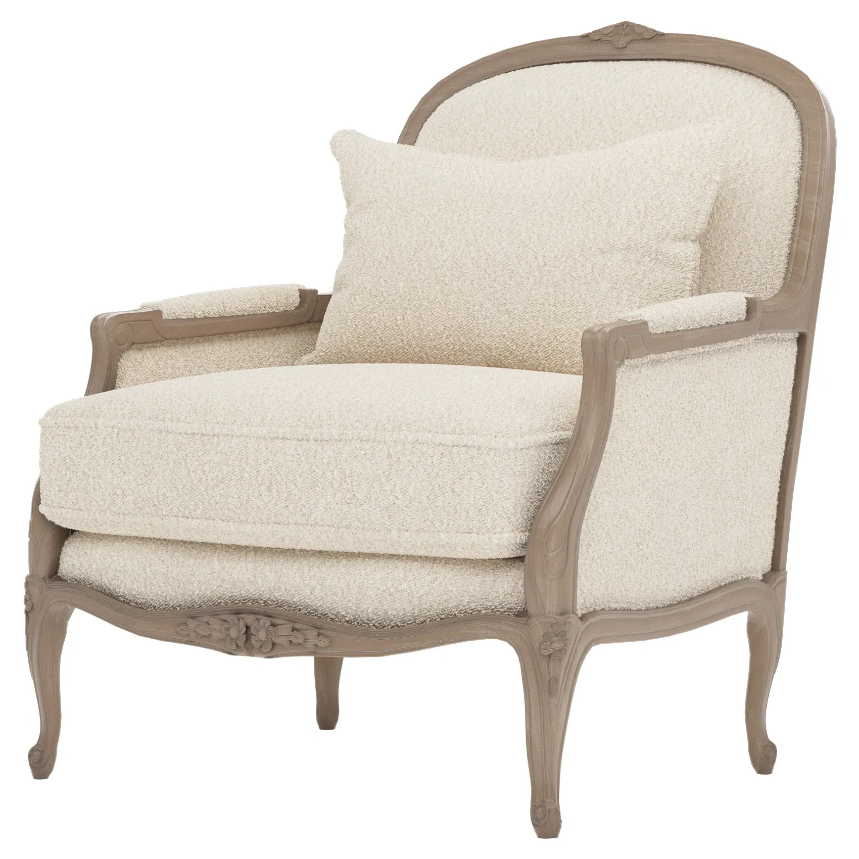 The Antoinette Bergere Chair combines traditional French styling with willow green velvet upholstery and a driftwood hardwood frame. Its CertiPUR-US certified foam core provides high-resiliency support, while the convoluted foam layer and channeled downproof jacket filled with polyester fiber and feather-down blend ensures lasting comfort. The hardwood construction with driftwood finish adds durability and natural appeal. W89 x D91 x H104 cm.