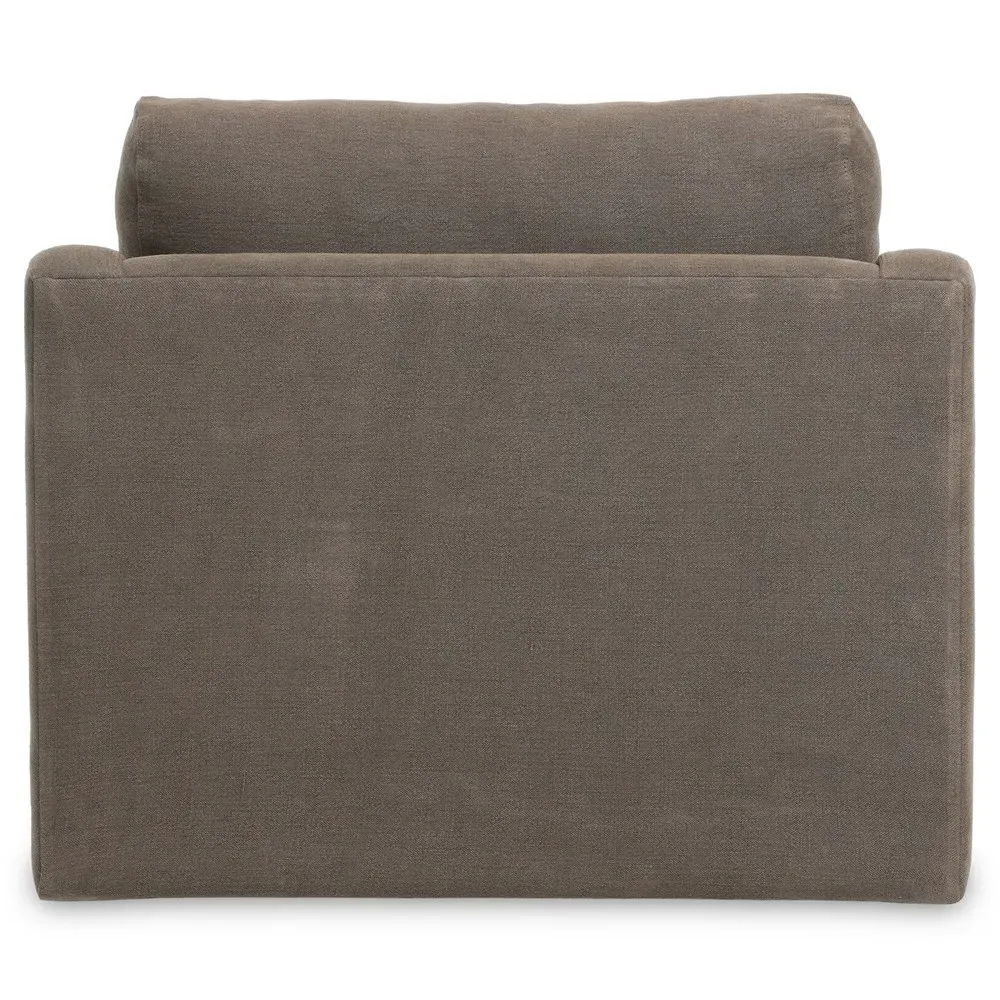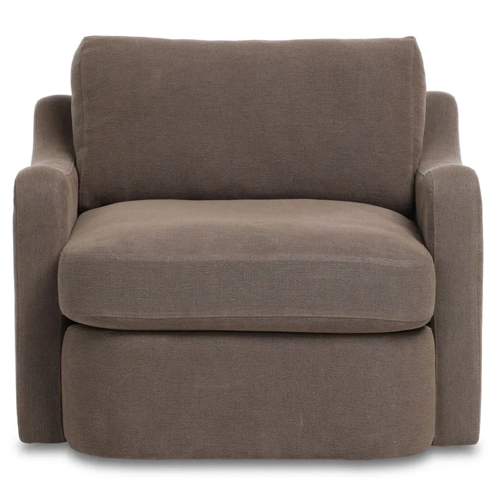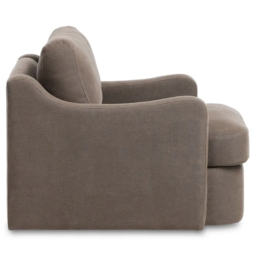 The Aurelia Broadway dining chair offers heritage-inspired comfort with its sloping track arms and fluid frame shape. Its tapered legs extend beyond a short skirt for a relaxed appearance, while the 100% linen upholstery adds natural texture. The chair features a feather/fiber blend cushioning and oak wood construction finished in amber brown. W64.8 x D71.8 x H86.4 cm.