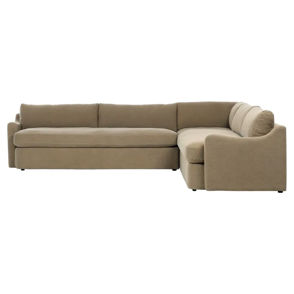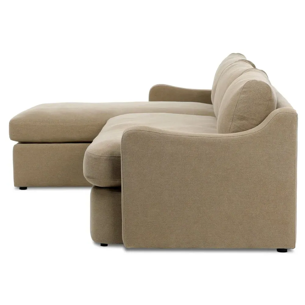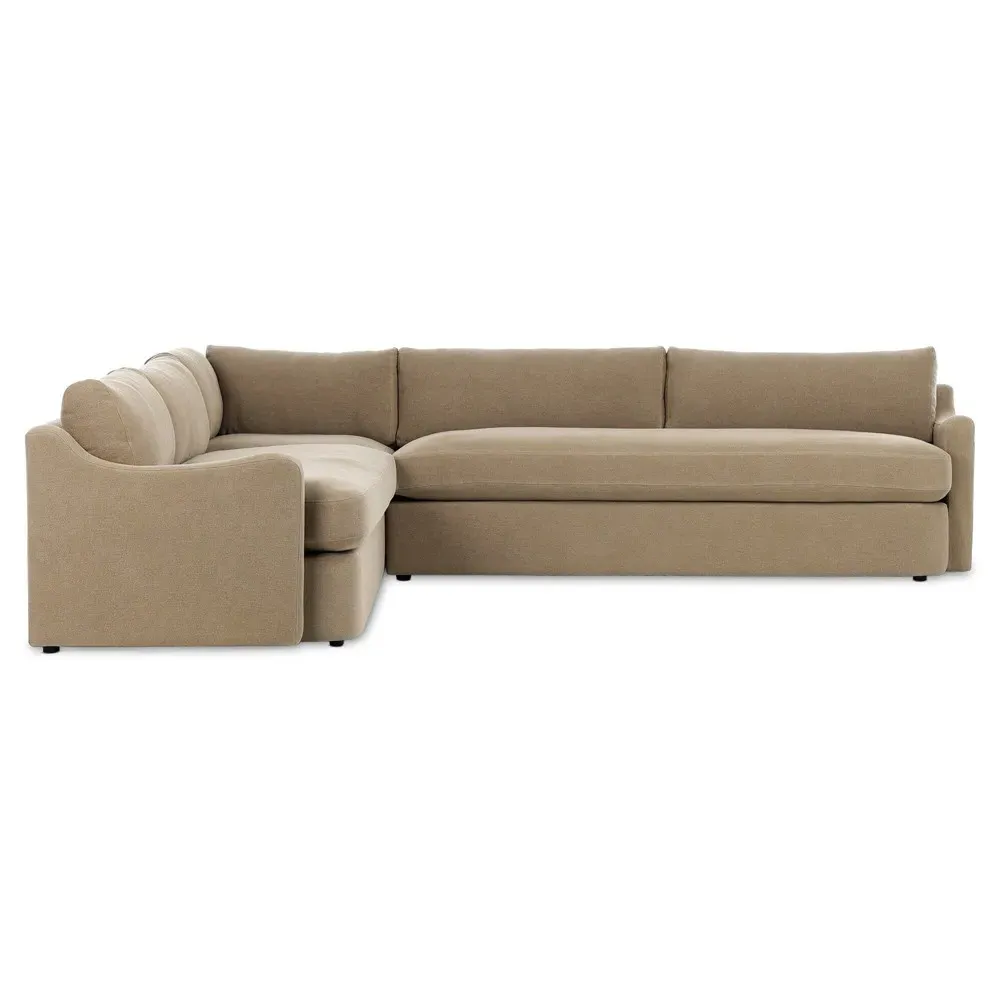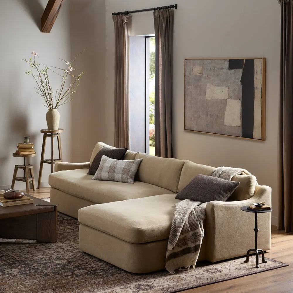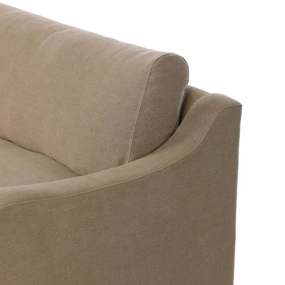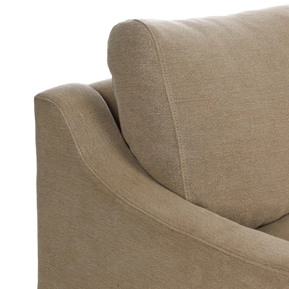 A design collaboration by Amber Lewis and Four Hands. Heritage-inspired comfort in a 360-swivel chair. Sloping track arms and a protruding front decking are a study in playful forms, while subtle boxing along the front perimeter maintains a simple, polished look. The two-over-one boxed cushions incorporate a feather/fiber blend and S-spring suspension for the ultimate sink-in sit. Covered in 100% flax linen. Amber Lewis x Four Hands. 33 inches high x 36.5 inches wide x 40 inches deep. Seat: 20 inches high x 28 inches wide x 26 inches deep; Seat cushion: 9 inches thick x 28.5 inches wide x 32 inches deep; Seat back: 6.5 inches high; Arm: 23 inches high x 32 inches wide x 4 inches deep; Arm from seat: 3 inches high; Back cushion: 15 inches high x 28 inches wide x 9 inches deep; Clearance from floor: 2 inches; Weight capacity: 250 pounds. Constructed from wood. Upholstered in Broadway canvas fabric. Fabric content: 100% flax/linen; Filling in back cushion: 50% waterfowl feather and 50% polyester fiber; Filling in body: 100% polyurethane foam; Filling in seat: 63% polyurethane foam pad, 30% polyester fiber and 7% waterfowl feather.