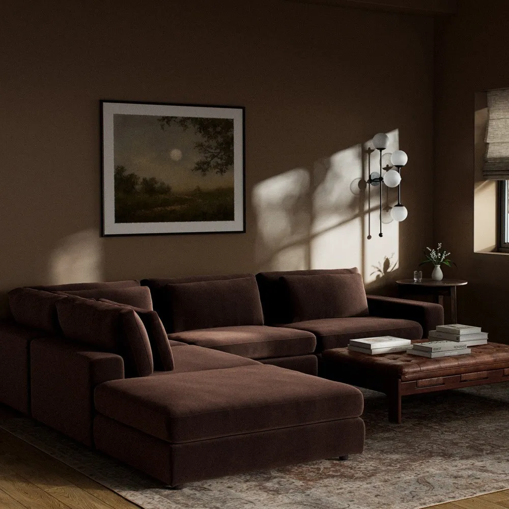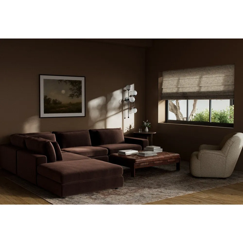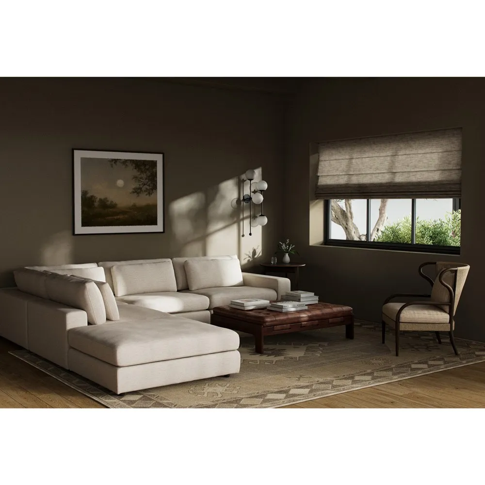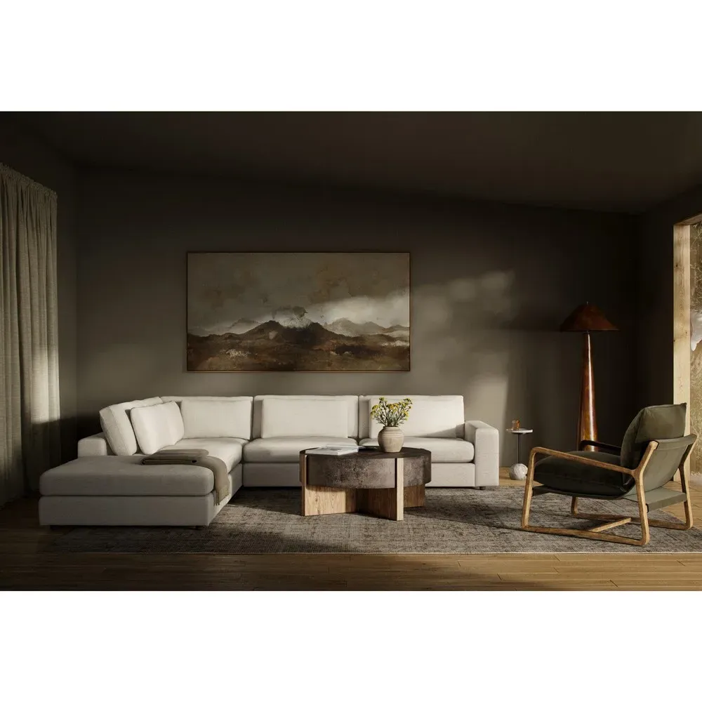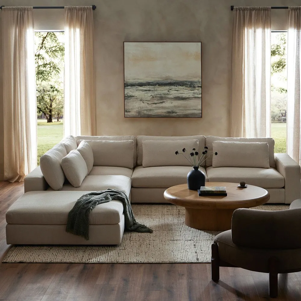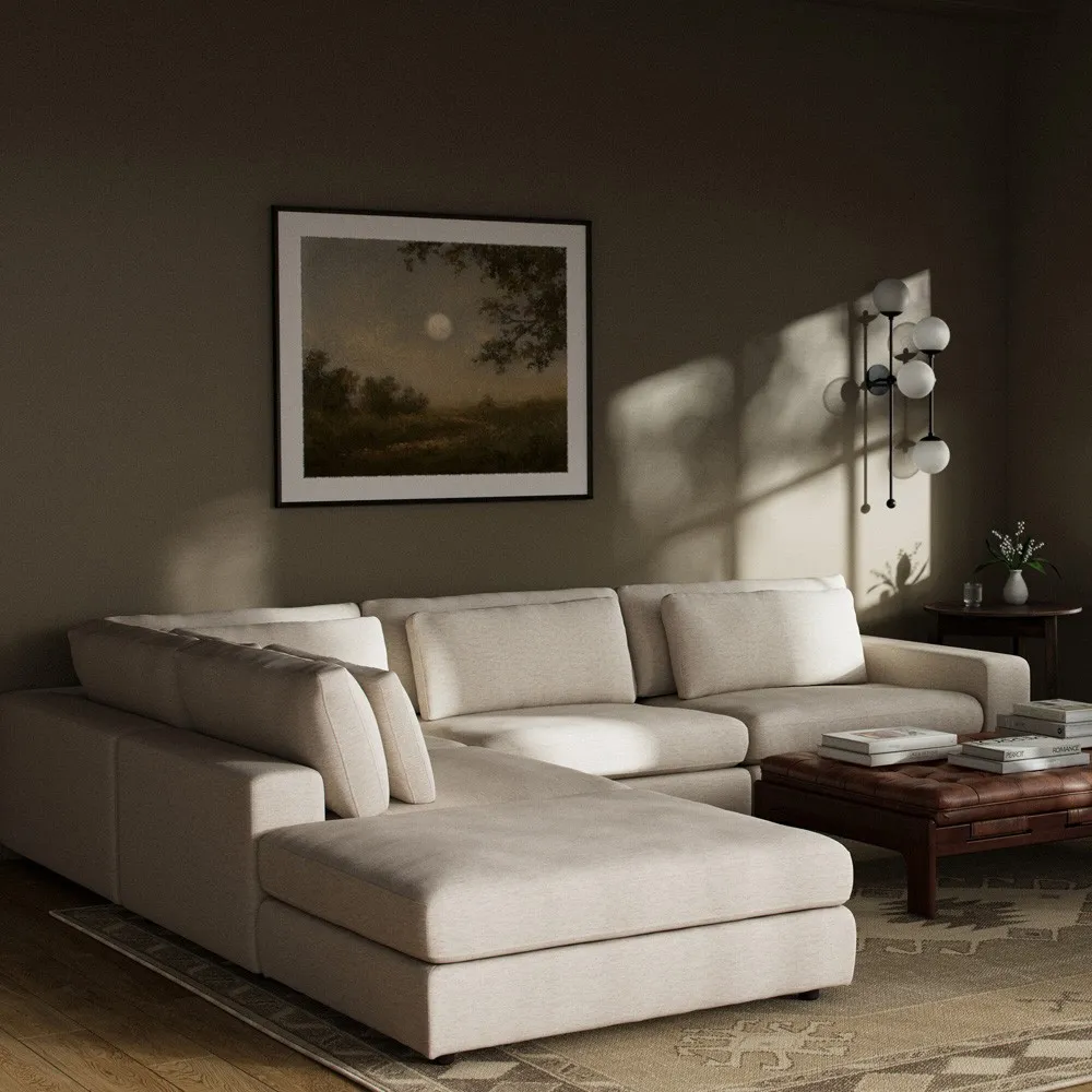 The Candace sectional offers spacious seating with its 4-piece bumper configuration, featuring a right-facing design and matching ottoman. Its wood construction provides durability, while the cream fabric upholstery combines viscose, linen, polyester, and cotton for comfort. The multi-layer cushion filling includes waterfowl feather and polyurethane foam for optimal support, and the 875-pound weight capacity ensures lasting stability. W335 x D331 x H80 cm.