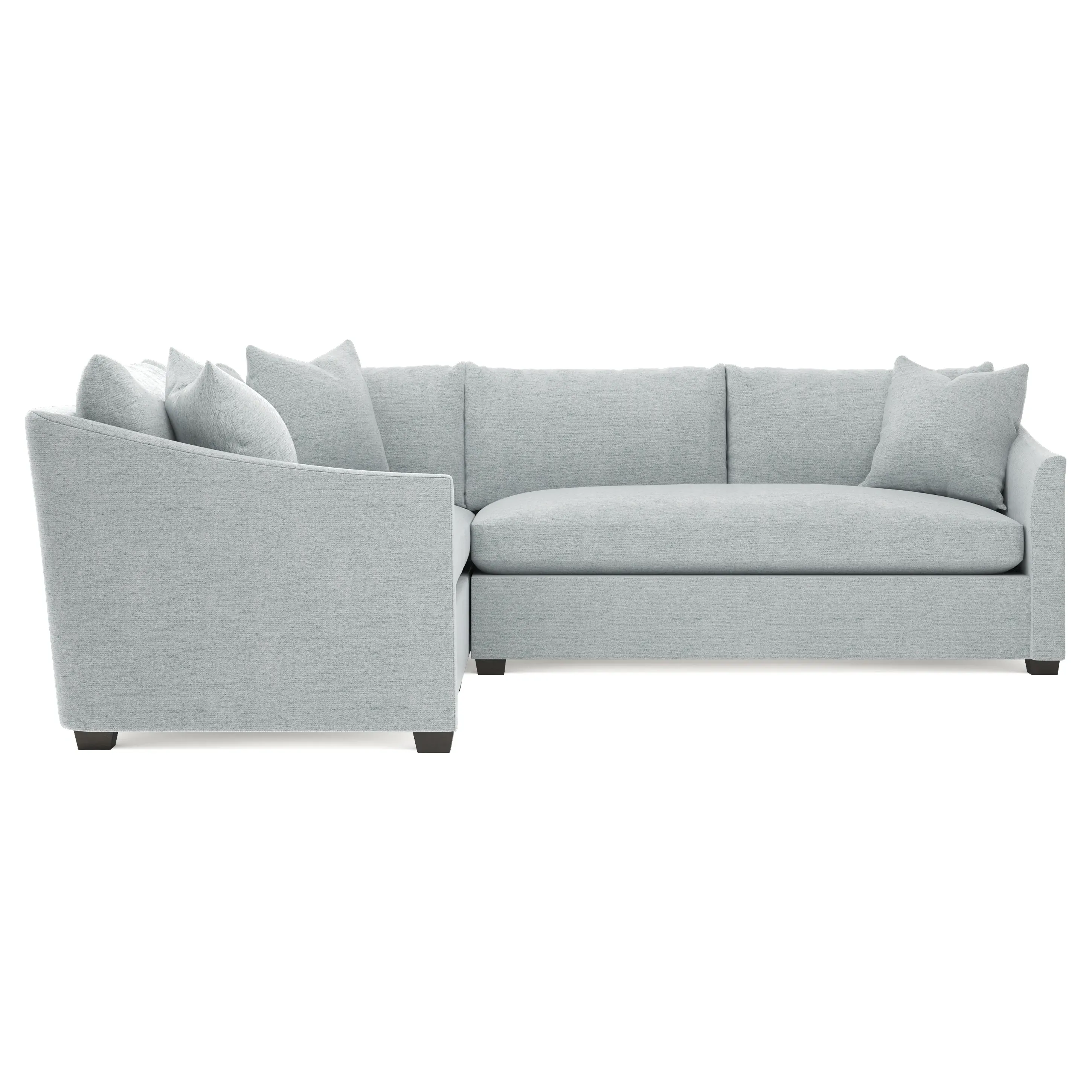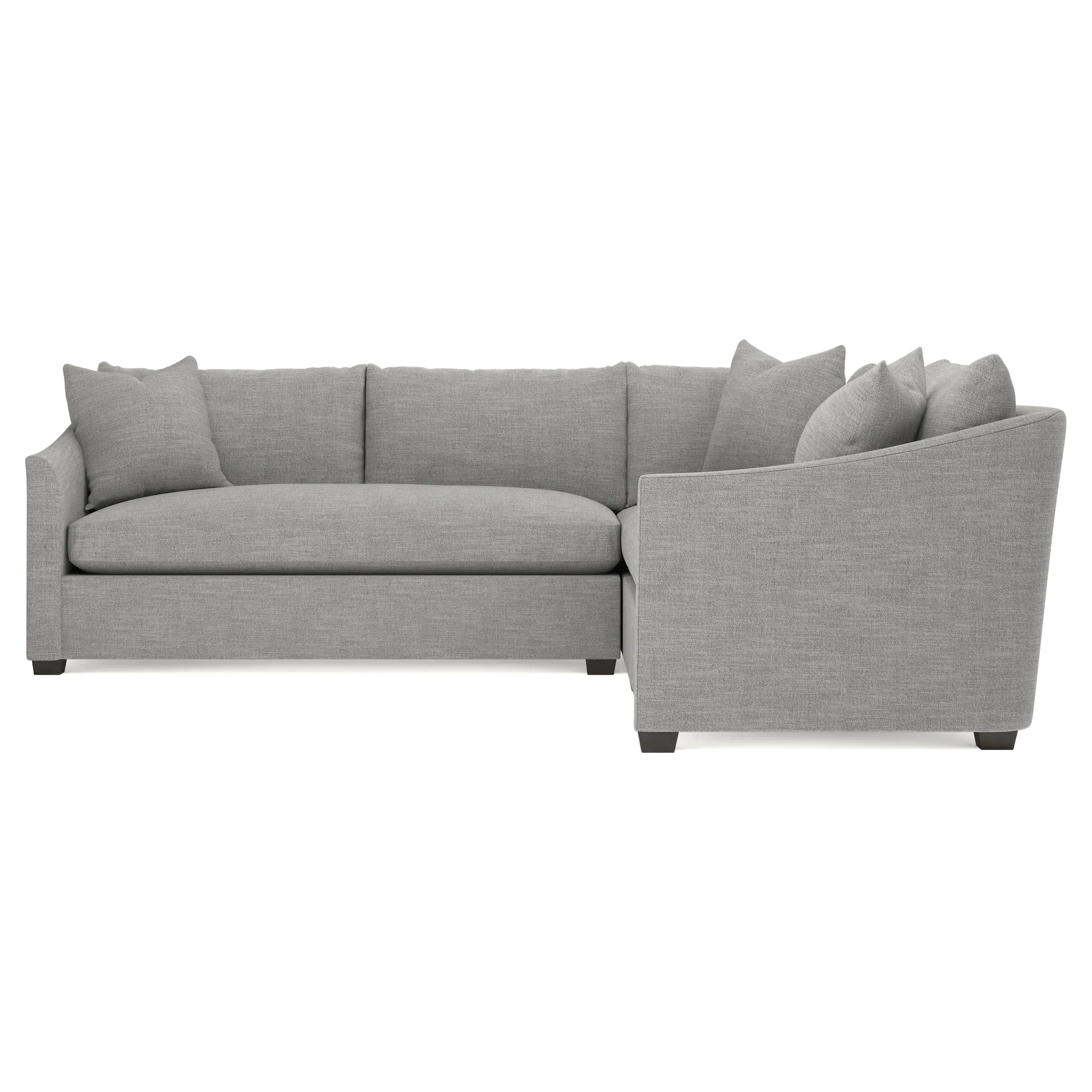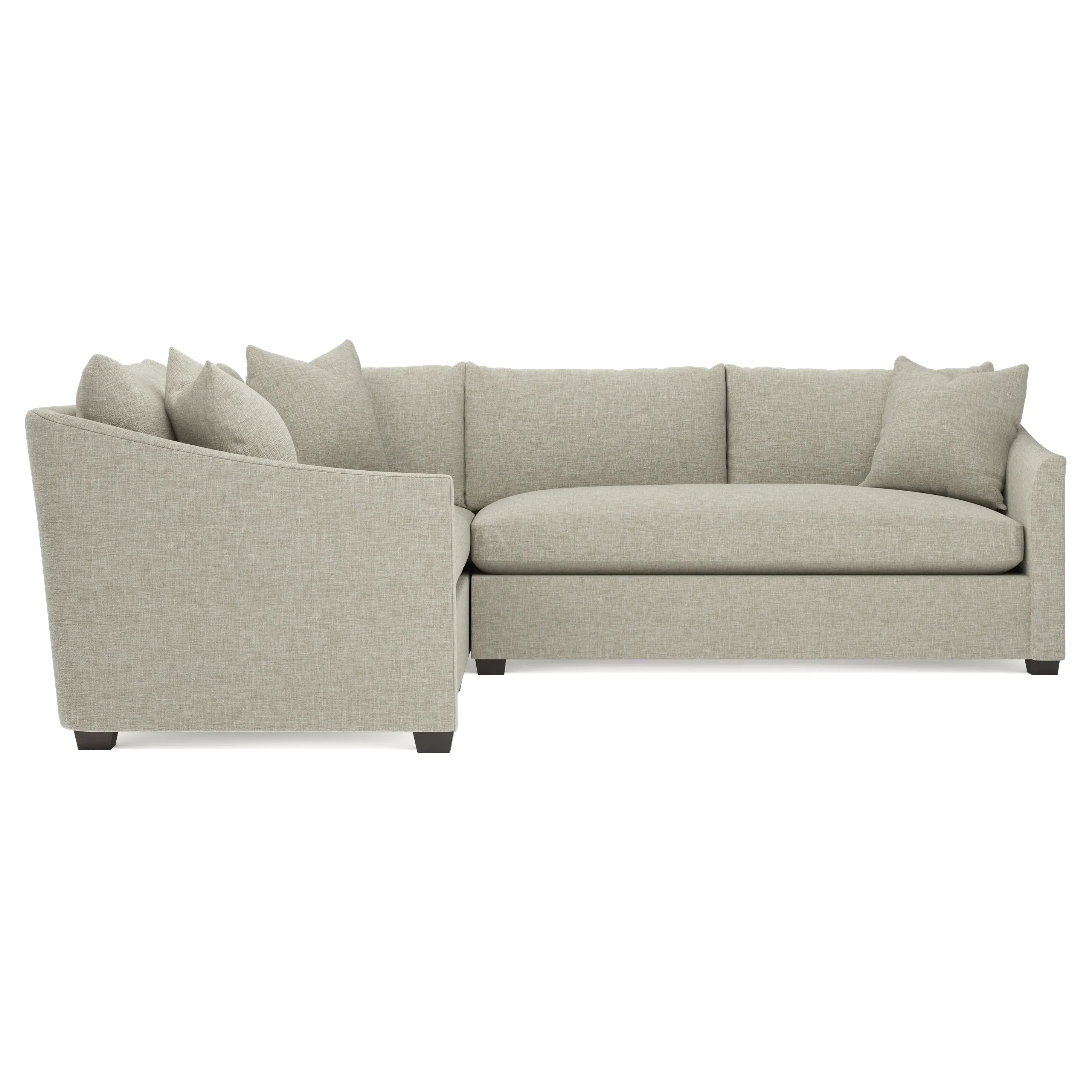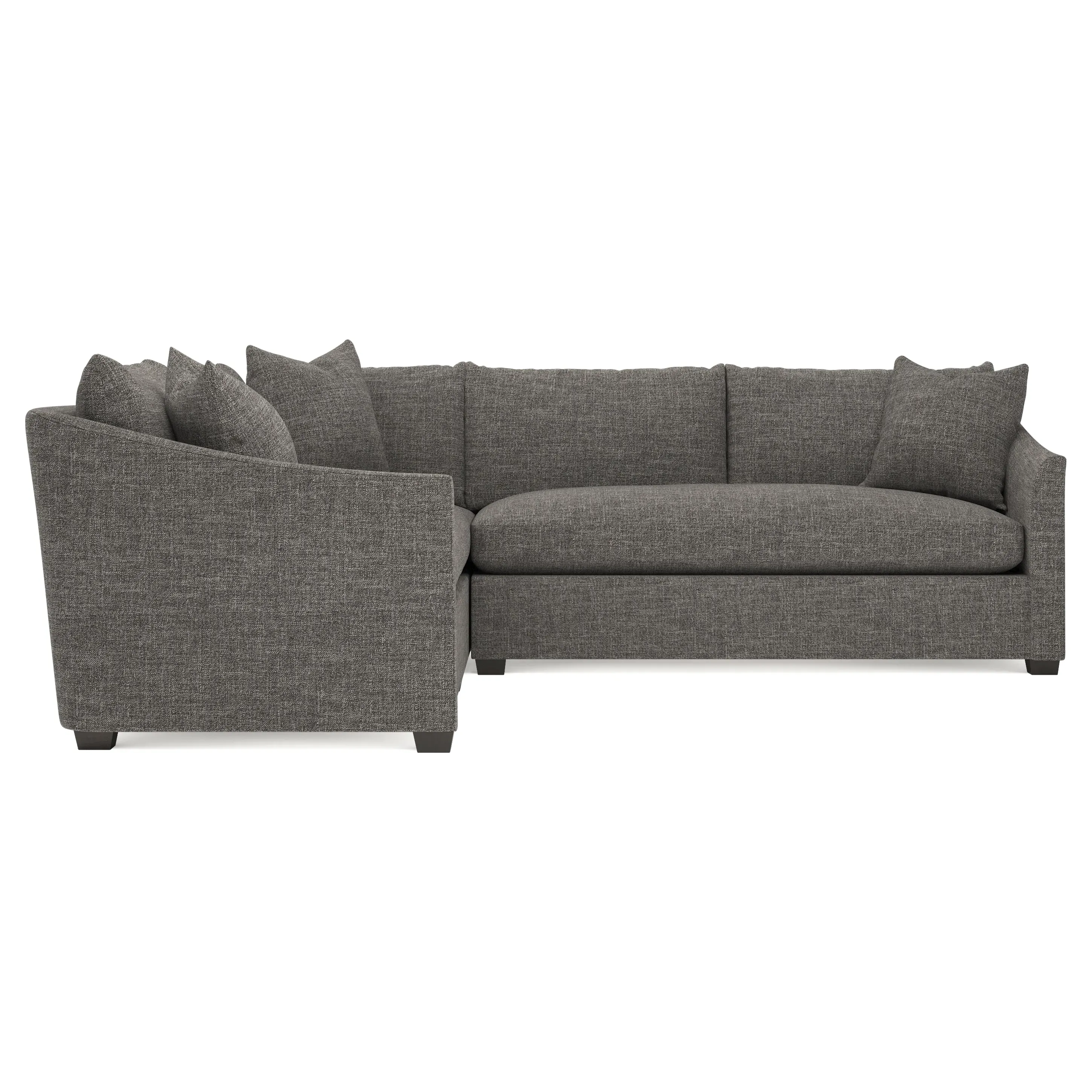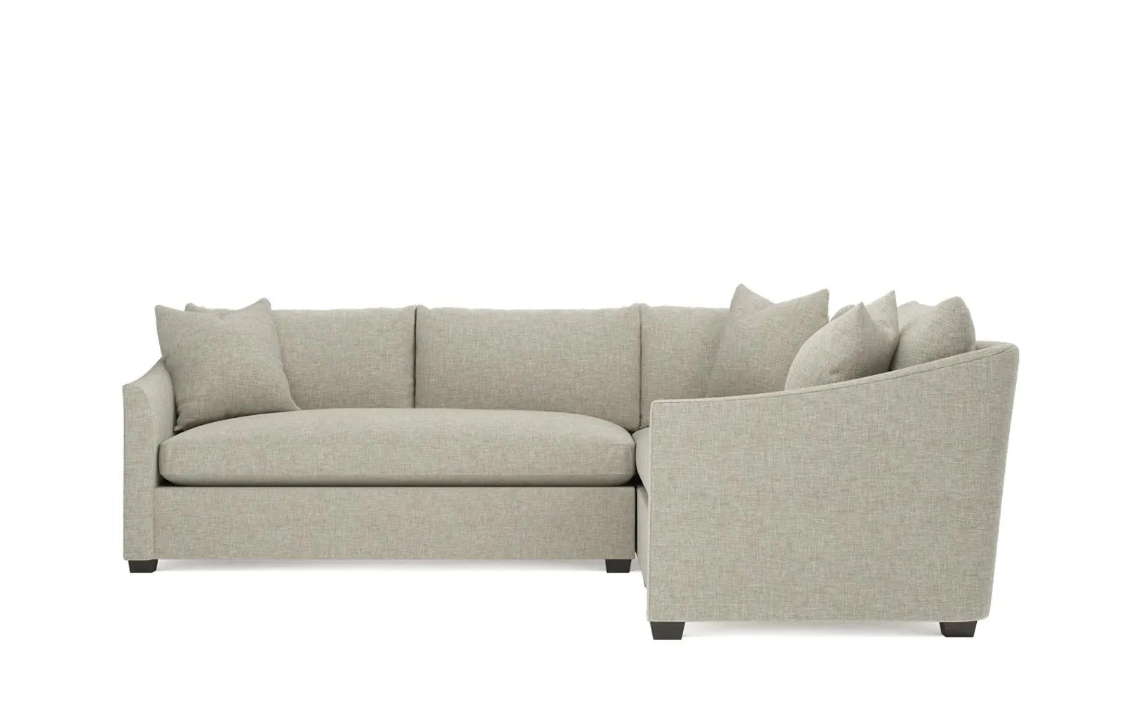 The Clairmont corner sectional offers comfort with its generous form and softly sloped arms. Its foam core seat cushions surrounded by plush fiber fill provide supportive seating with a slightly firm sit, while the tapered wood legs add stability. The sectional features gently curved back corners and includes cozy throw pillows. W266 x D264 x H91 cm.
