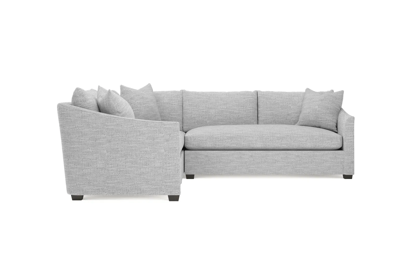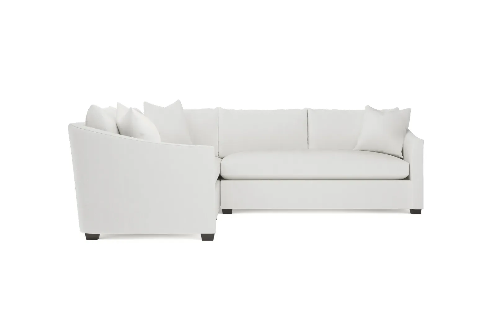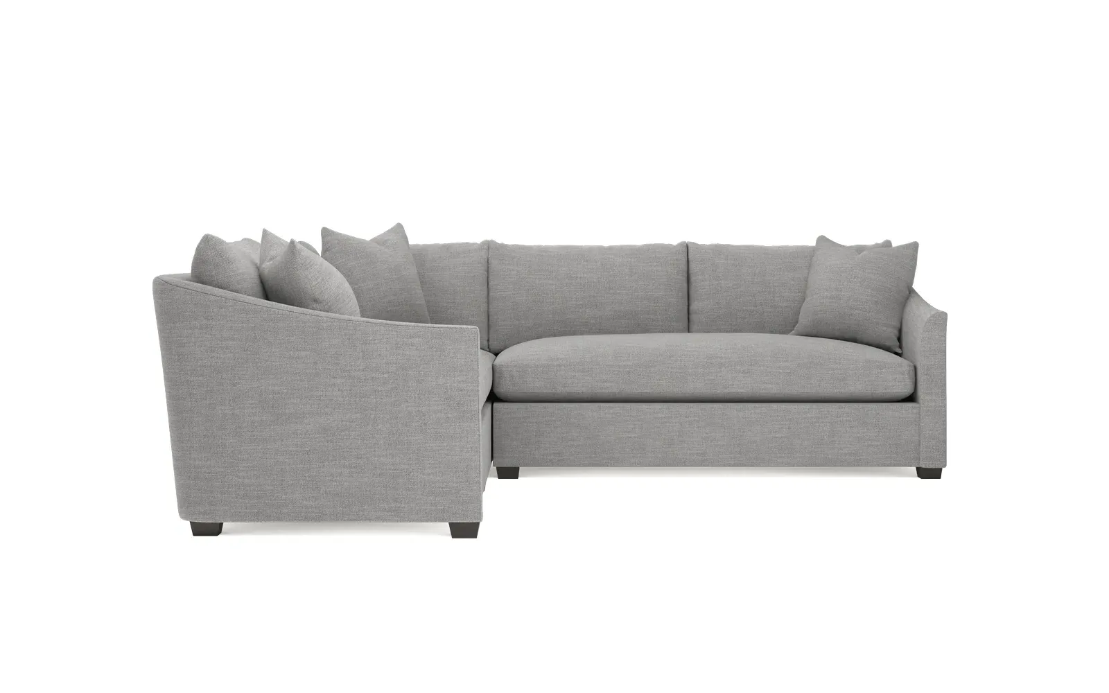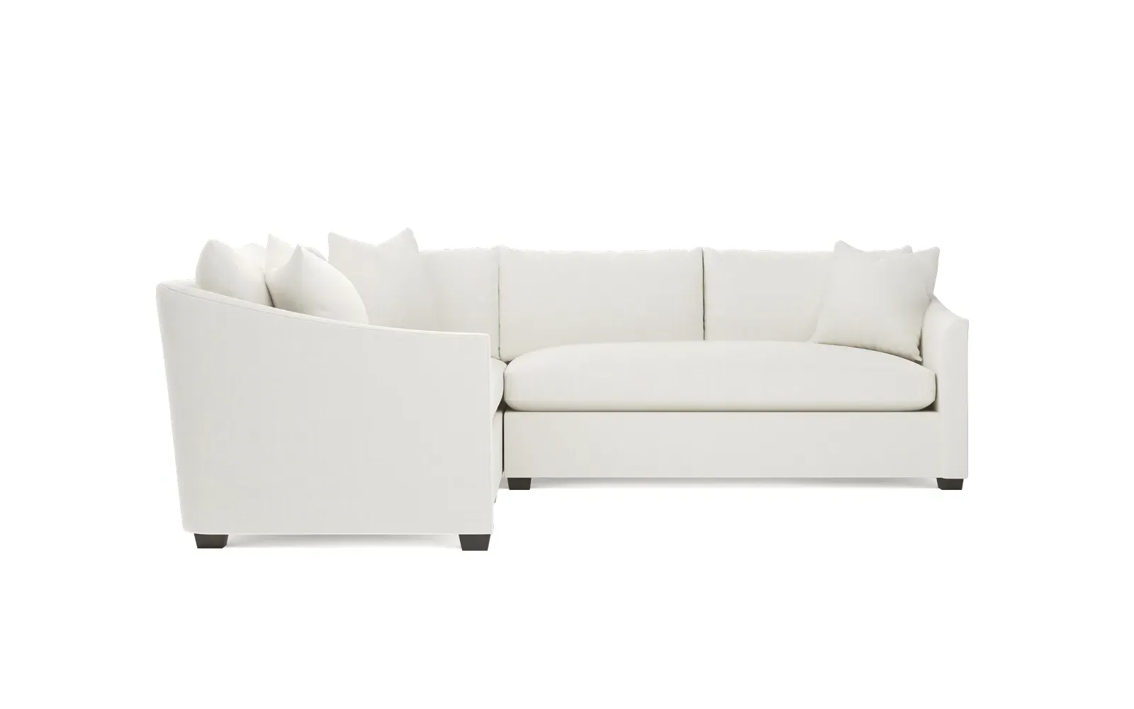 The left 105” Clairmont corner sectional is understated and comfortable, with a generous form perfect for any family room or great room. Set atop tapered wood legs, the inviting silhouette includes softly sloped arms, gently curved back corners, and cozy throw pillows. Soft yet supportive with a slightly firm sit, the low-maintenance seat cushions feature a foam core surrounded by plush fiber fill. Choose from a variety of upholstery options, including linen, velvet, and performance fabrics. <b>Overall Dimensions:</b> 105" W x 104" D x 36" H. <b>End Sofa Dimensions:</b> 66” W x 39” D x 36" H; <b>End Sofa with Corner Dimensions:</b> 104” W x 39” D x 36" H; <b>Seat Dimensions:</b> 24” D x 22” H; <b>Arm Height:</b> 28”; <b>Leg Height:</b> 2”. <b>Materials:</b> FSC®-certified, US-sourced, formaldehyde-free solid kiln-dried hardwood and furniture-grade laminates. <b>Material Finish:</b> Espresso legs. <b>Pieces Included:</b> Left end sofa, right end sofa with corner.