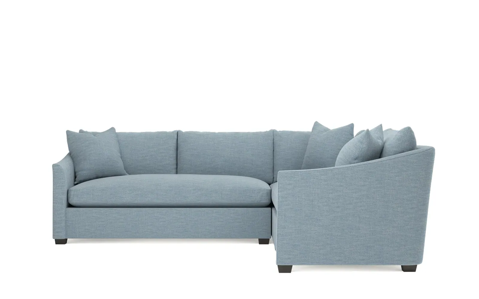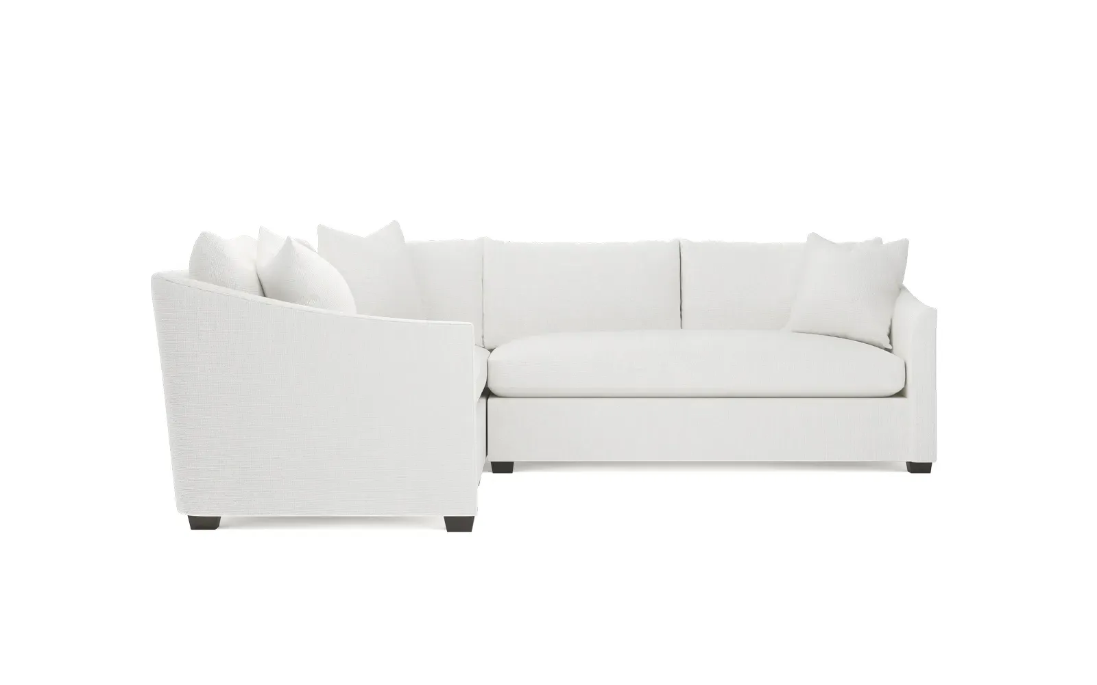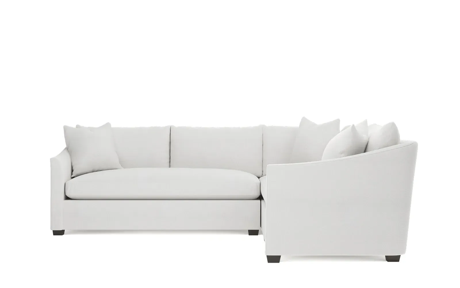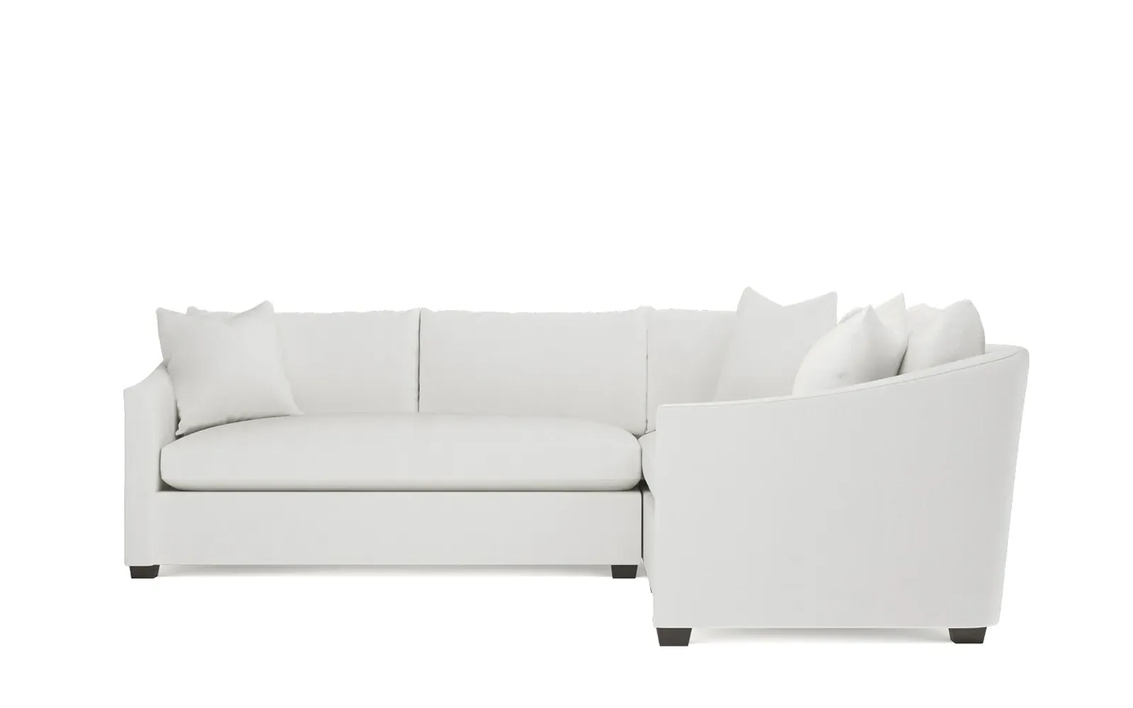 The left 105” Clairmont corner sectional is understated and comfortable, with a generous form perfect for any family room or great room. Set atop tapered wood legs, the inviting silhouette includes softly sloped arms, gently curved back corners, and cozy throw pillows. Soft yet supportive with a slightly firm sit, the low-maintenance seat cushions feature a foam core surrounded by plush fiber fill. Choose from a variety of upholstery options, including linen, velvet, and performance fabrics. <b>Overall Dimensions:</b> 105" W x 104" D x 36" H. <b>End Sofa Dimensions:</b> 66” W x 39” D x 36" H; <b>End Sofa with Corner Dimensions:</b> 104” W x 39” D x 36" H; <b>Seat Dimensions:</b> 24” D x 22” H; <b>Arm Height:</b> 28”; <b>Leg Height:</b> 2”. <b>Materials:</b> FSC®-certified, US-sourced, formaldehyde-free solid kiln-dried hardwood and furniture-grade laminates. <b>Material Finish:</b> Espresso legs. <b>Pieces Included:</b> Left end sofa, right end sofa with corner.